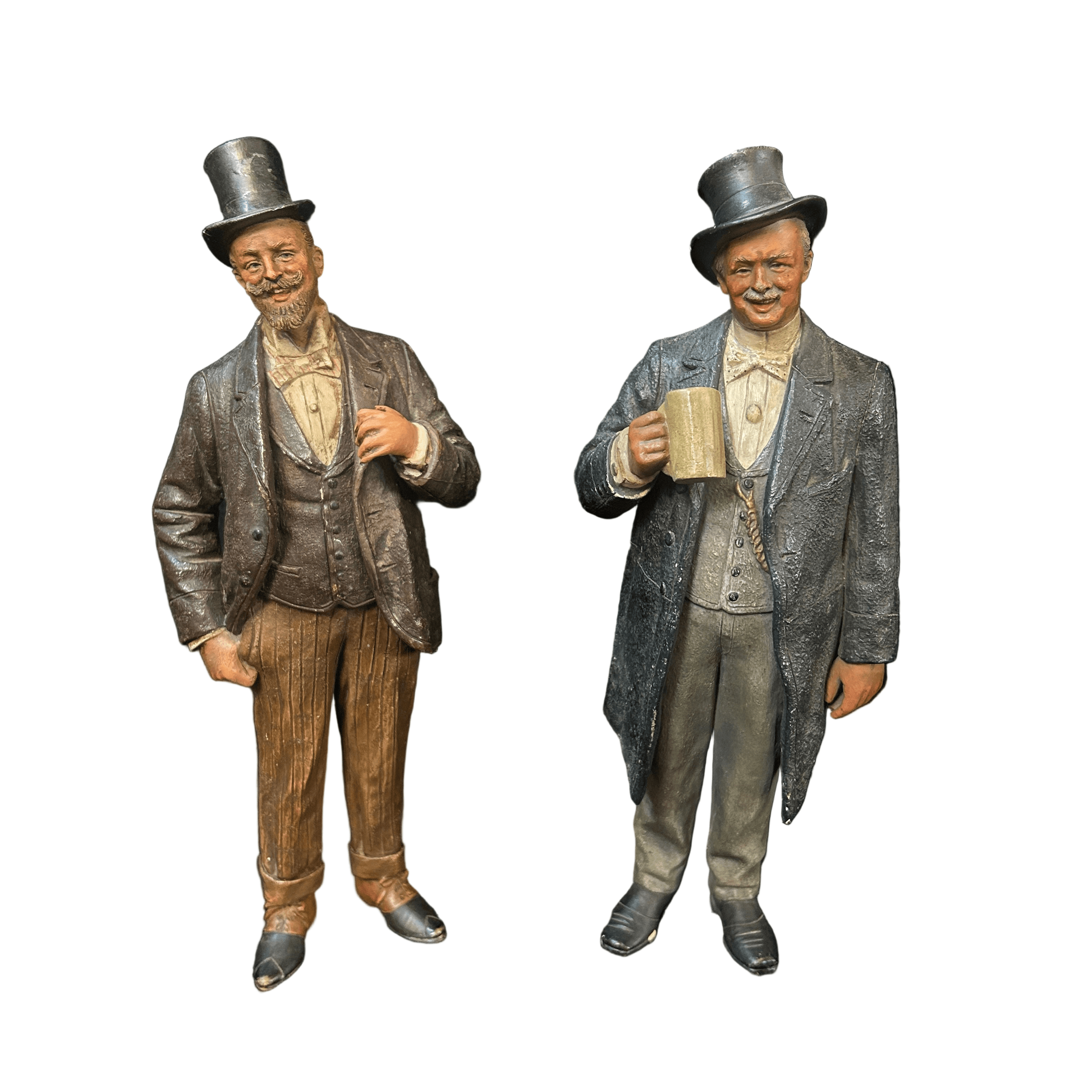 Pareja de figuras de terracota francesa, representando a un par de caballeros de x época, vestidos con traje y sombrero de copa, con un gesto relajado y de goce. Uno de ellos tiene una jarra de cerveza en su mano, aludiendo a un contexto más cotidiano y relajado.