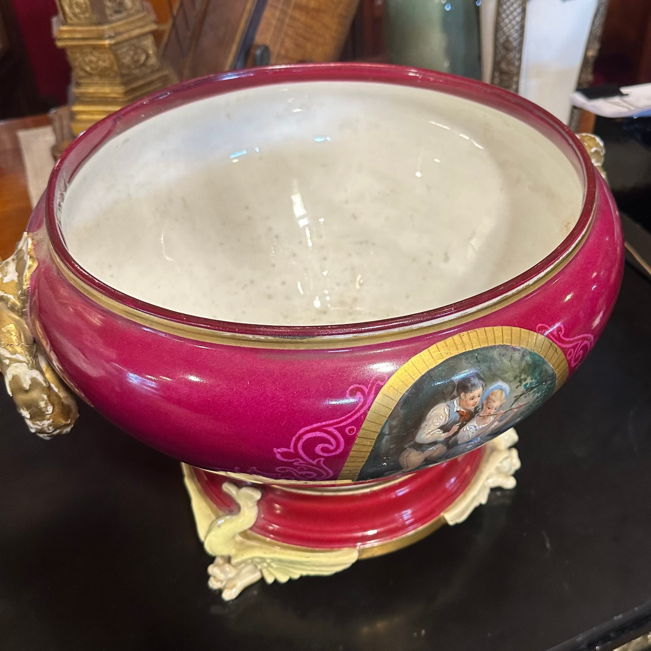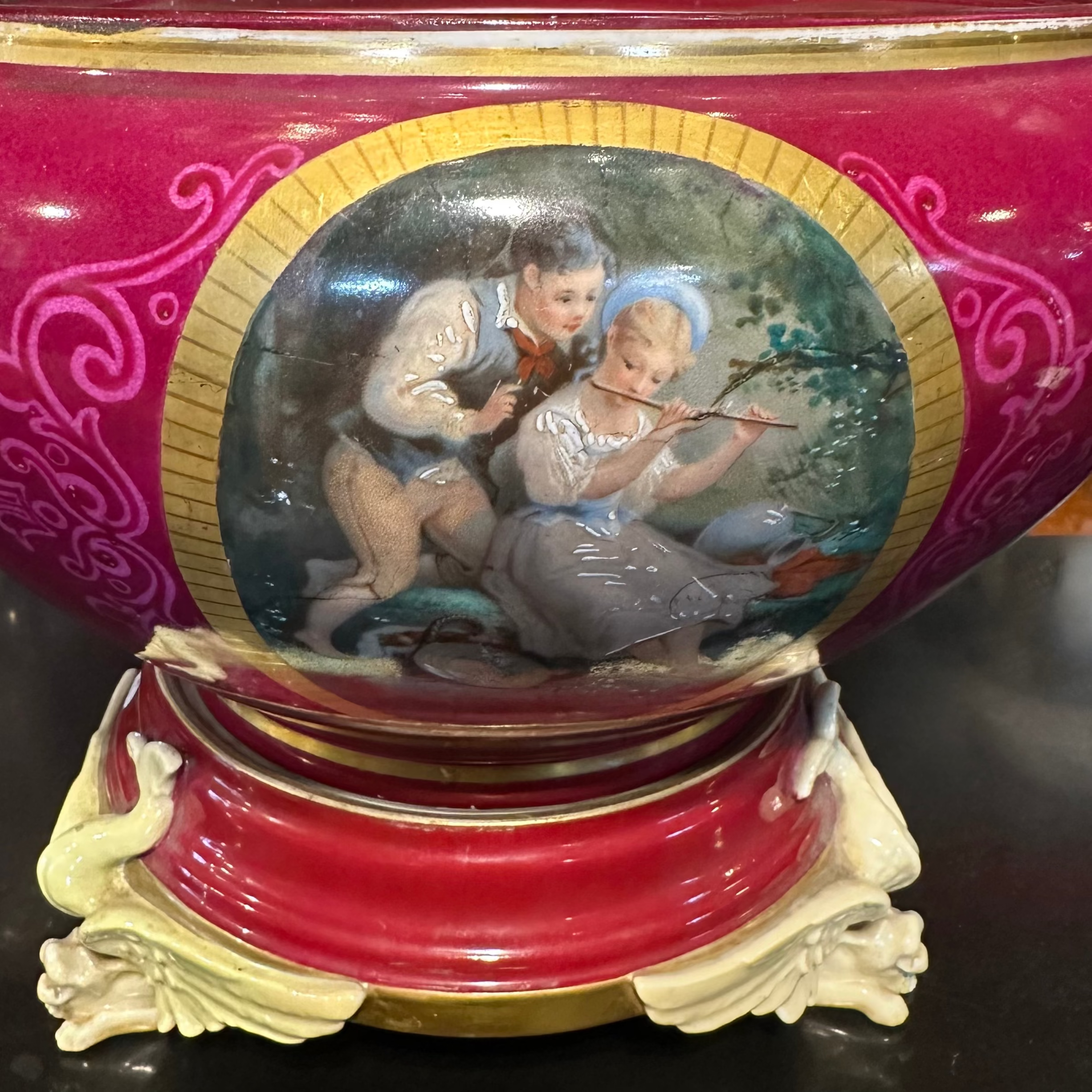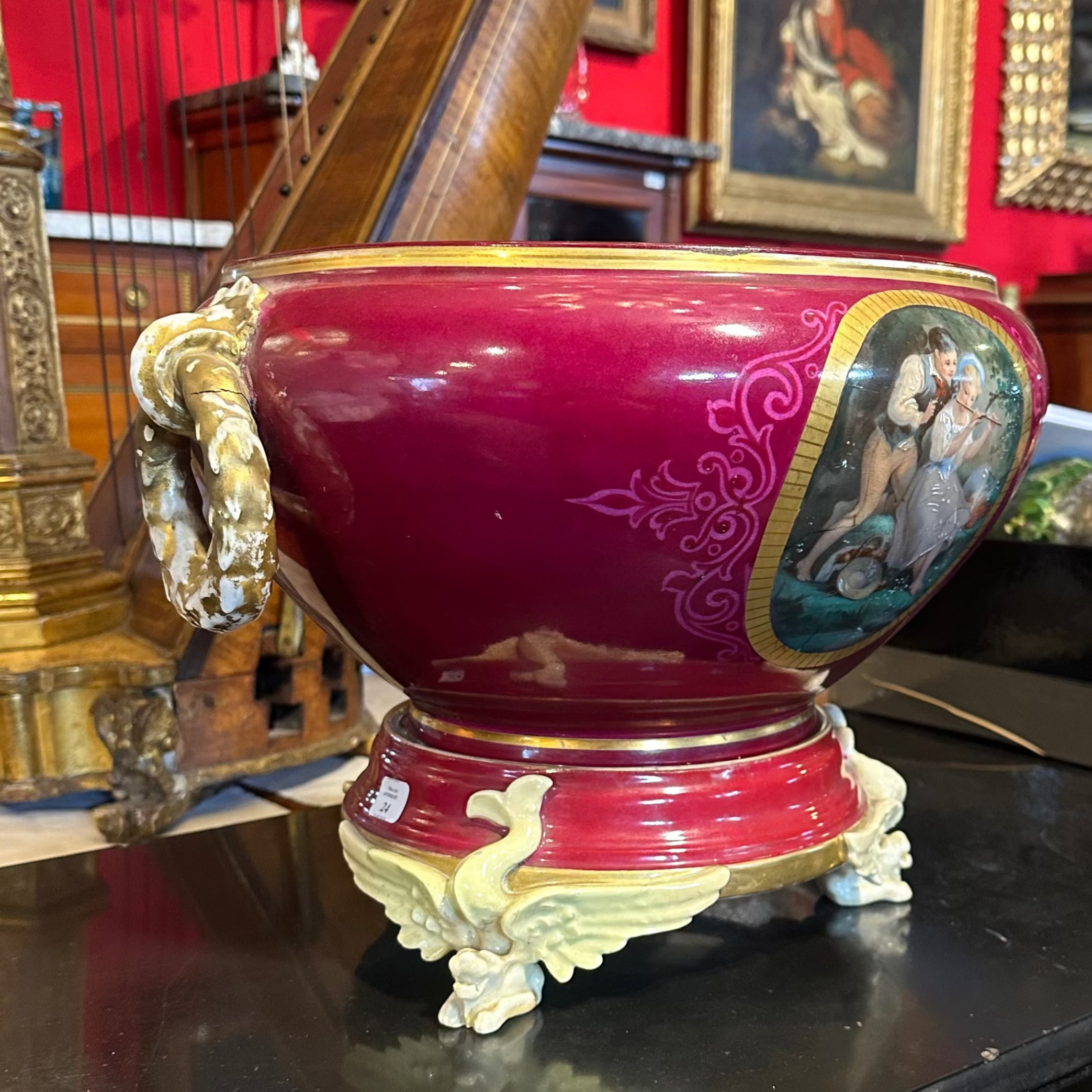 Grande coupe et son support en porcelaine décorés de scènes de couples galants, de médaillons et de couronnes de laurier. Base tripode. Fin du XIXe siècle. Légèrement restauré.
