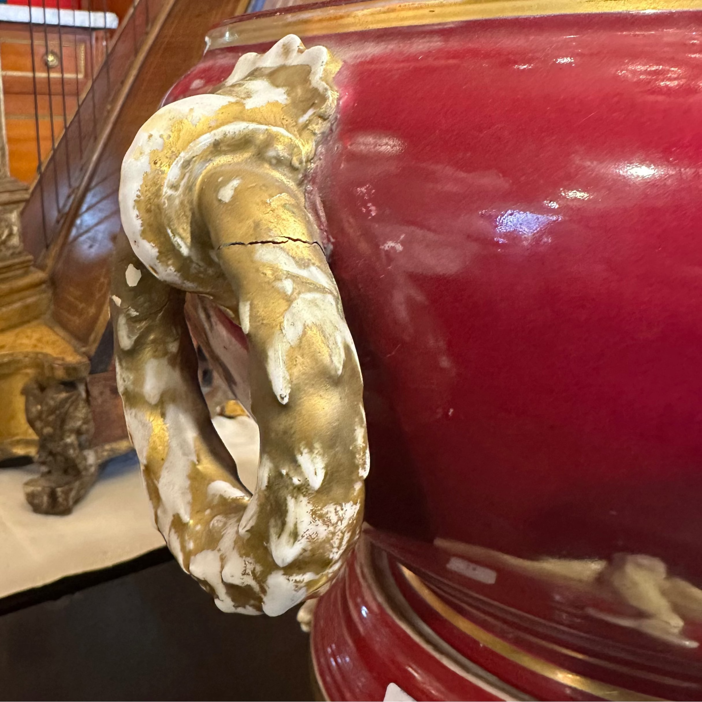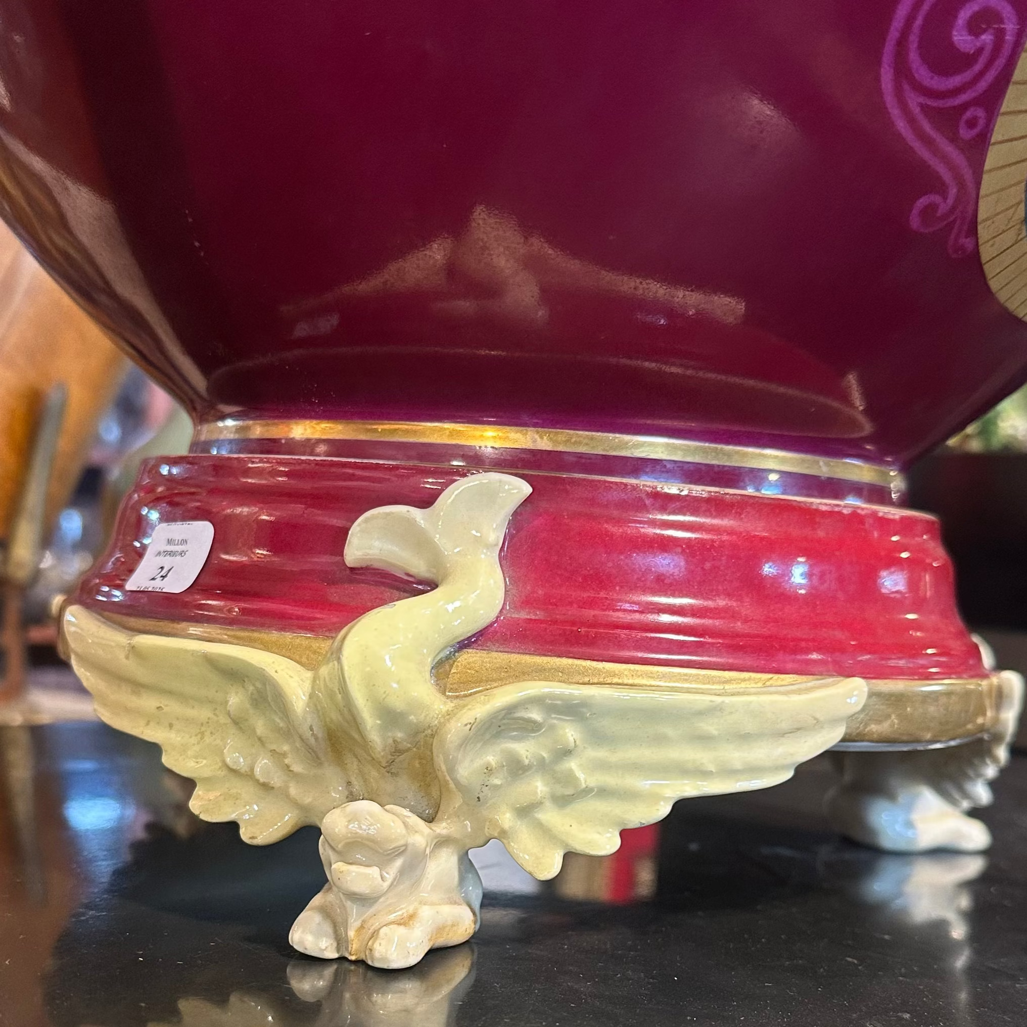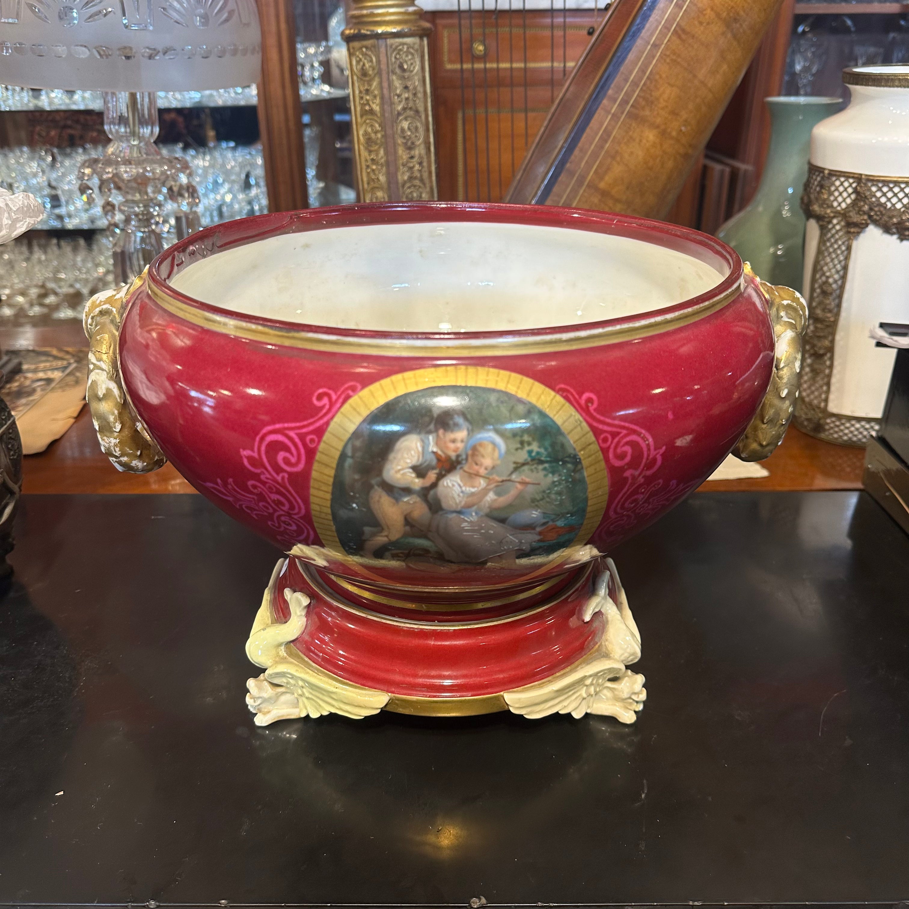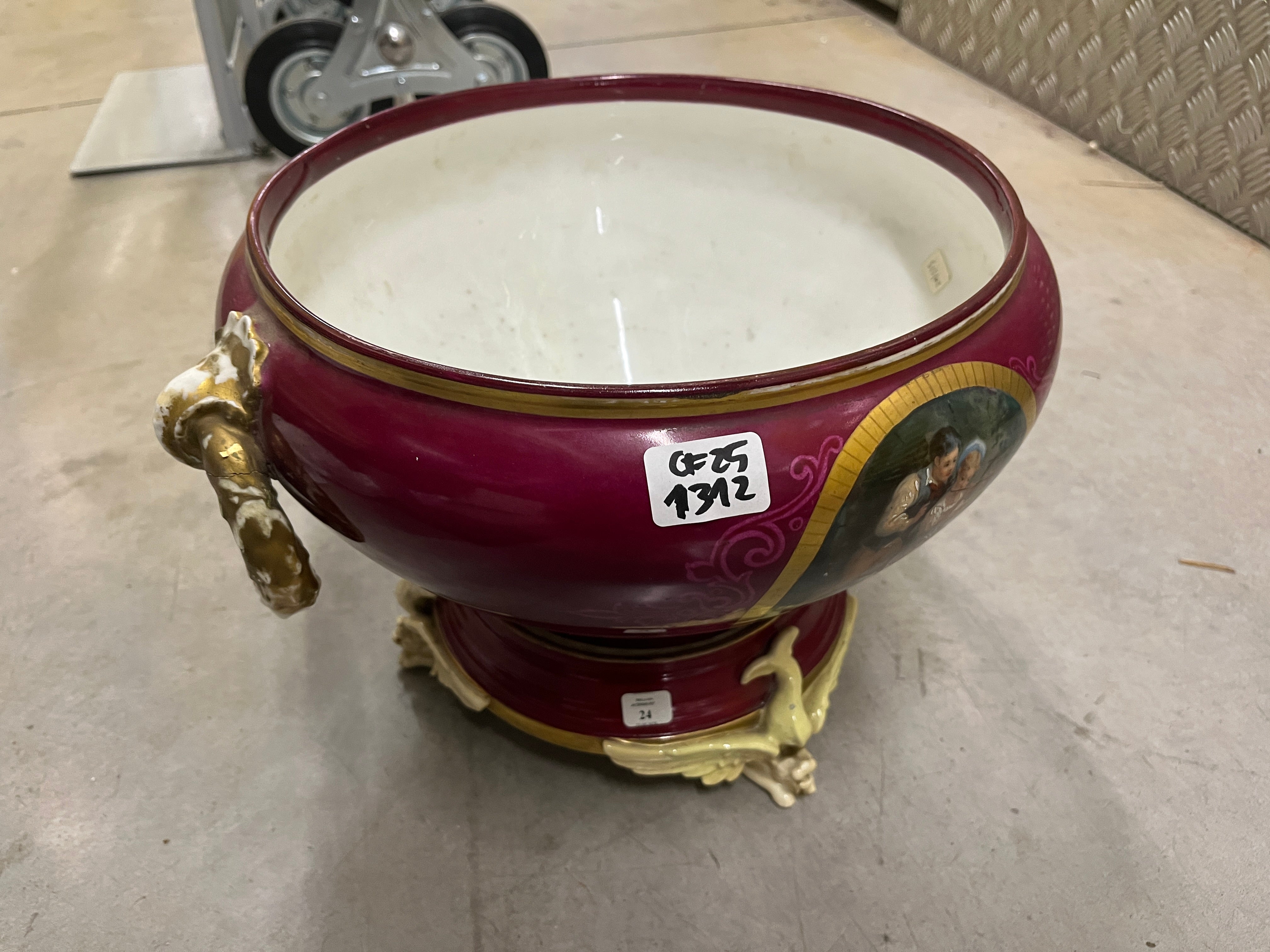 Grande coupe et son support en porcelaine décorés de scènes de couples galants, de médaillons et de couronnes de laurier. Base tripode. Fin du XIXe siècle. Légèrement restauré.