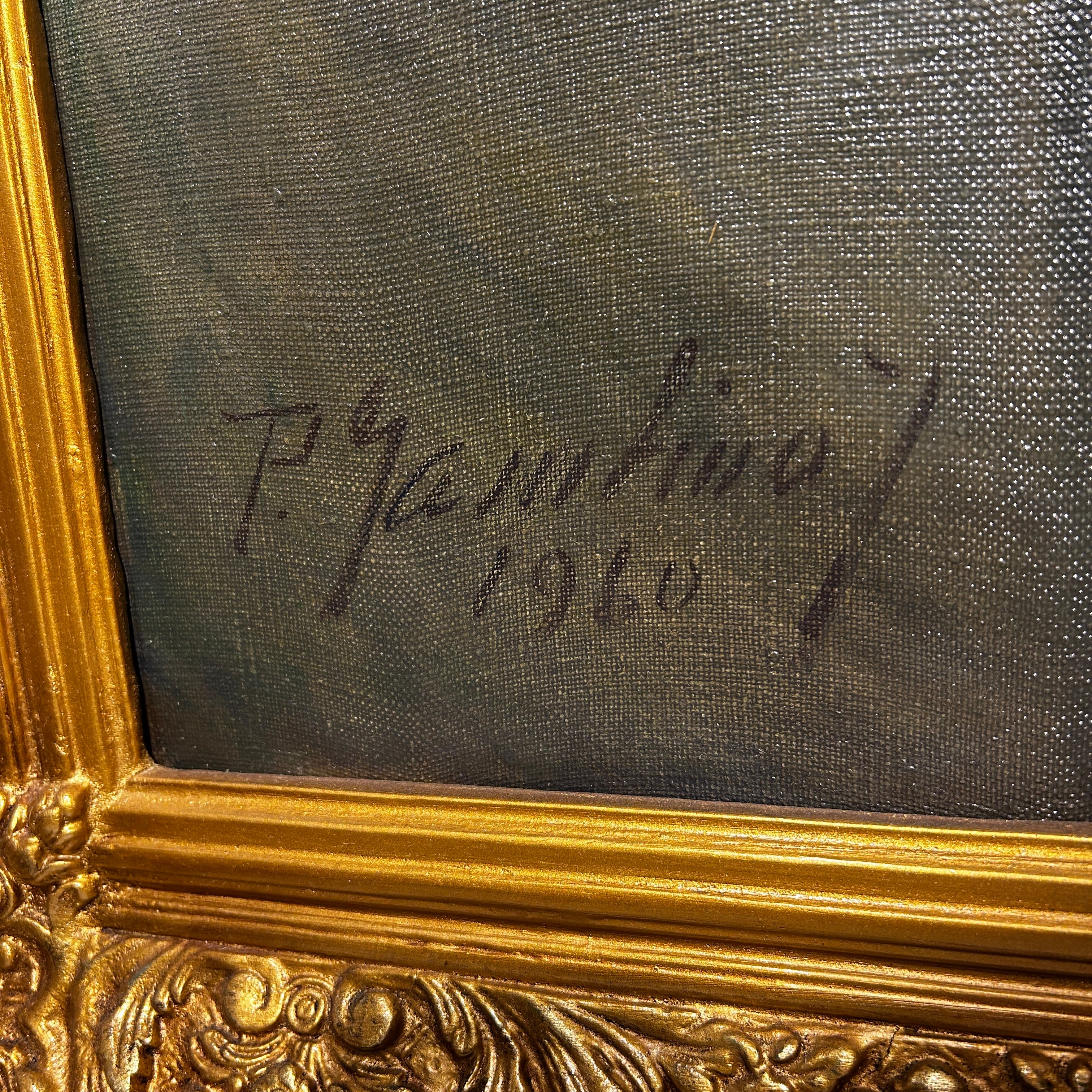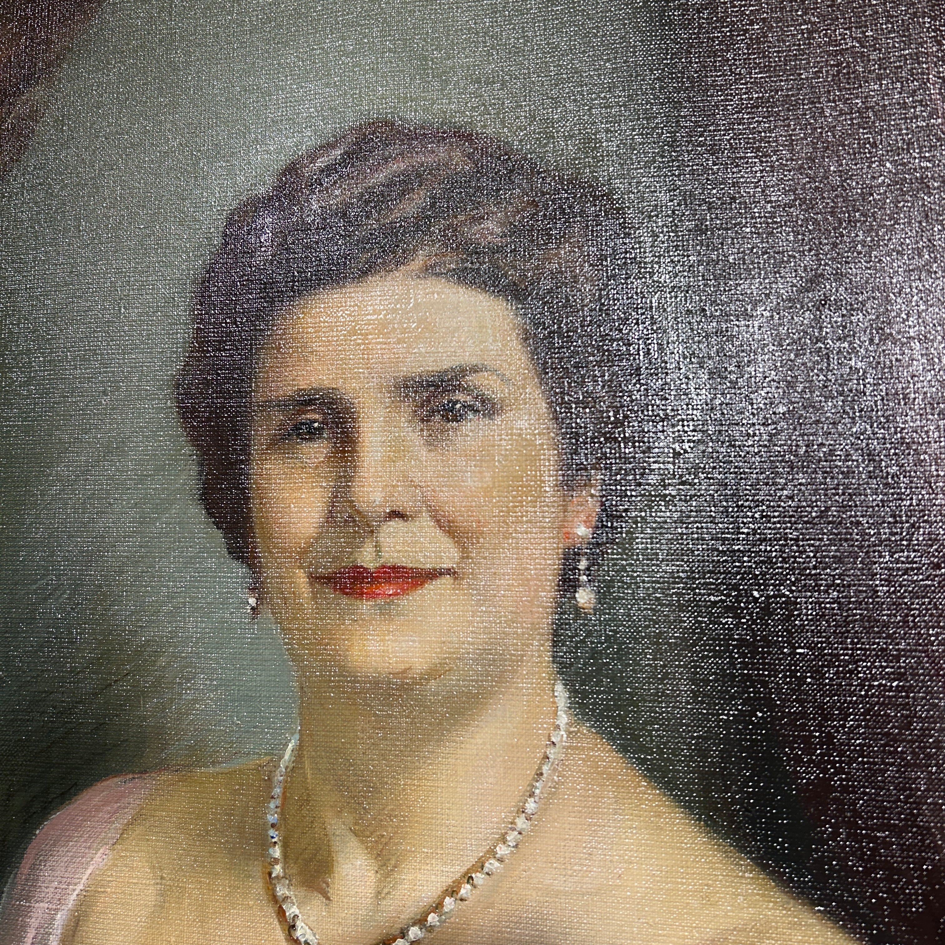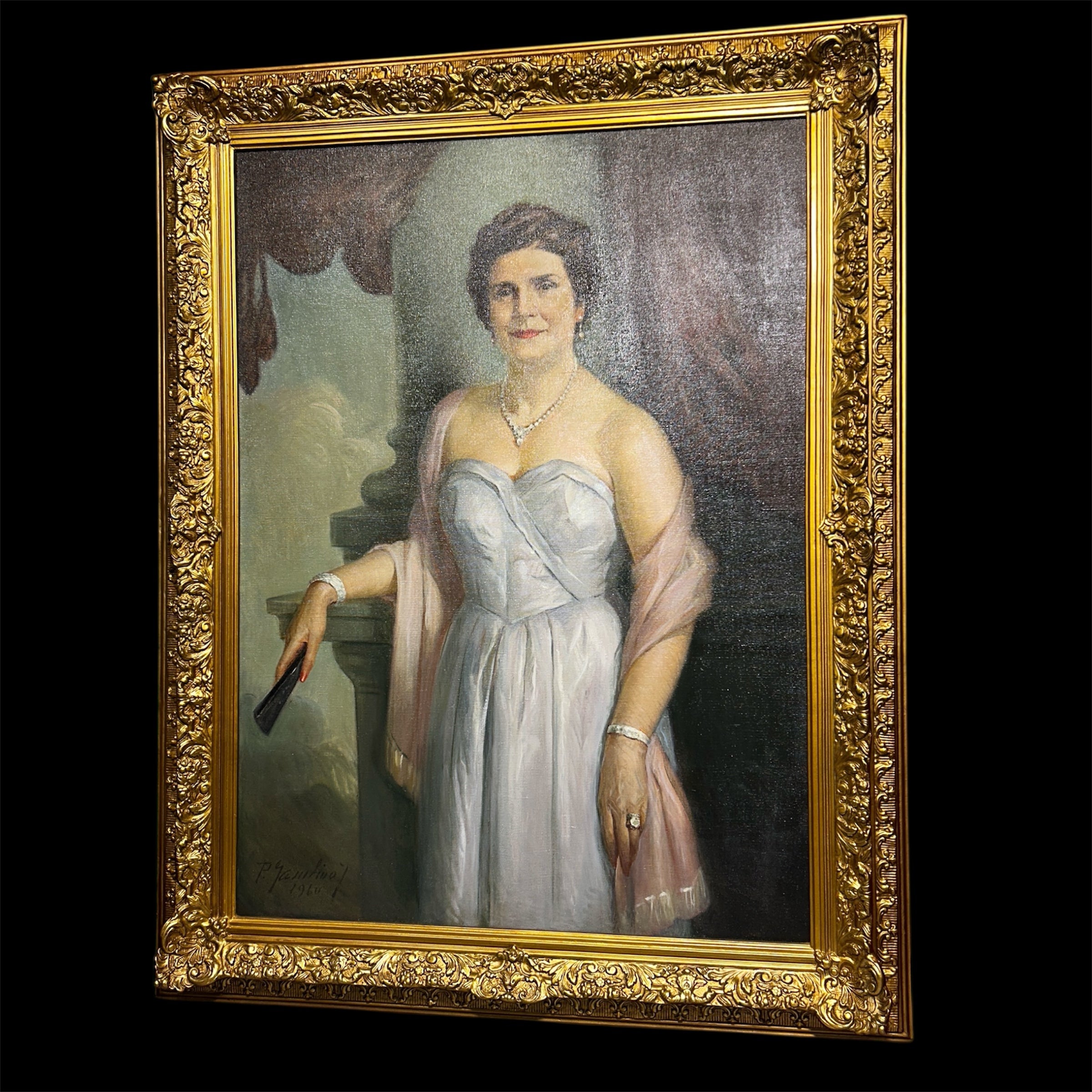 Óleo sobre tela del pintor chileno Pascual Gambino, representado a una dama de una elegancia sobria, vestida de fiesta. La señora tiene un gesto que esboza una leve sonrisa y un gesto relajado, con un abanico cerrado en una de sus manos, que sugiere un contexto formal, pero de celebración. Se trata de un retrato que muestra el gran oficio del pintor, con un bello juego de luces y detalles en la caída de las telas, la textura de la piel, su peinado y los brillantes de su joyería. Además, al ser pintado en 1960, se convierte en una pieza que en pocos elementos permite leer mucho acerca de la aristocracia de la época, su estética y, por lo tanto, sus valores. La obra tiene un marco de madera tallada en intrincados decorados de relieves y está terminada de un luminoso dorado.