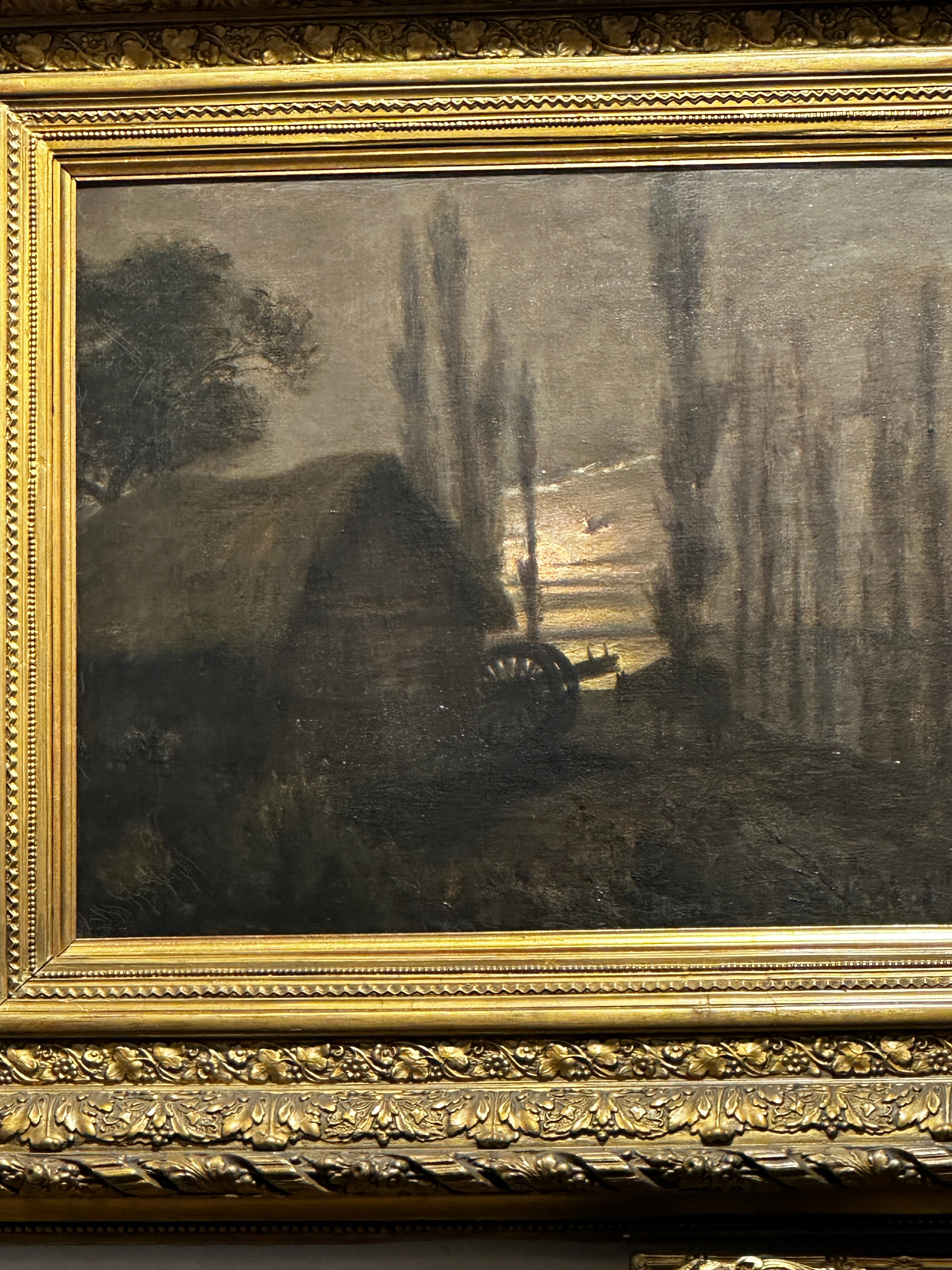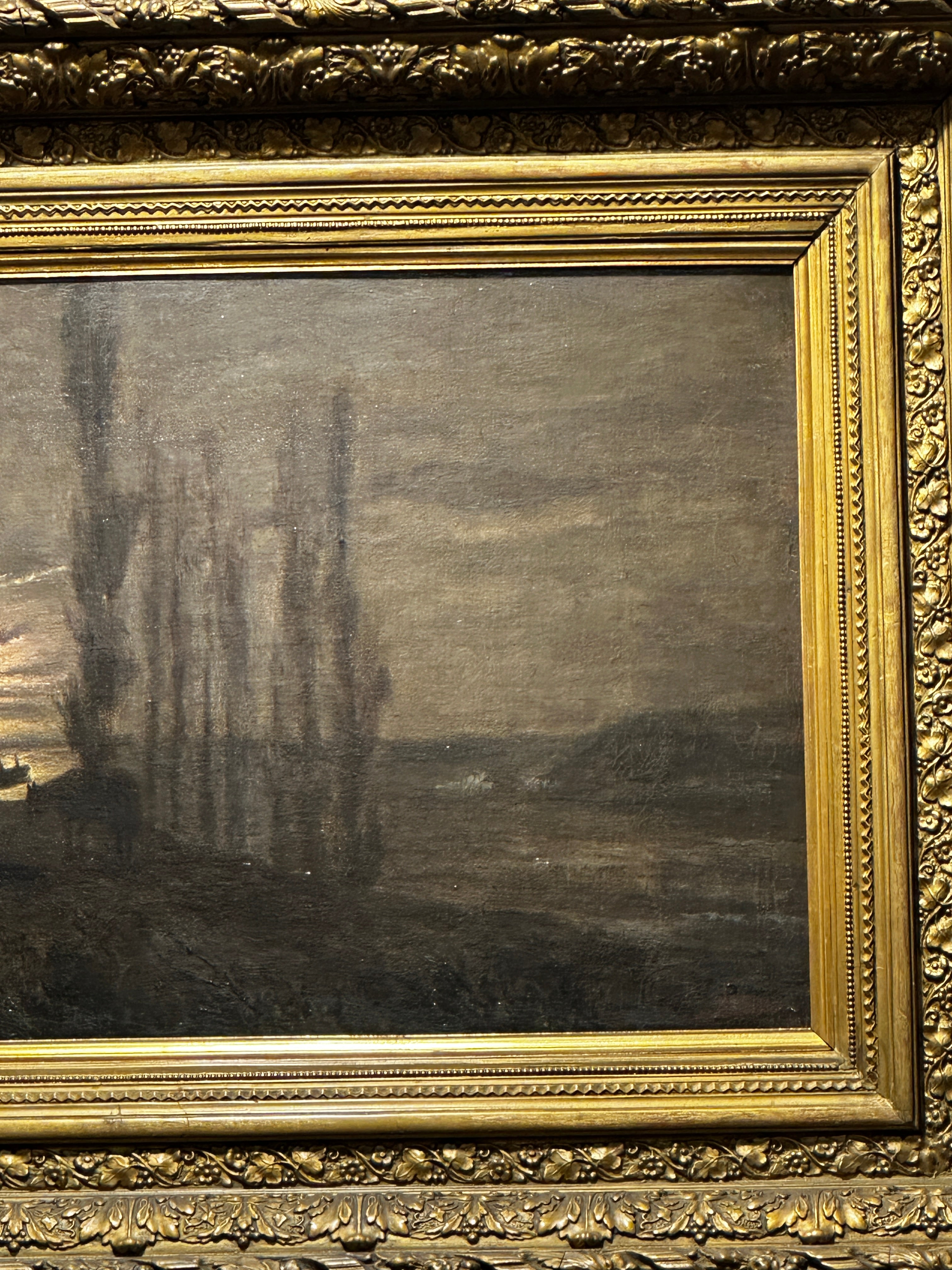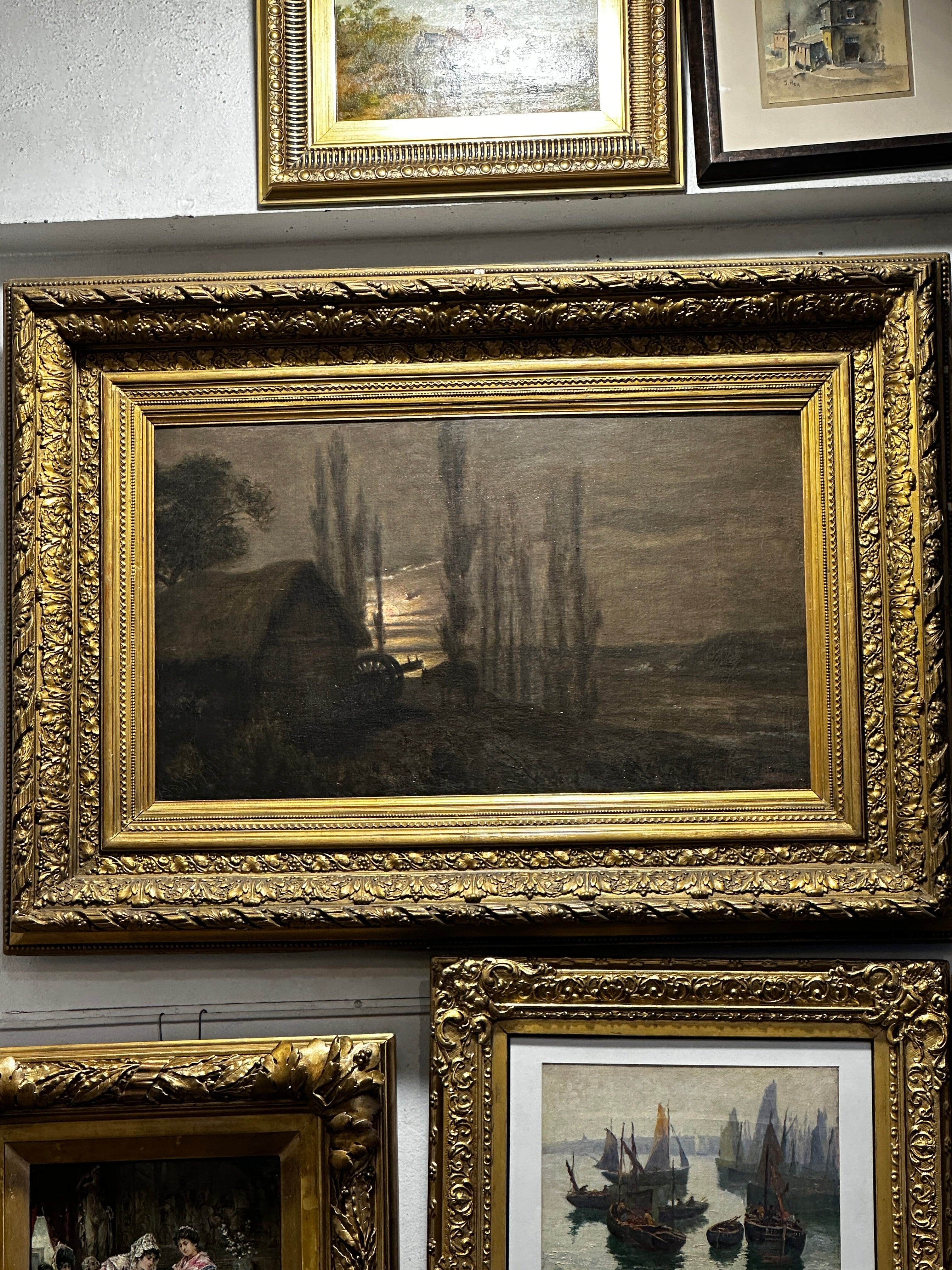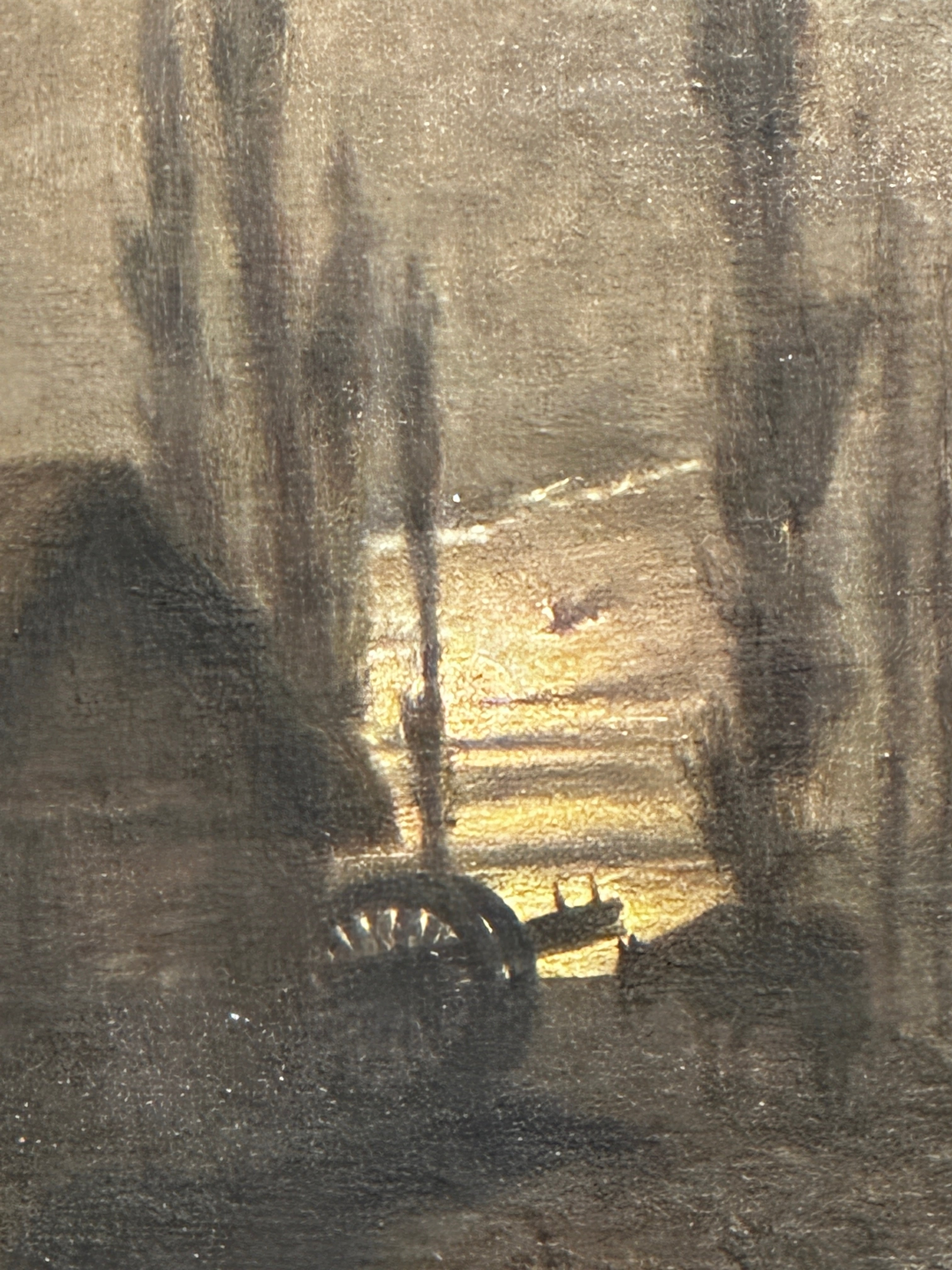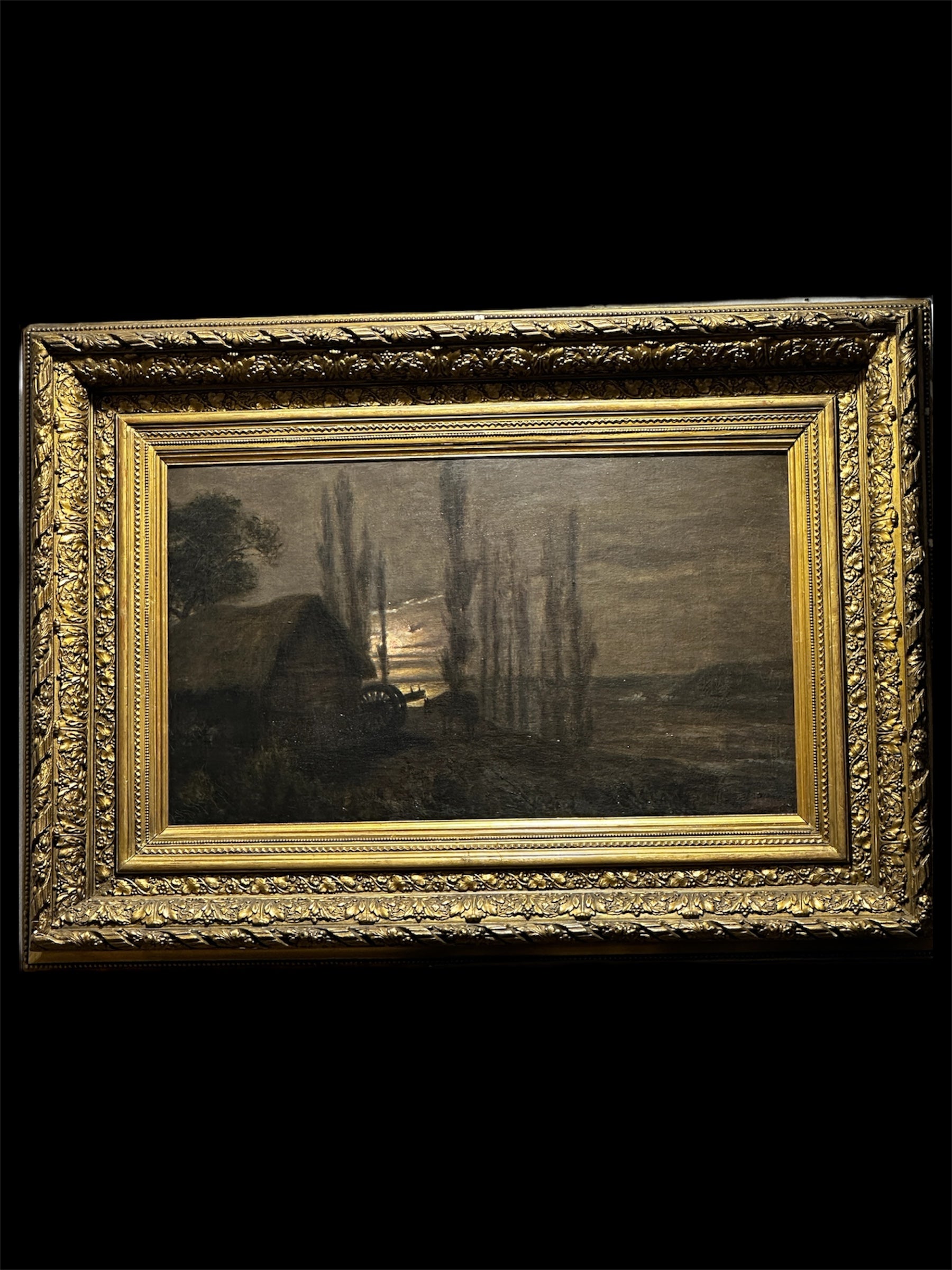 Huile sur toile du célèbre artiste chilien Pedro Lira (1845-1912), représentant un paysage rural nocturne. L'œuvre présente une composition intéressante : la lune à l'horizon illumine la scène, révélant les silhouettes du paysage, avec ses arbres, ses collines, une maison, un cheval et un chariot, rétroéclairés. L'œuvre est encadrée dans un magnifique bois sculpté en relief et peint en doré.