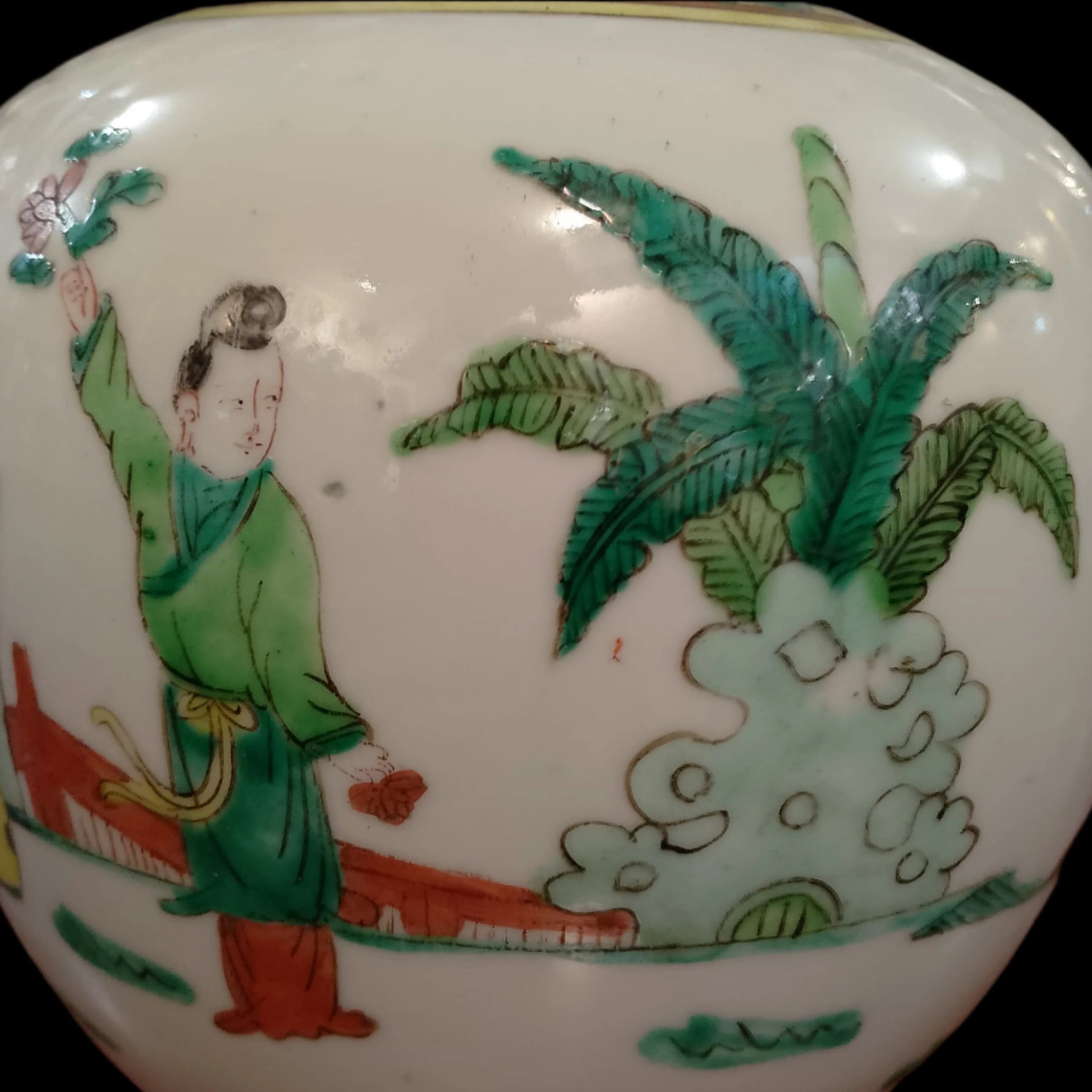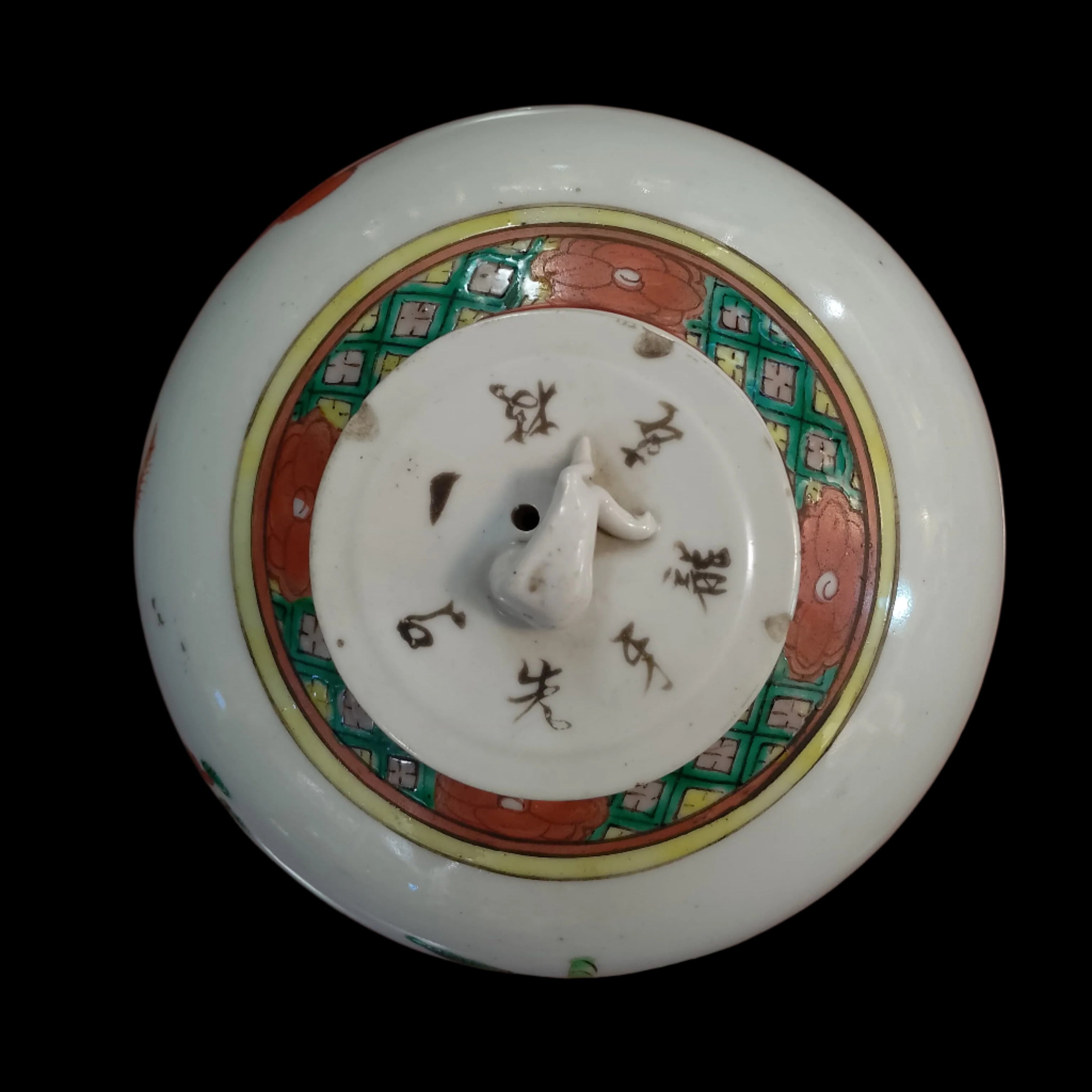 Magnifique pot en porcelaine chinoise peinte à la main représentant une scène de jeu d'enfants. Cette poterie décorative de style Famille Rose, originaire de la dynastie Qing (milieu du XVIIe siècle - début du XXe siècle), se caractérise par des motifs complexes et des couleurs vives. Elle est dotée d'un bouchon amovible et d'un sceau traditionnel à la base, indiquant son origine et son style.
