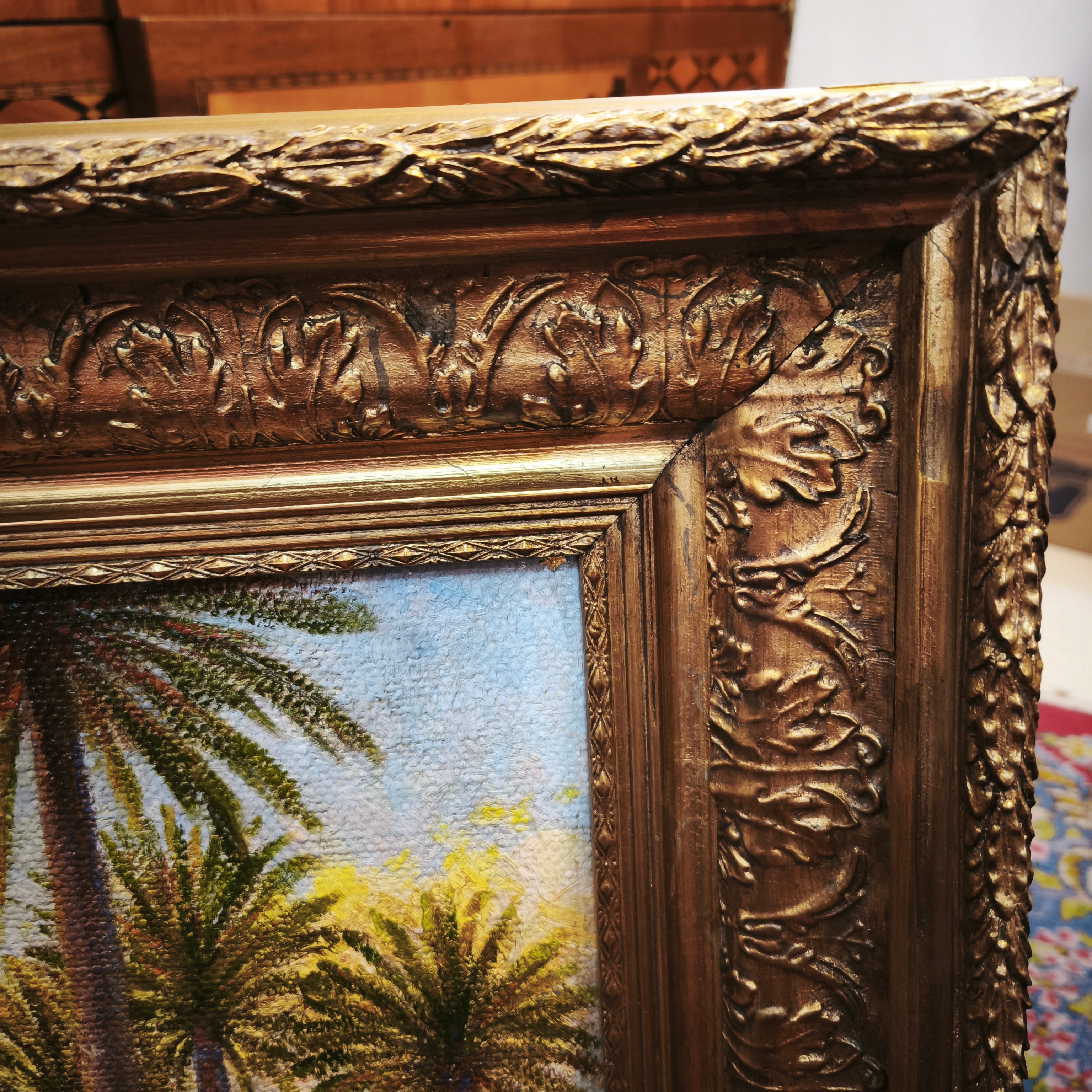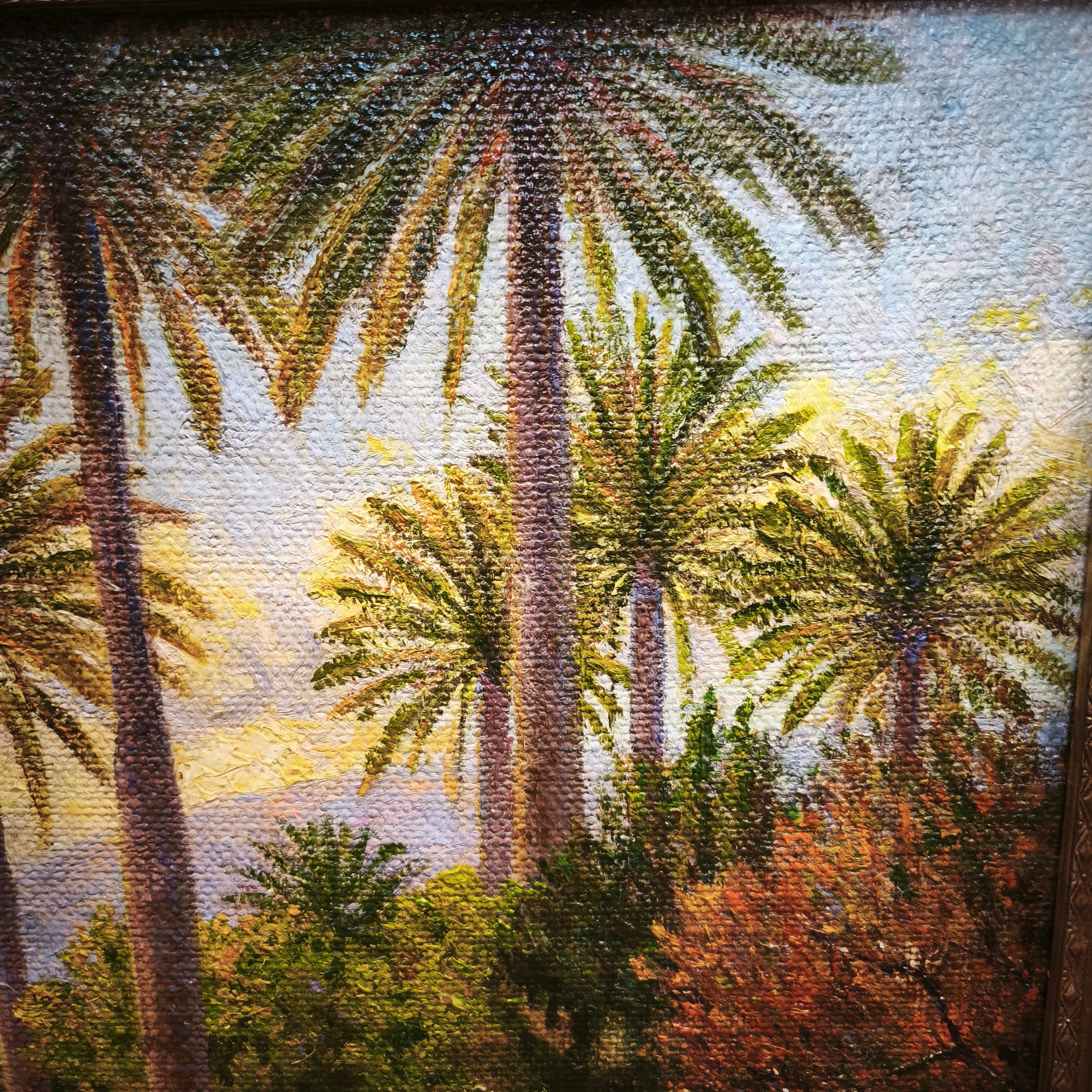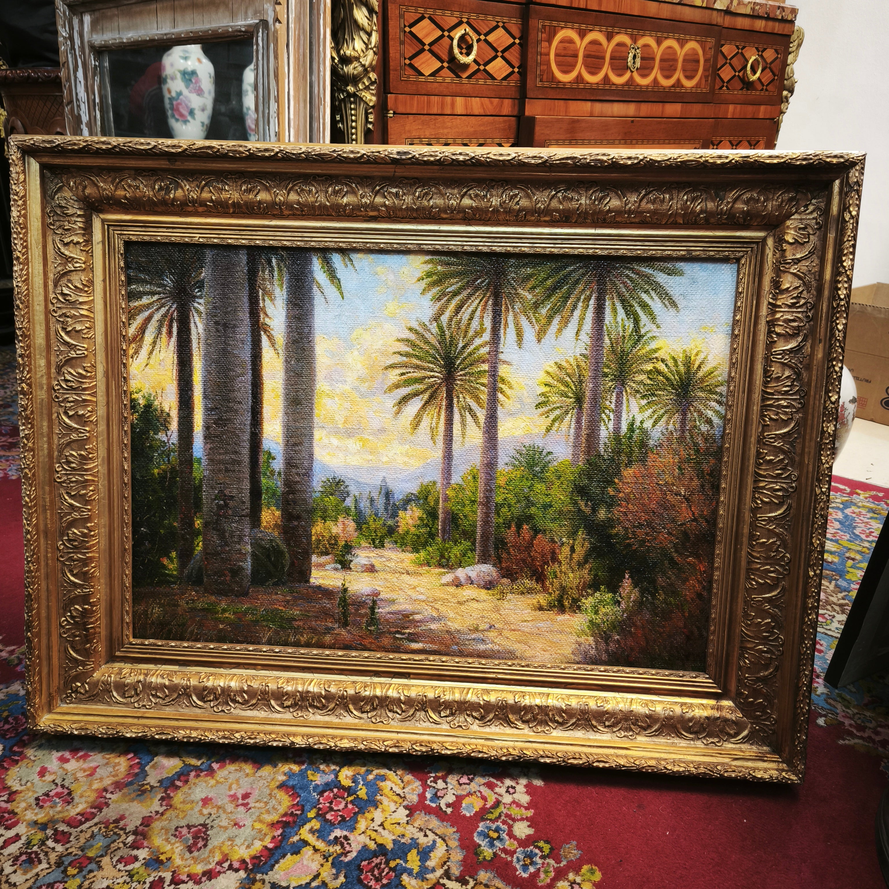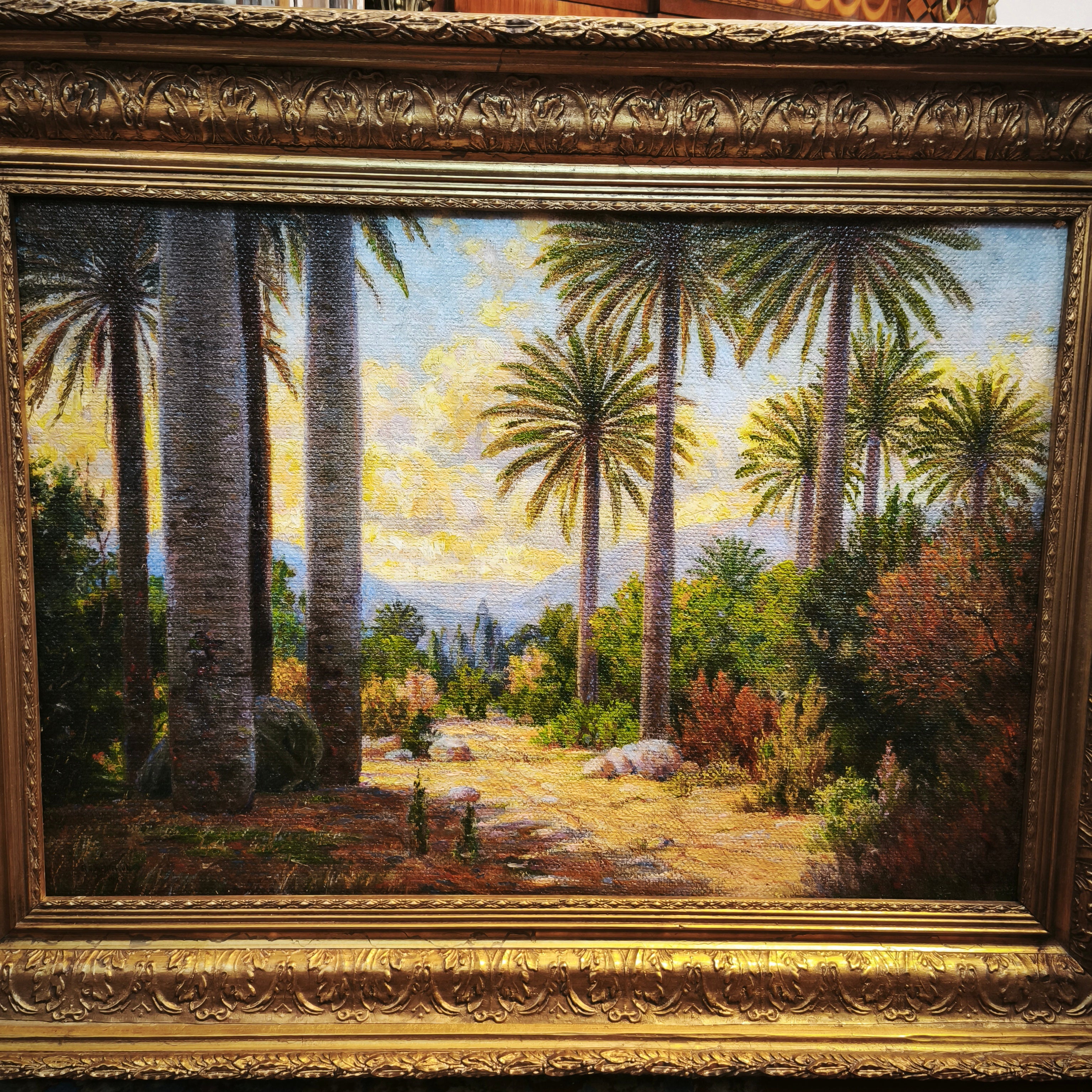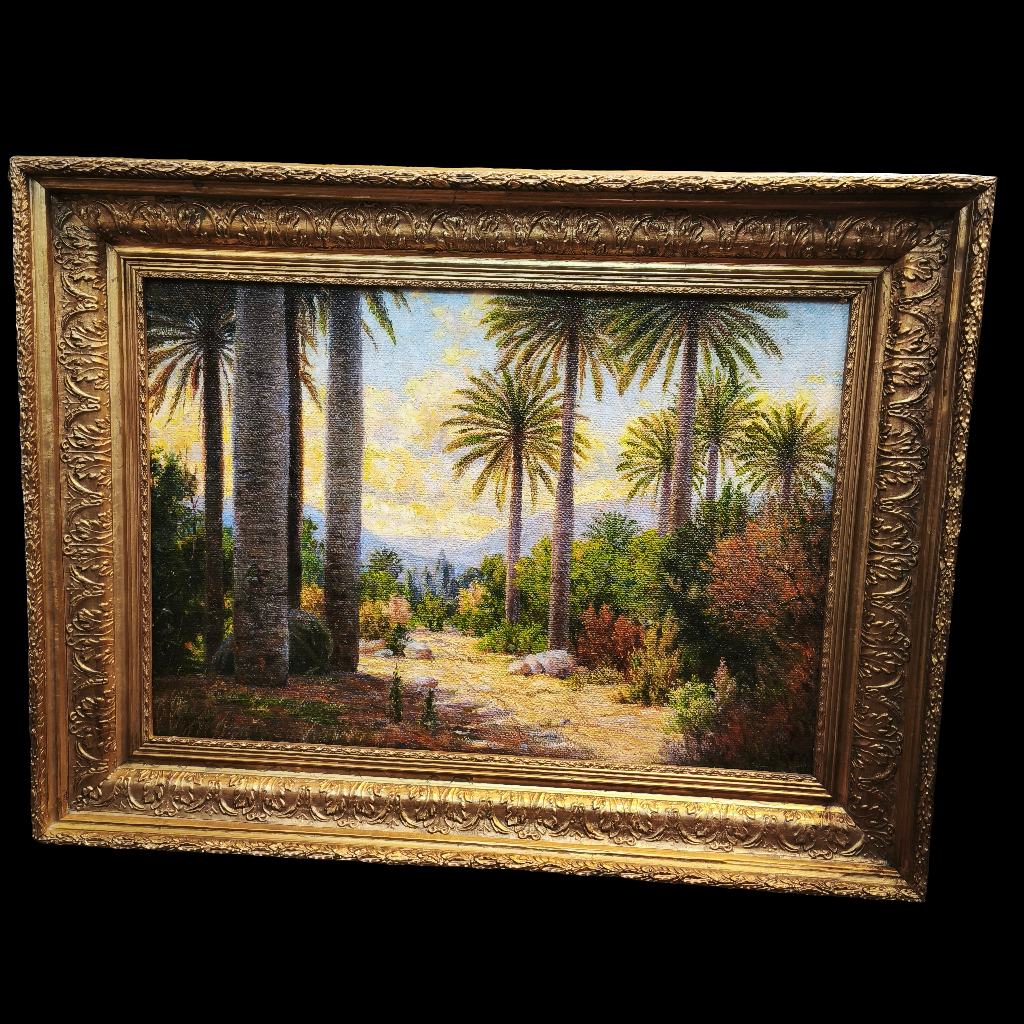 Huile sur toile de l'artiste R. Stillfried, représentant un paysage chaleureux de la Vallée Centrale, avec sa végétation caractéristique, composée de palmiers et d'arbustes variés, avec les collines ou peut-être la chaîne de montagnes côtière en arrière-plan. La composition repose sur deux sections de végétation texturée sur les côtés, dans des tons de vert, de jaune et de rouge, séparées au centre par un chemin de terre jaune qui s'ouvre vers l'horizon, créant un point de fuite et équilibrant visuellement l'œuvre. Il convient également de noter que la toile présente une texture granuleuse qui met en valeur la matière et donne plus de relief à la végétation du paysage. L'œuvre est magnifiquement encadrée dans un bois sculpté orné de reliefs et peint dans une élégante couleur dorée.