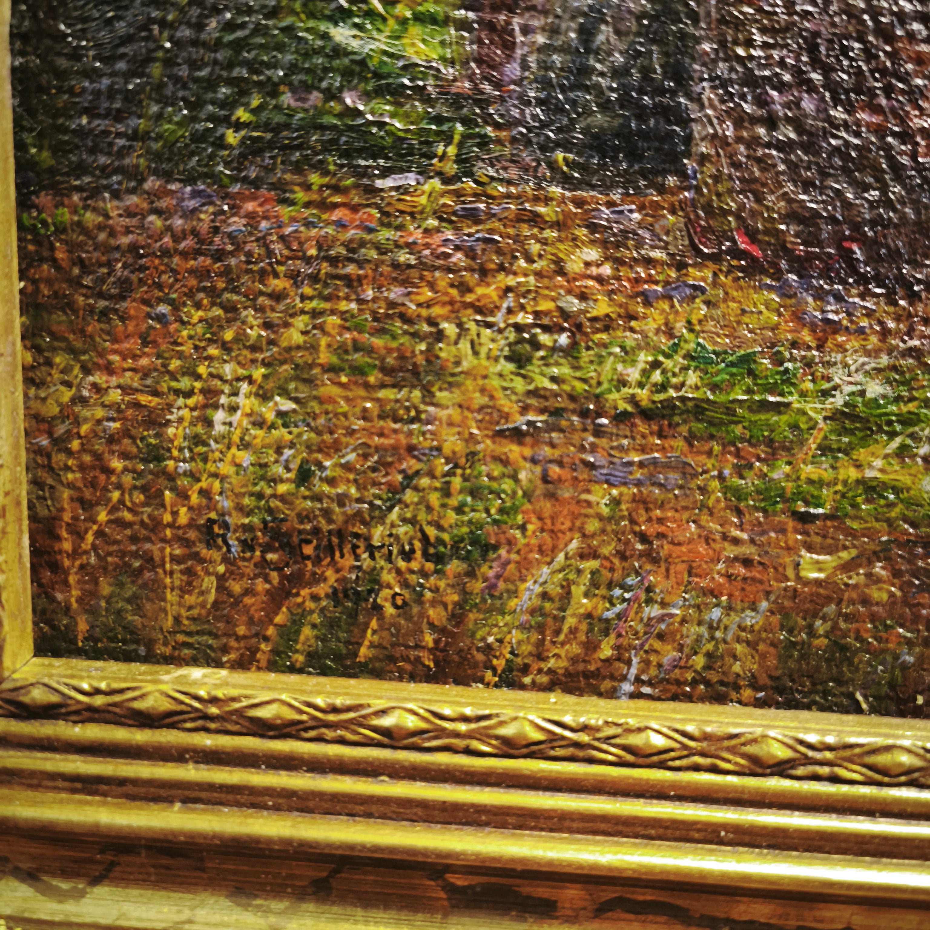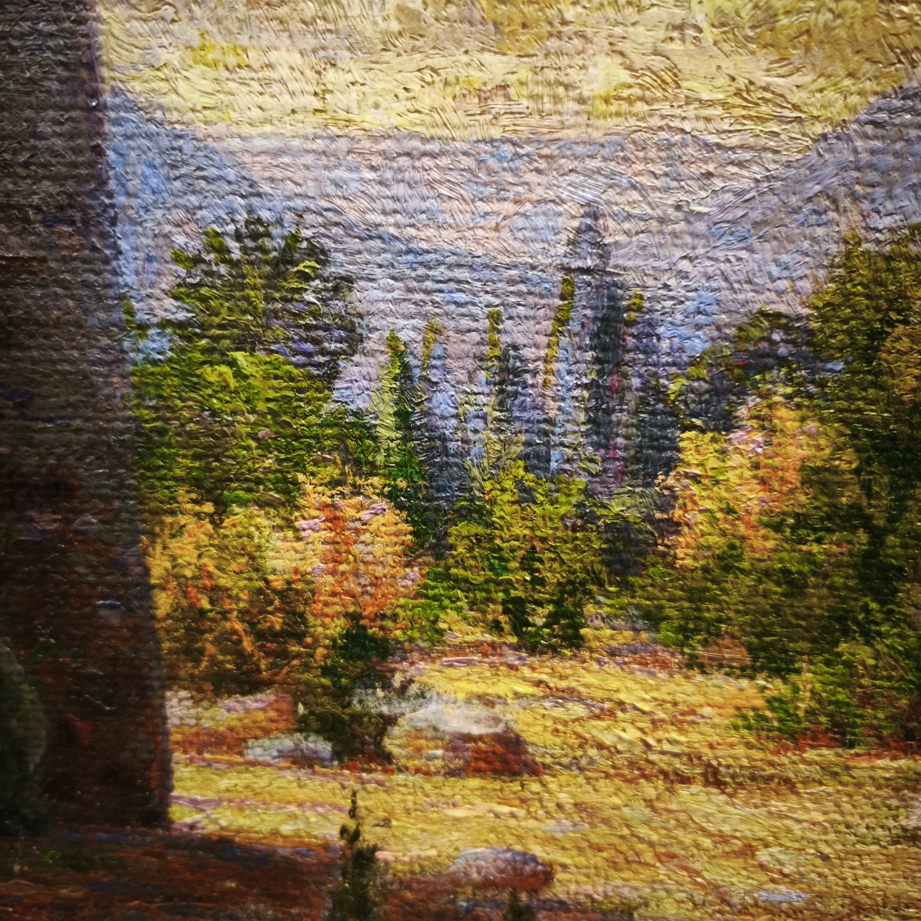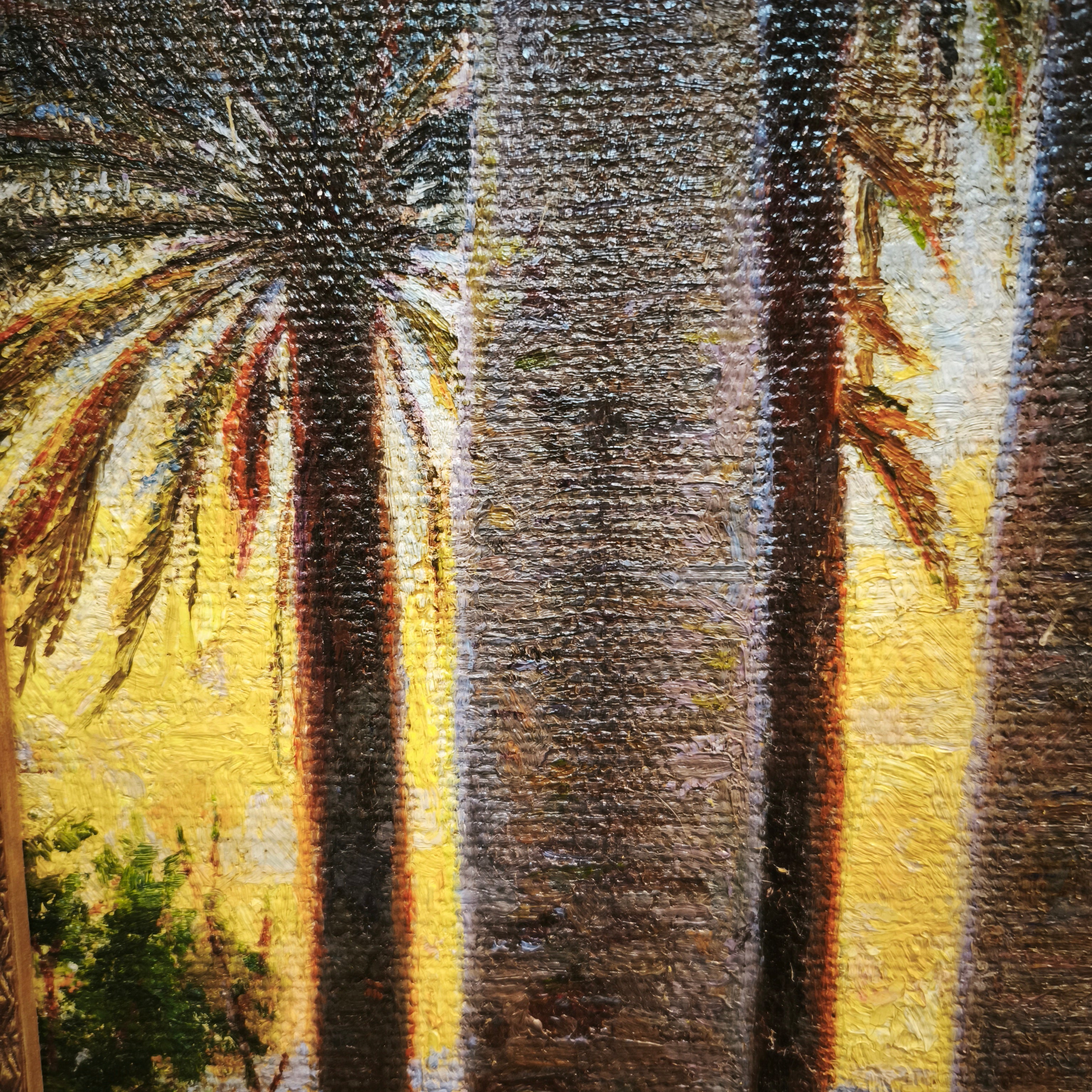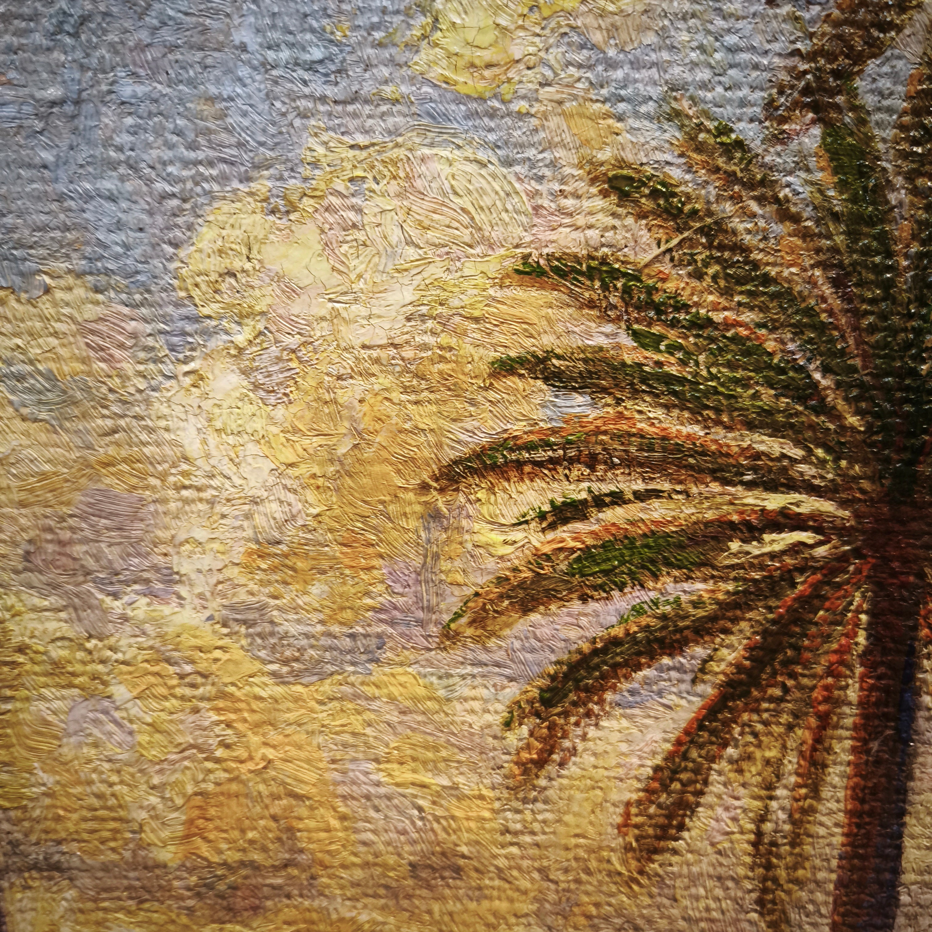 Huile sur toile de l'artiste R. Stillfried, représentant un paysage chaleureux de la Vallée Centrale, avec sa végétation caractéristique, composée de palmiers et d'arbustes variés, avec les collines ou peut-être la chaîne de montagnes côtière en arrière-plan. La composition repose sur deux sections de végétation texturée sur les côtés, dans des tons de vert, de jaune et de rouge, séparées au centre par un chemin de terre jaune qui s'ouvre vers l'horizon, créant un point de fuite et équilibrant visuellement l'œuvre. Il convient également de noter que la toile présente une texture granuleuse qui met en valeur la matière et donne plus de relief à la végétation du paysage. L'œuvre est magnifiquement encadrée dans un bois sculpté orné de reliefs et peint dans une élégante couleur dorée.