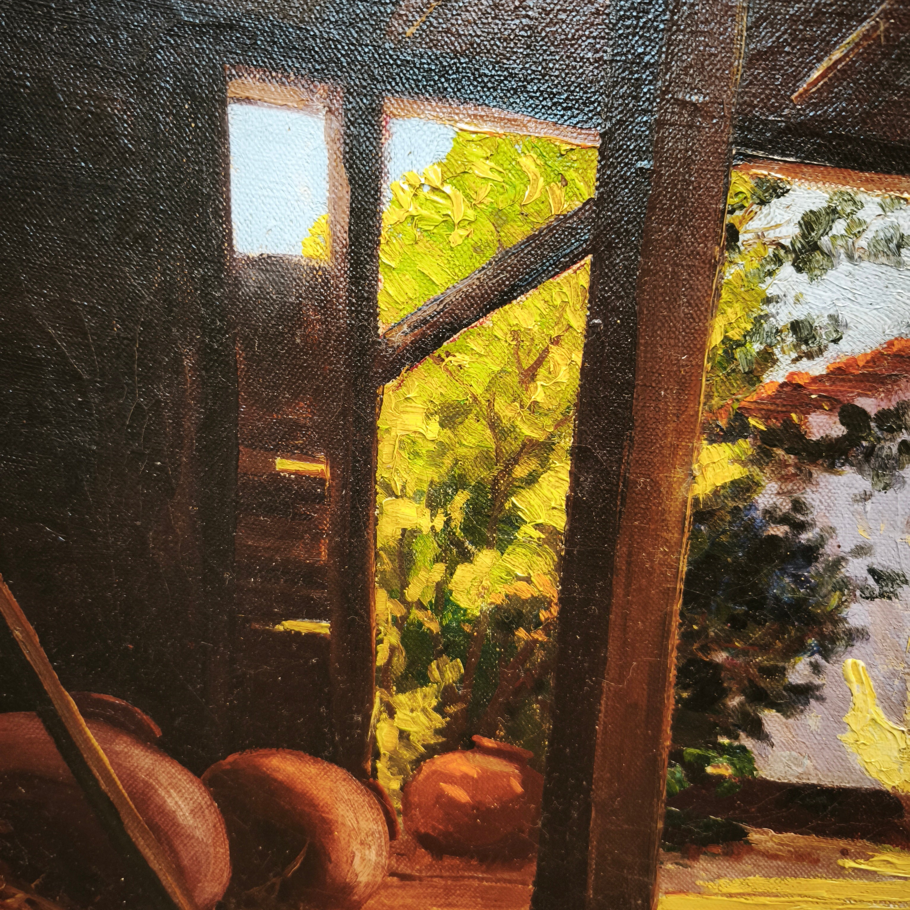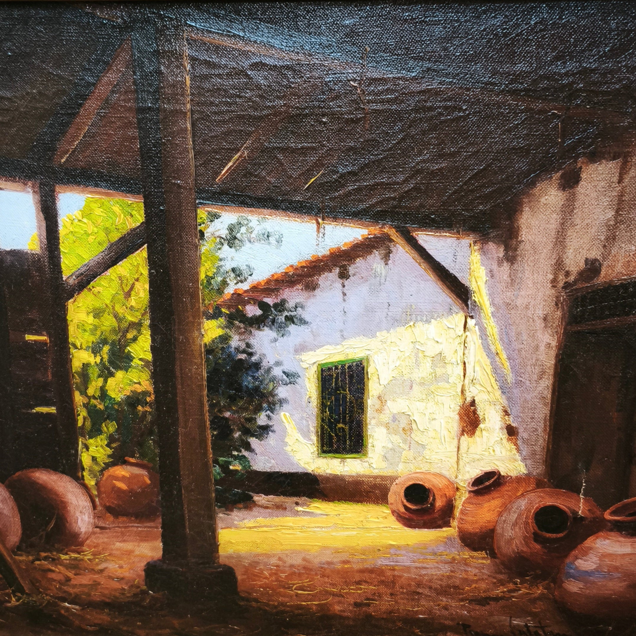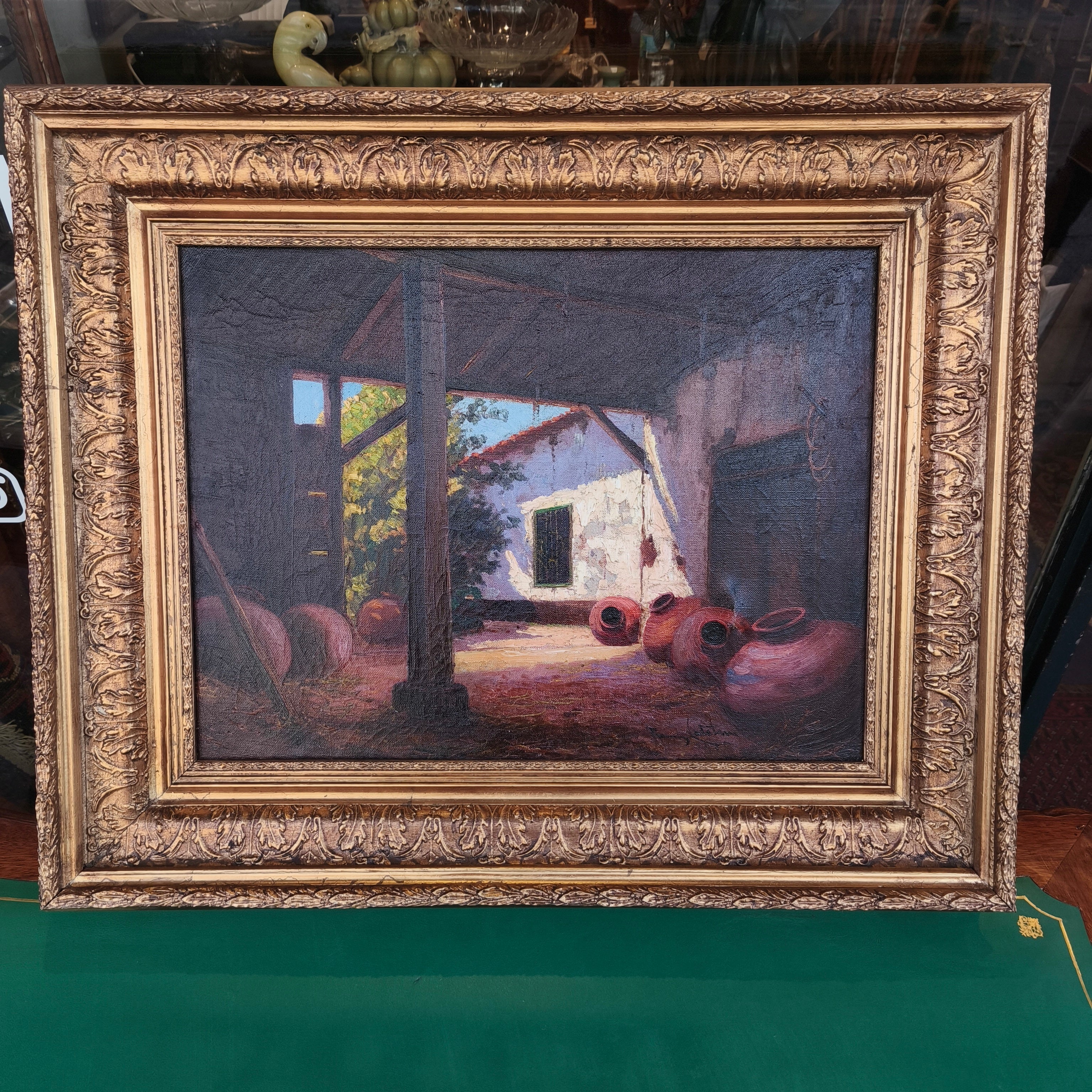 Huile sur toile du célèbre artiste chilien Benito Ramos Catalán (1888-1961), représentant une scène traditionnelle de la campagne chilienne, située sous le portique d'une maison de campagne donnant sur une cour intérieure. La scène offre un magnifique jeu d'ombres et de lumières, tirant parti de la perspective intérieure-extérieure, accentuant la présence de vases en terre cuite et d'un arbre en arrière-plan, apportant lumière et couleur au tableau. L'œuvre est encadrée dans un magnifique cadre en bois sculpté orné de reliefs et peint d'une élégante dorure.