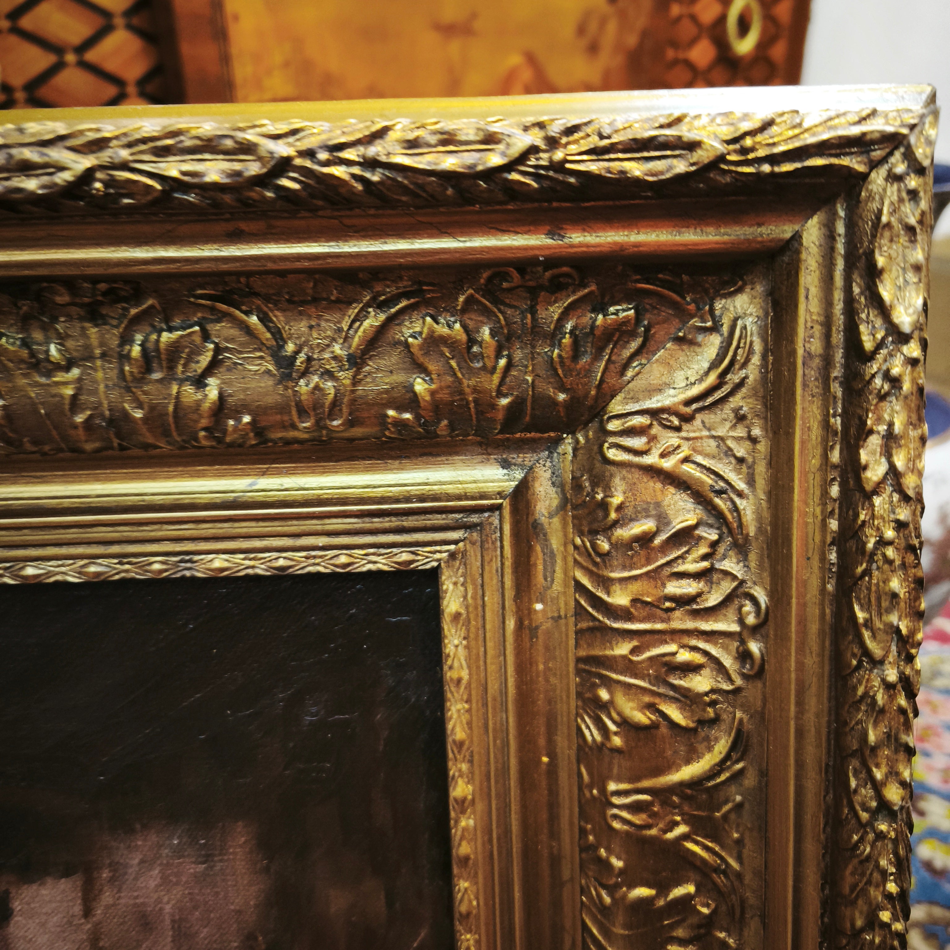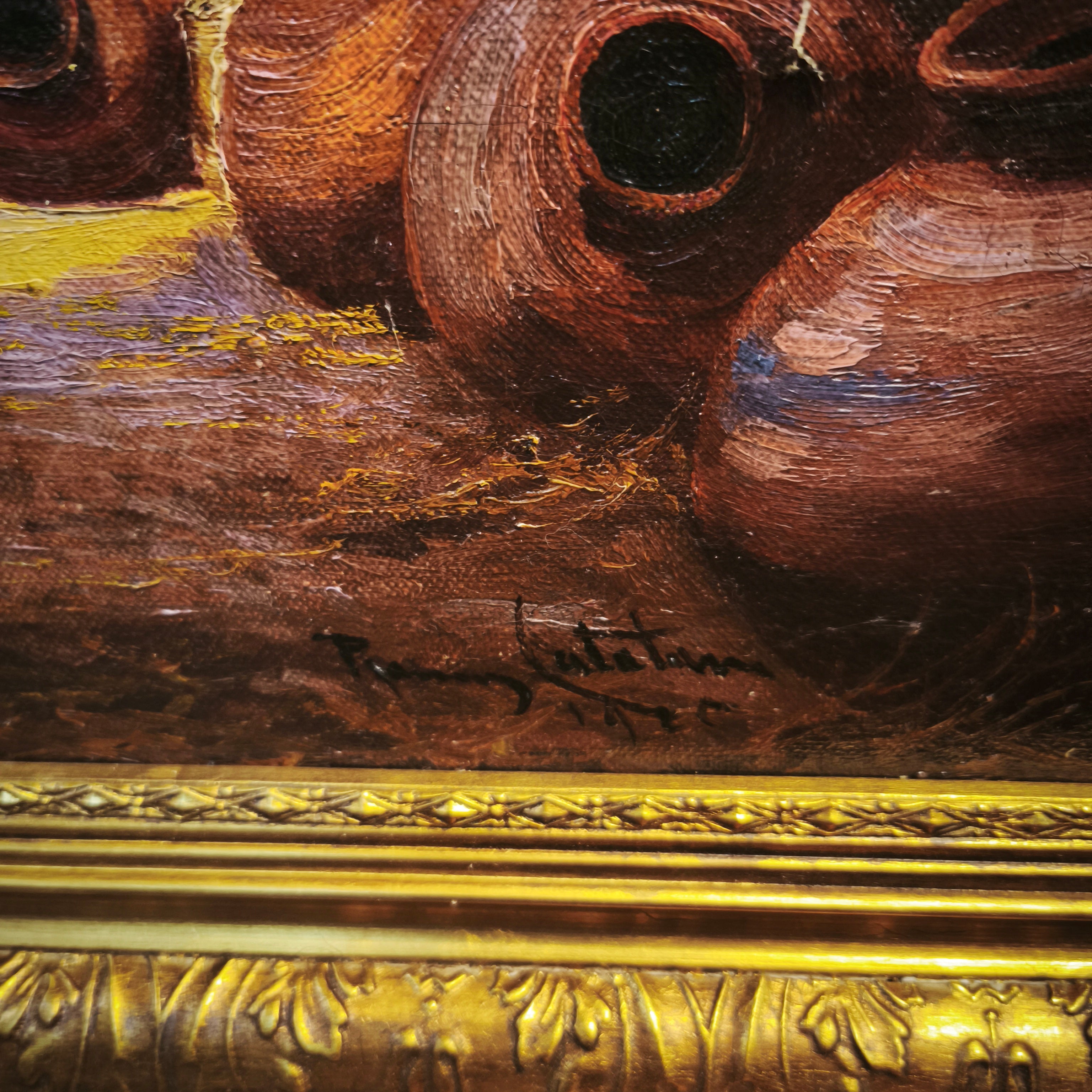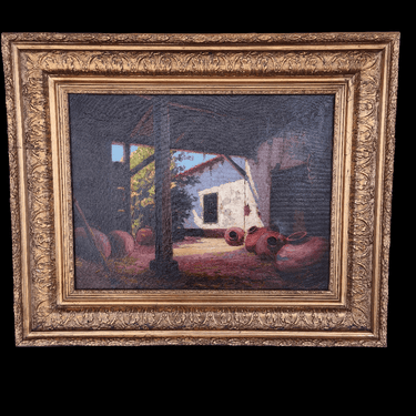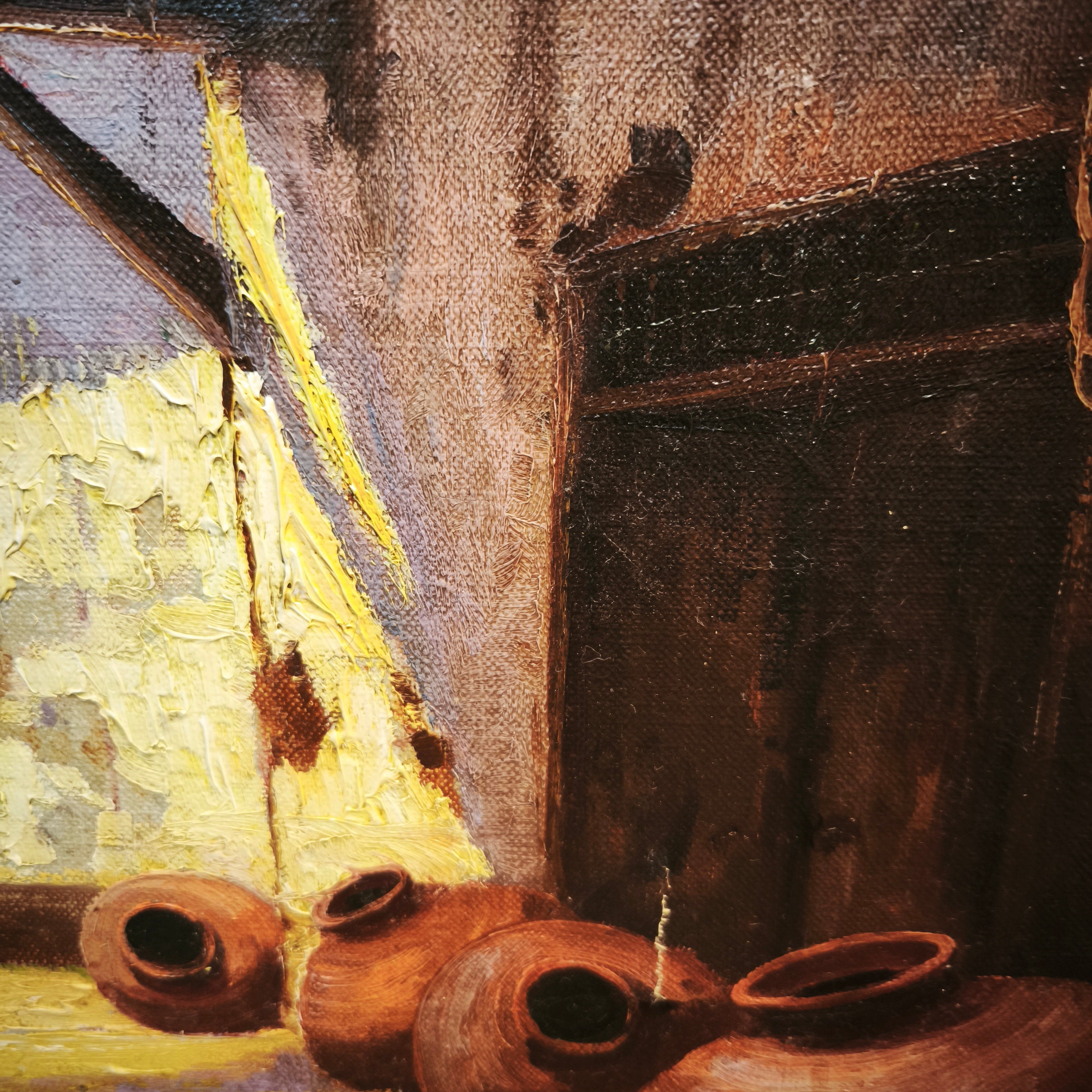 Huile sur toile du célèbre artiste chilien Benito Ramos Catalán (1888-1961), représentant une scène traditionnelle de la campagne chilienne, située sous le portique d'une maison de campagne donnant sur une cour intérieure. La scène offre un magnifique jeu d'ombres et de lumières, tirant parti de la perspective intérieure-extérieure, accentuant la présence de vases en terre cuite et d'un arbre en arrière-plan, apportant lumière et couleur au tableau. L'œuvre est encadrée dans un magnifique cadre en bois sculpté orné de reliefs et peint d'une élégante dorure.