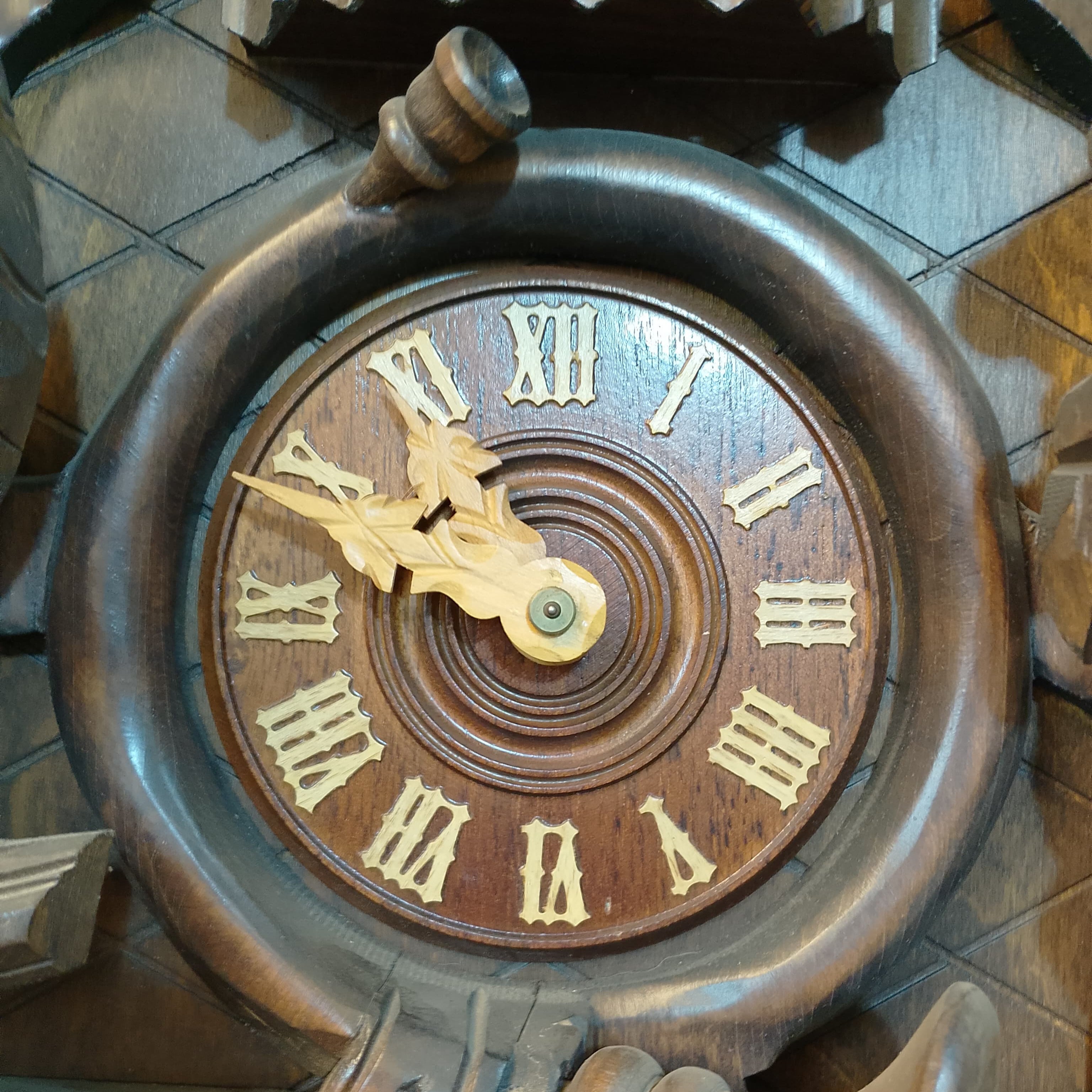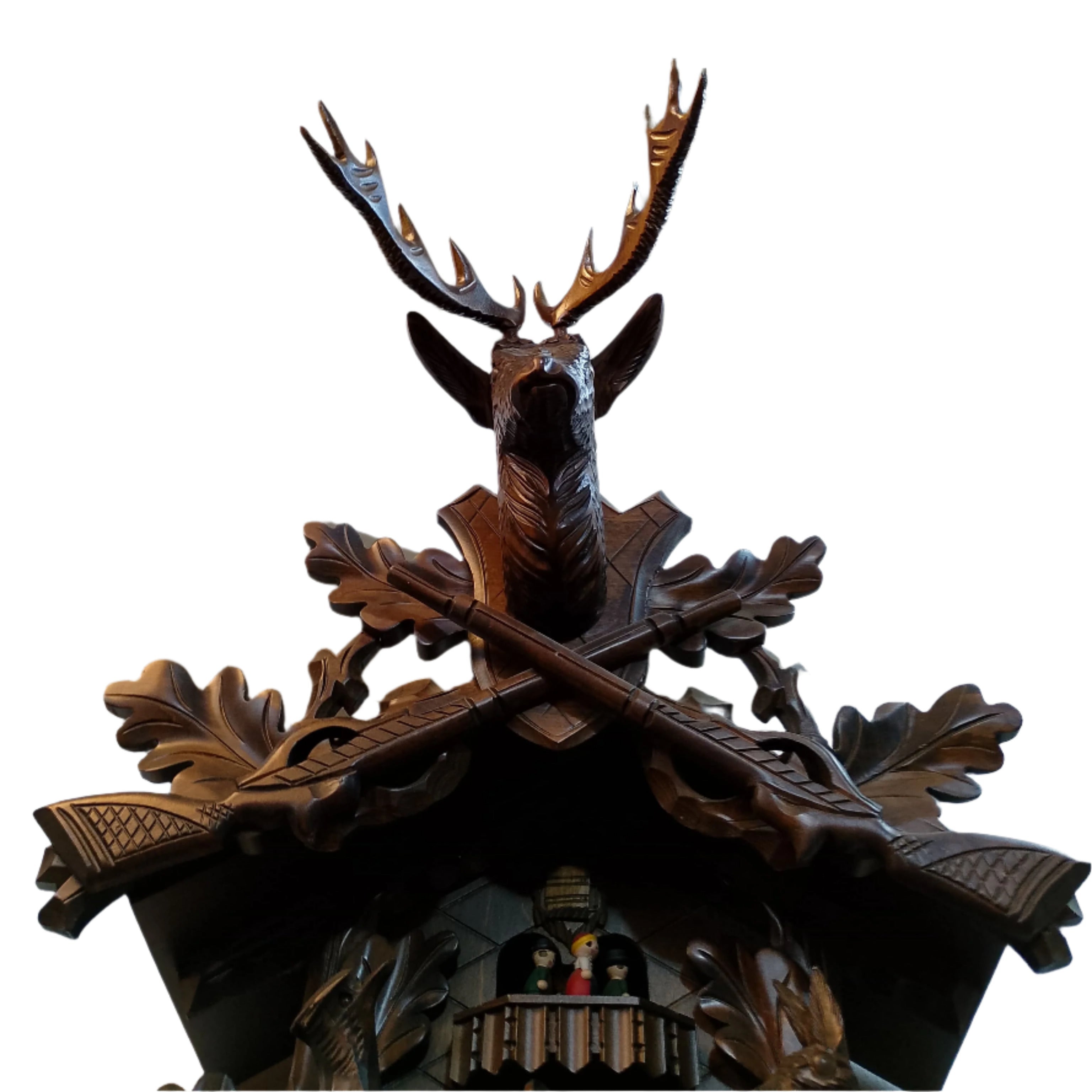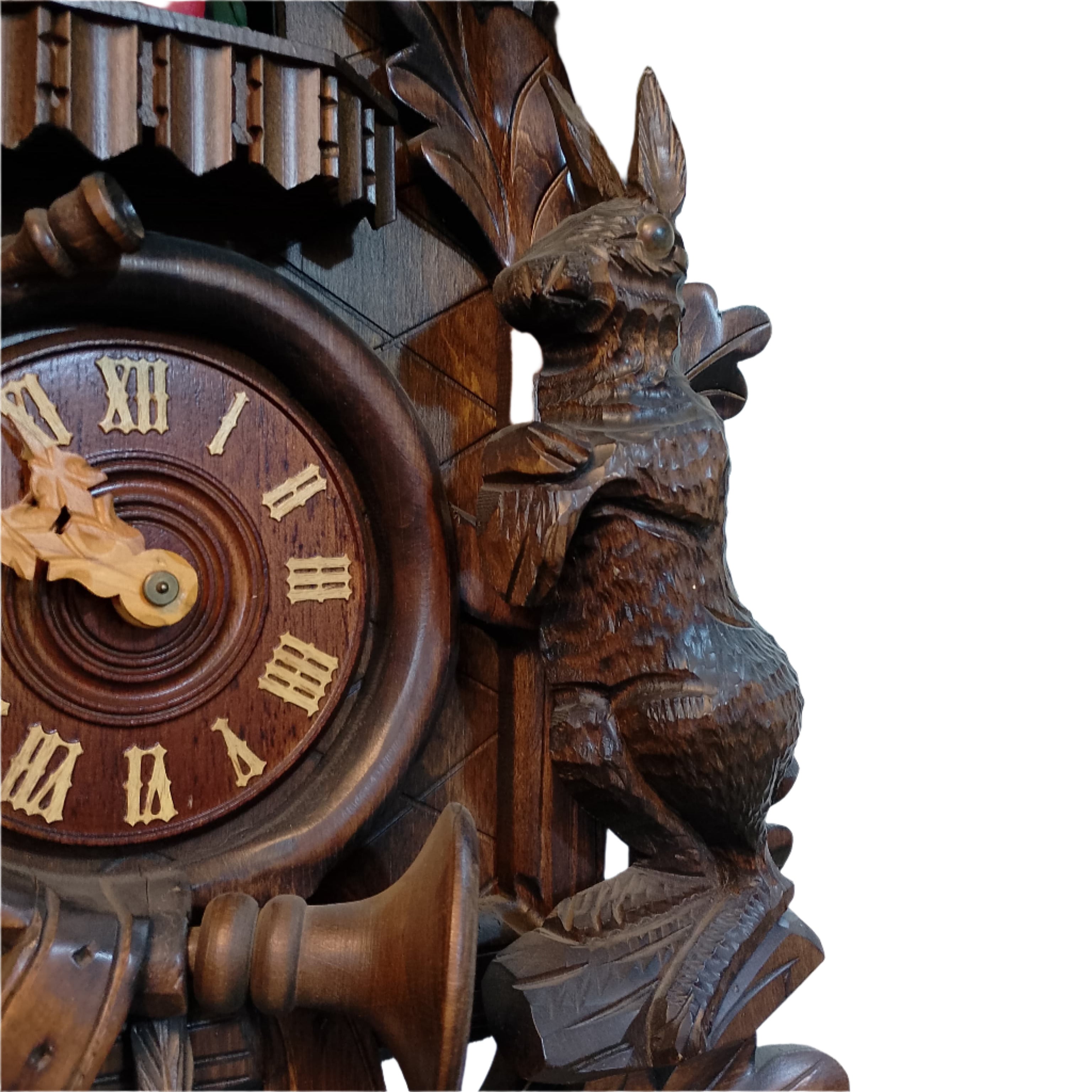 Magnifique et élégante horloge à coucou de fabrication allemande, sculptée dans du bois aux motifs typiques de la Forêt-Noire : végétation sauvage, lapin, oiseaux et tête de cerf entre deux fusils. Une étiquette sur le dessous confirme la fabrication suisse du mécanisme interne.
