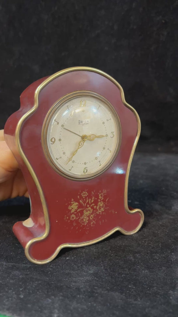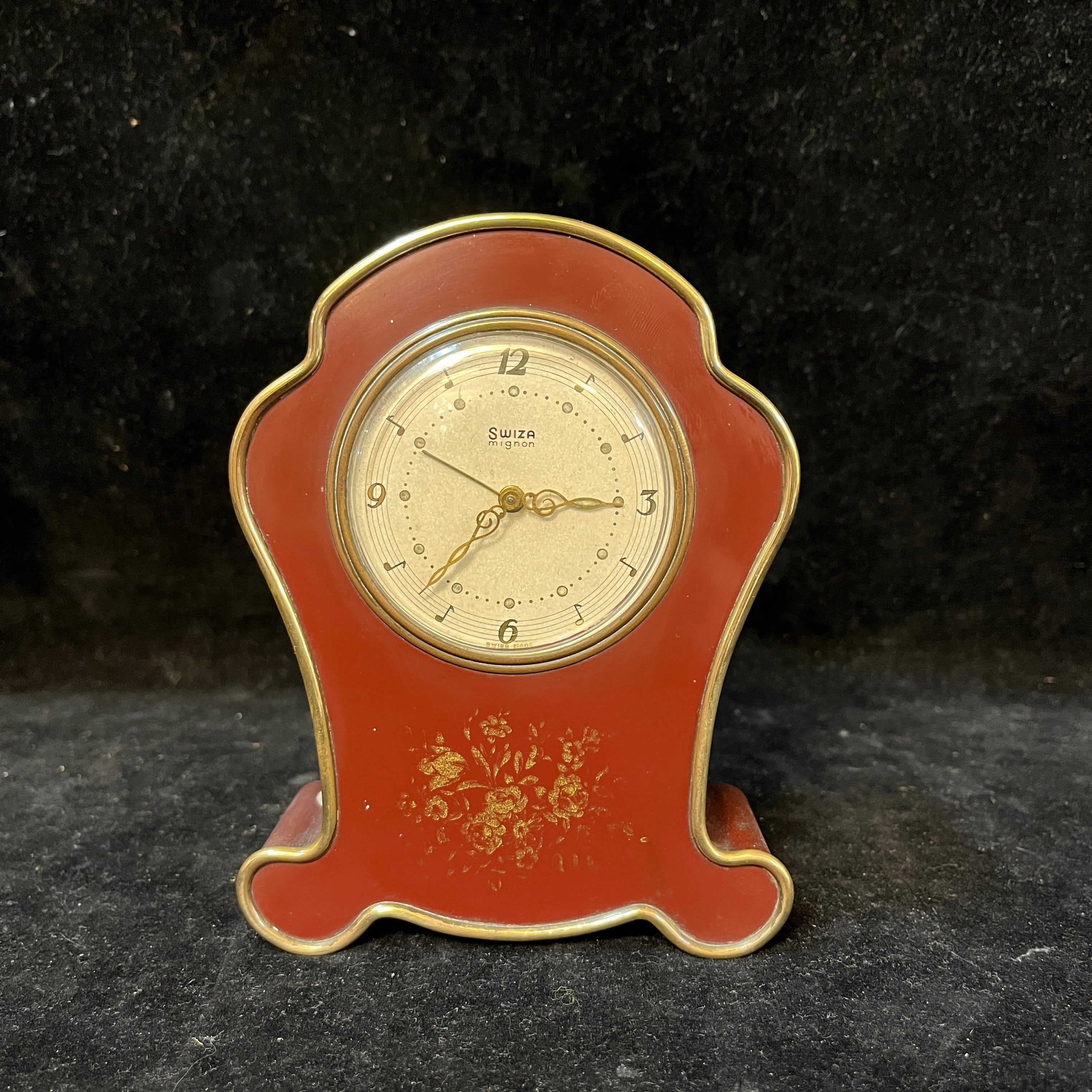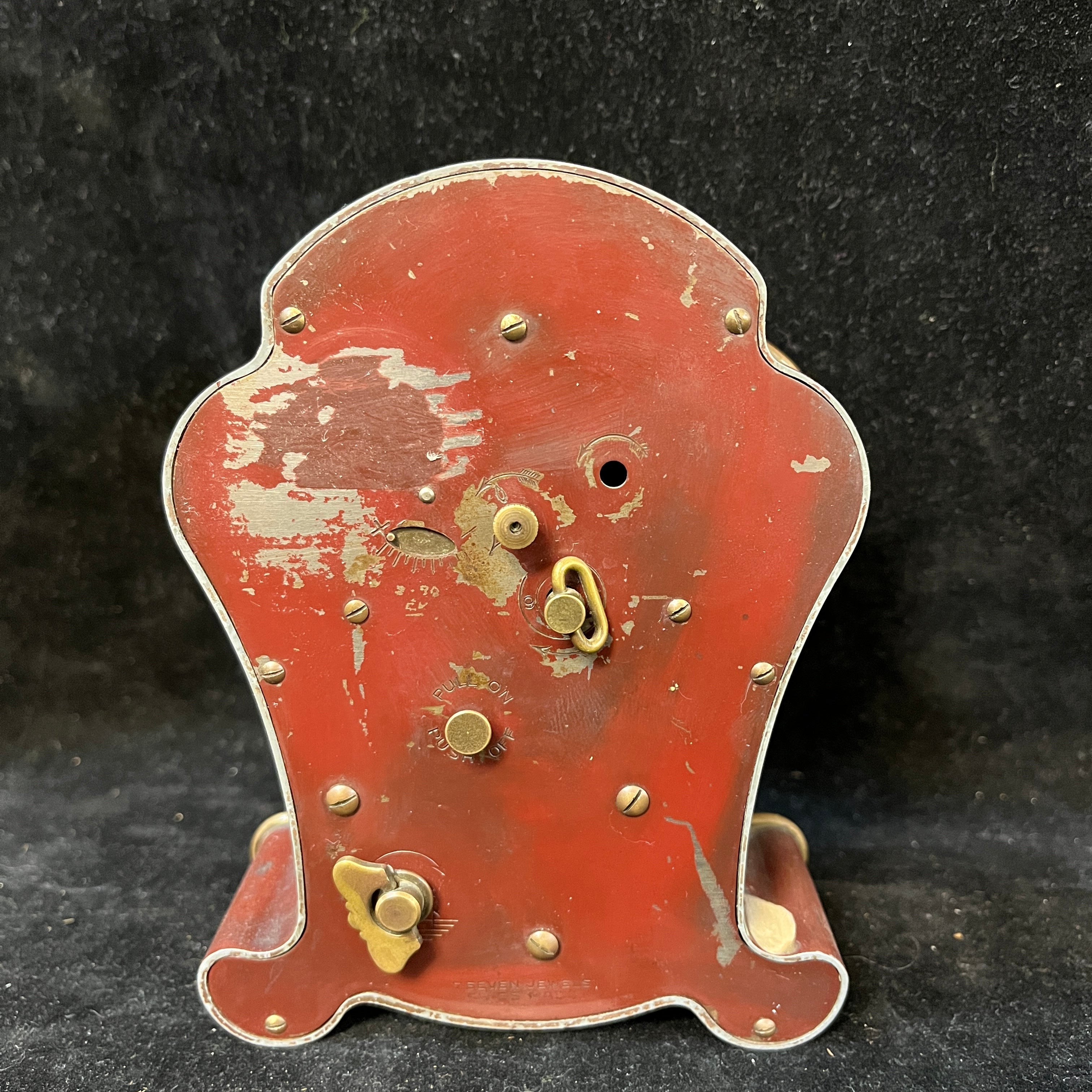 Tradicional reloj de repisa de mediados del siglo XX, metal blanco lacado, con hermosa melodía, funcionando . Con desgaste superficial producto del paso del tiempo (decoloración)