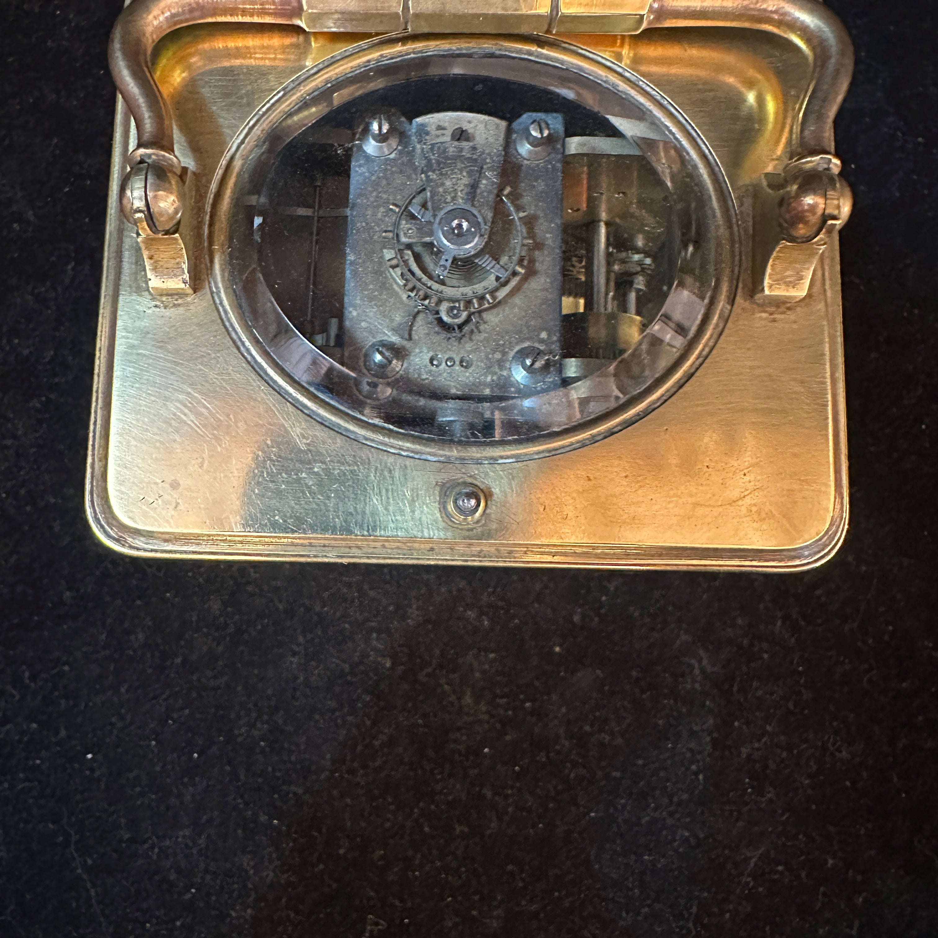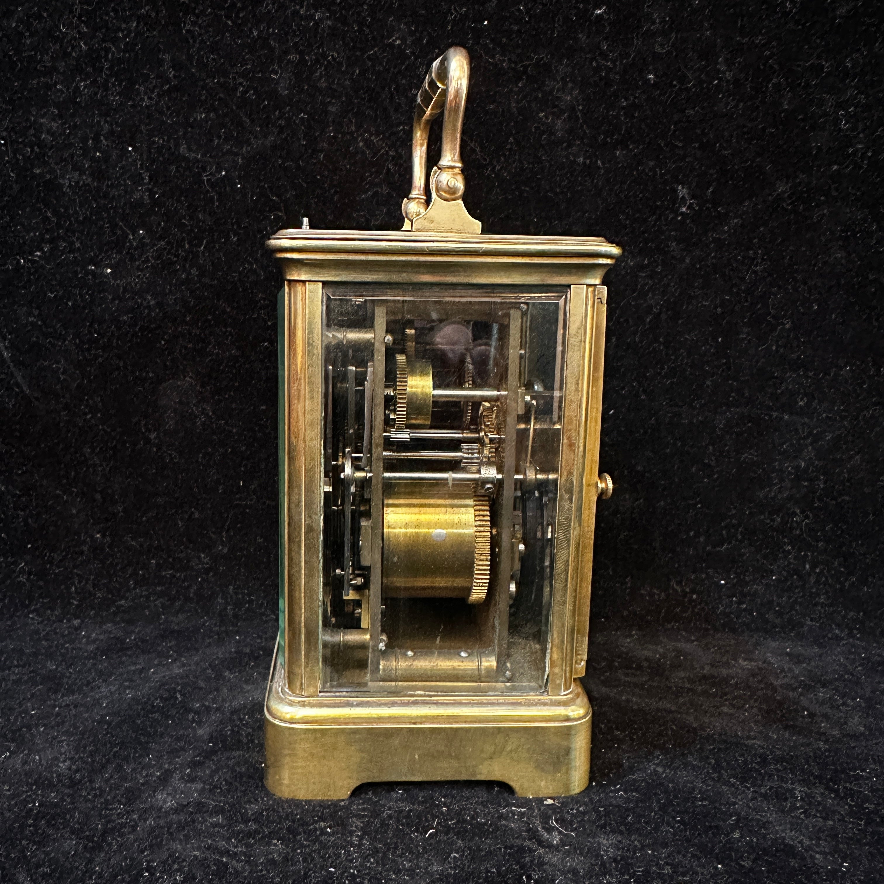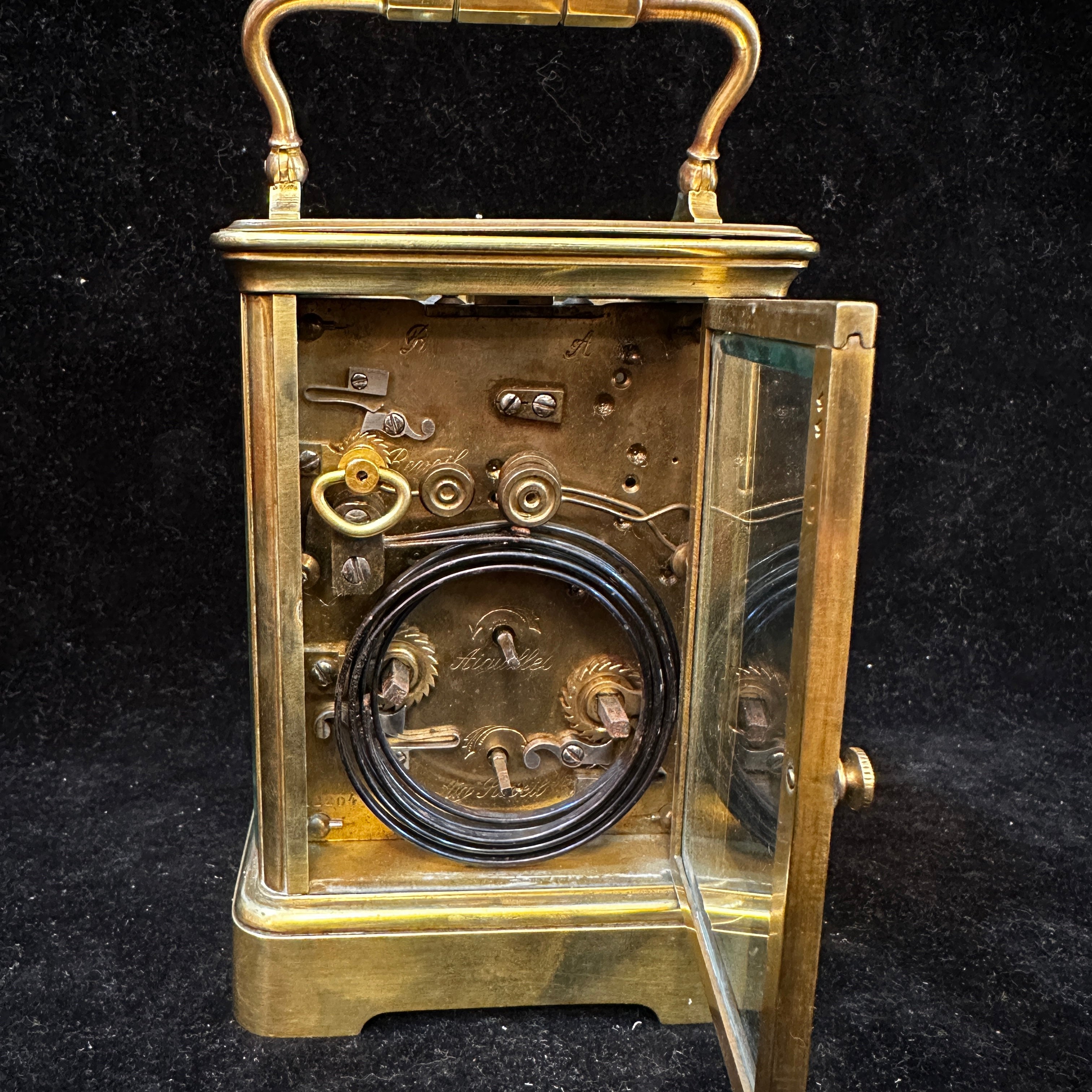 Reloj de viaje de latón con bronce y vidrio con forma de vitrina y asa curvada firmado 'Aiguilles' en su interior. Su interior es visible, lo que permite poder apreciar todo su funcionamiento. Se presume que es de 1890 -1920.