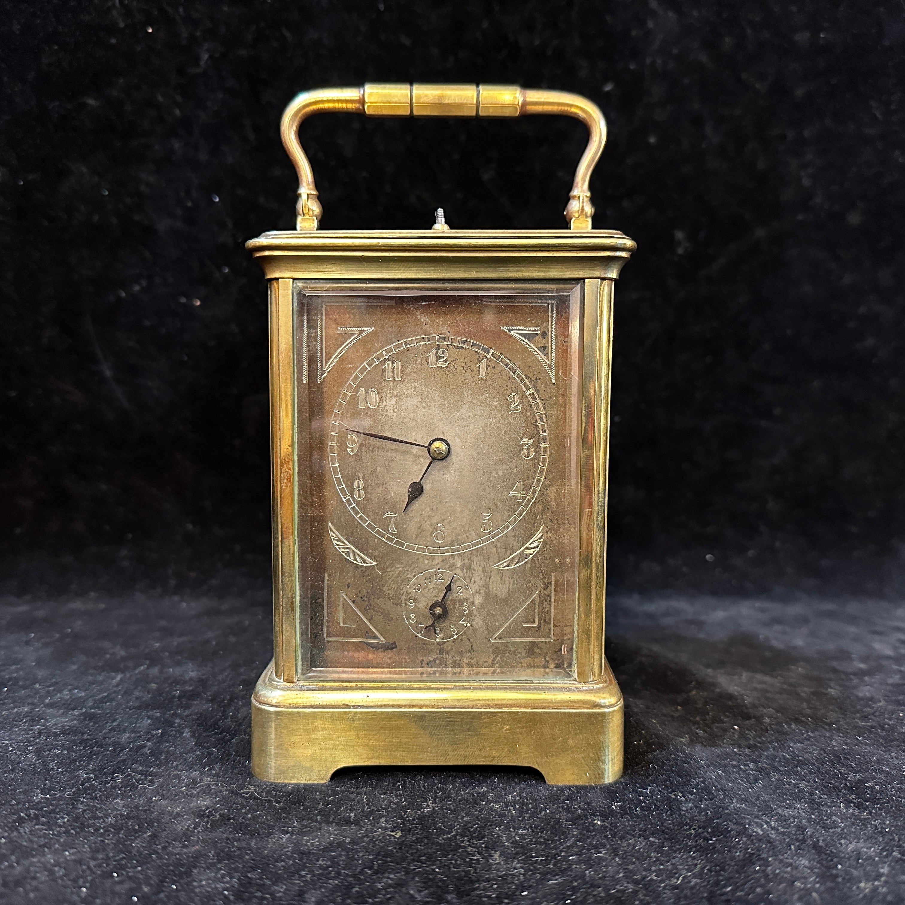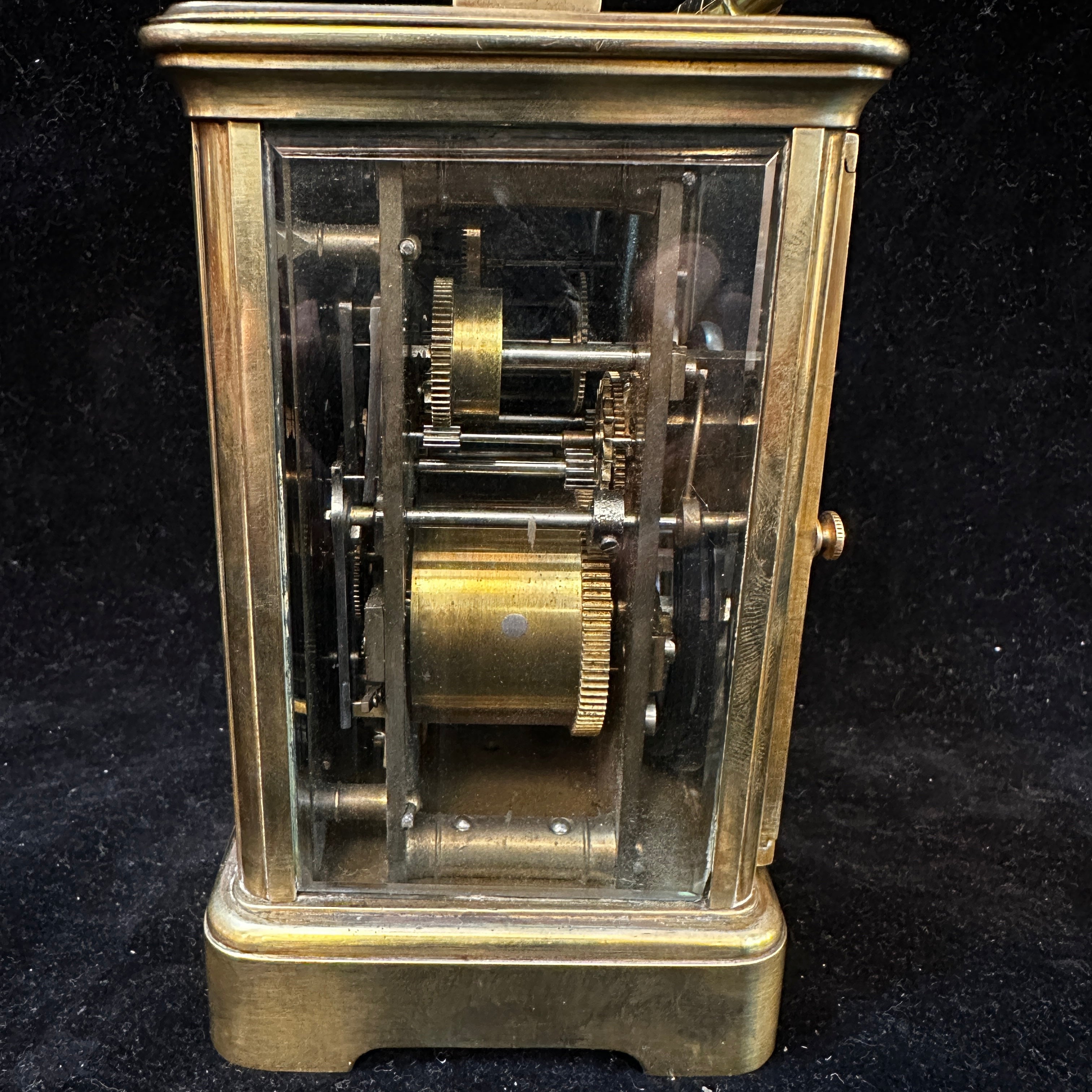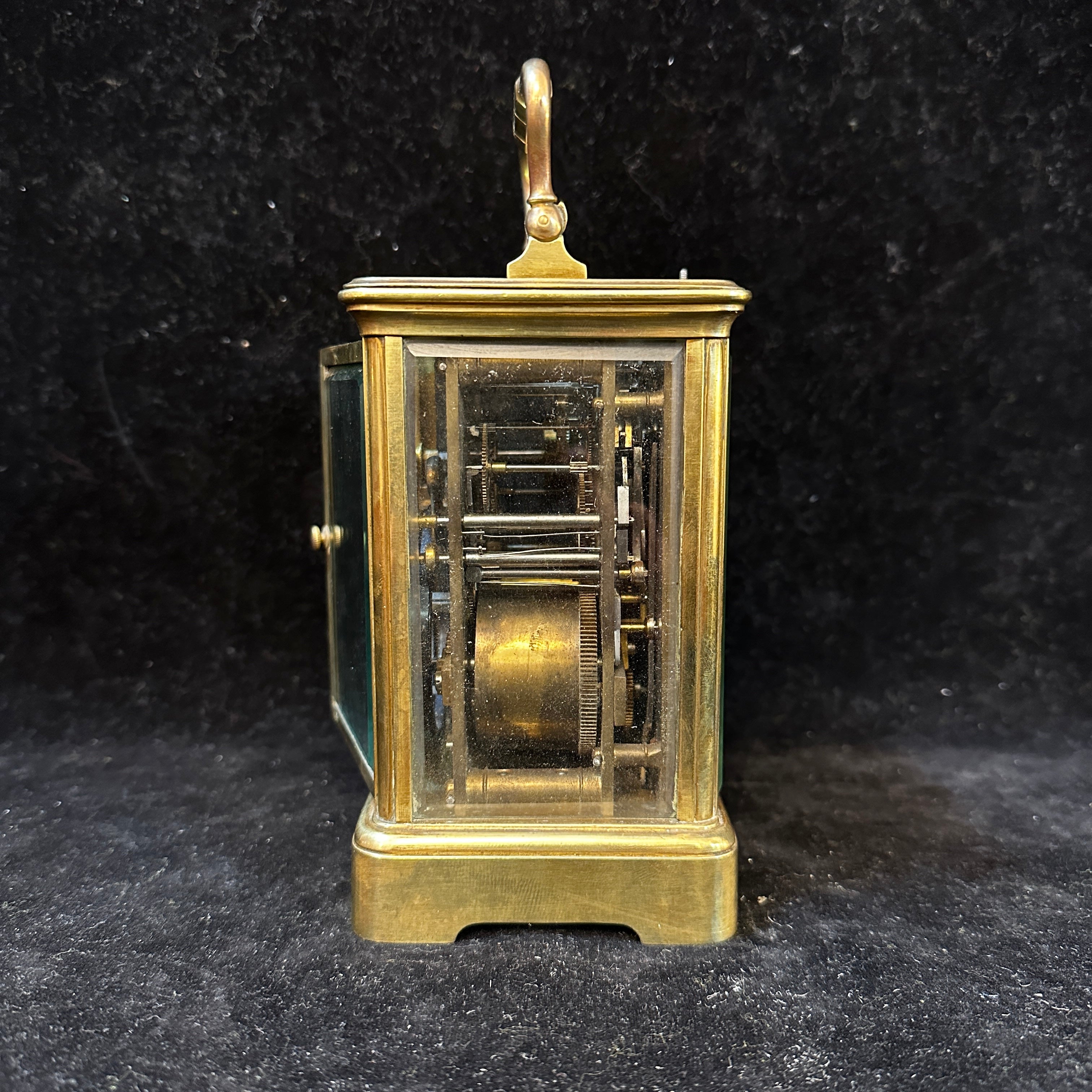 Reloj de viaje de latón con bronce y vidrio con forma de vitrina y asa curvada firmado 'Aiguilles' en su interior. Su interior es visible, lo que permite poder apreciar todo su funcionamiento. Se presume que es de 1890 -1920.
