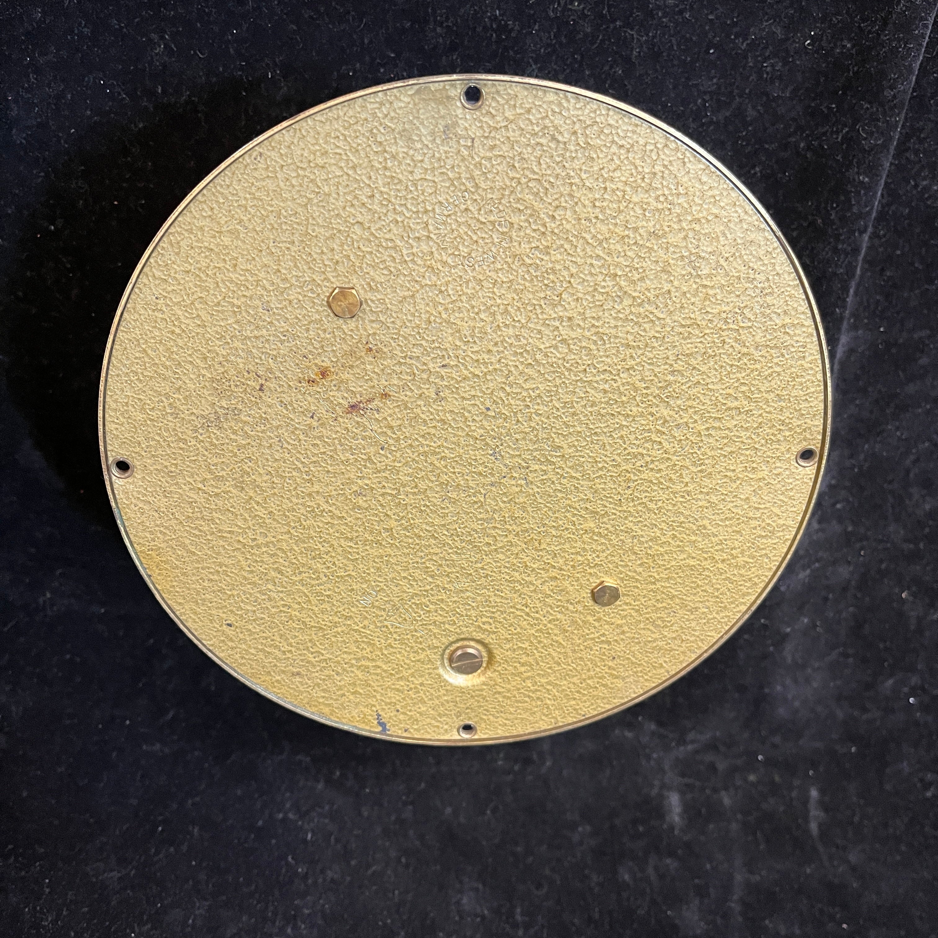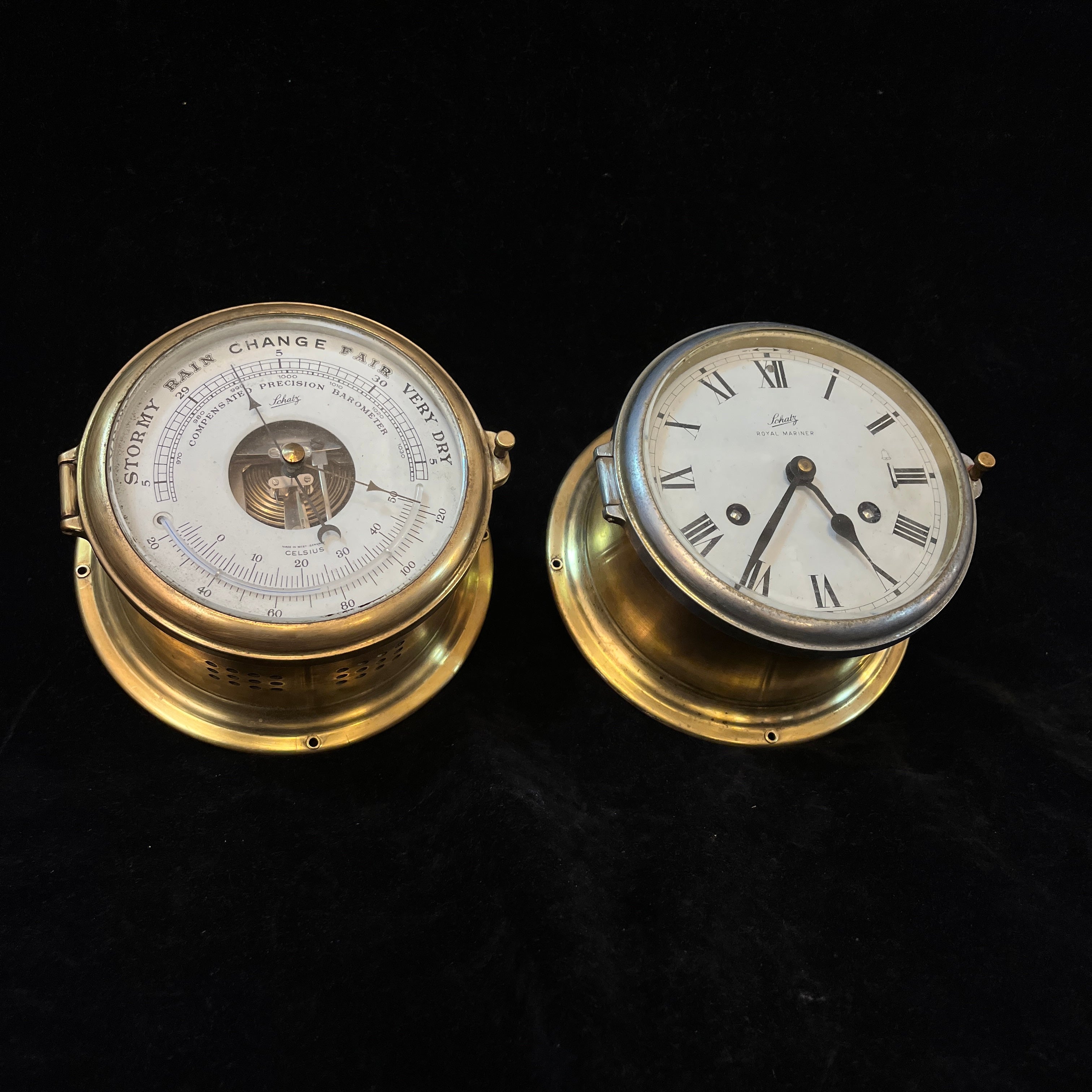 Juego de reloj y barómetro, de origen alemán, de la marca Schatz, hechos de latón pintado con terminación dorada.