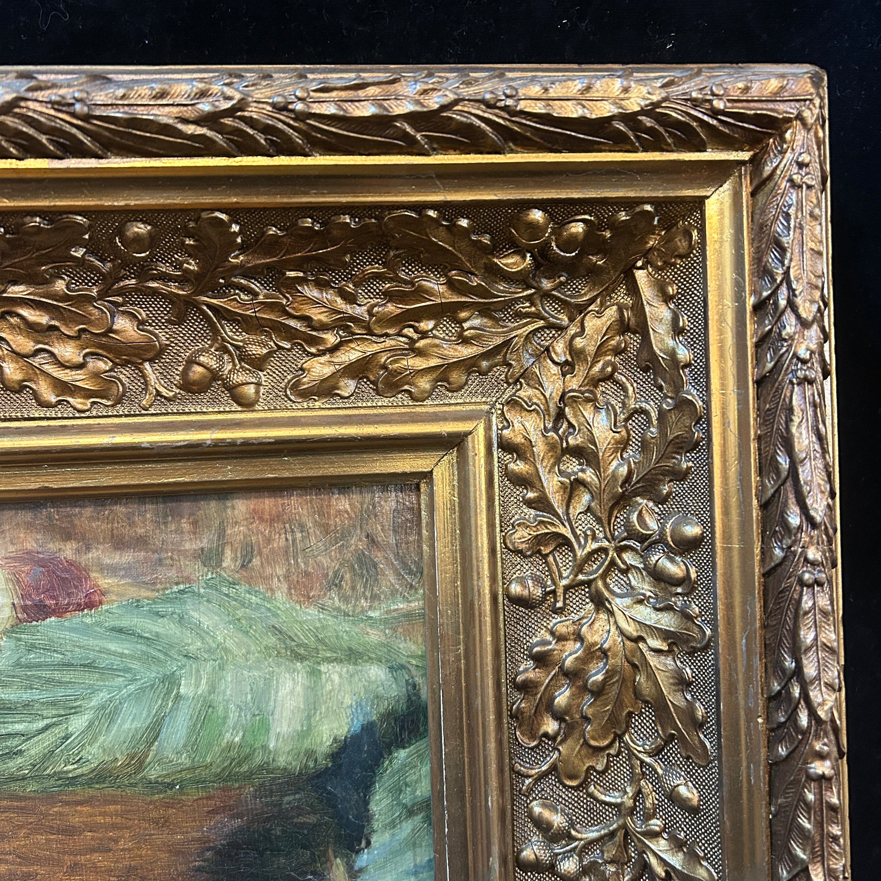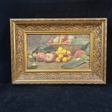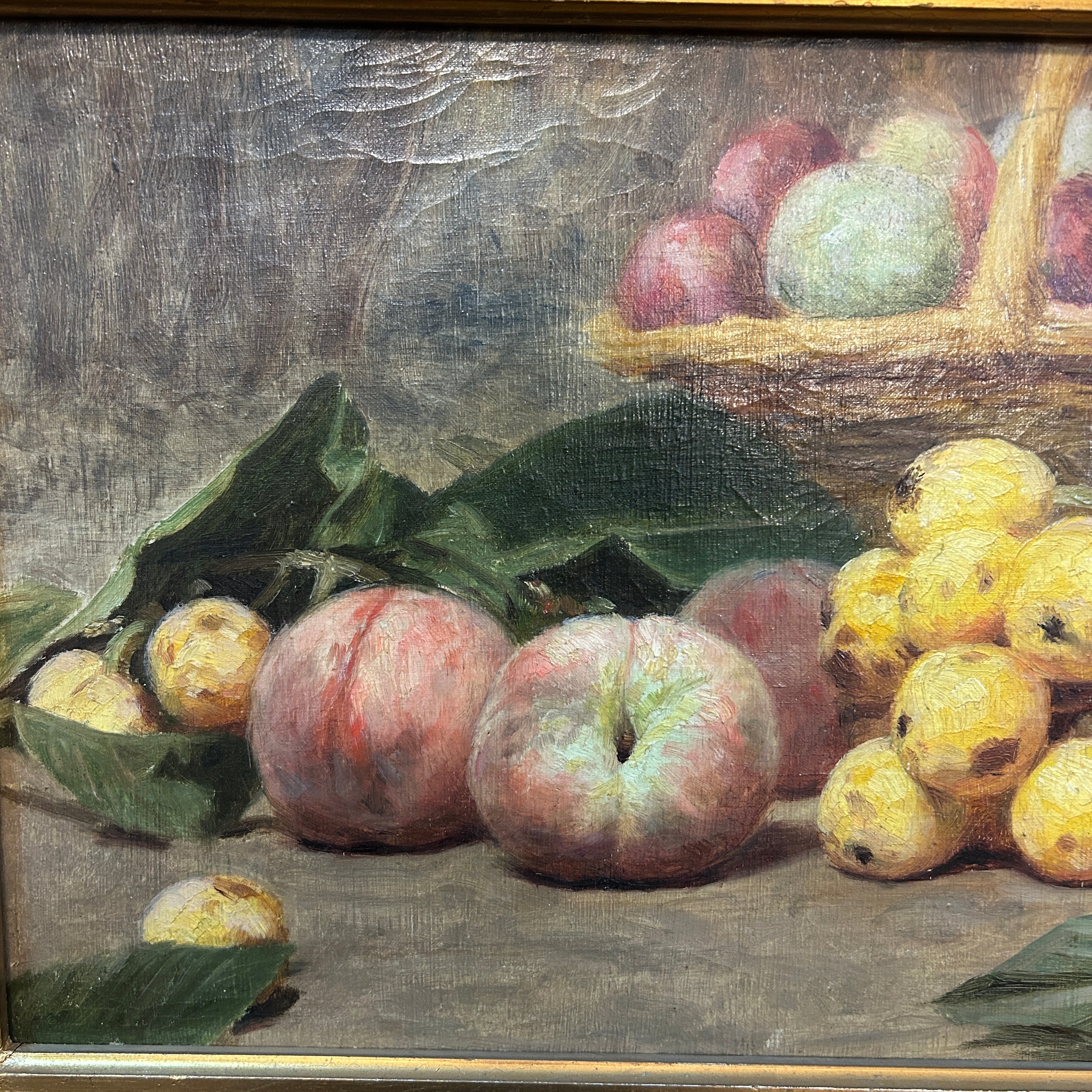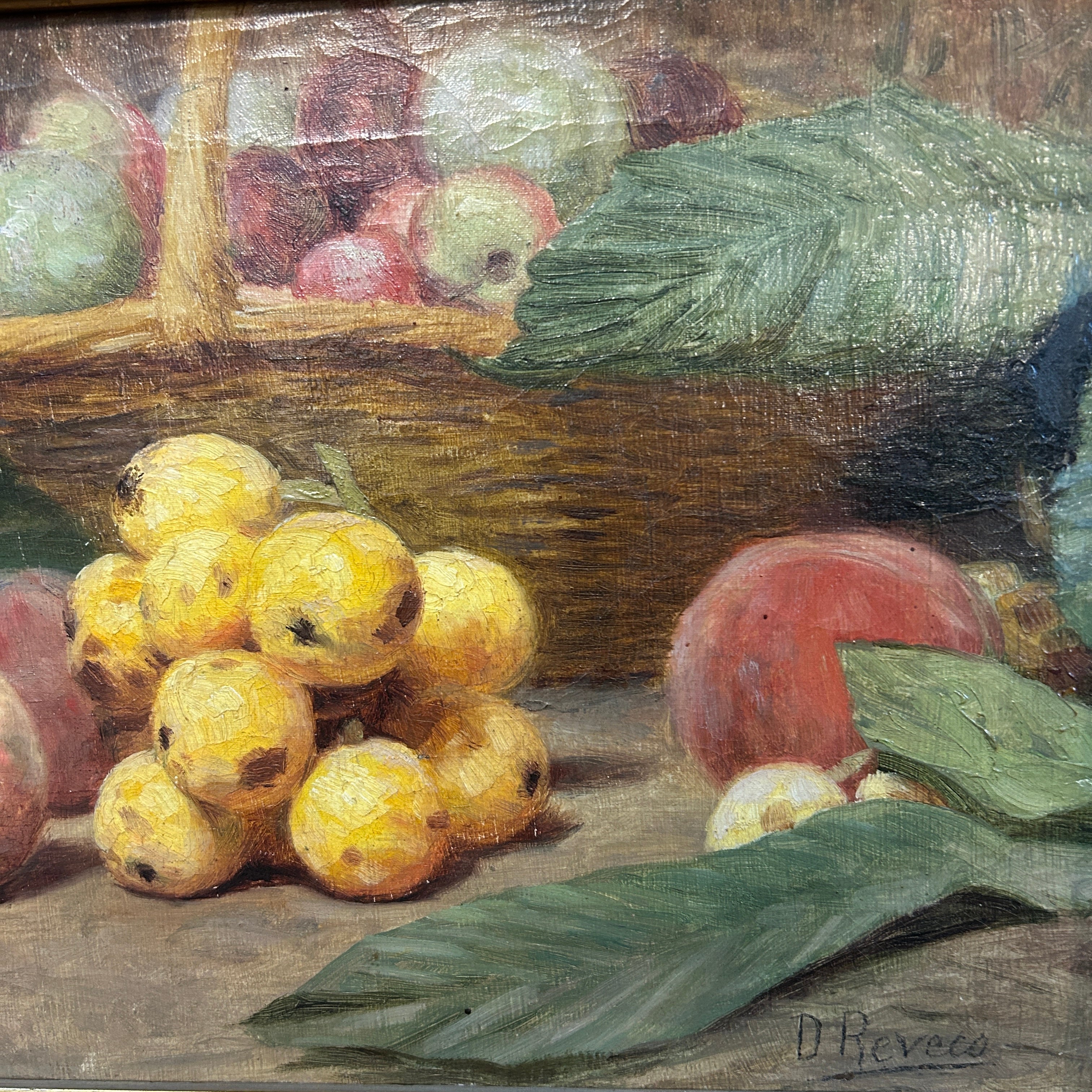 Óleo sobre tela del artista chileno Demetrio Reveco (1862-1920), representando un bodegón de duraznos sobre una mesa, con algunas hojas y nísperos. En el fondo se ve un canasto con más fruta. El cuadro está enmarcado en madera tallada en relieves y terminada de un elegante dorado.