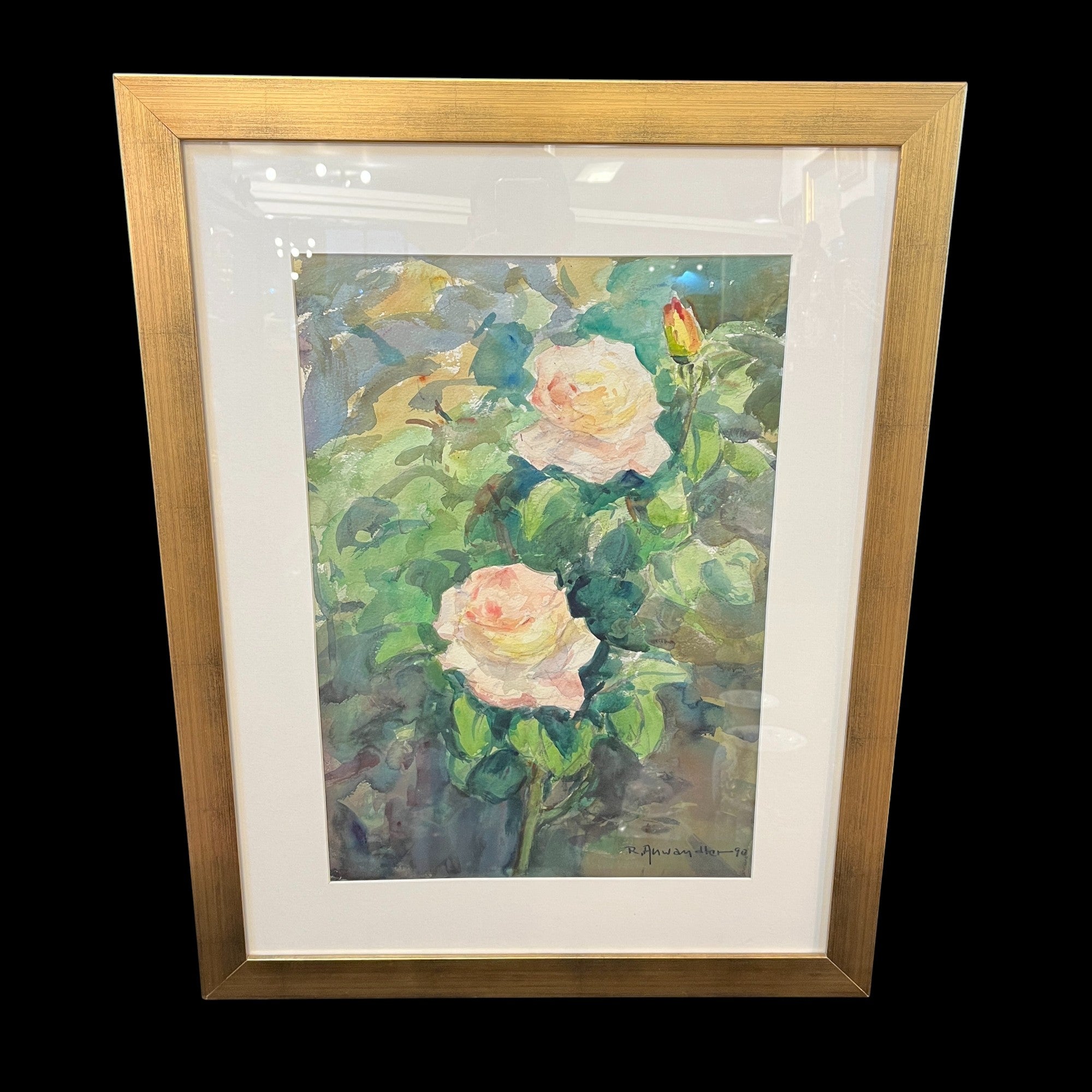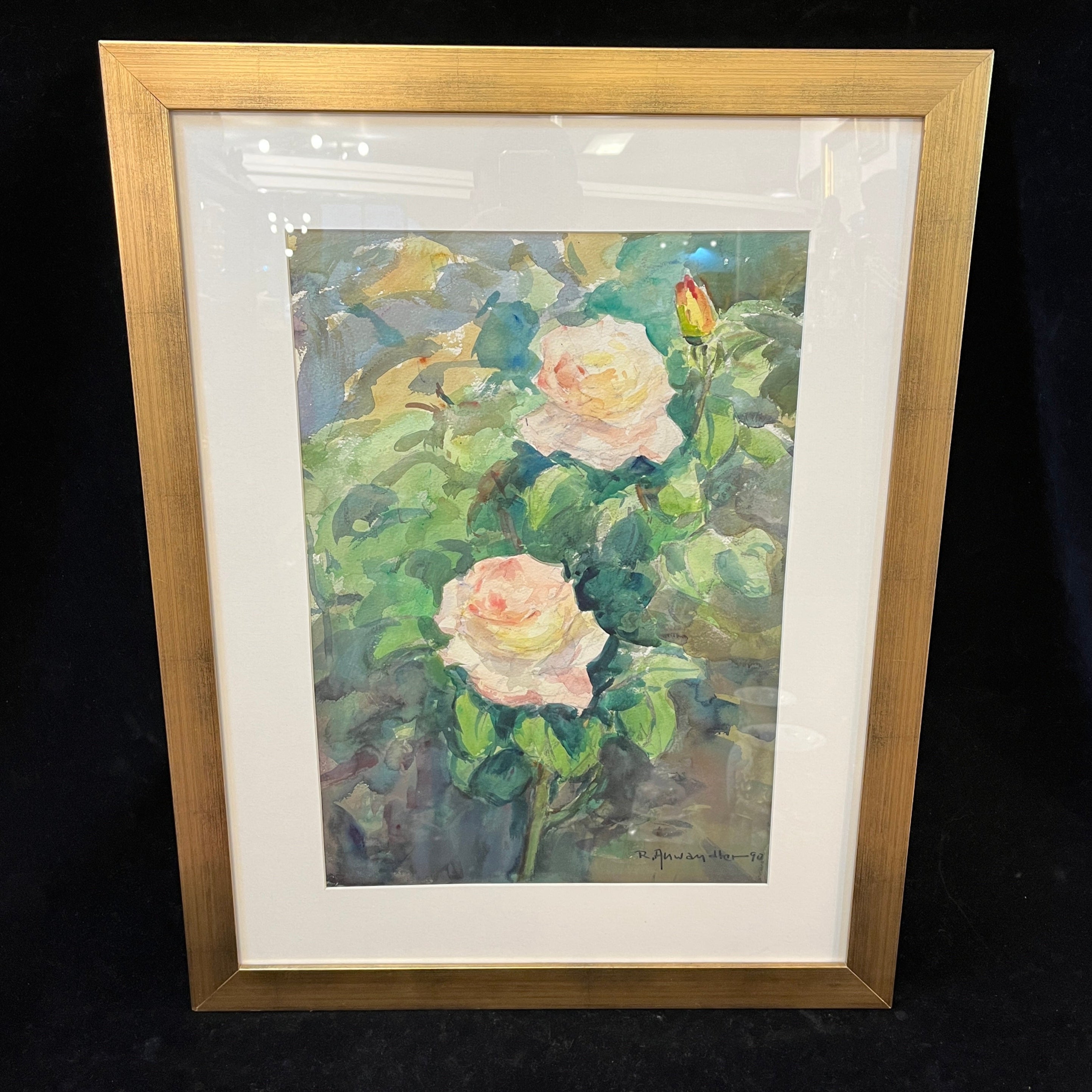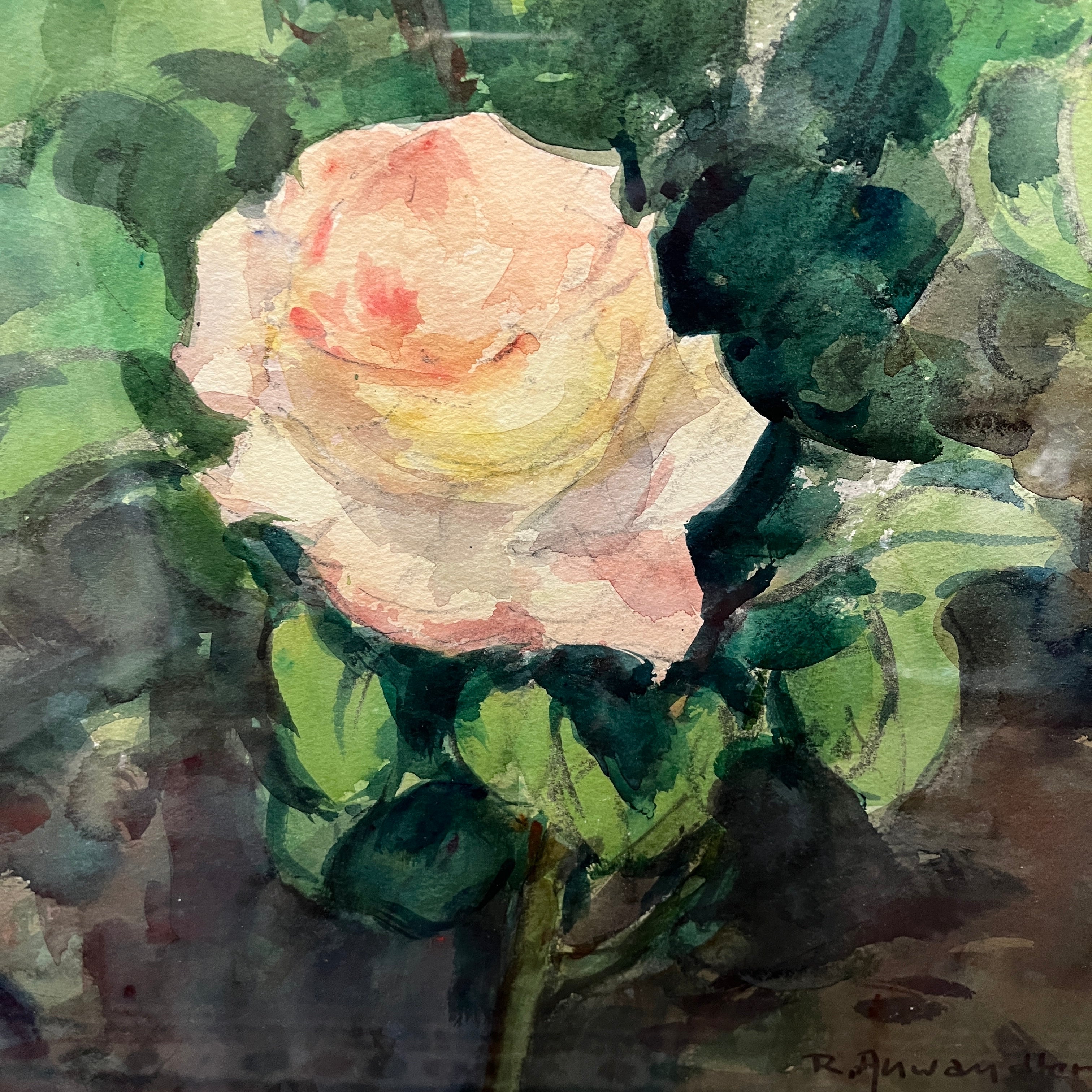 Aquarelle sur papier de l'artiste chilien Ricardo Andwanter, représentant un rosier en fleurs. L'œuvre est encadrée dans un bois doré et signée et datée par l'artiste.