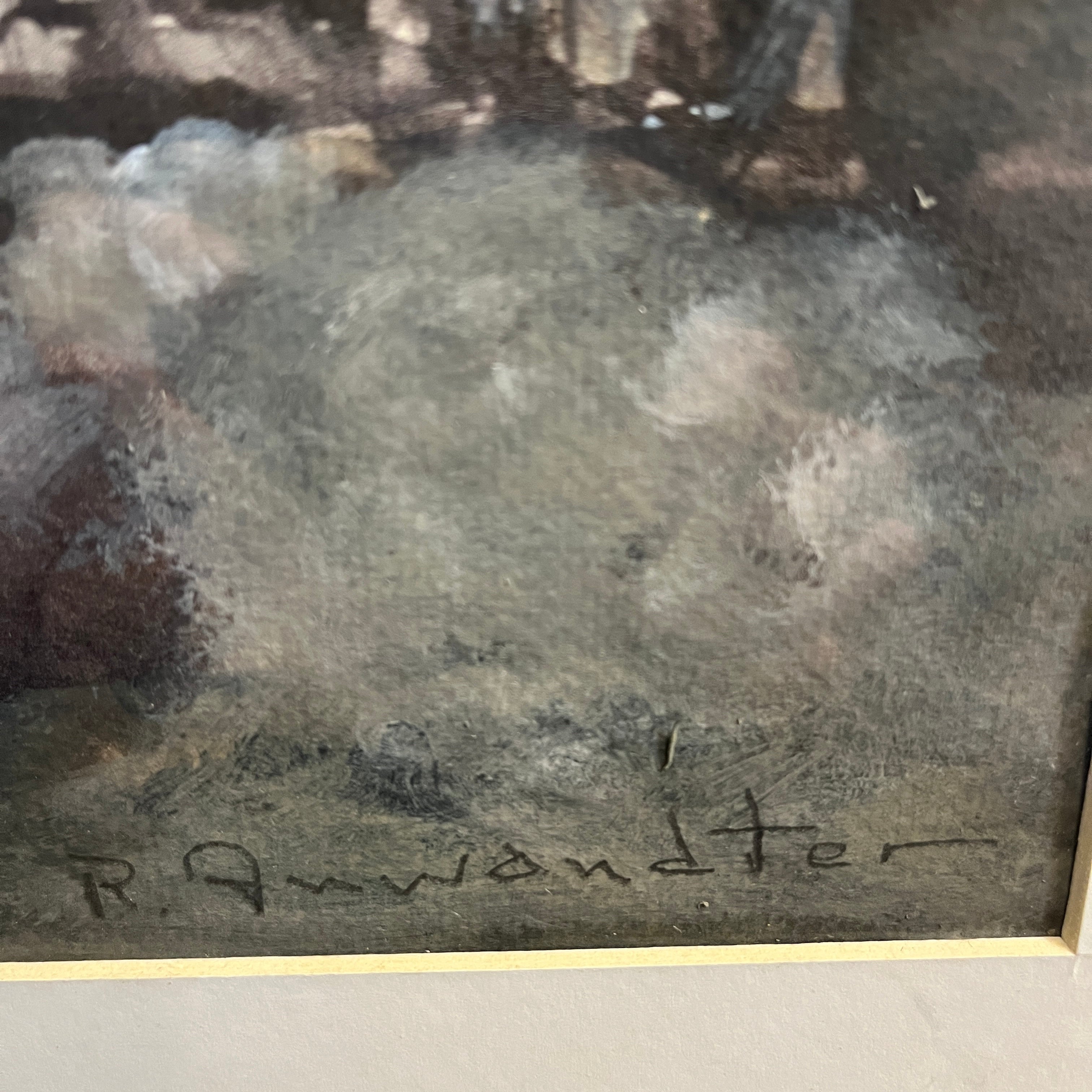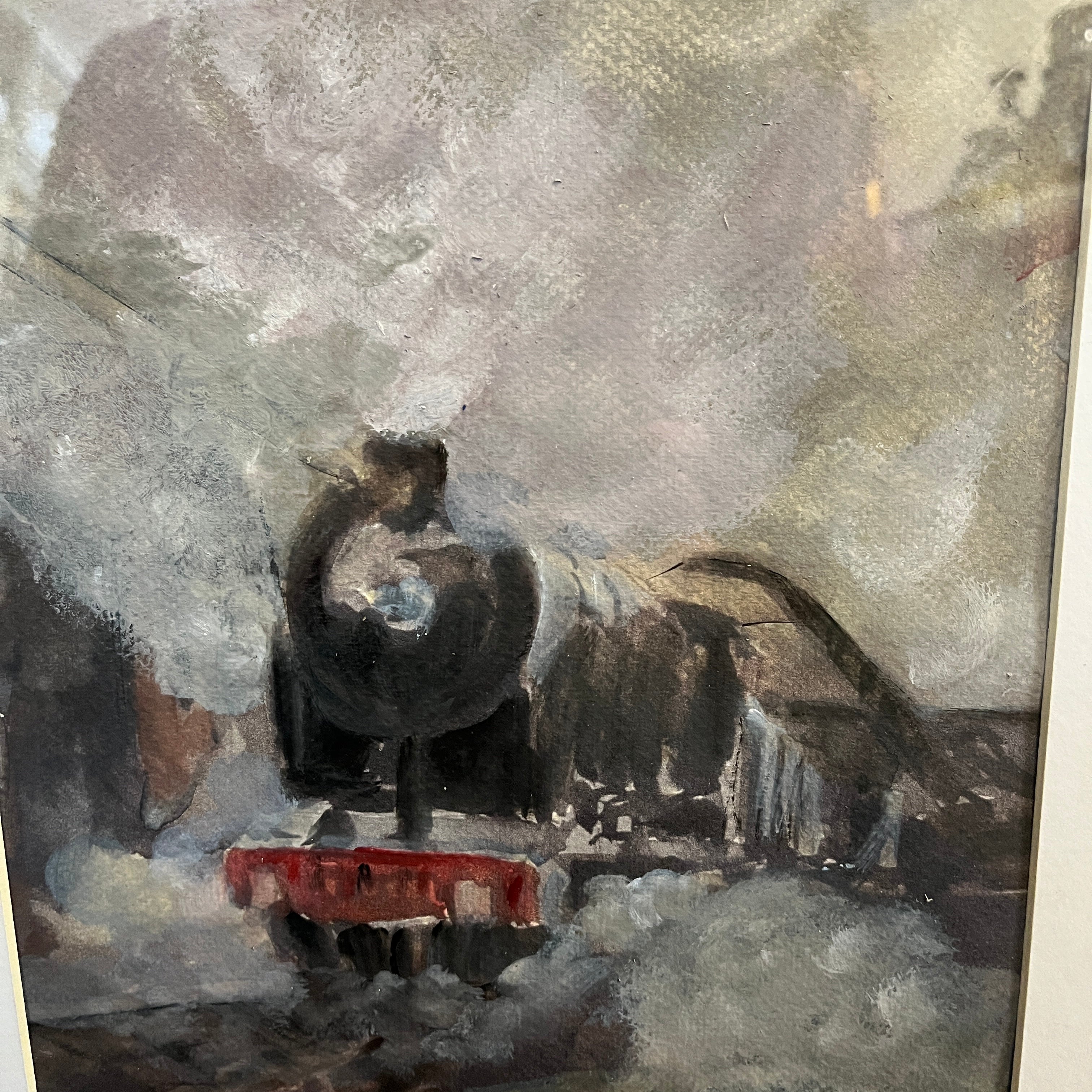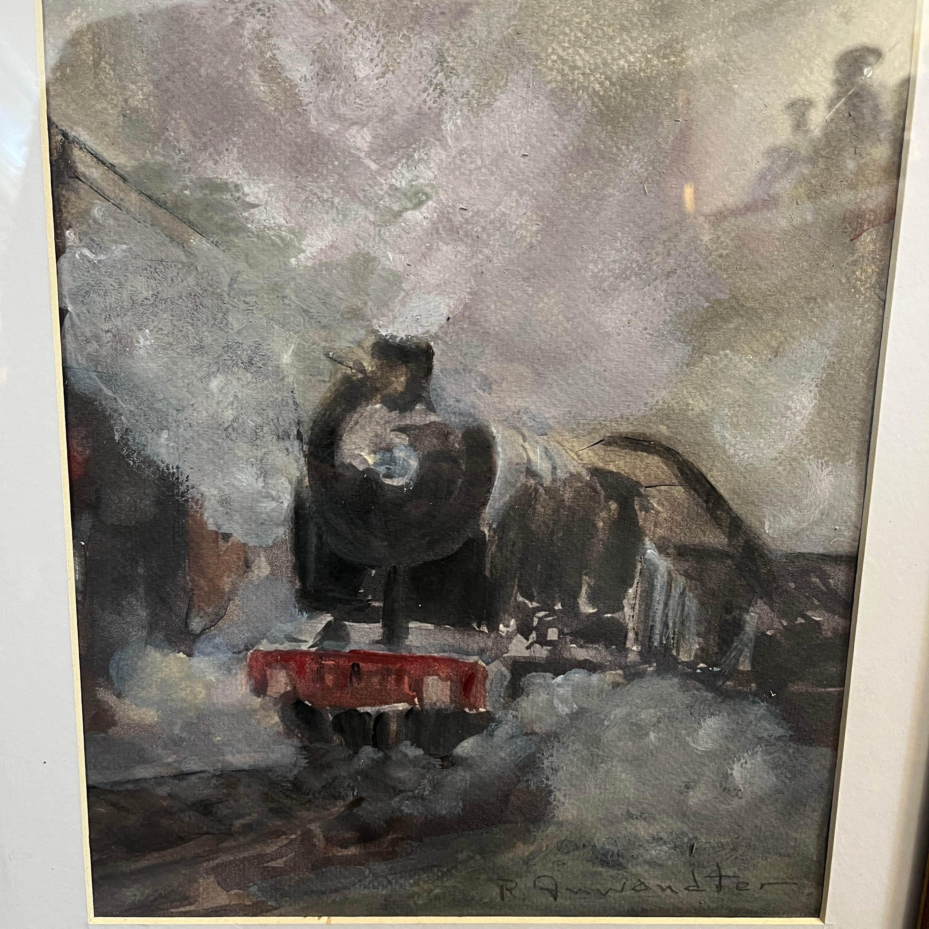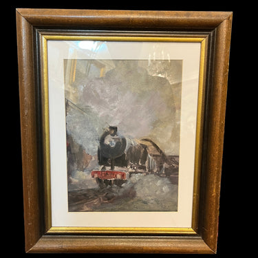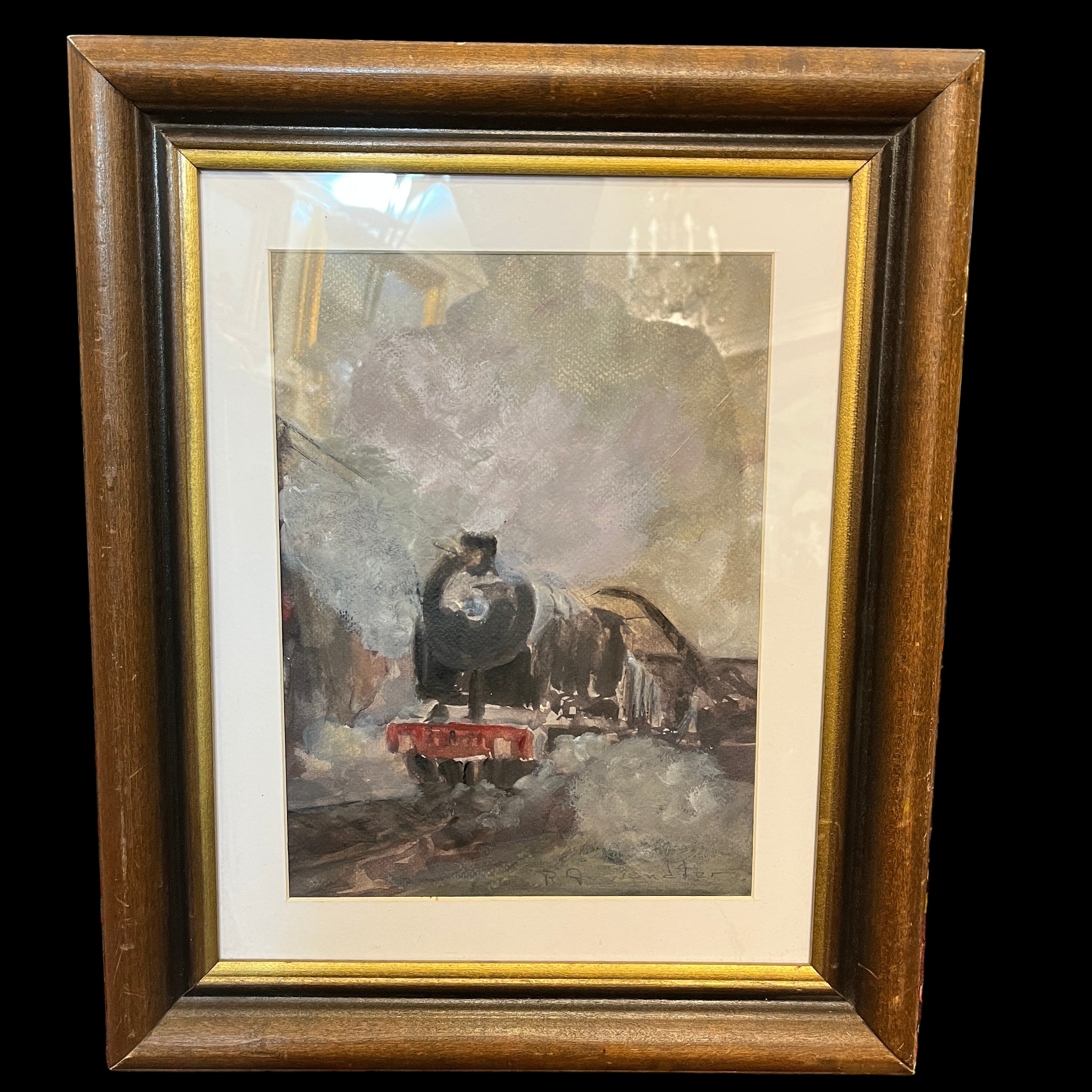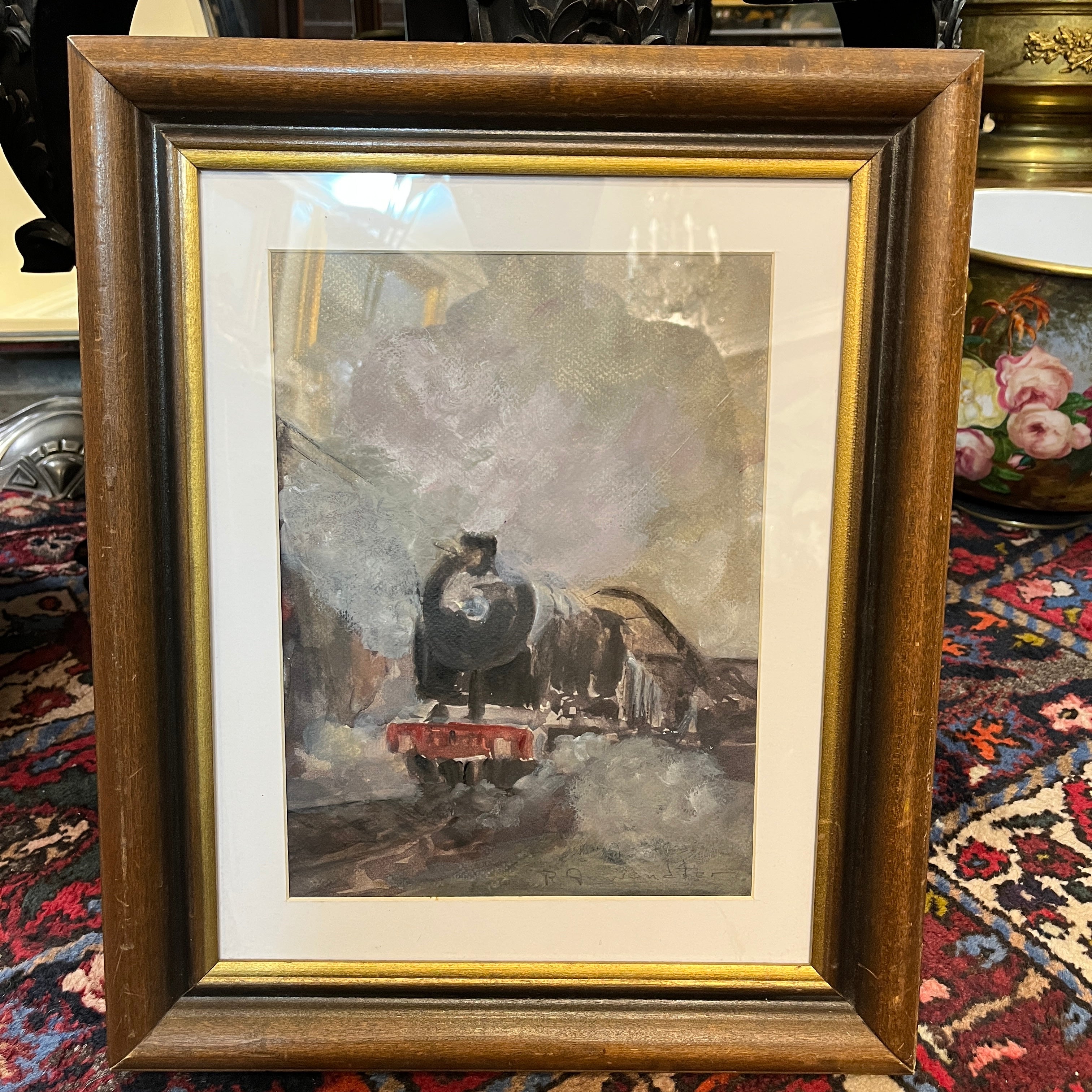 Acuarela de locomotora en movimiento, del talentoso pintor chileno Ricardo Anwandter. La obra está enmarcada en madera delgada y vidrio.
