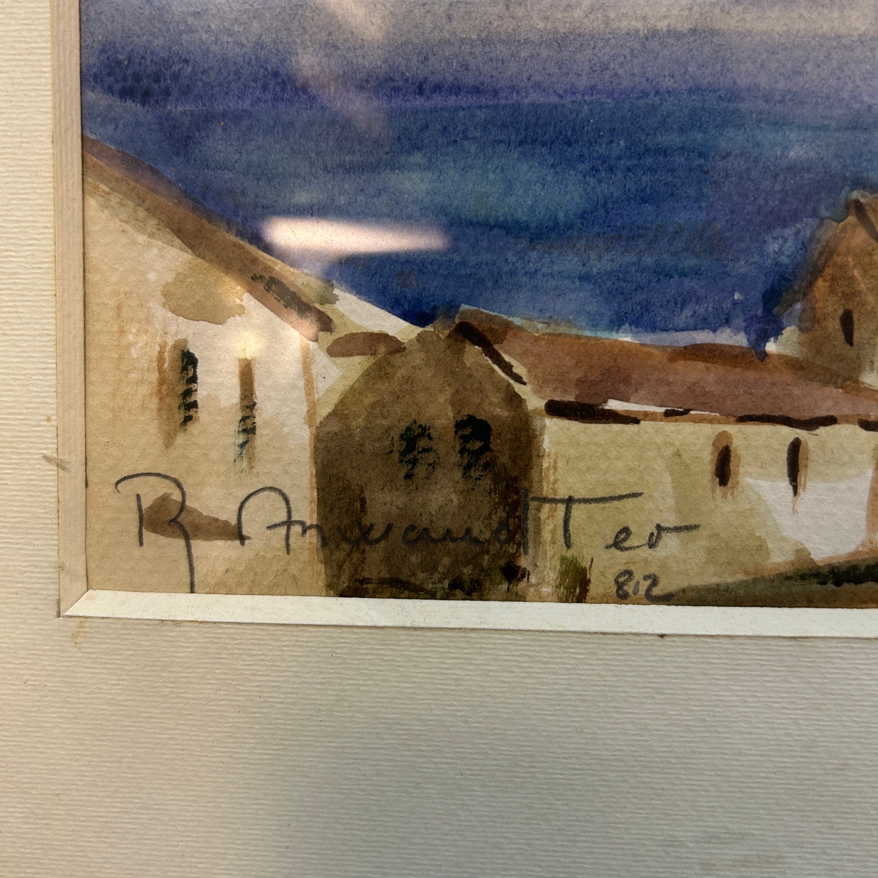El talentoso acuarelista Ricardo Anwandter nos presenta un paisaje colorido de lo que parece ser un cerro porteño con vista al puerto. La pintura nos lleva a una escena clásica de la belleza de los cerros de Valparaíso. Es esa belleza clásica que caracteriza los paisajes porteños. Podemos ver las casas a un costado del camino de una baja hacia el puerto y el azul intenso de un mar histórico que baña la falda de los cerros. La obra está firmada con fecha '82.