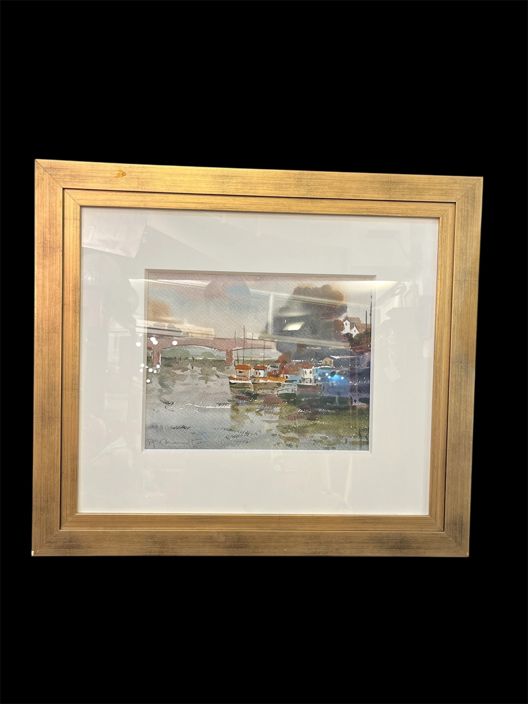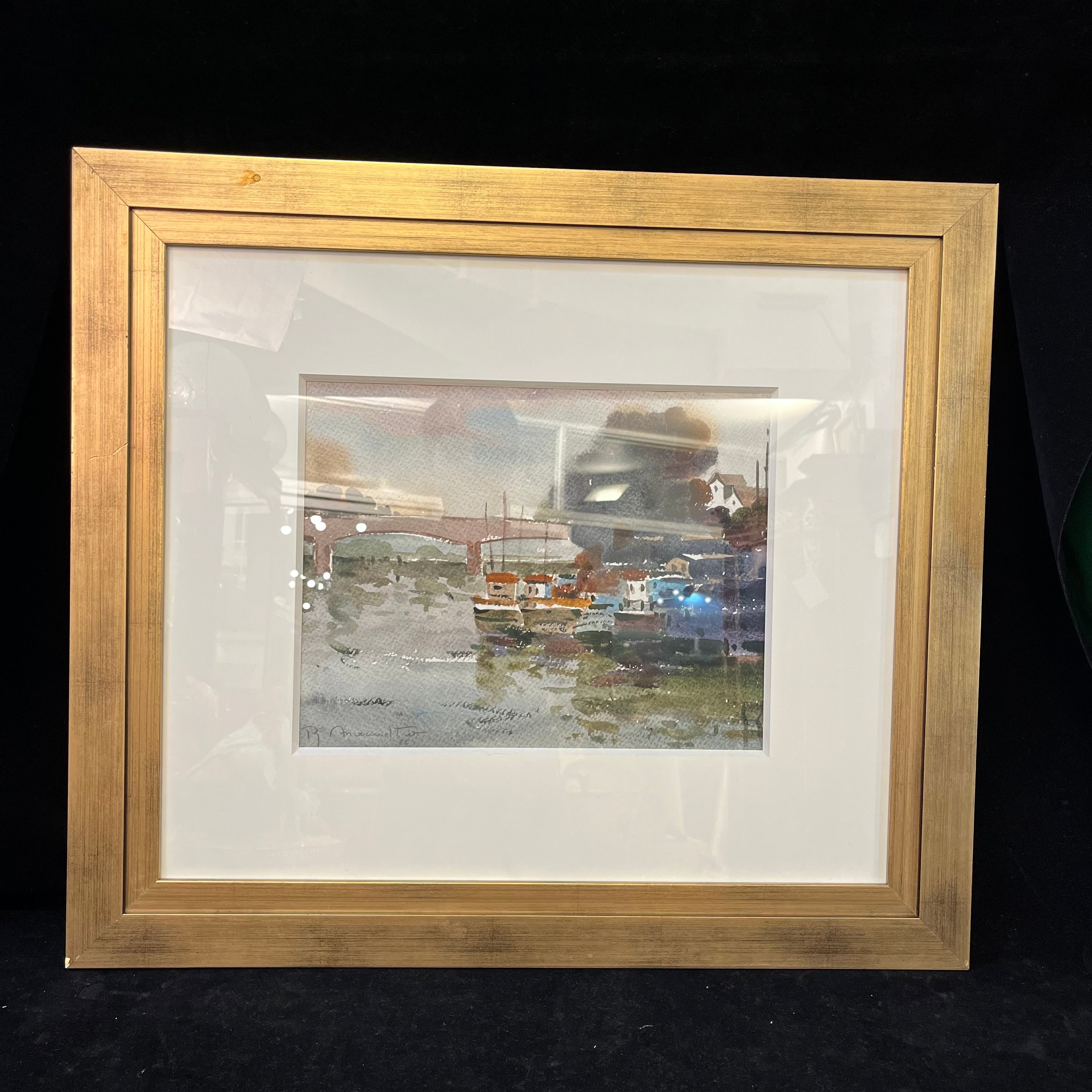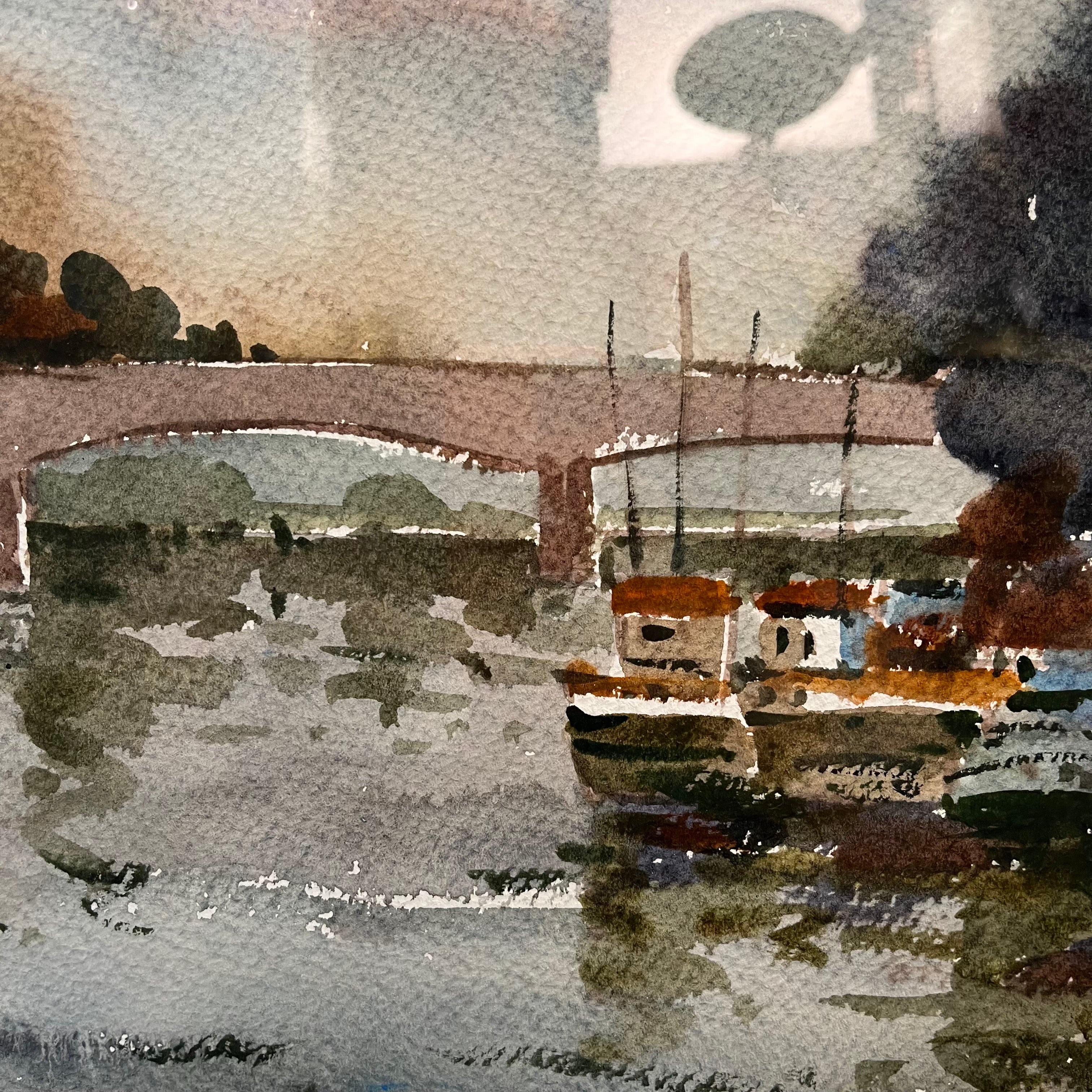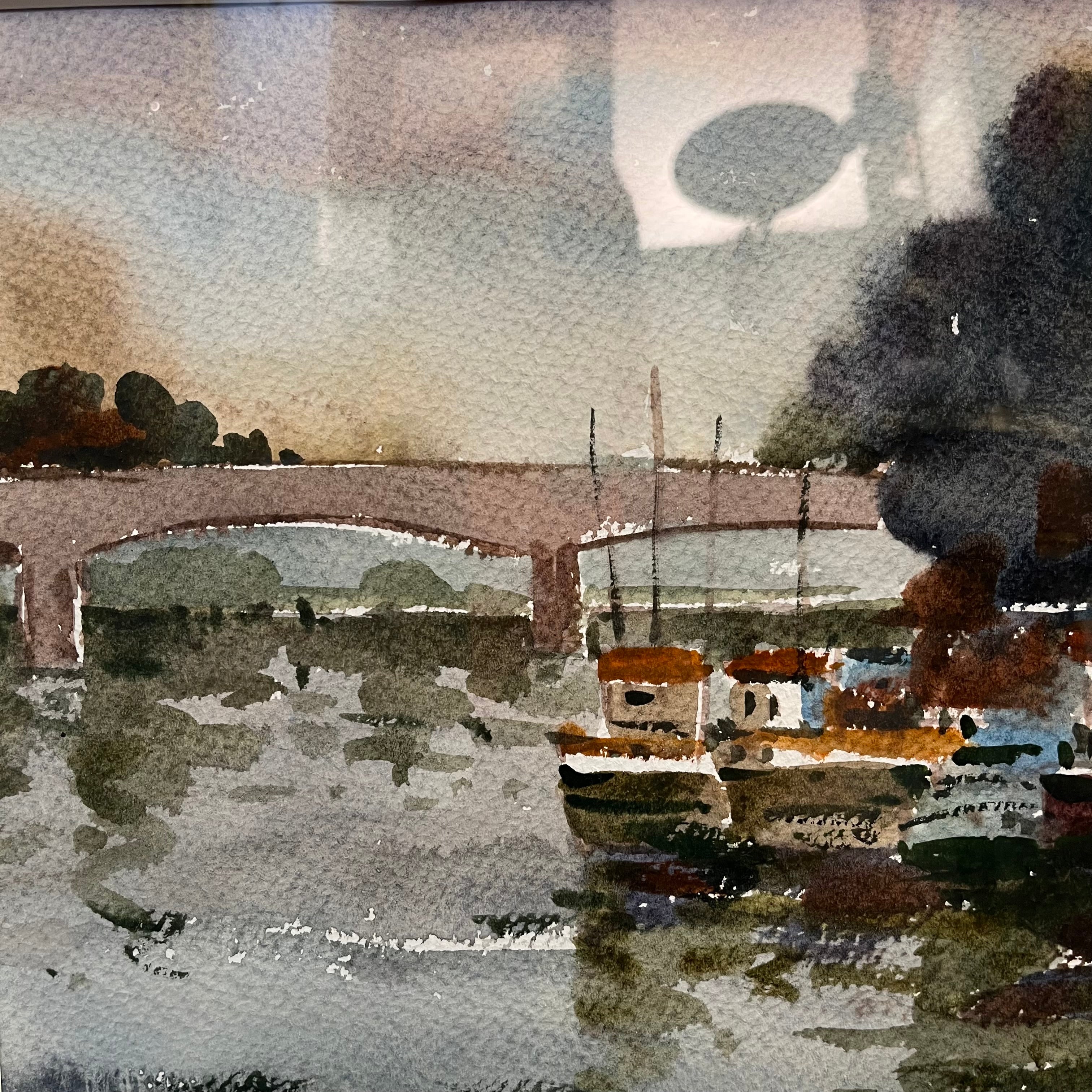 Hermosa acuarela del talentoso Ricardo Anwandter, que retrata lo que pareciera ser el puente Calle Calle de Valdivia. Magníficos tonos verdes, azules y grises más el reflejo de la luz en el agua entregan una atmósfera perfecta de lo que puede ser un día normal en el sur de Chile.