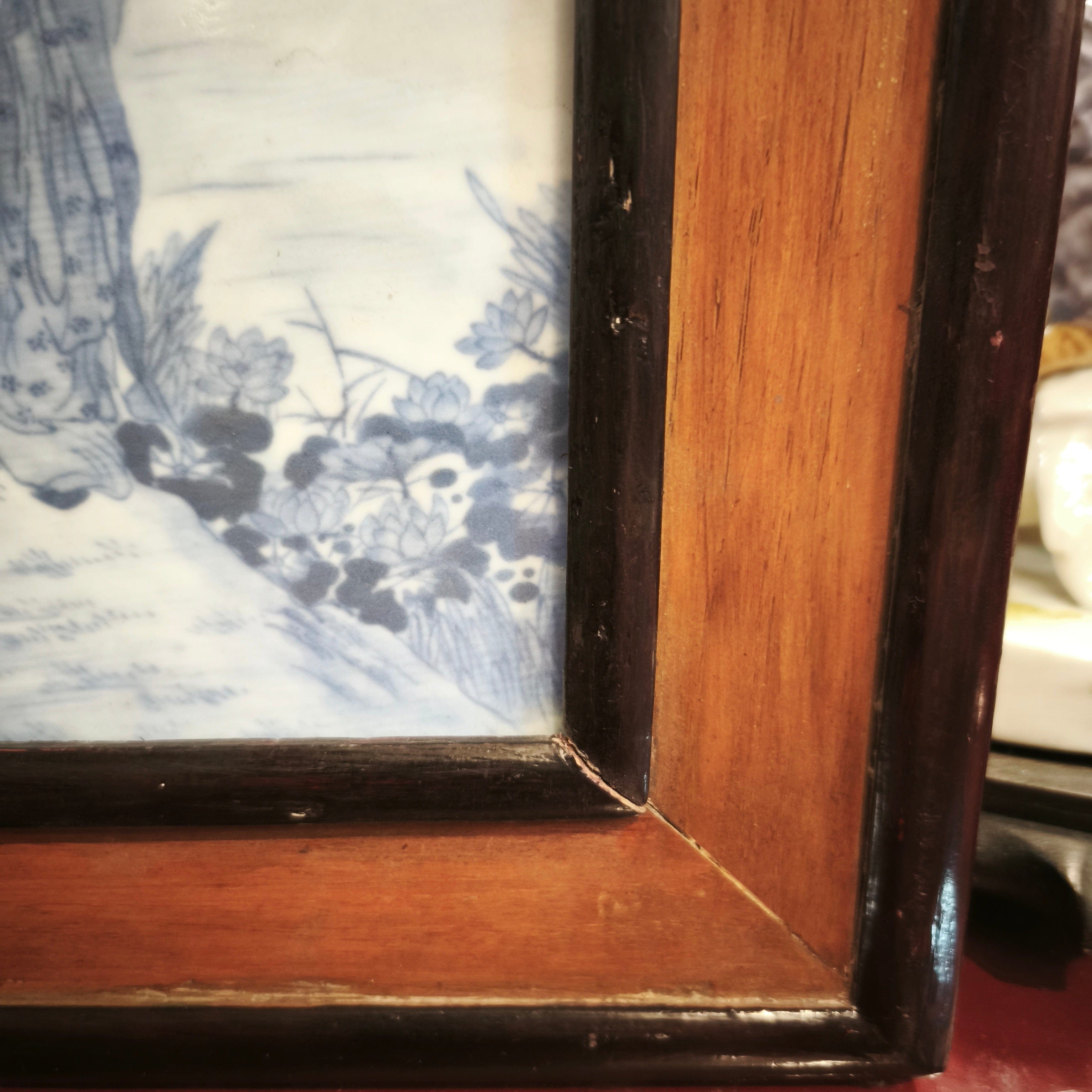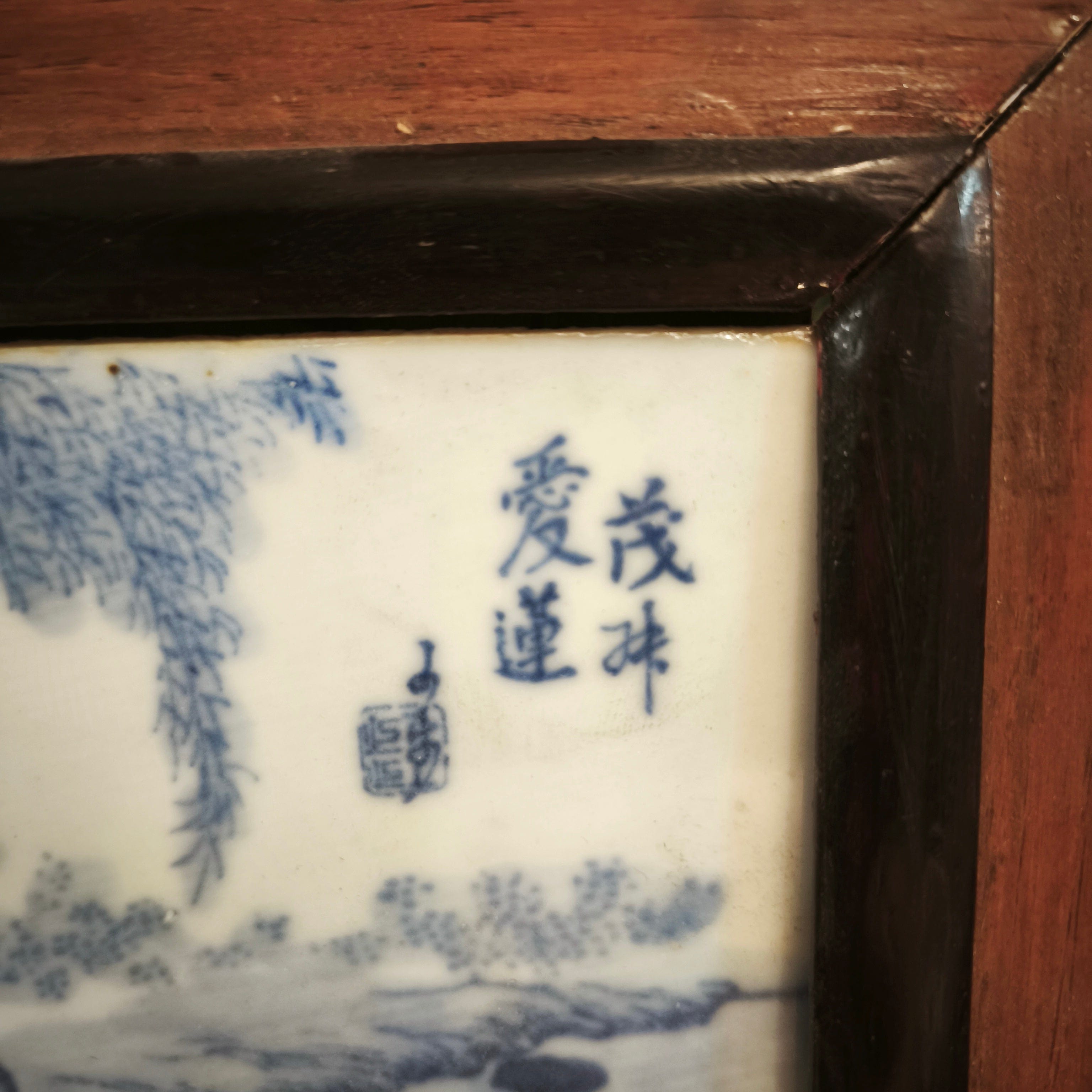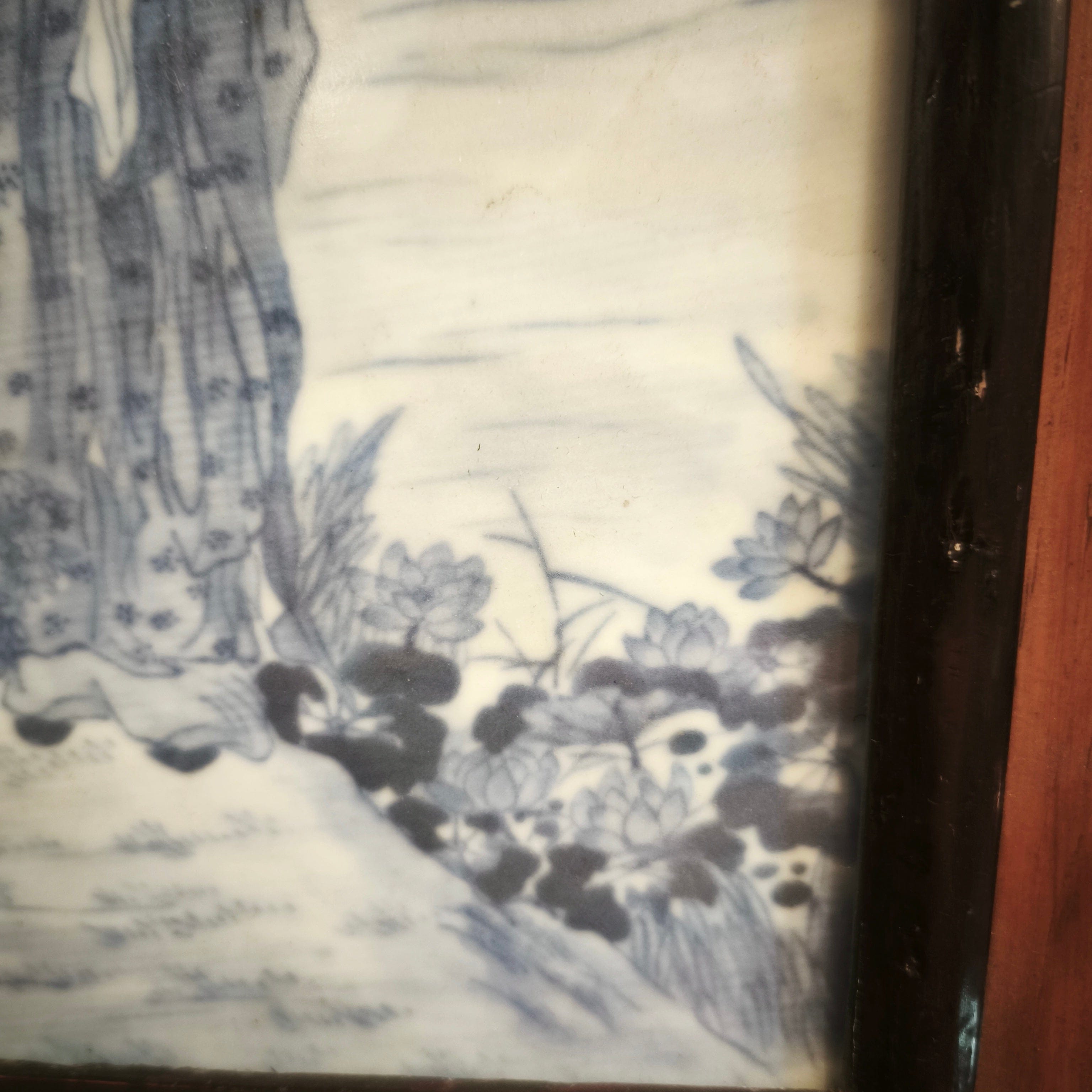 Peinture sur porcelaine chinoise encadrée représentant une scène de jardin