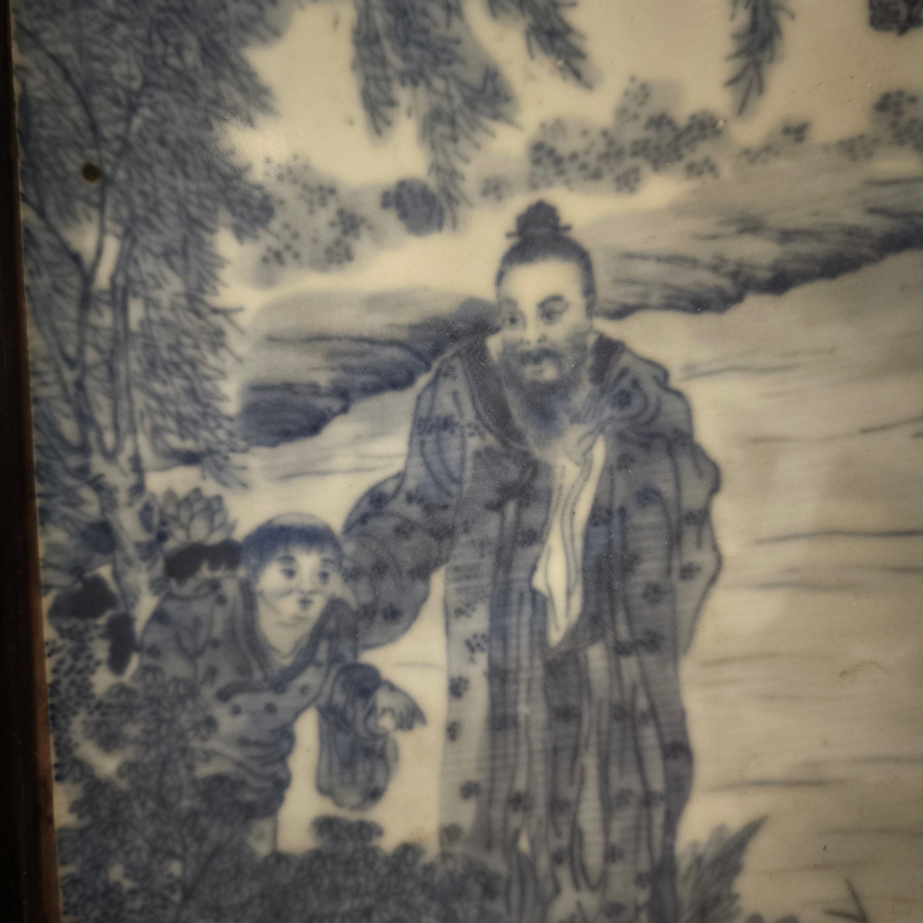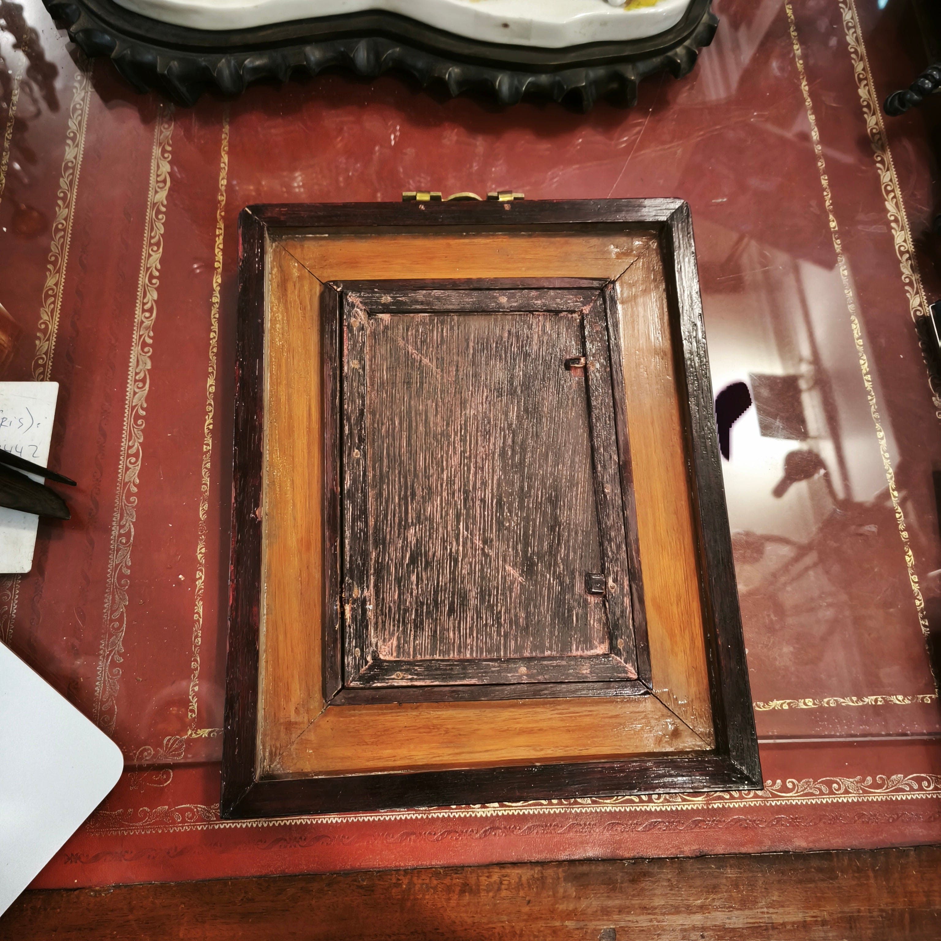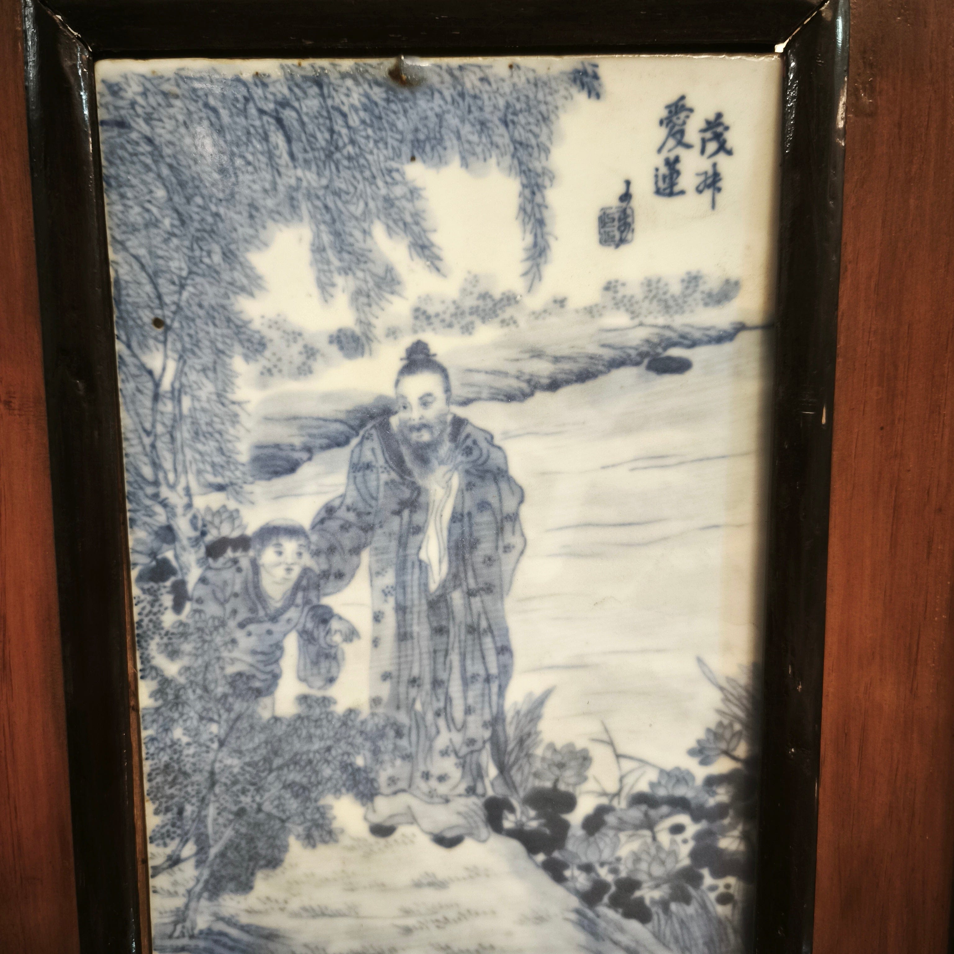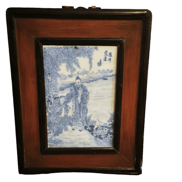 Magnifique panneau en porcelaine chinoise peint à la main, encadré de bois. Il représente une scène où un homme royal se promène dans un jardin accompagné d'un serviteur. Le cadre est orné d'un crochet en métal au motif asiatique traditionnel, peint en or élégant.