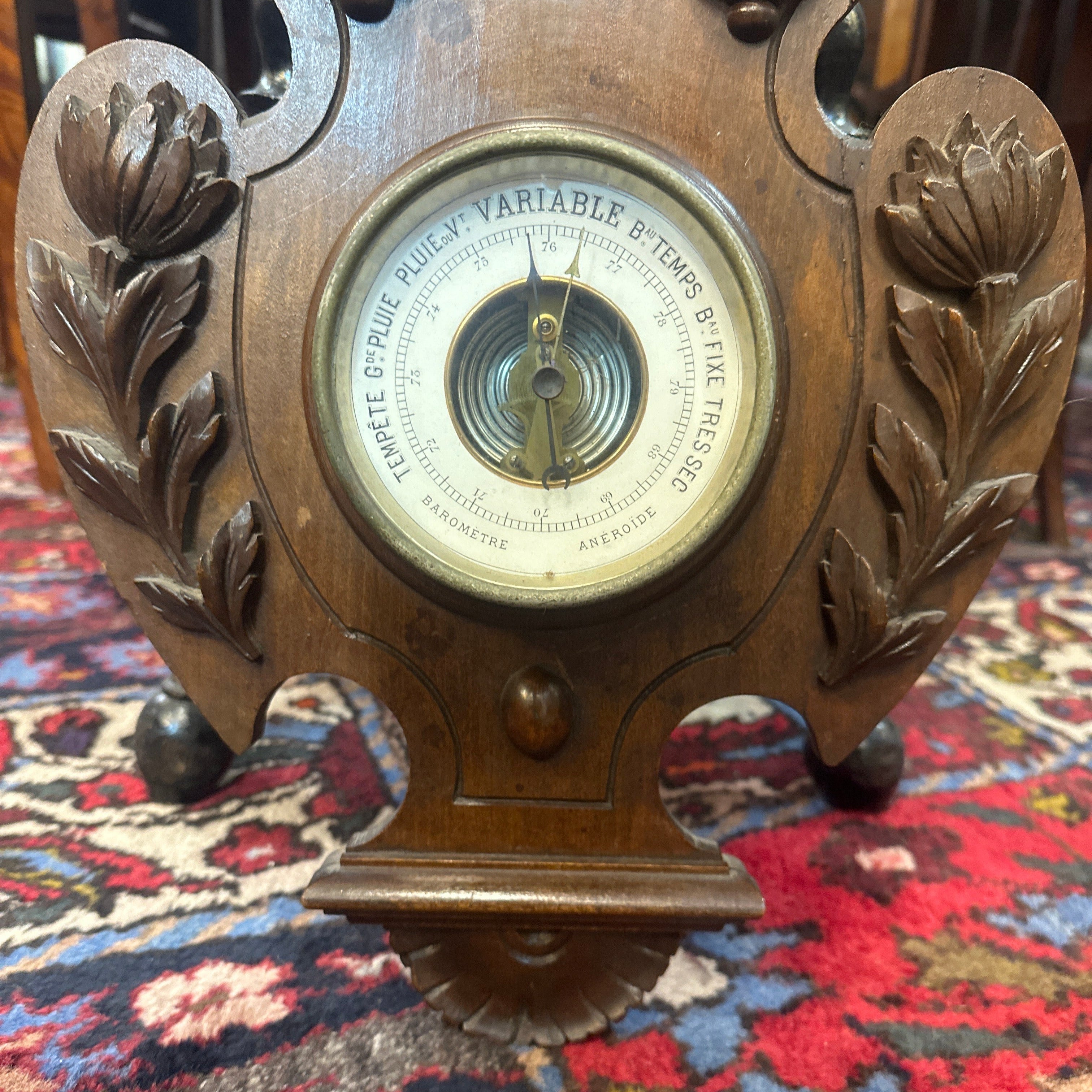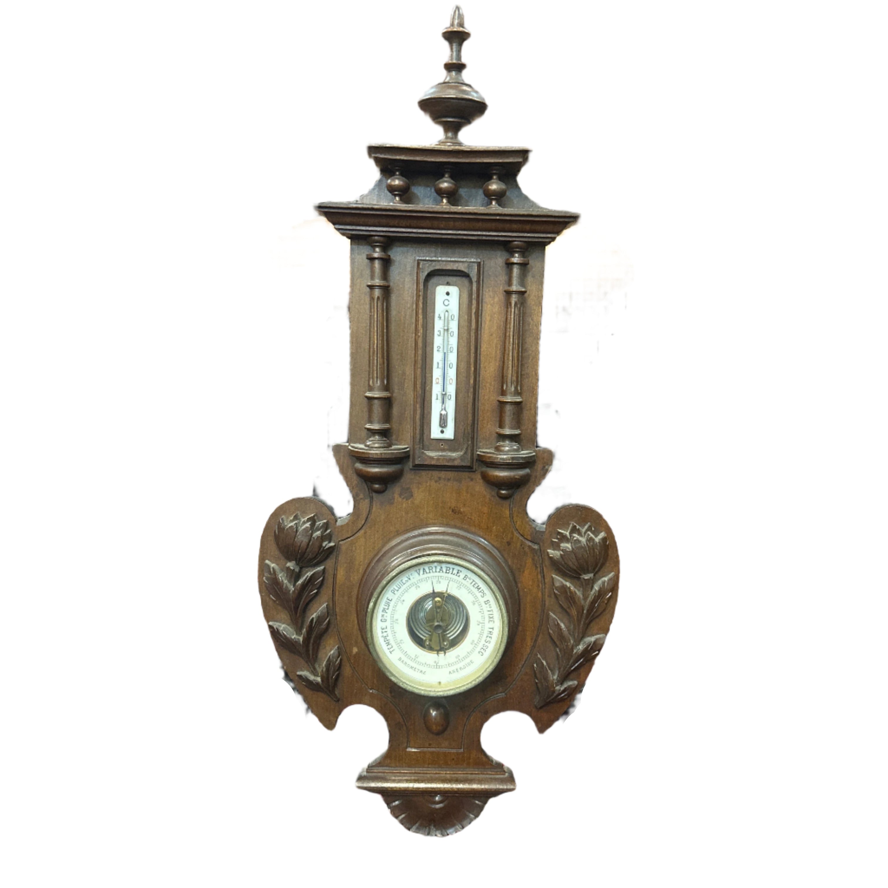 Magnifique baromètre mural en bois orné d'un magnifique motif floral sculpté sur les deux faces. Il est doté d'un thermomètre sur le dessus.