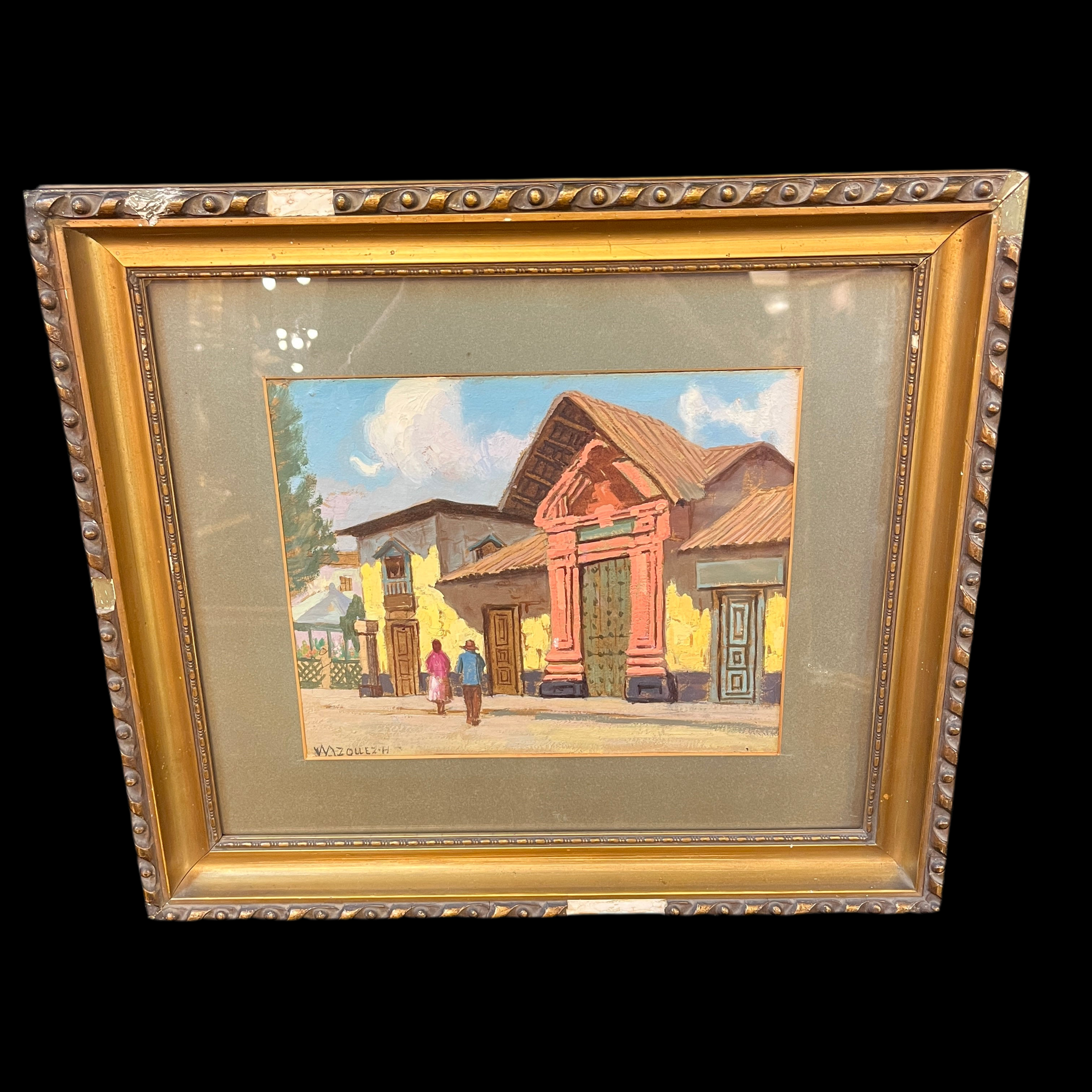 Óleo sobre cartón del artista de origen chileno Ulises Vázquez Hernández, miembro de la generación del trece. La obra representa una escena pueblerina en la que dos personas caminan frente a la fachada de un edificio de adobe, pintado de rojo y amarillo. Por el tamaño de la puerta en el frontis, podría tratarse de una escuela u otro edificio público. La obra está enmarcada con un paspartú gris y madera tallada en relieves y pintada en un tono cobrizo.