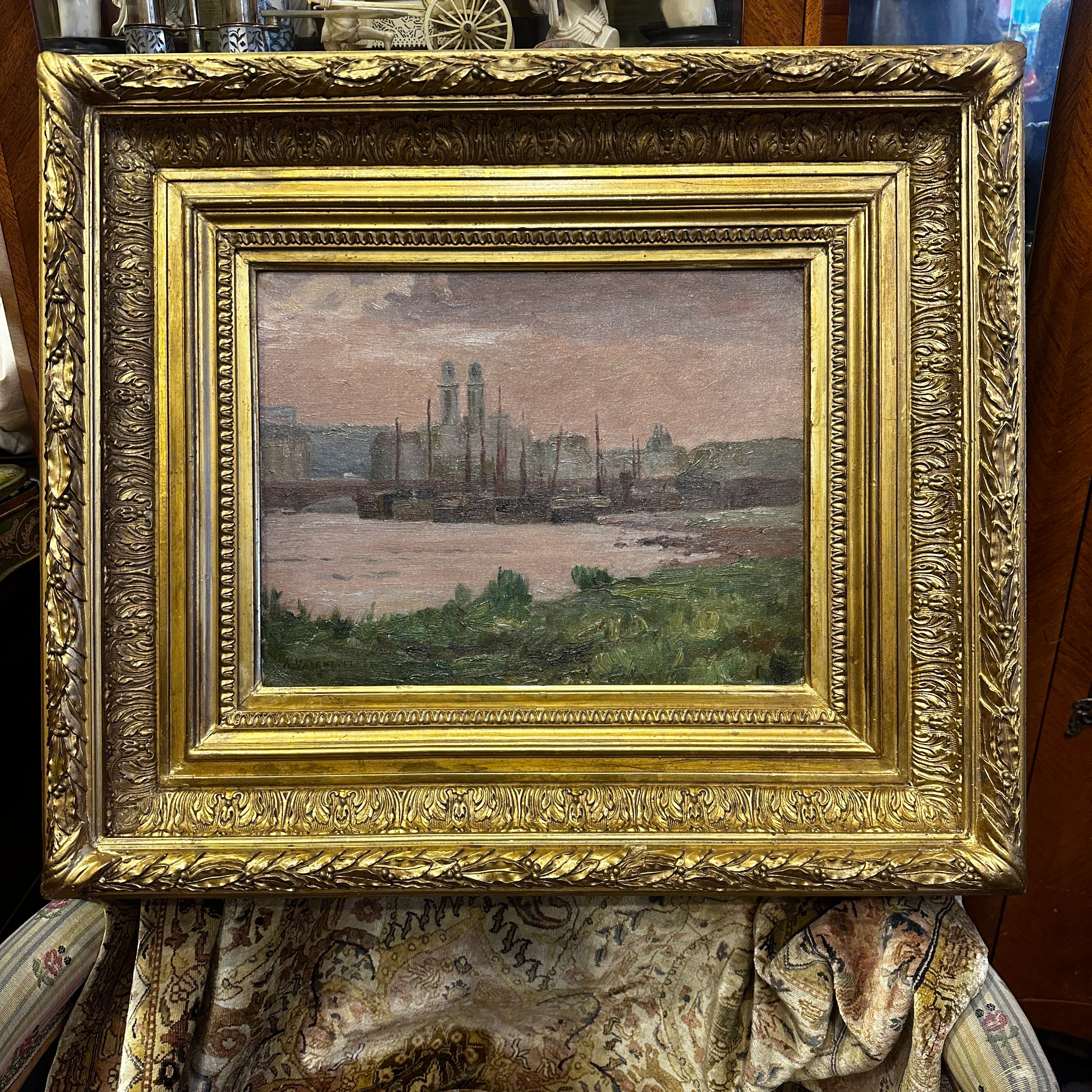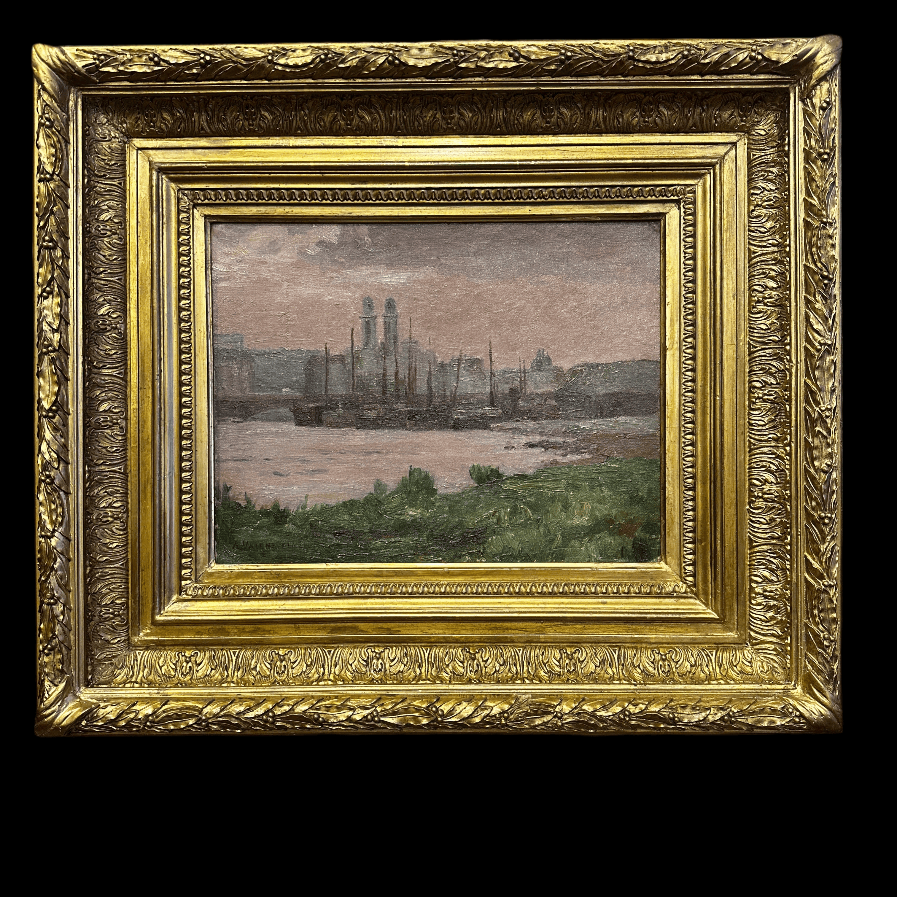 Magnifique tableau du peintre chilien représentant une vue lointaine d'un port avec un coucher de soleil rose en arrière-plan. Le tableau est en excellent état.