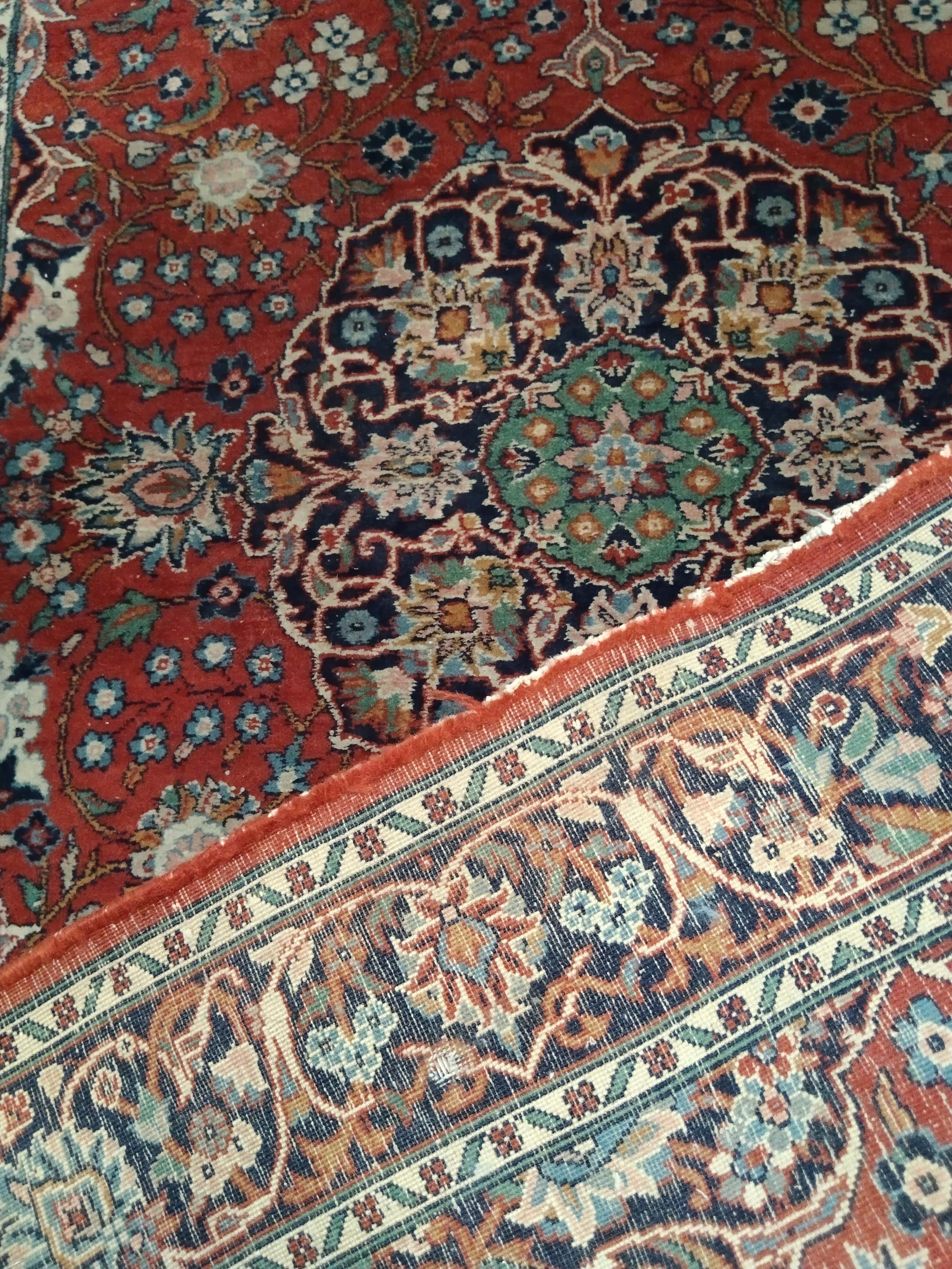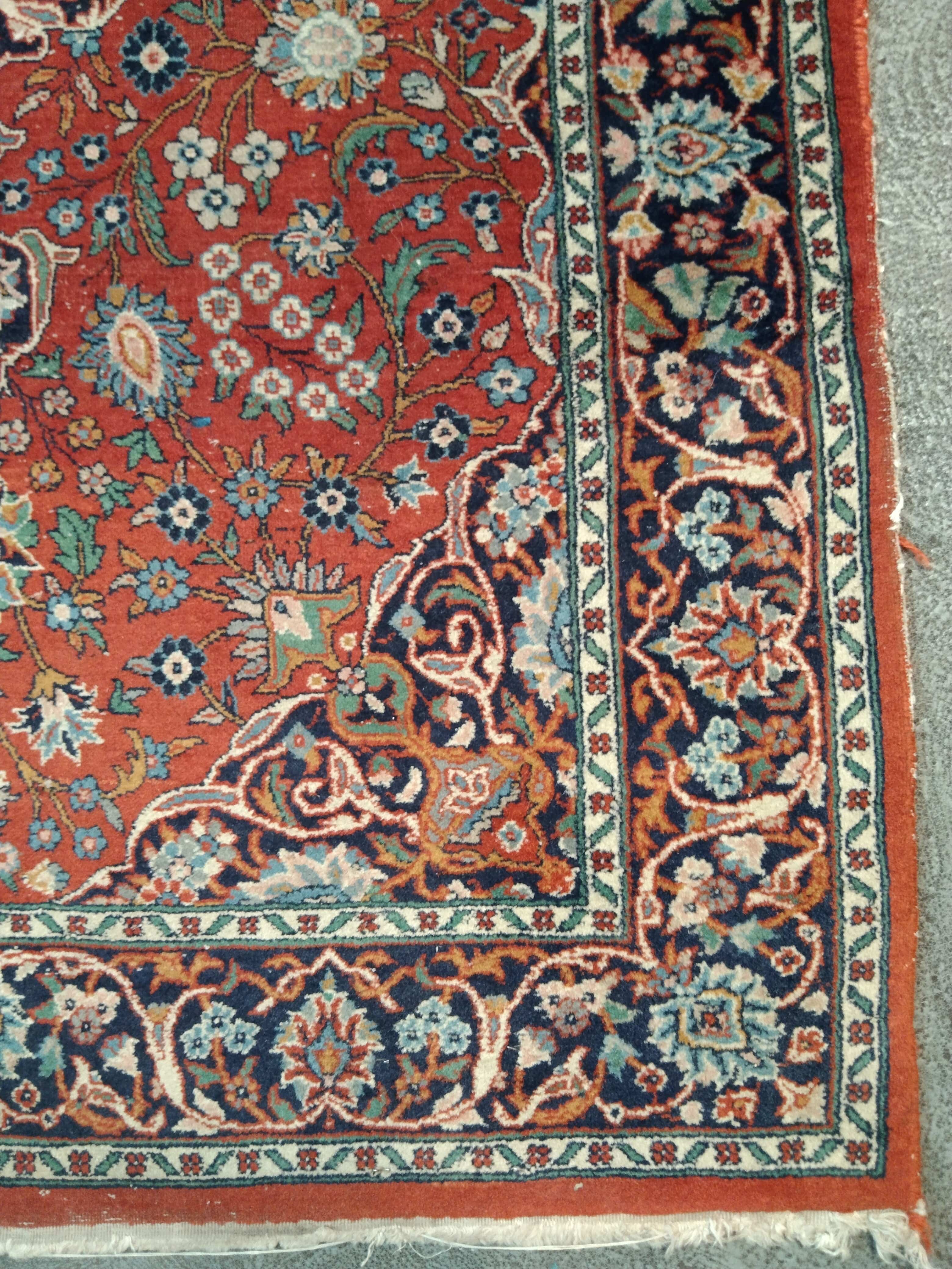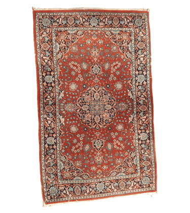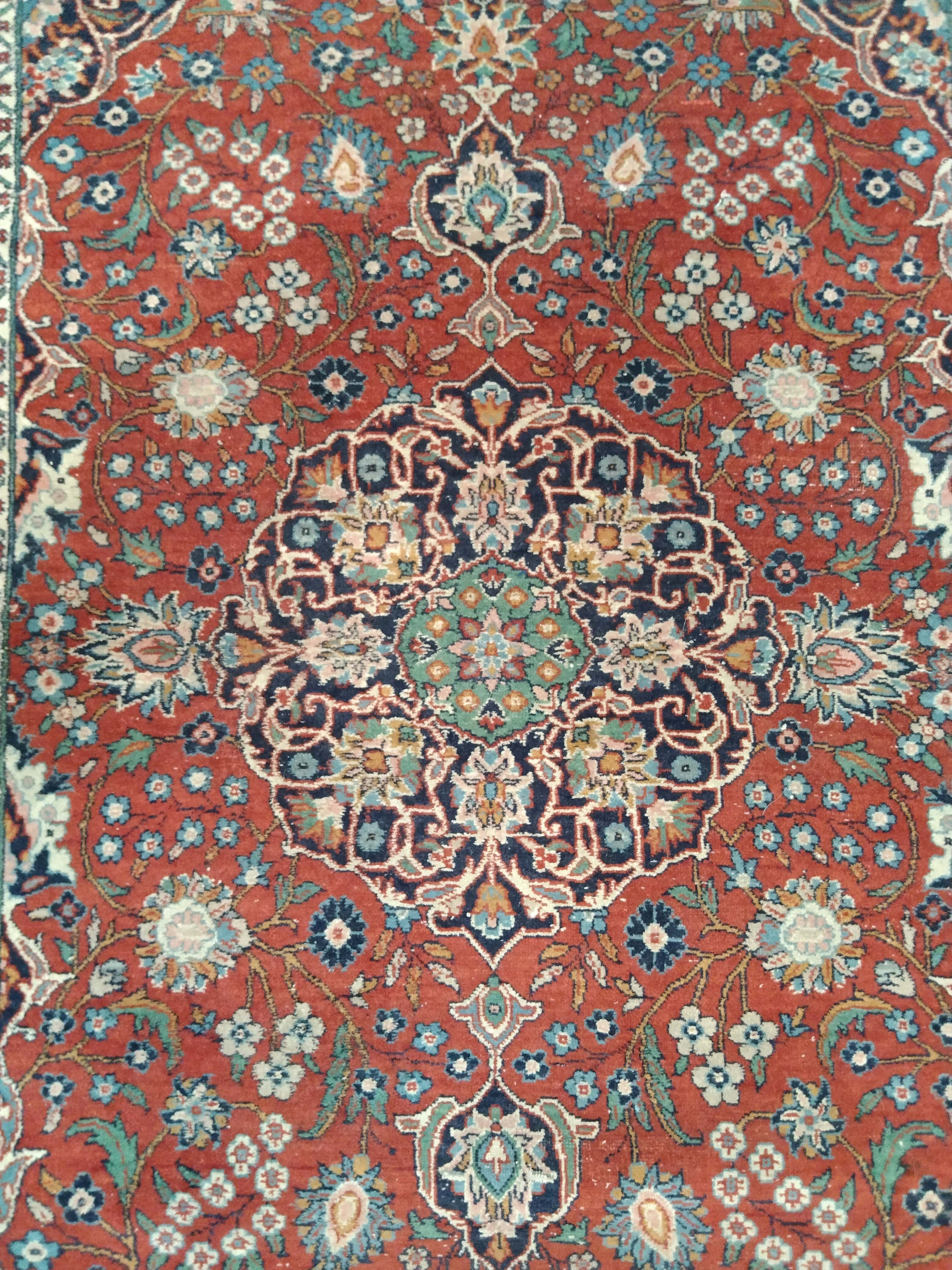 Magnifique tapis tapisserie d'origine persane, région centrale, noué main. Motif floral et figure centrale dans les tons bleus, verts et rougeâtres.