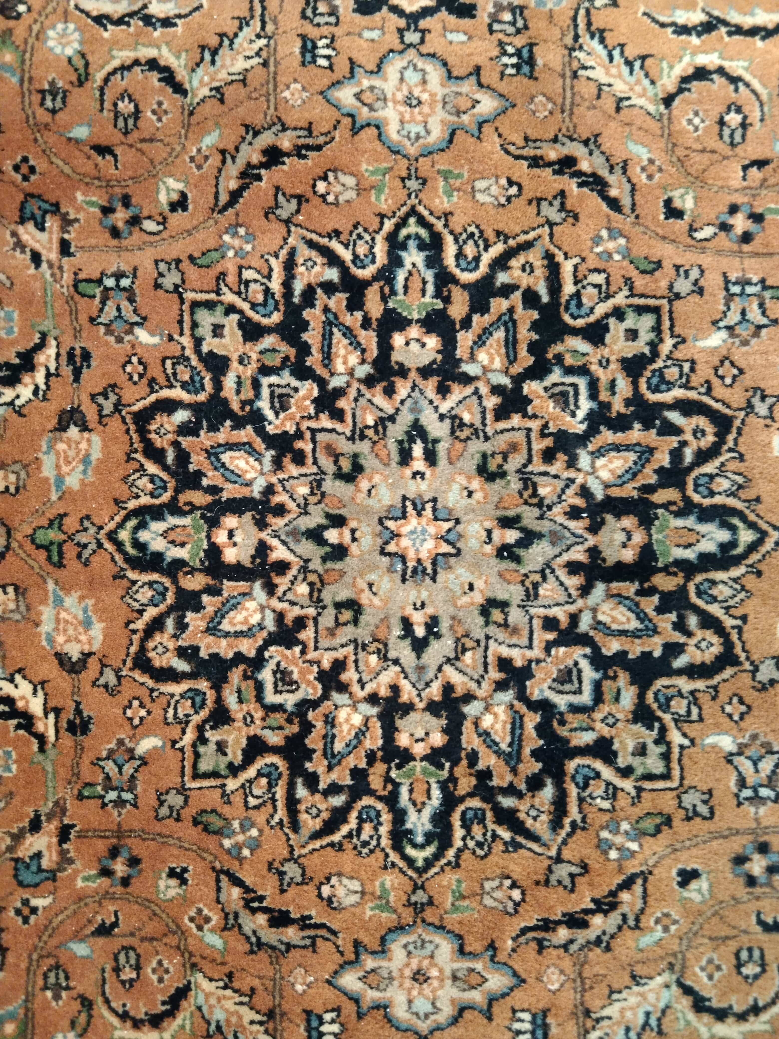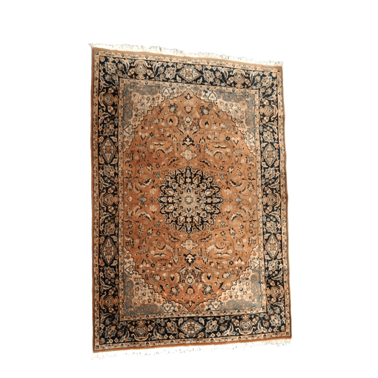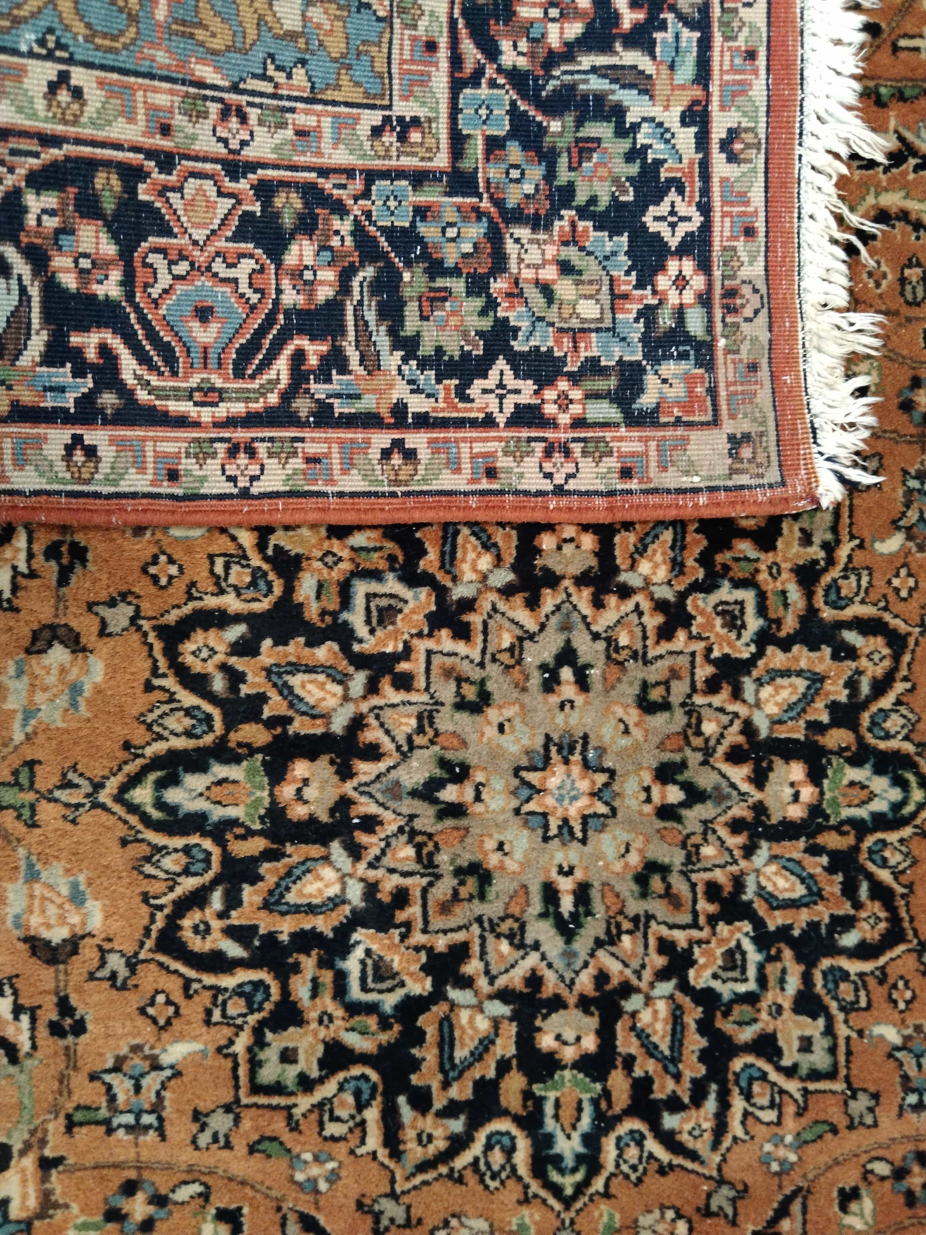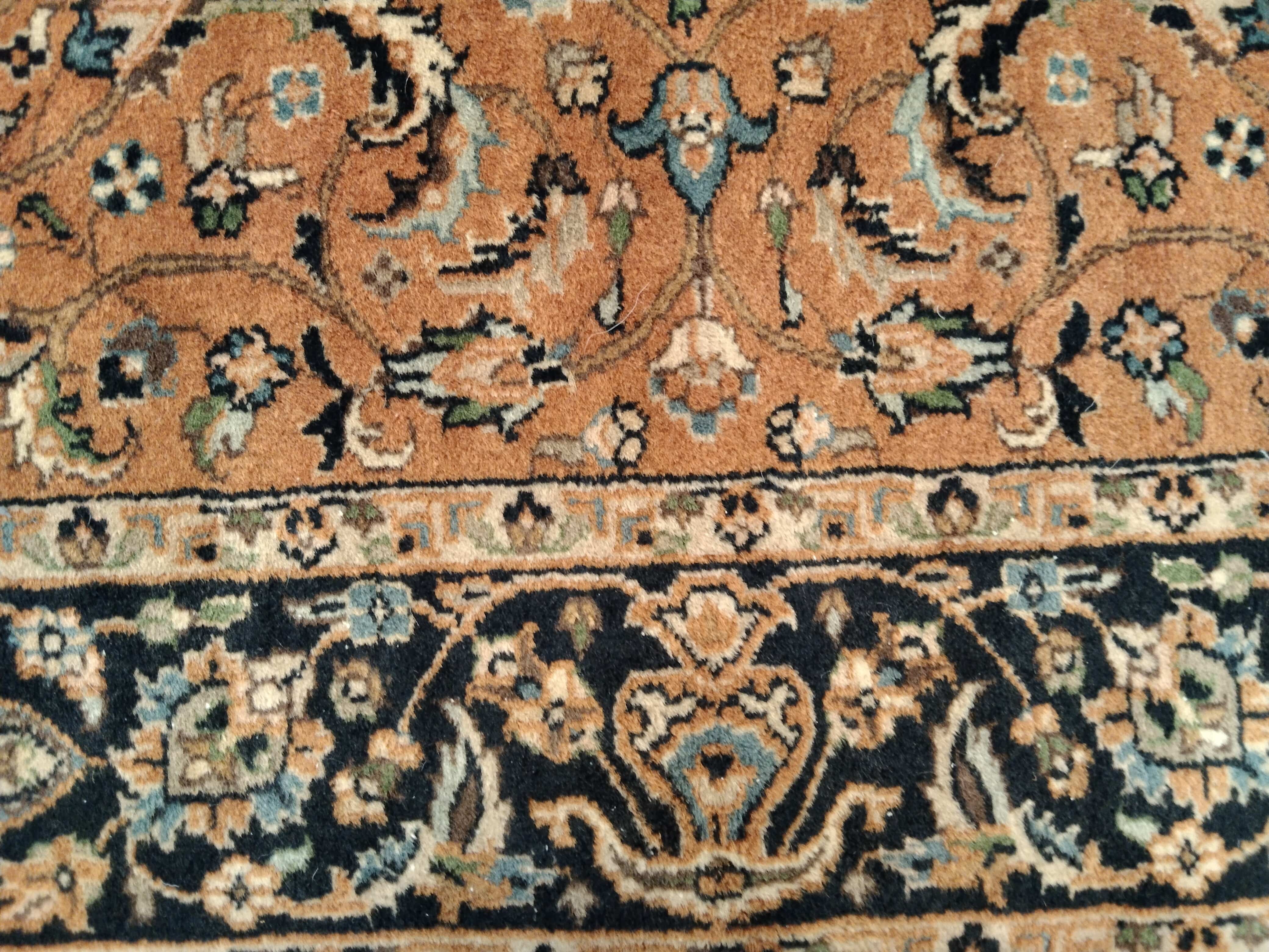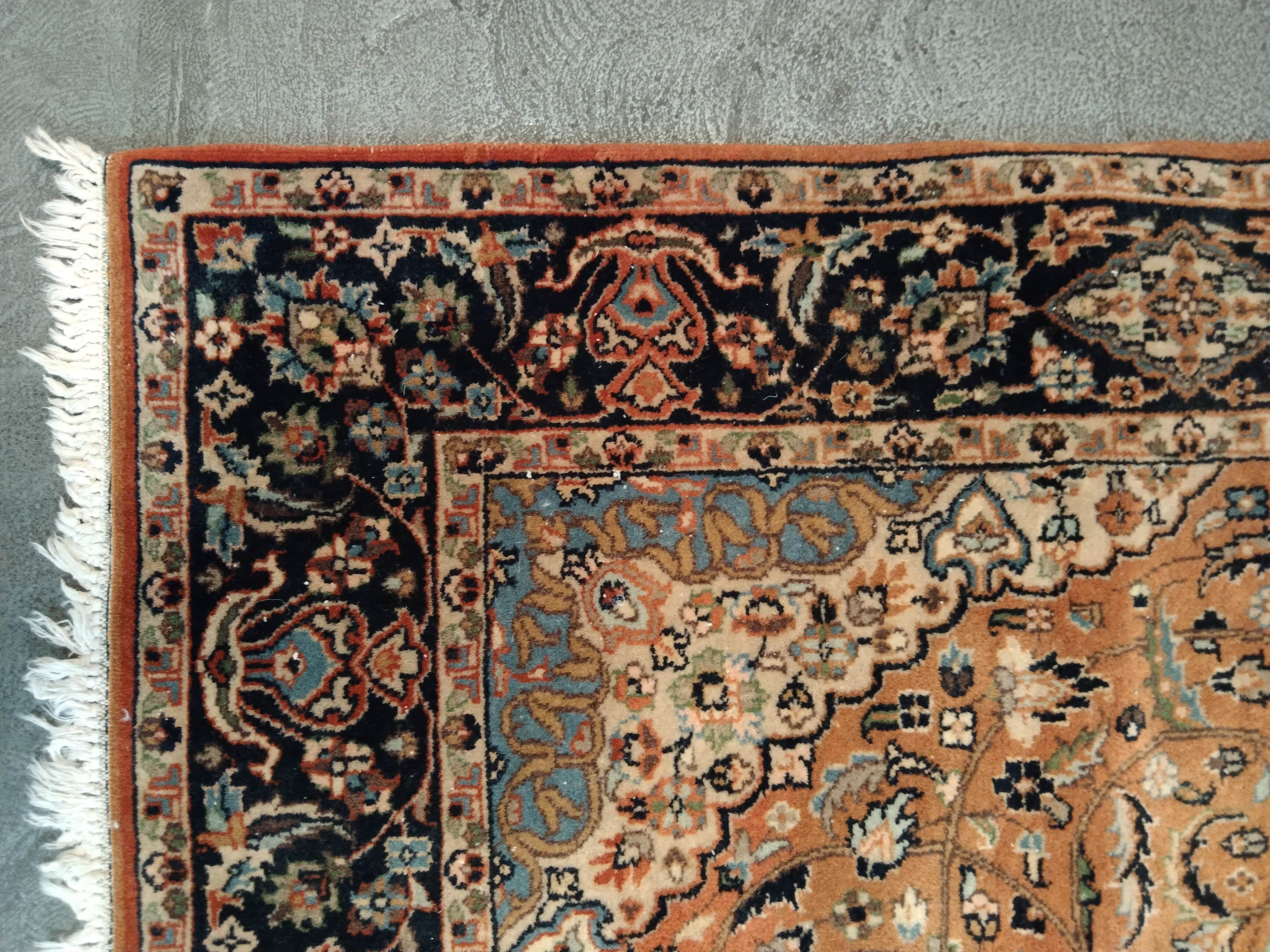 Magnifique tapis tapisserie d'origine iranienne, région centrale, noué main. Motif détaillé de fleurs et de personnages dans les tons orange, bleu et jaune. Figure centrale remarquable en forme de fleur dans les tons sombres.