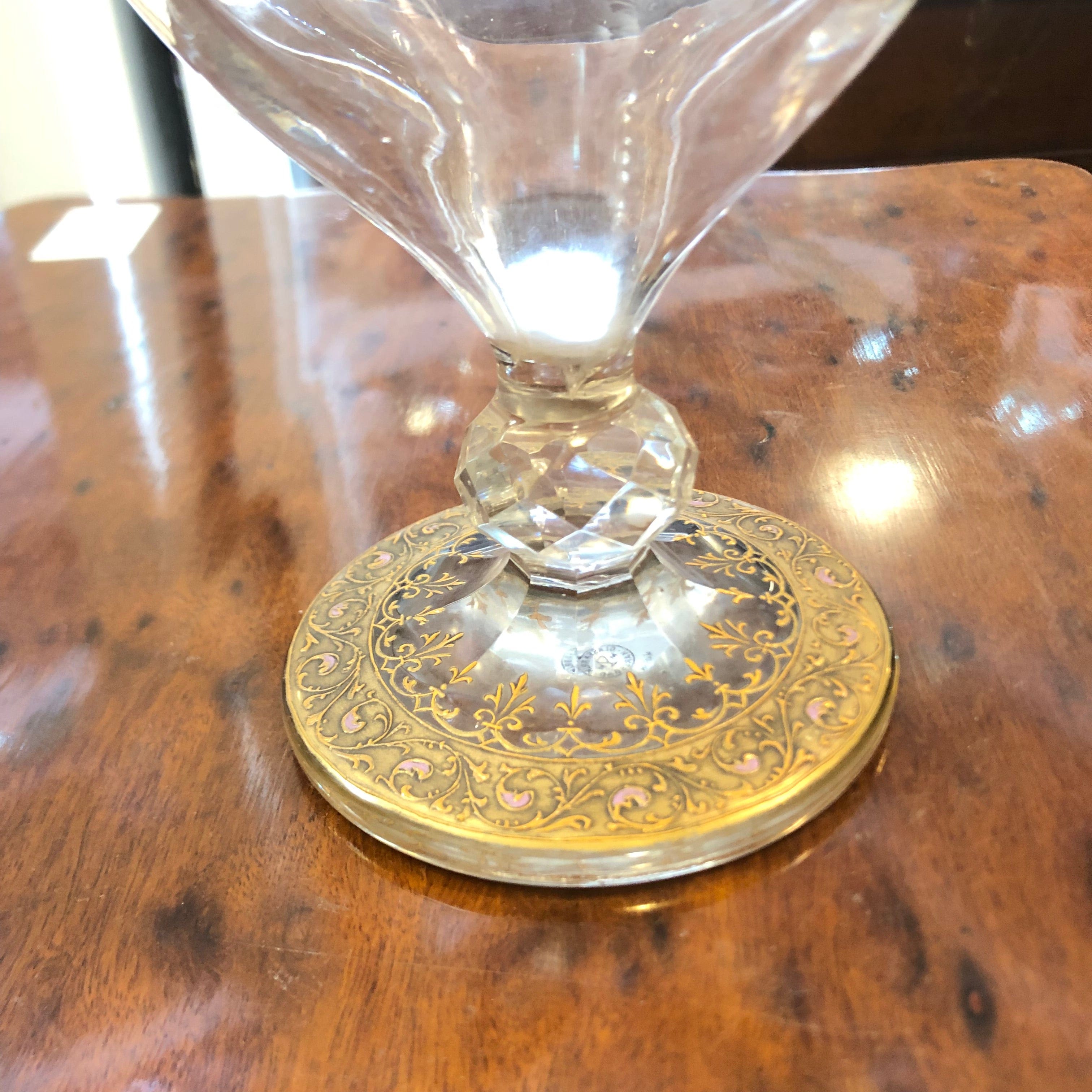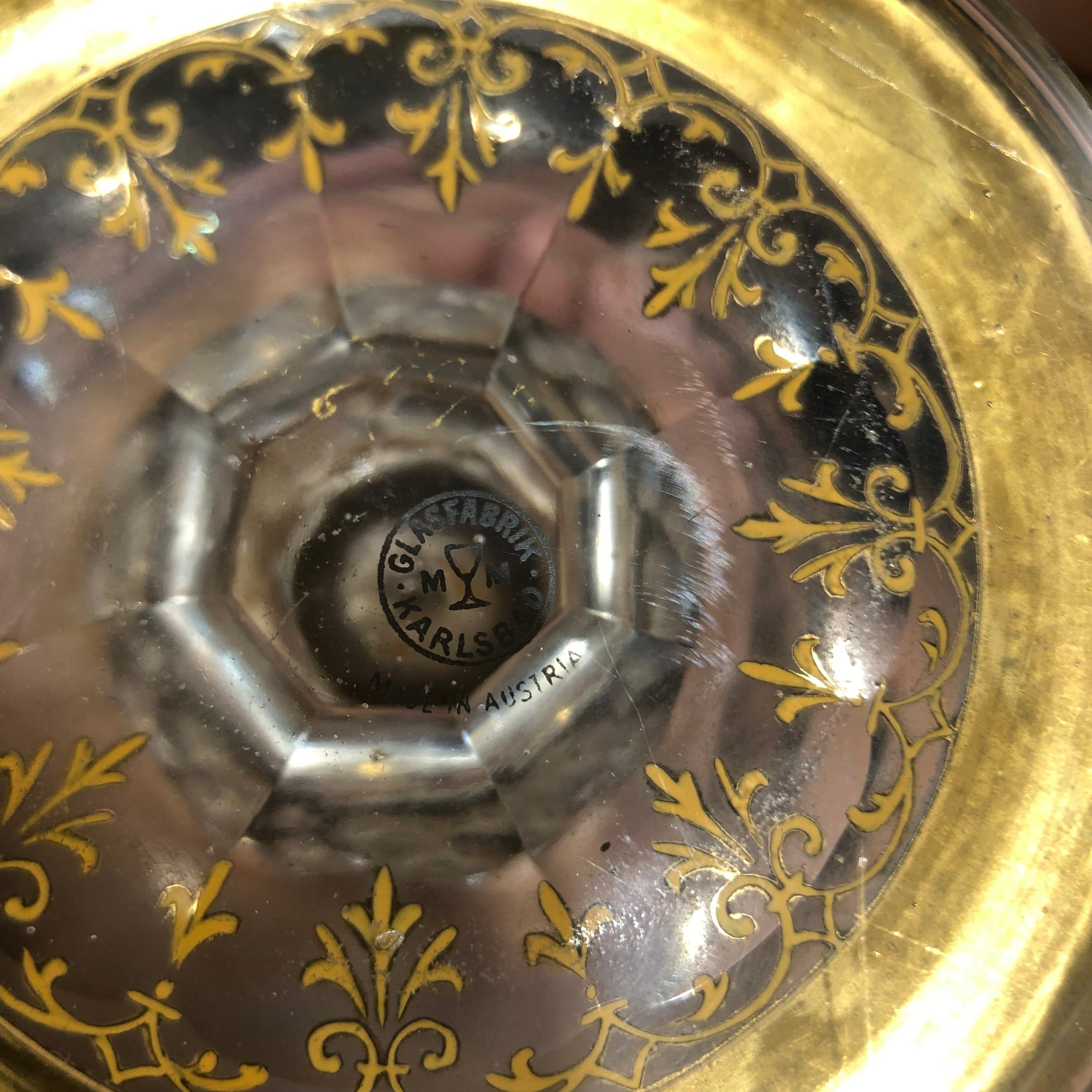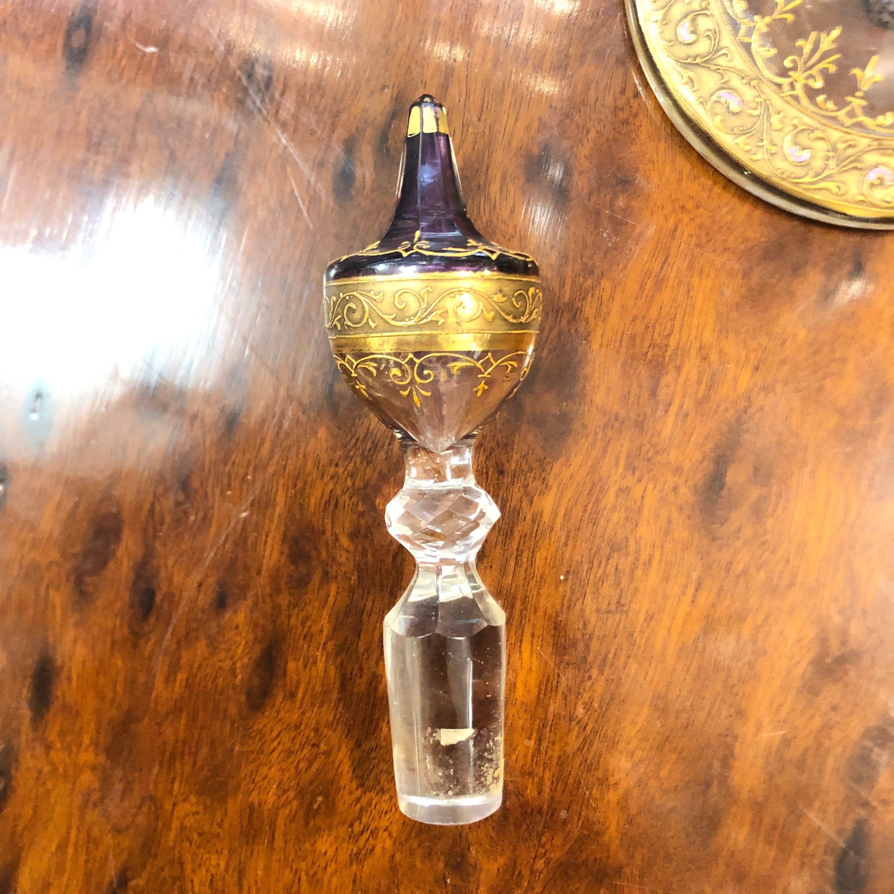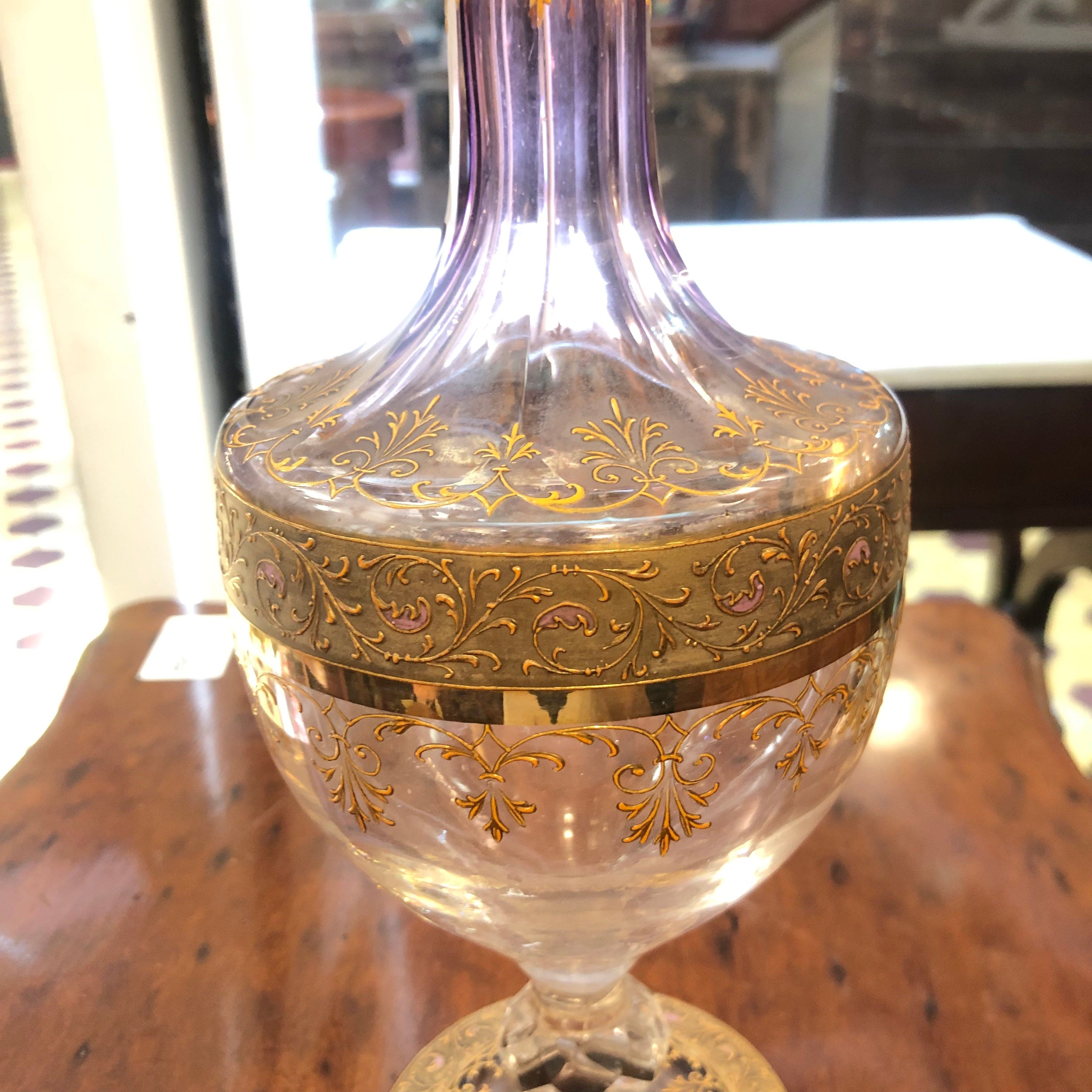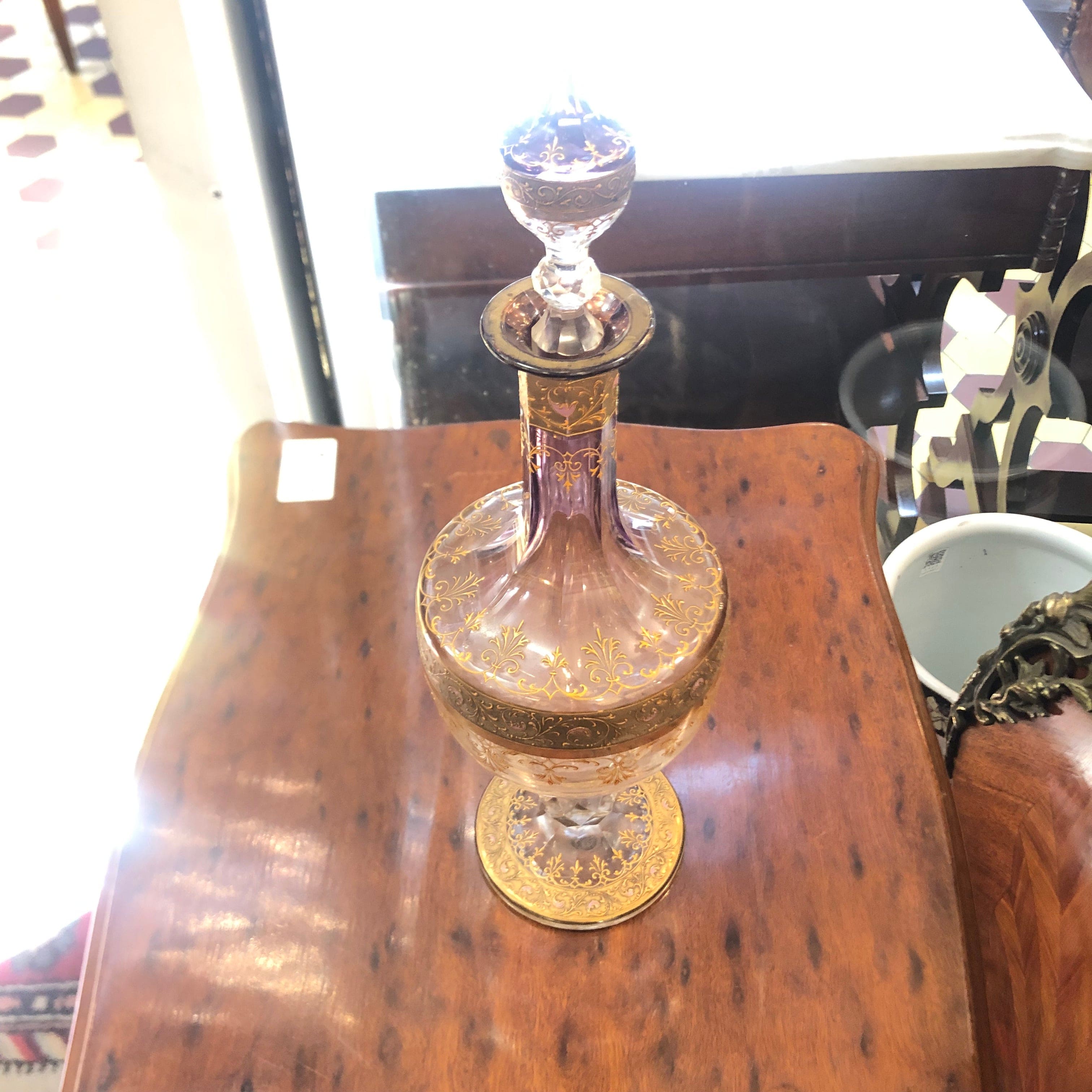 Magnifique bouteille de la prestigieuse marque autrichienne Moser Karlsbad. Fleurs dorées aux détails roses, nuancées de violet.