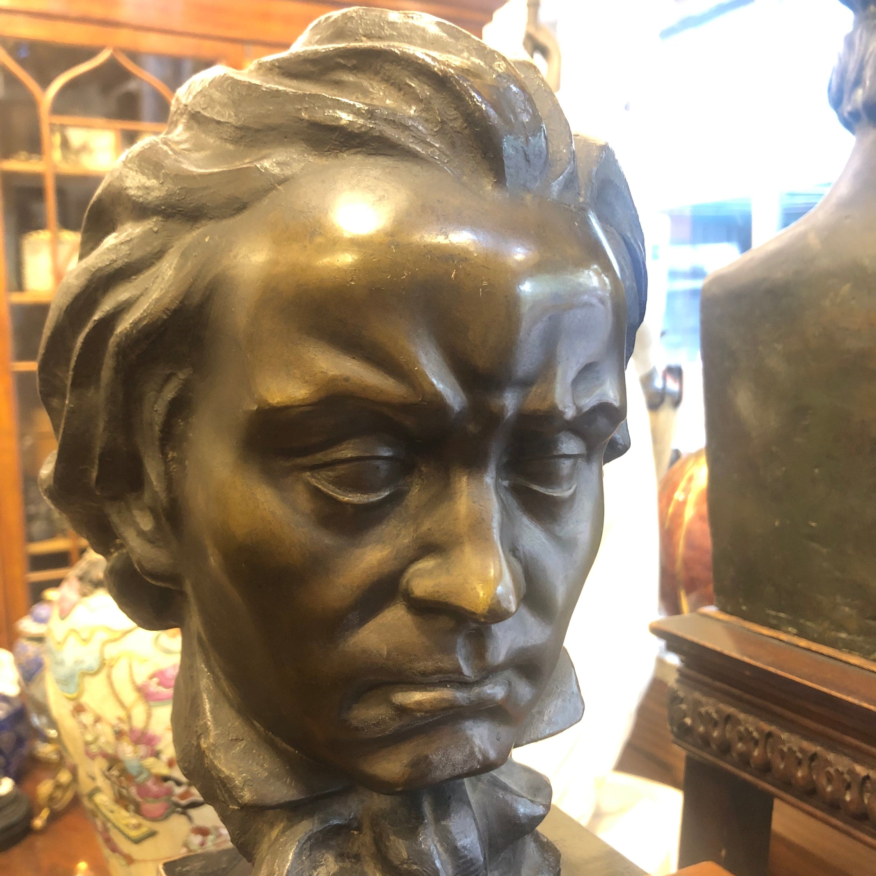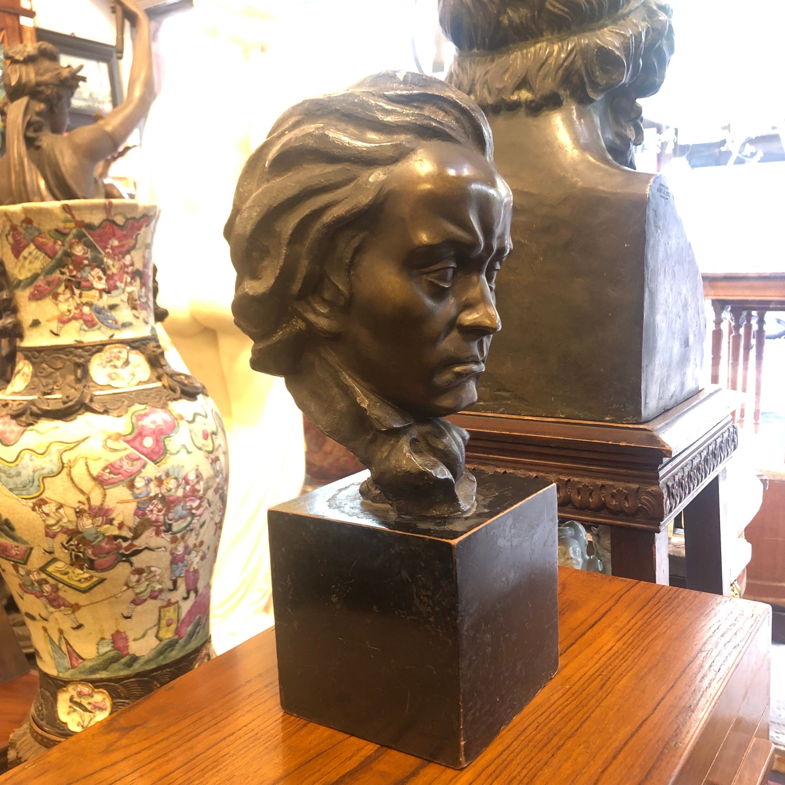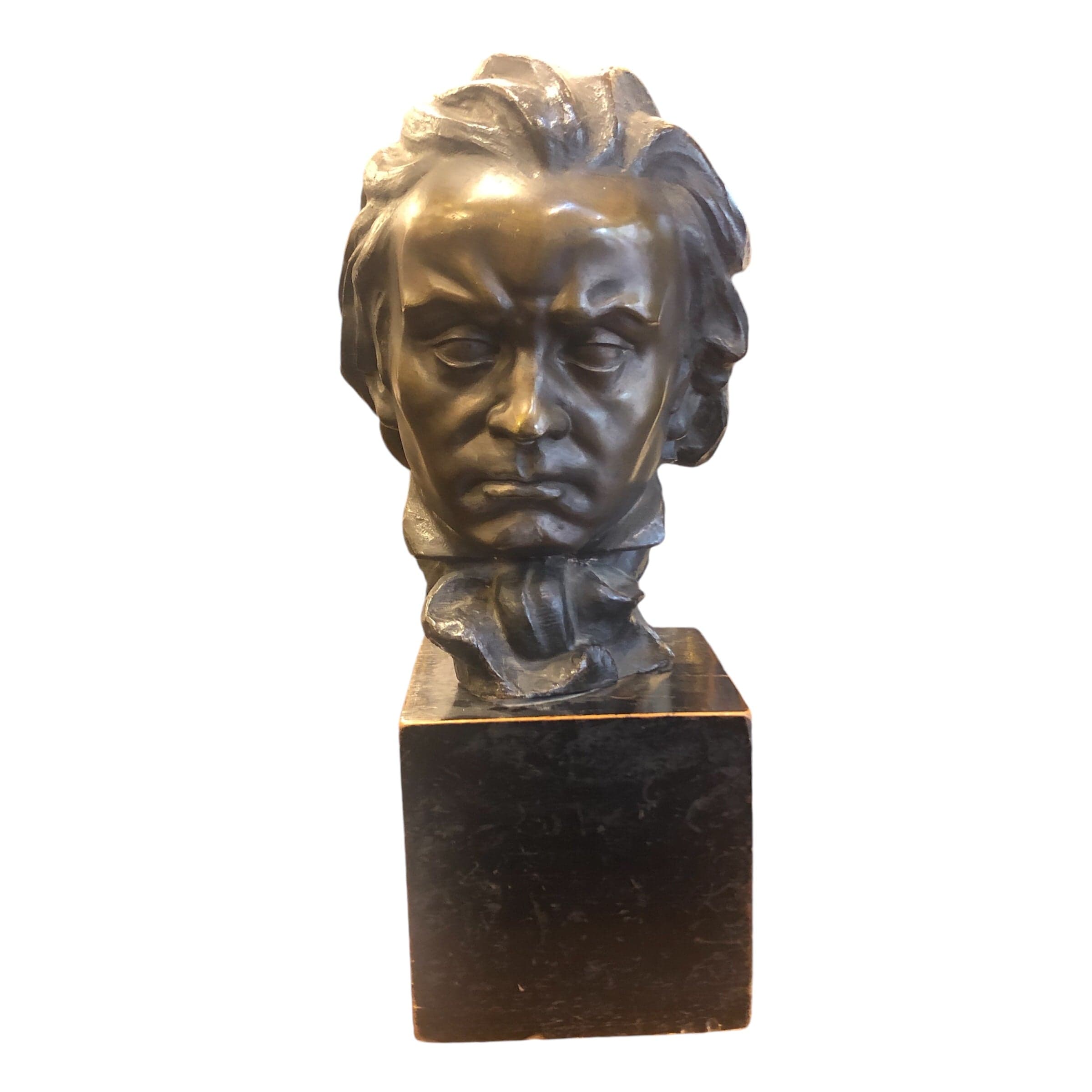 Sculpture en bronze du célèbre compositeur Ludwig van Beethoven. La sculpture repose sur un socle cubique en bois peint en noir.