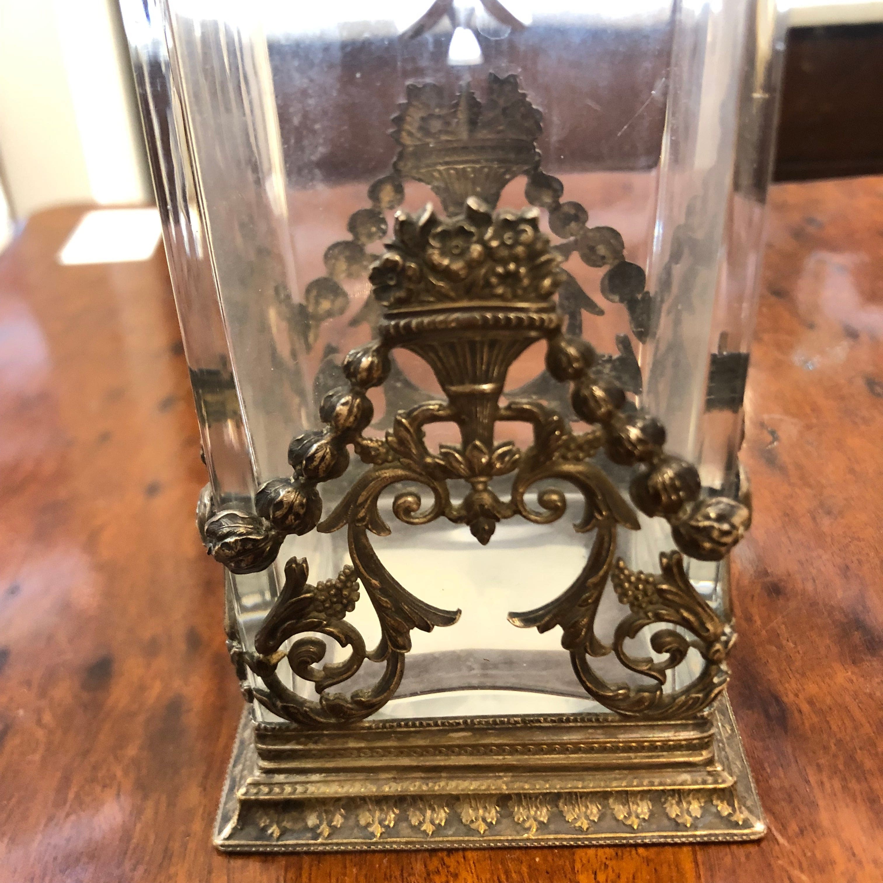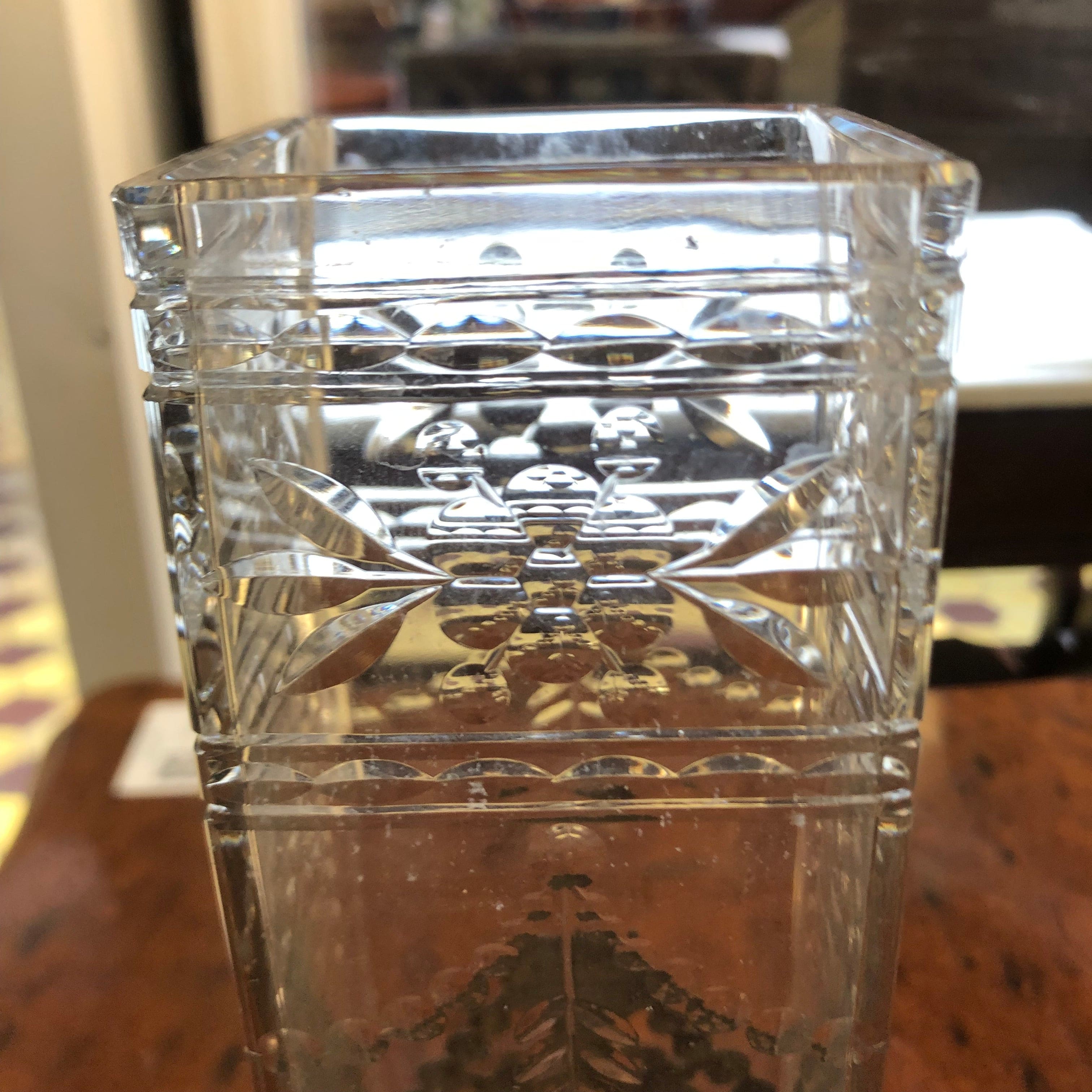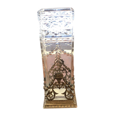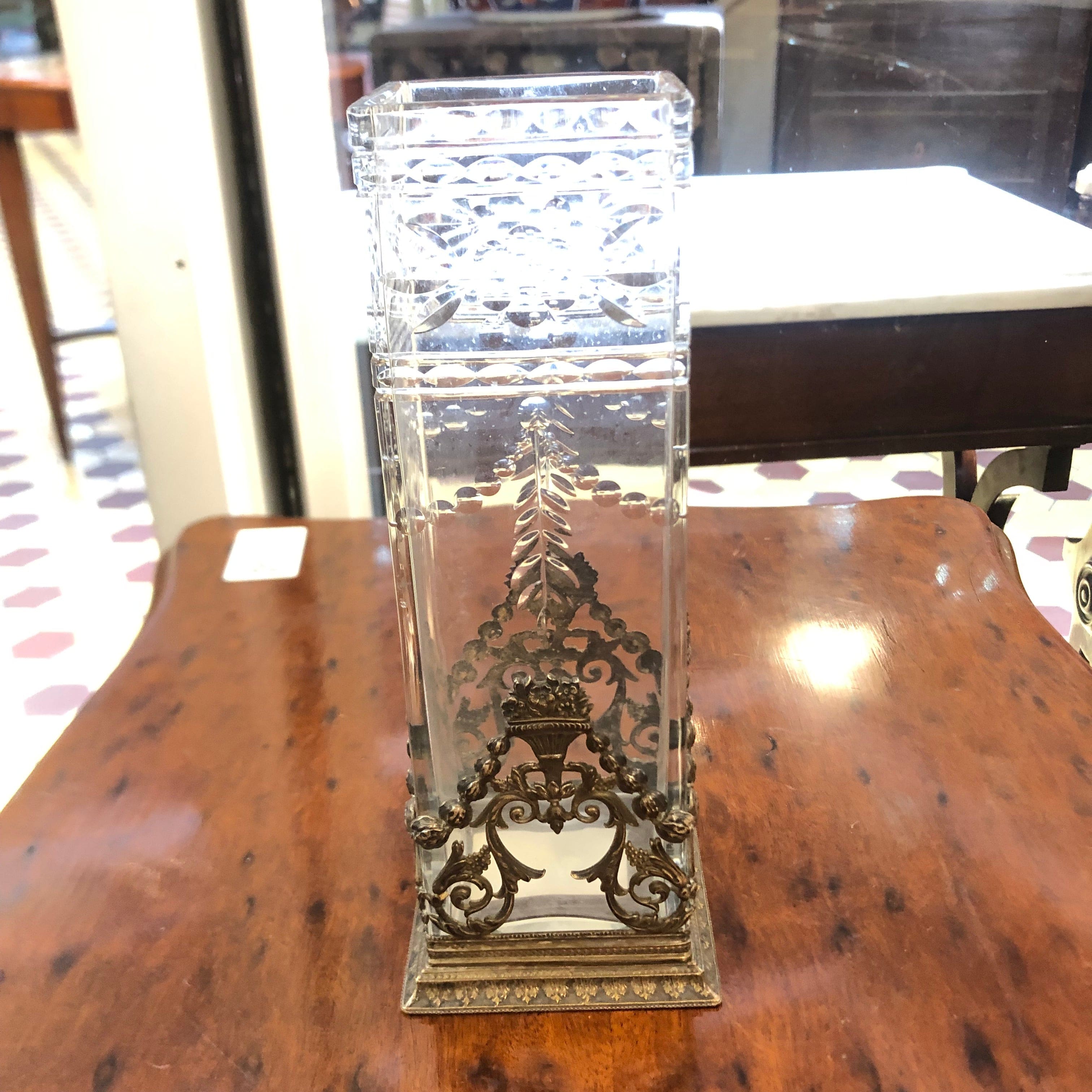 Vase rectangulaire remarquable en verre taillé avec une base en étain et de belles décorations florales, également en étain.