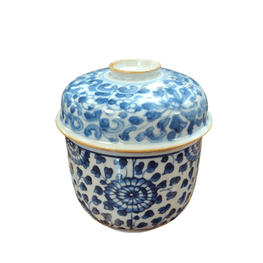 Belle fontaine en céramique chinoise bleue et blanche avec couvercle.