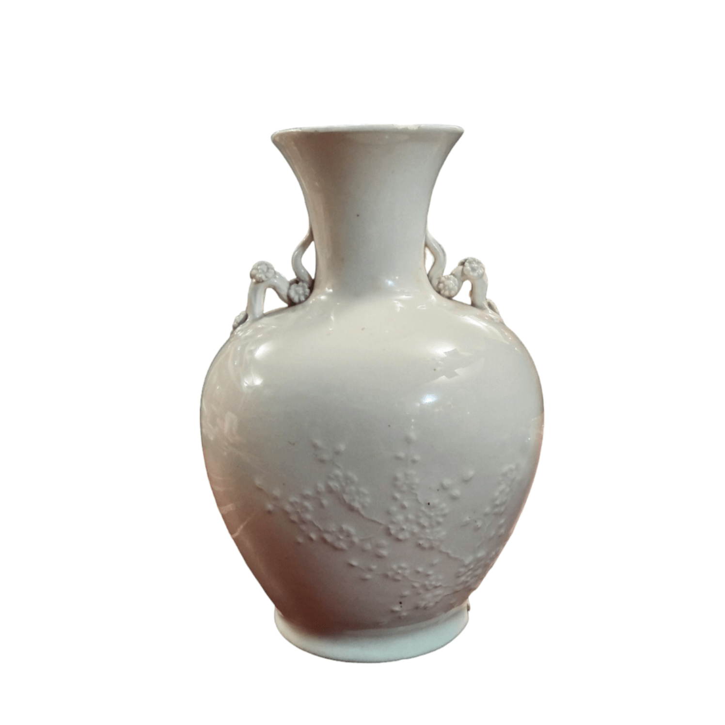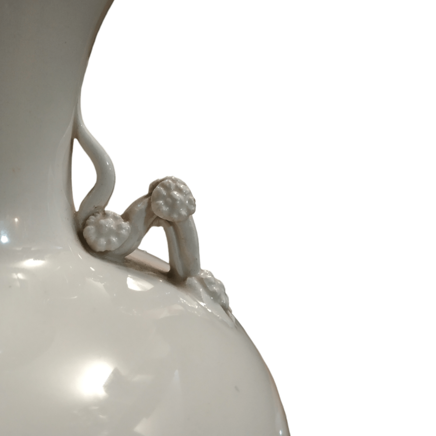 Élégant vase en céramique chinoise blanche avec de beaux motifs floraux sur ses anses et un subtil motif de fleur de cerisier sur sa surface.