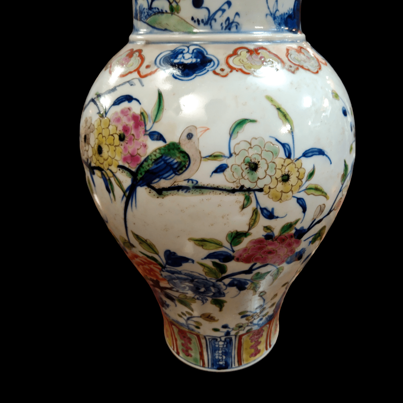 Élégant vase en porcelaine chinoise de la dynastie Ming, peint à la main avec des motifs d'oiseaux se reposant parmi des fleurs dans des tons doux de vert, bleu et rouge.