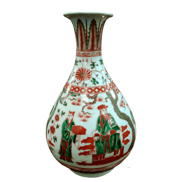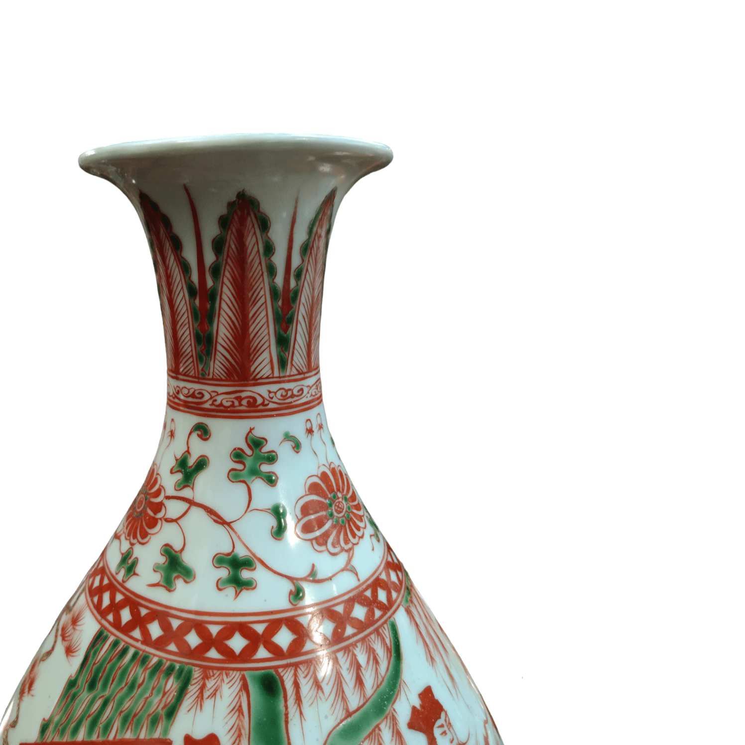 Magnifique vase en porcelaine chinoise peint à la main, orné de scènes d'époque en vert et rouge, représentant des personnages dans un jardin. Le vase présente également de magnifiques motifs floraux autour du col.
