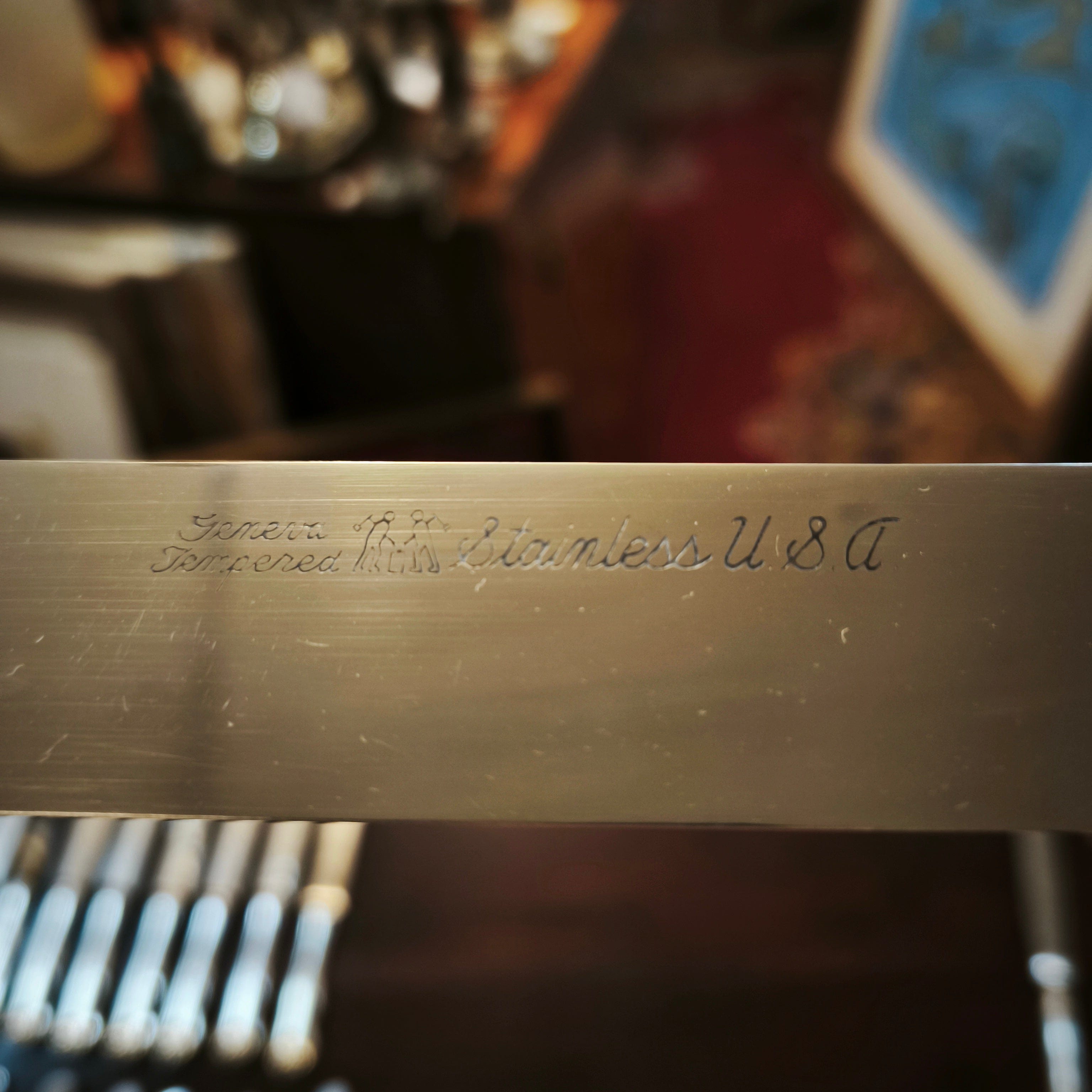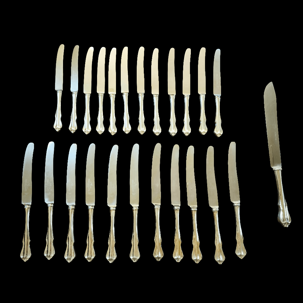 L'ensemble se compose de 24 pièces : un grand couteau à découper, 11 grands couteaux inférieurs et 12 petits couteaux d'entrée.