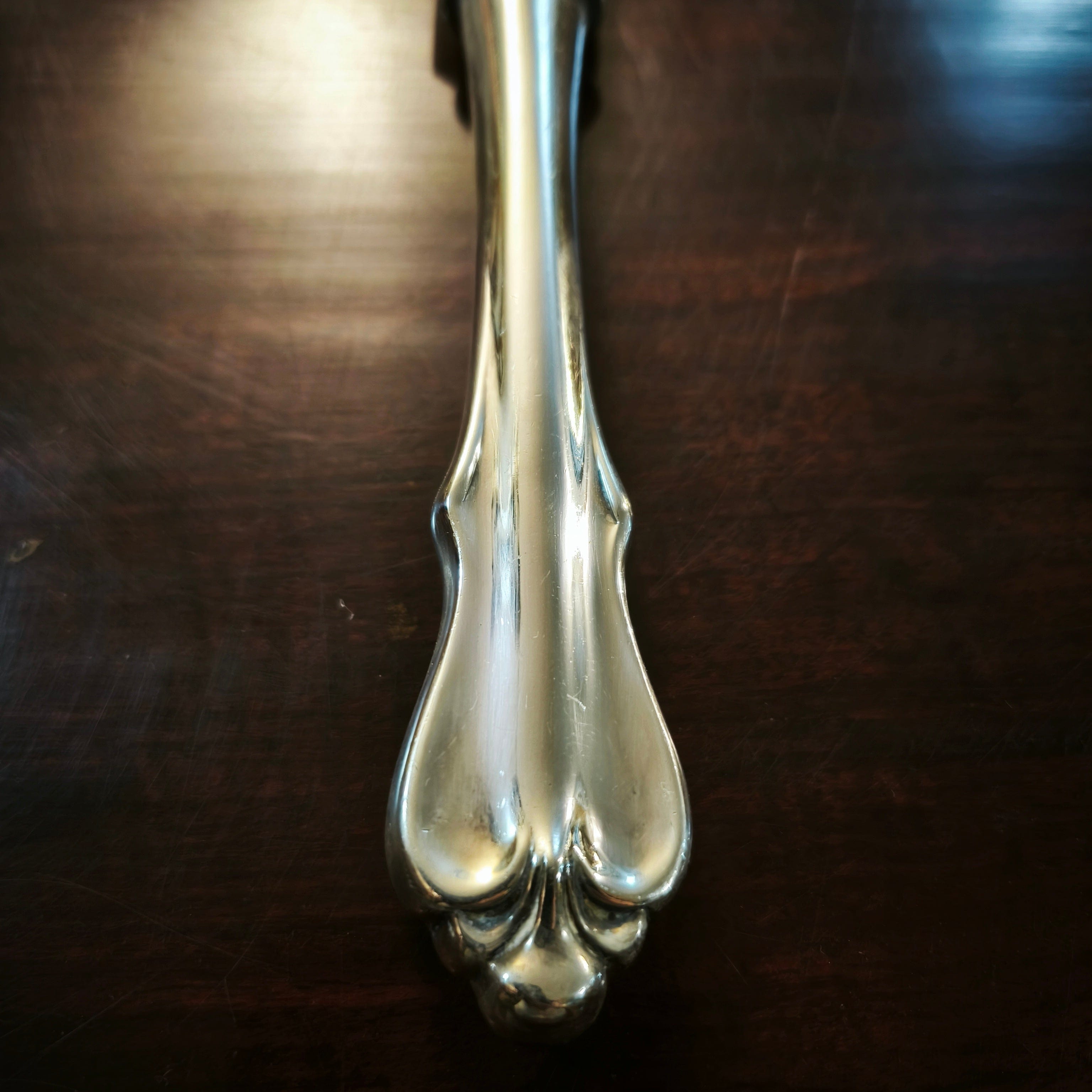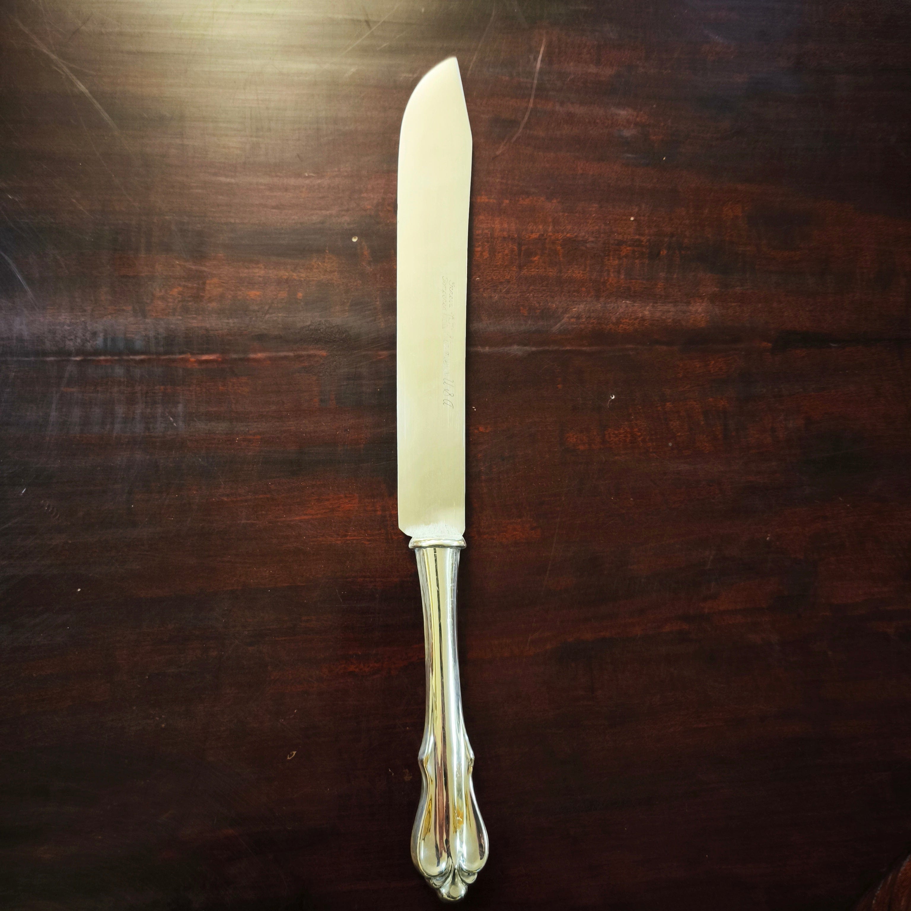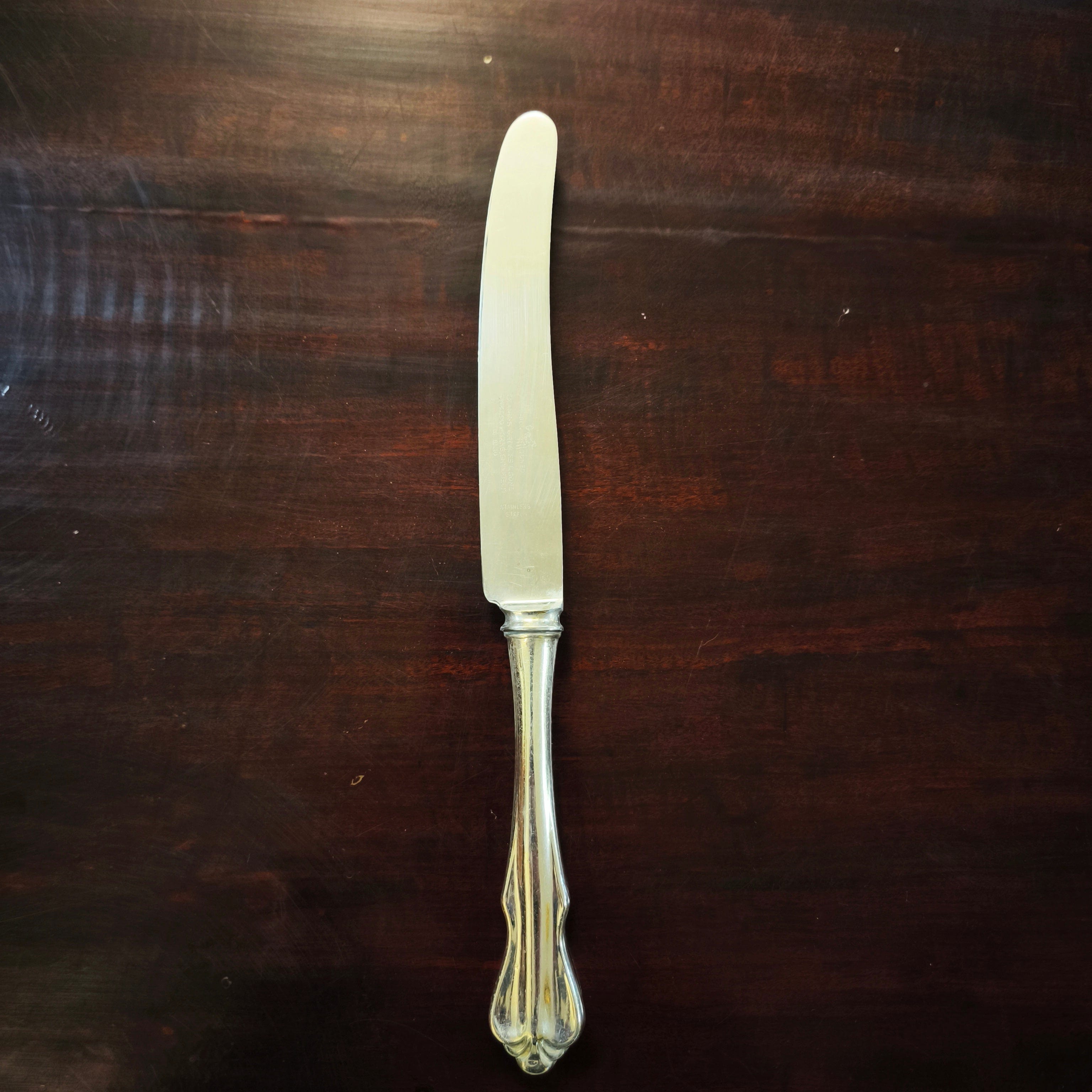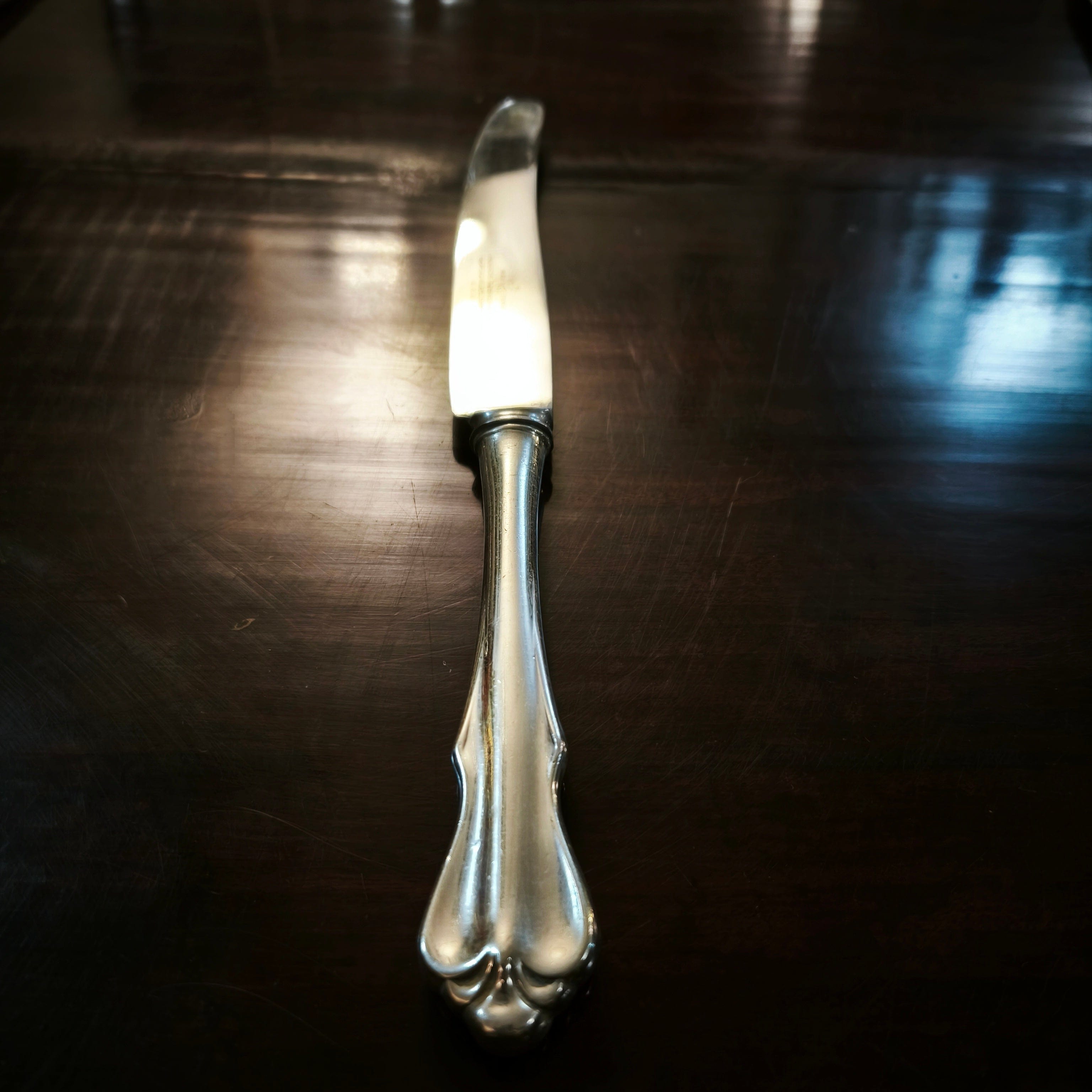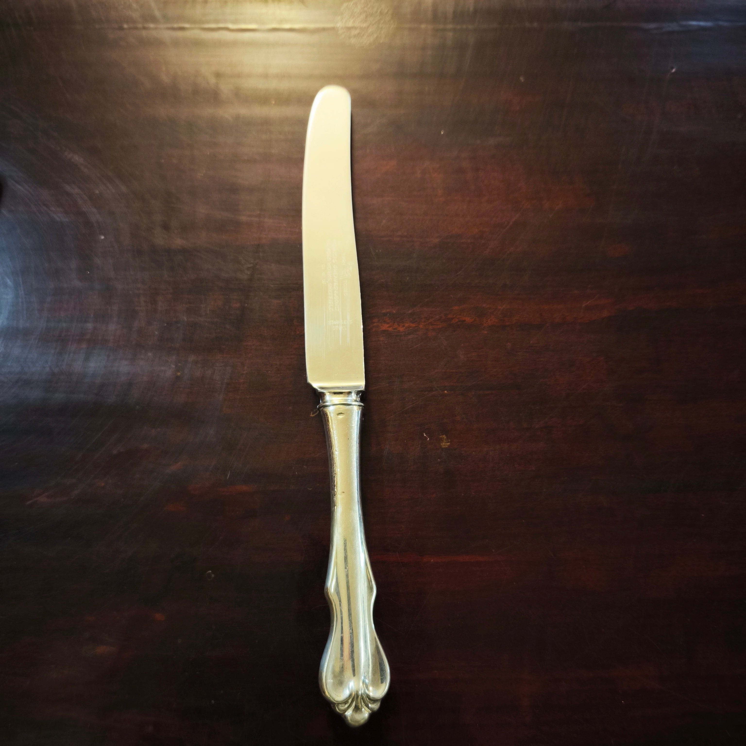 Élégant ensemble de couverts d'origine anglaise, poinçonné par l'orfèvre Francis Greaves & Sons de Radford Works Sheffield, avec un manche en argent 925 et une lame en acier inoxydable. Chaque pièce porte son poinçon sur sa lame et d'élégants motifs en relief sur l'extrémité du manche.
