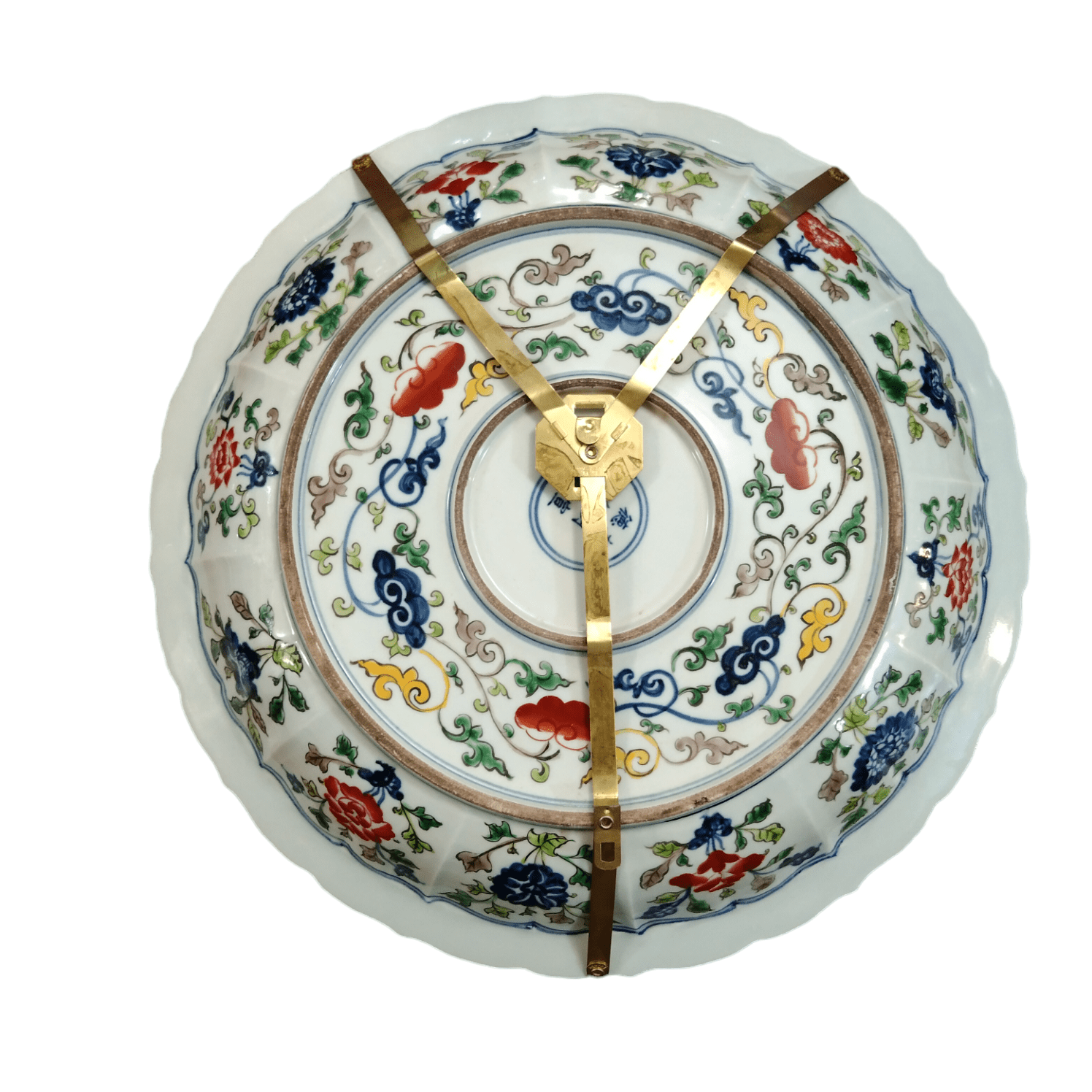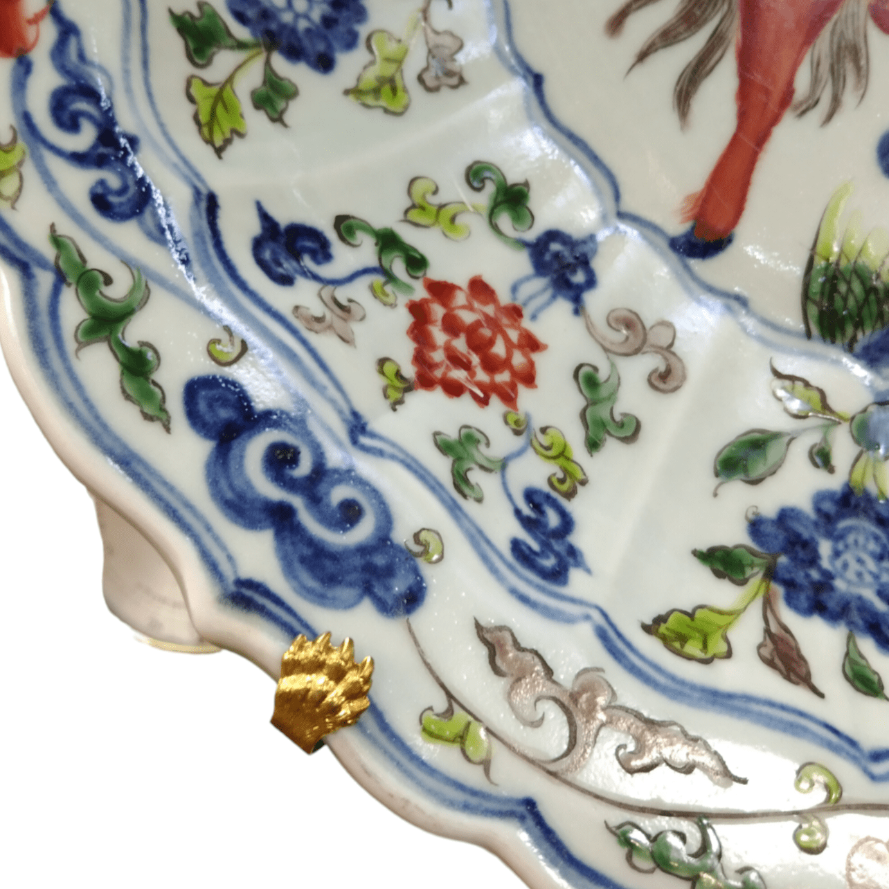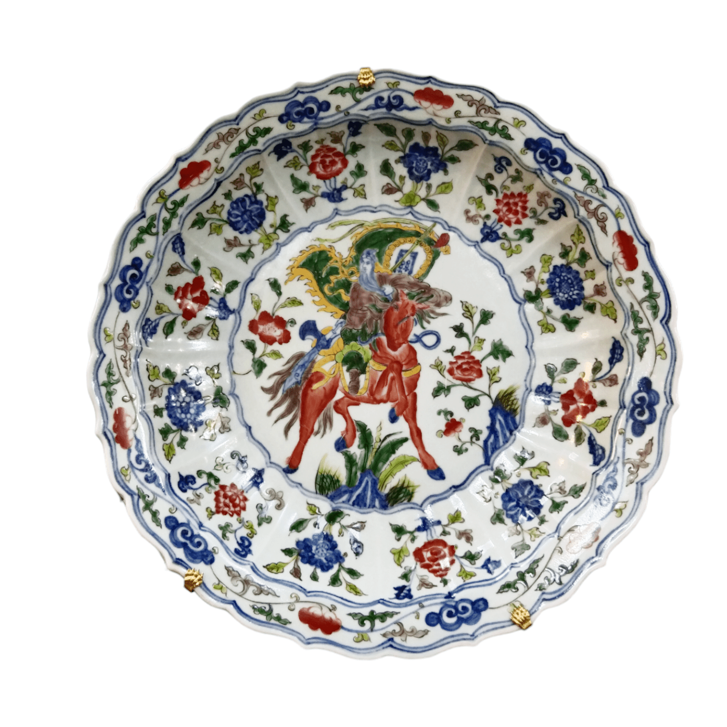 Assiette décorative en faïence ornée de motifs floraux peints à la main, représentant un cheval et son cavalier au centre. Le dos est orné d'une structure à crochets dorés, rehaussée de magnifiques détails dorés qui subliment la pièce.