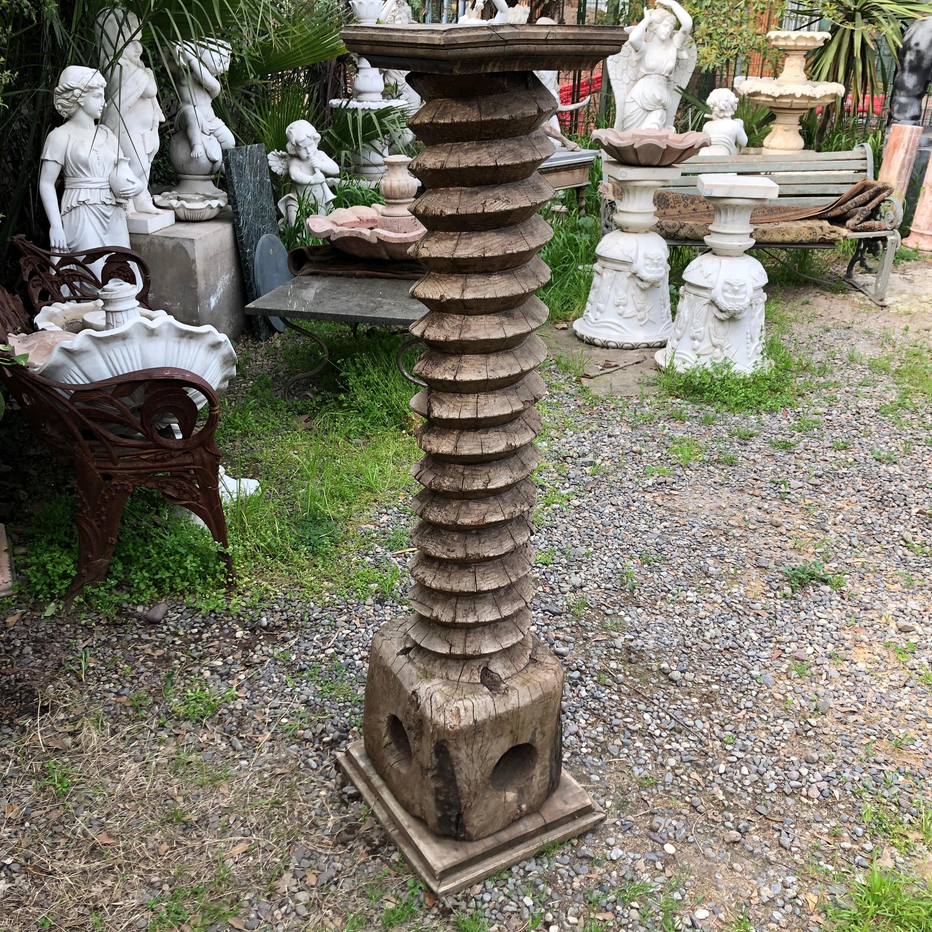 Une grande vis en bois antique, pièce de collection unique et recherchée, faisant partie d'un pressoir à vin utilisé dans les vignobles français.