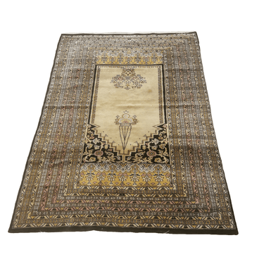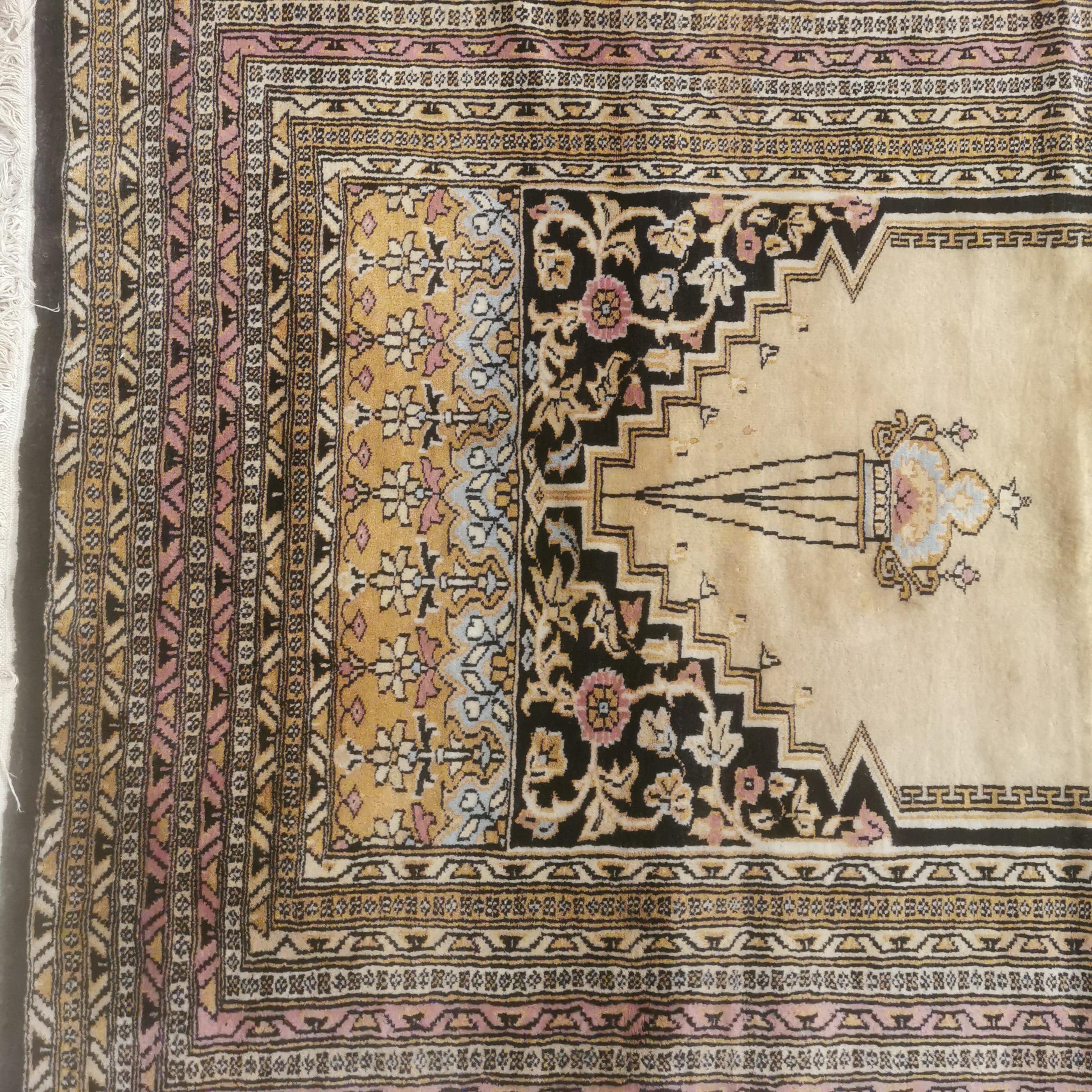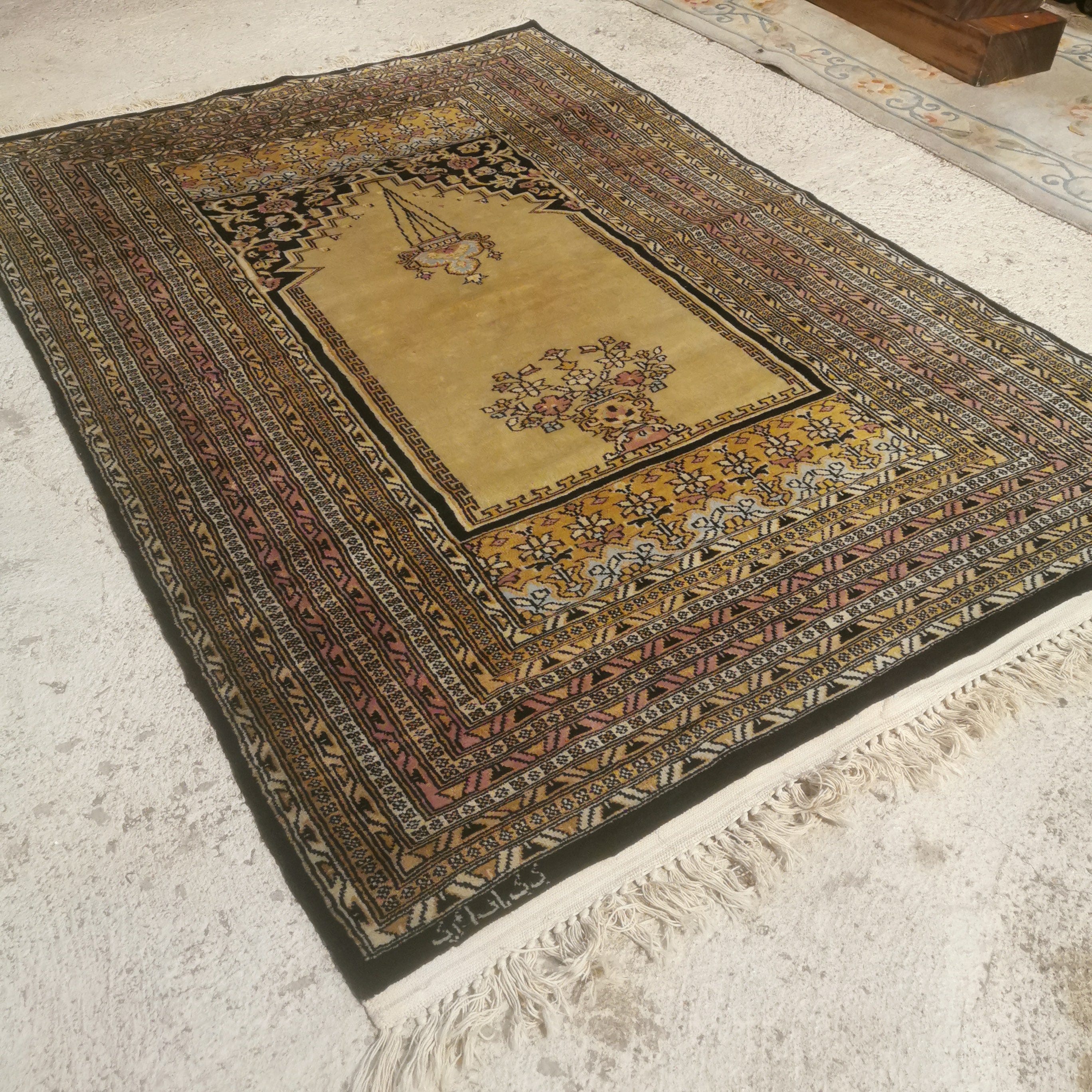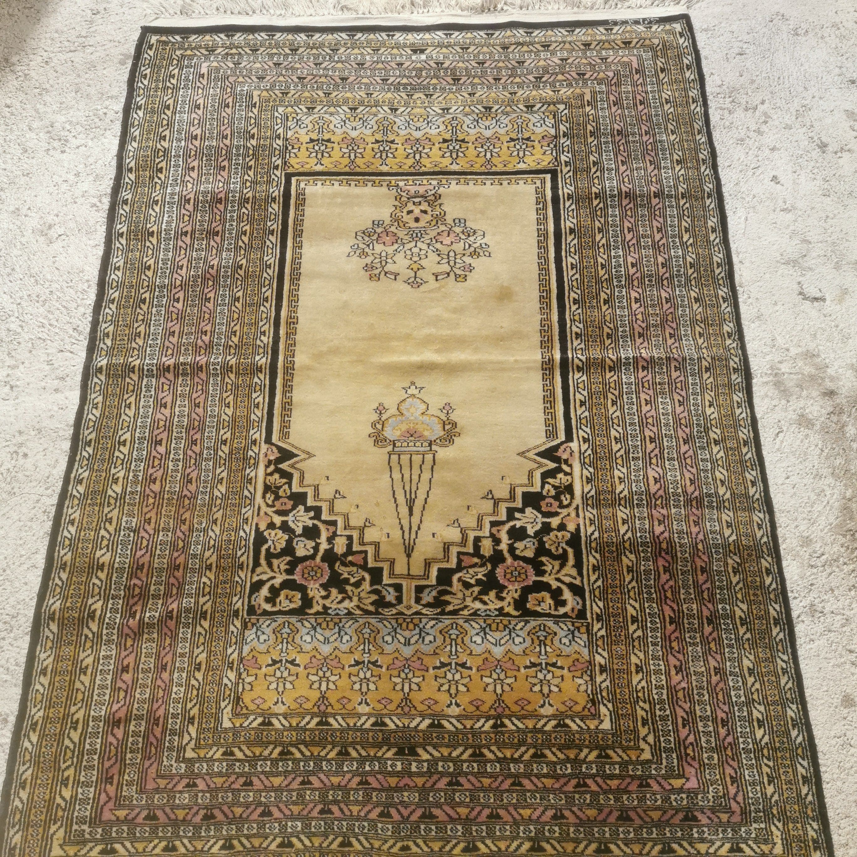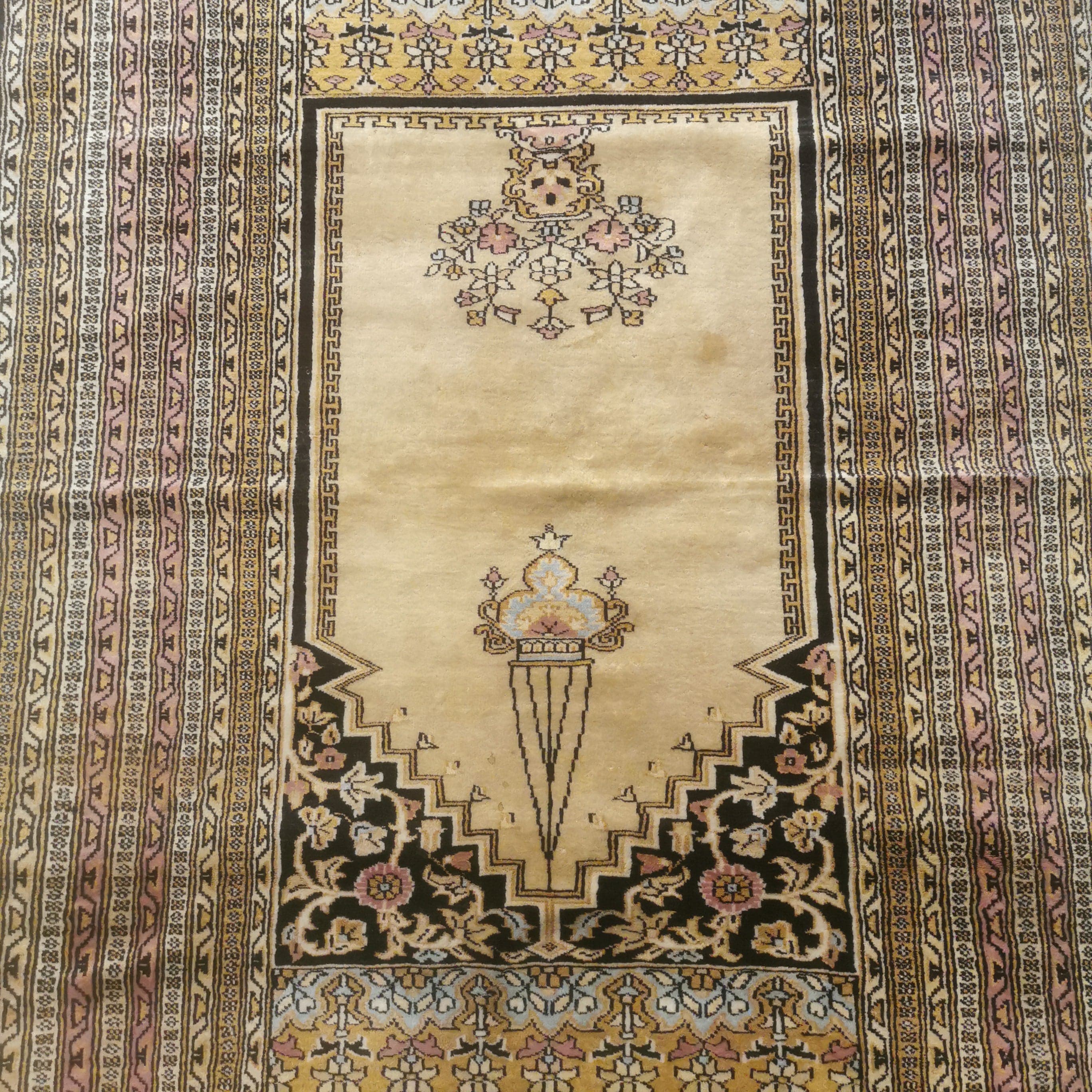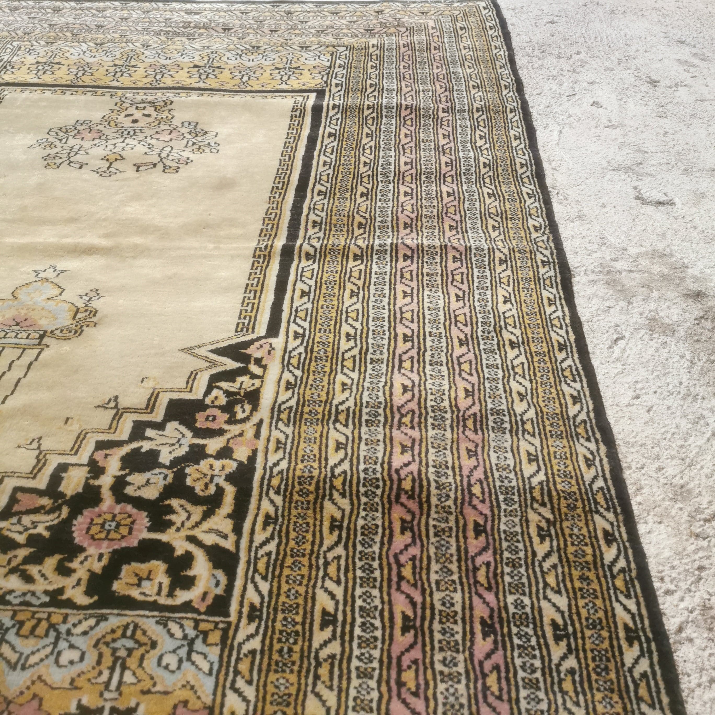 Magnifique tapis de prière pakistanais en laine et soie d'environ 60 ans.