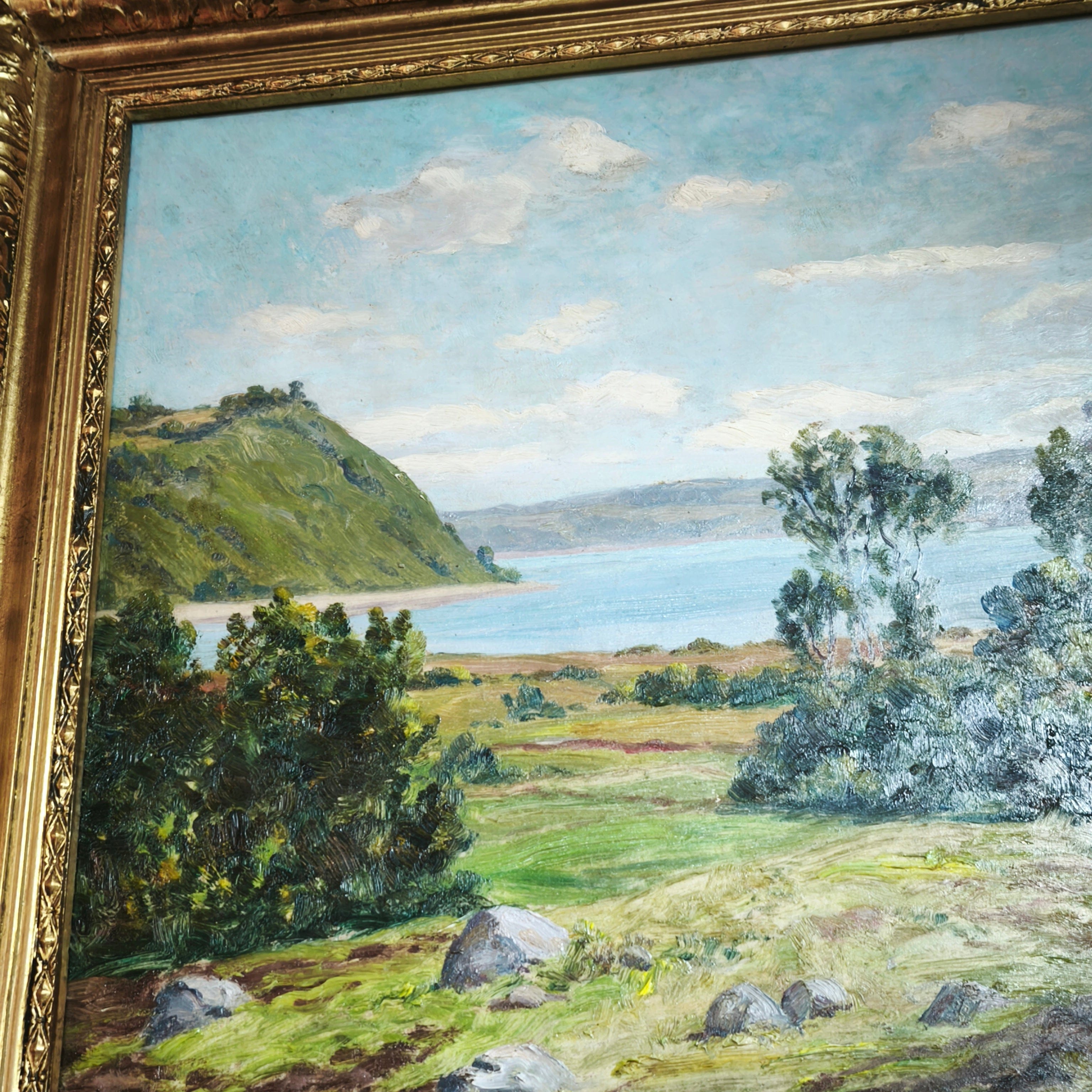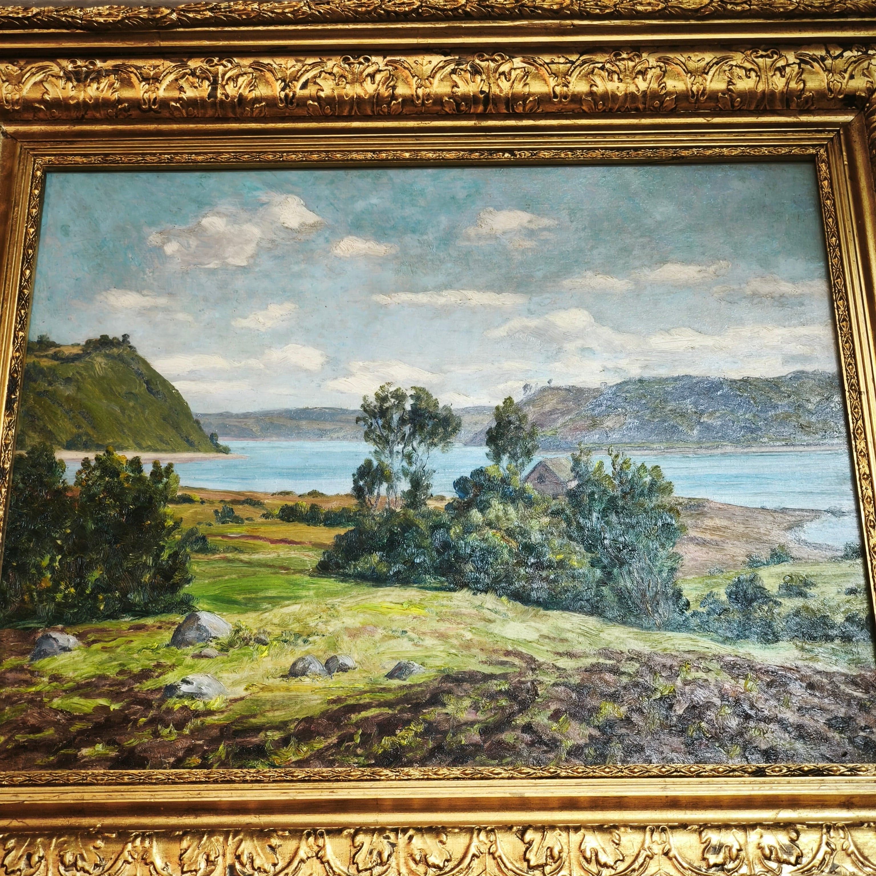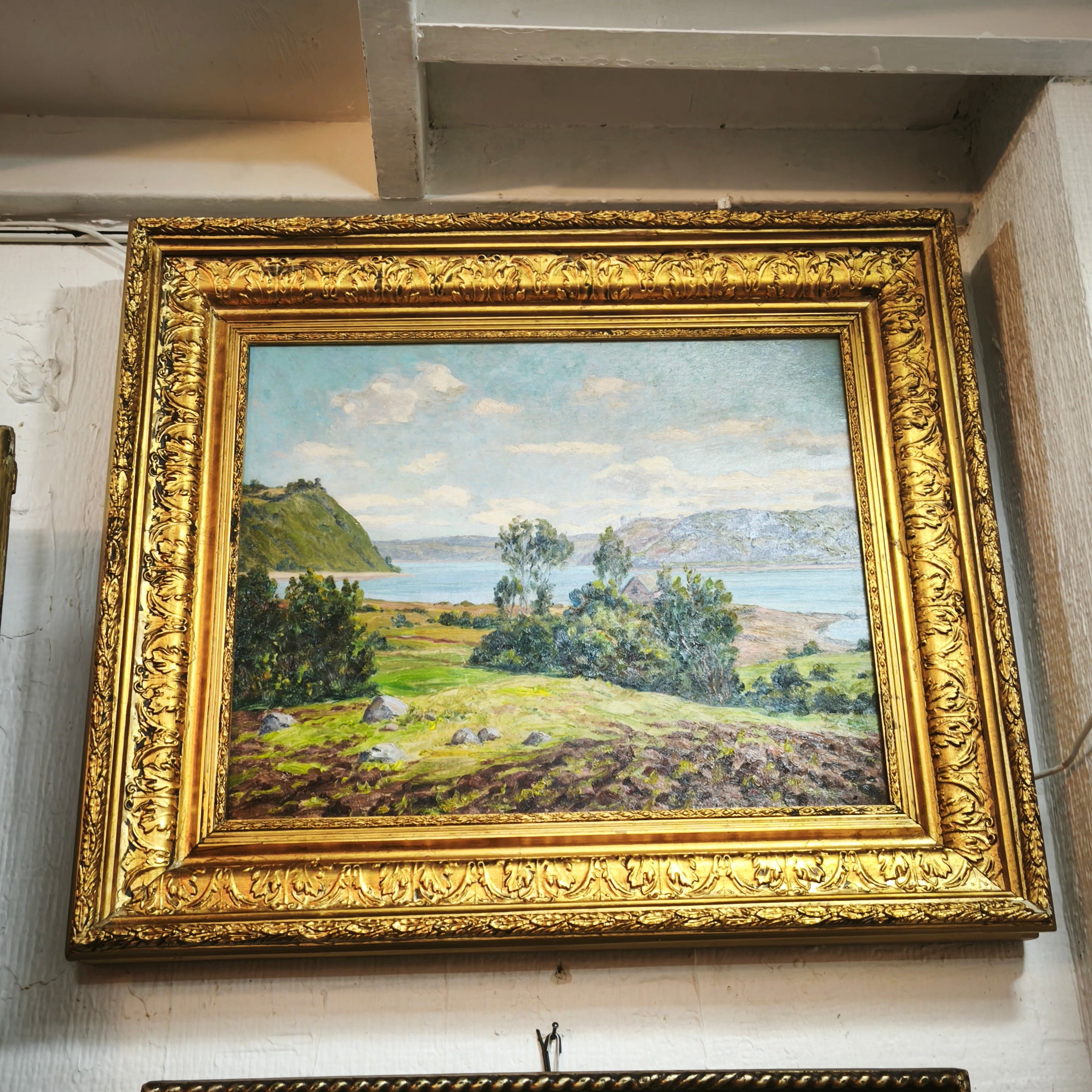 Huile sur bois représentant un paysage verdoyant, avec un lac vu du sommet d'une montagne. L'œuvre est encadrée dans un élégant cadre en bois sculpté en relief et peint en or.