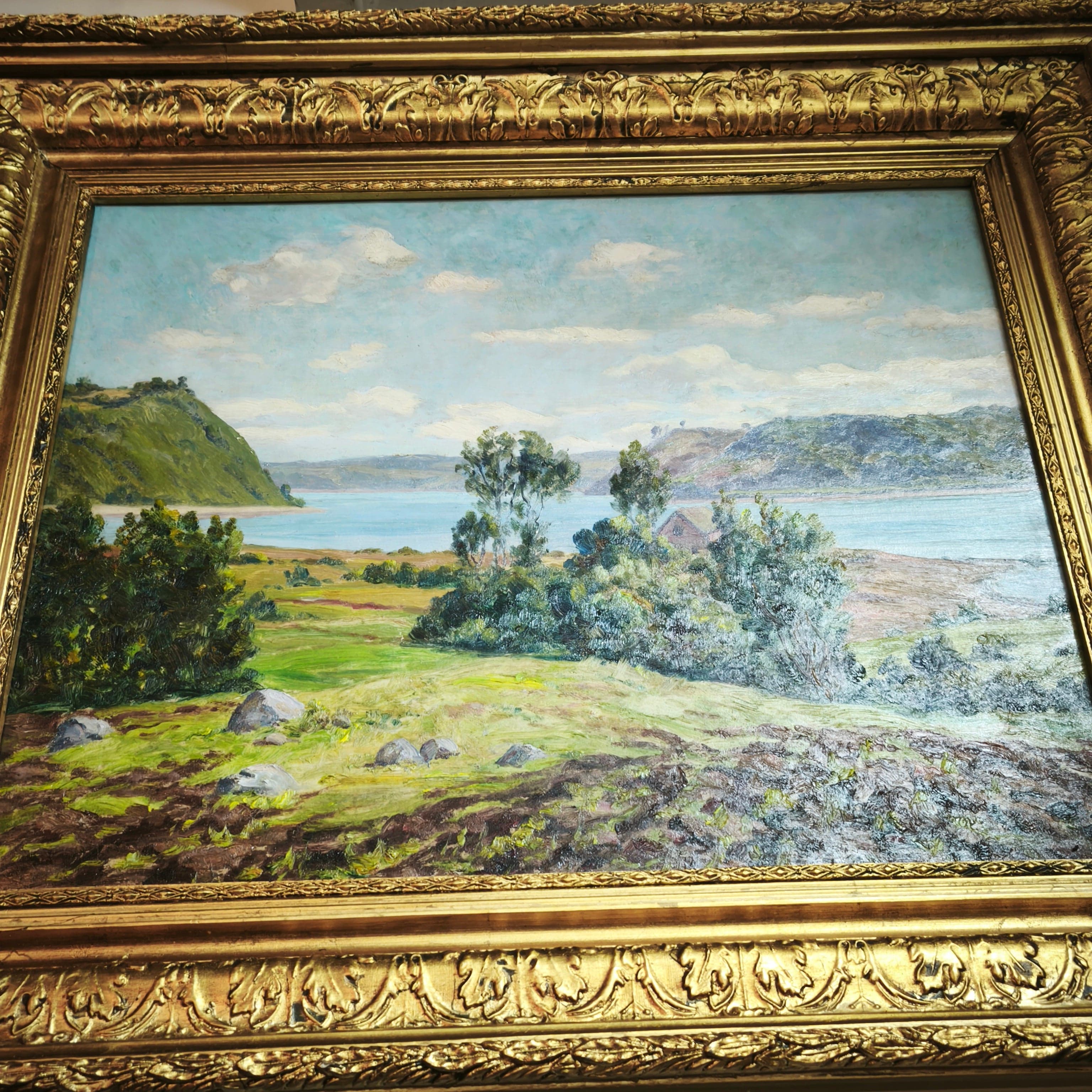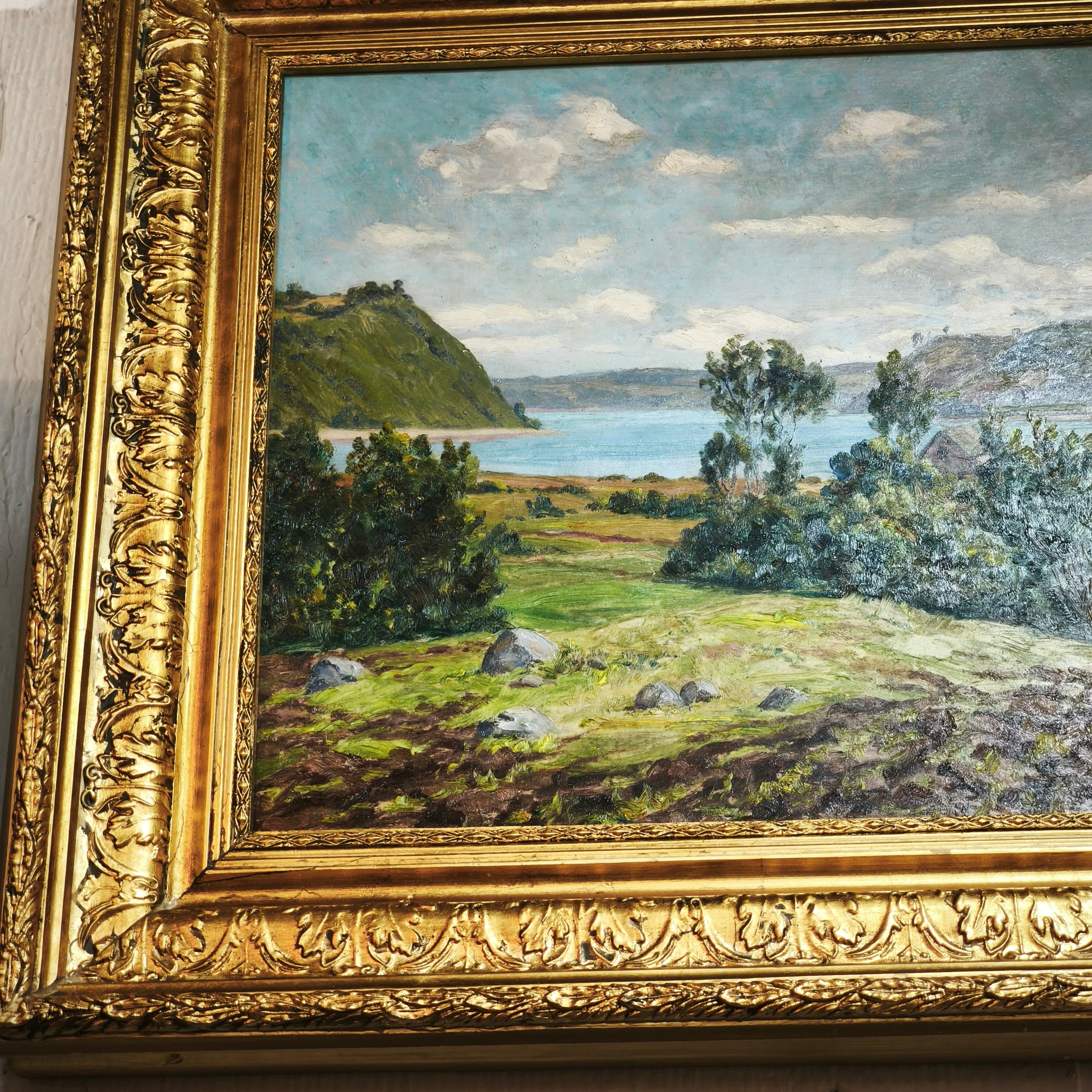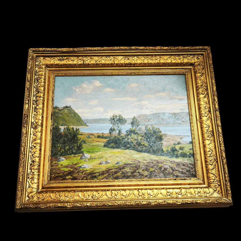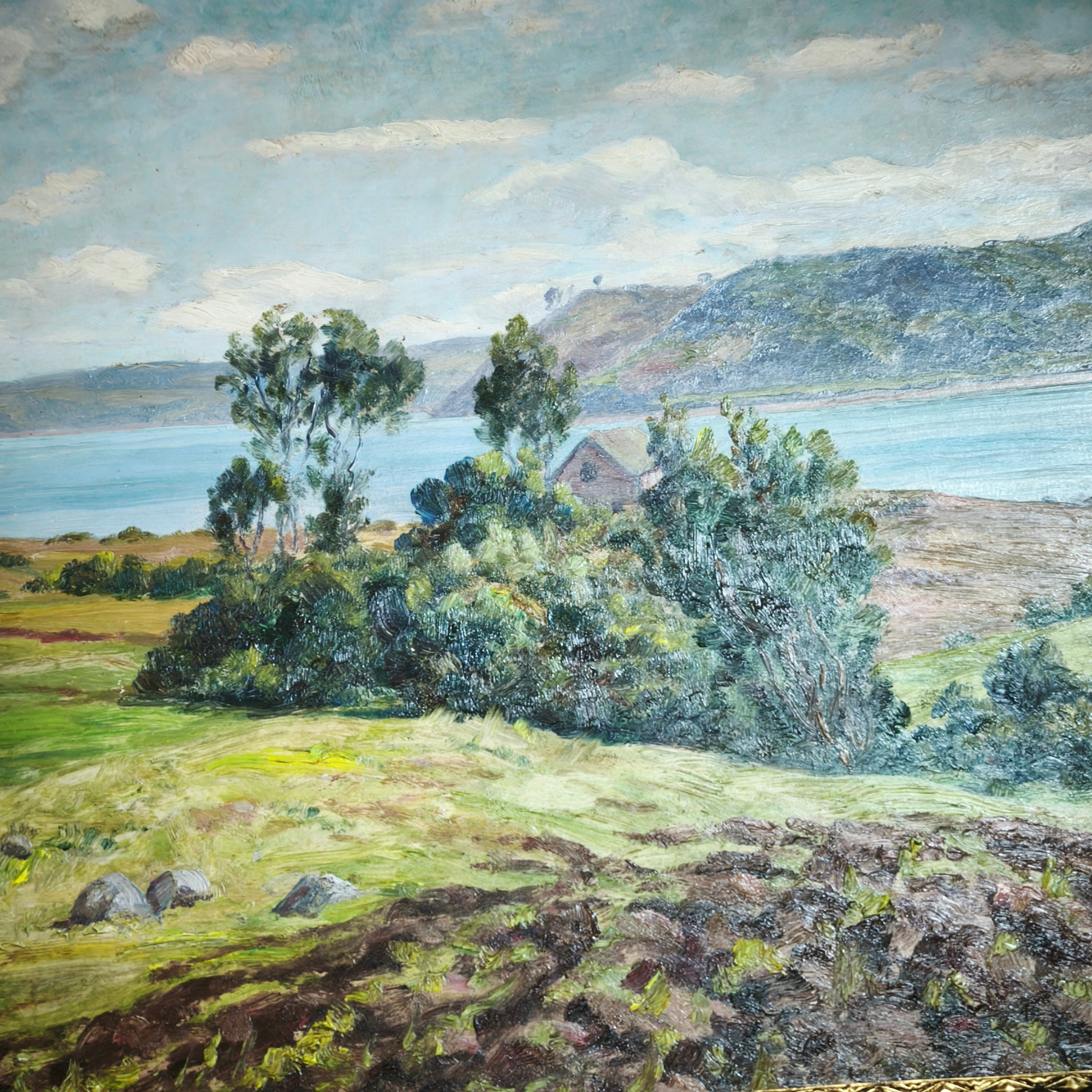 Huile sur bois représentant un paysage verdoyant, avec un lac vu du sommet d'une montagne. L'œuvre est encadrée dans un élégant cadre en bois sculpté en relief et peint en or.