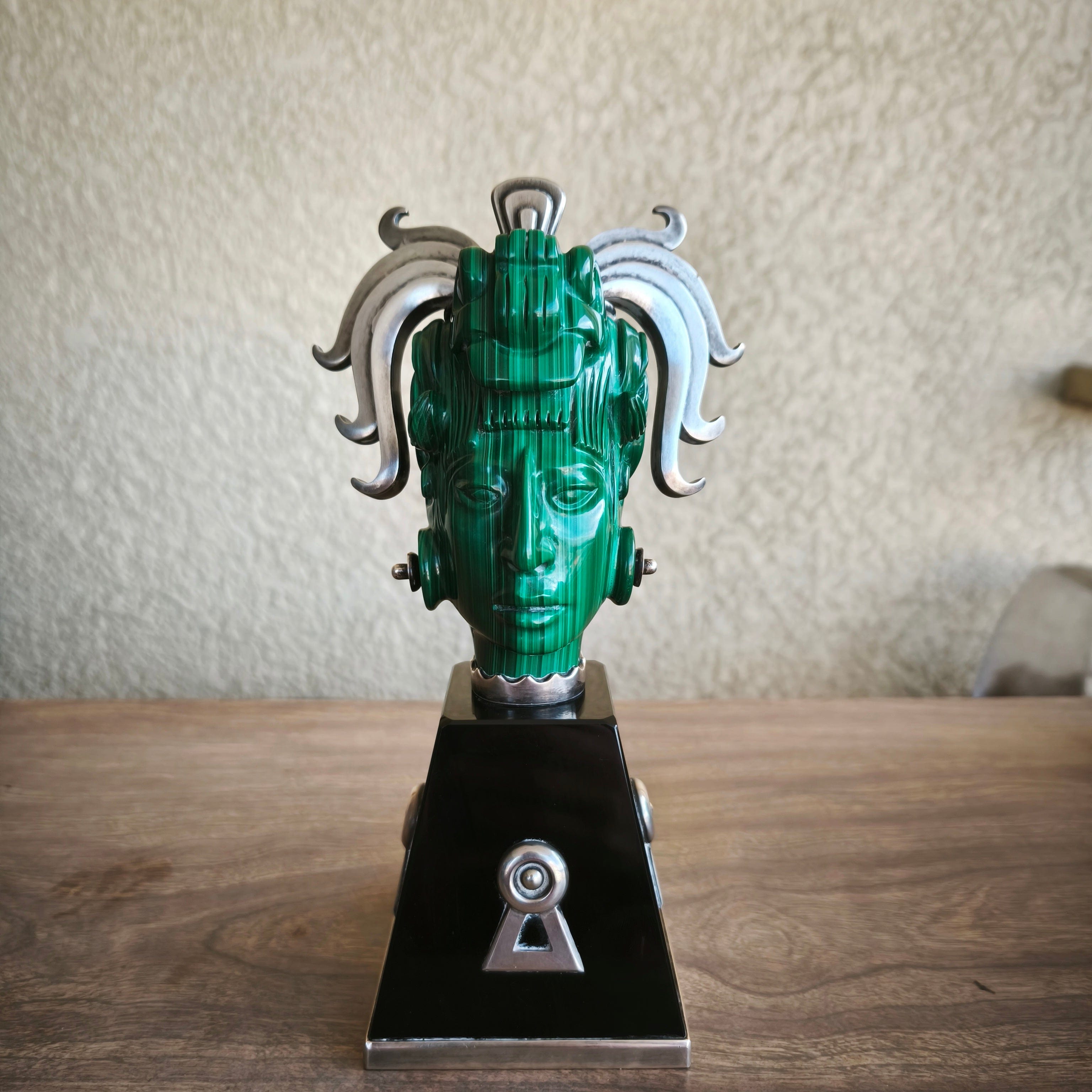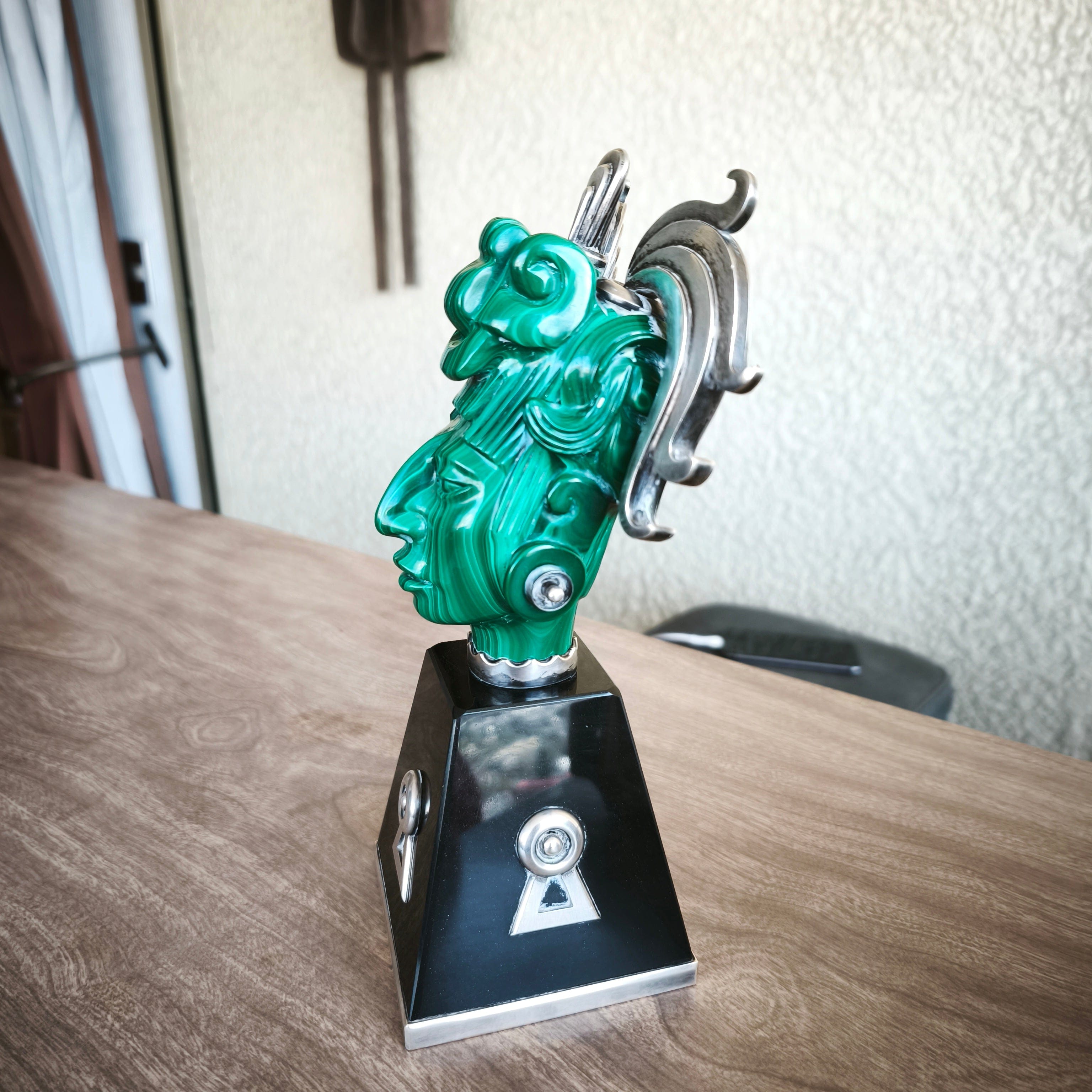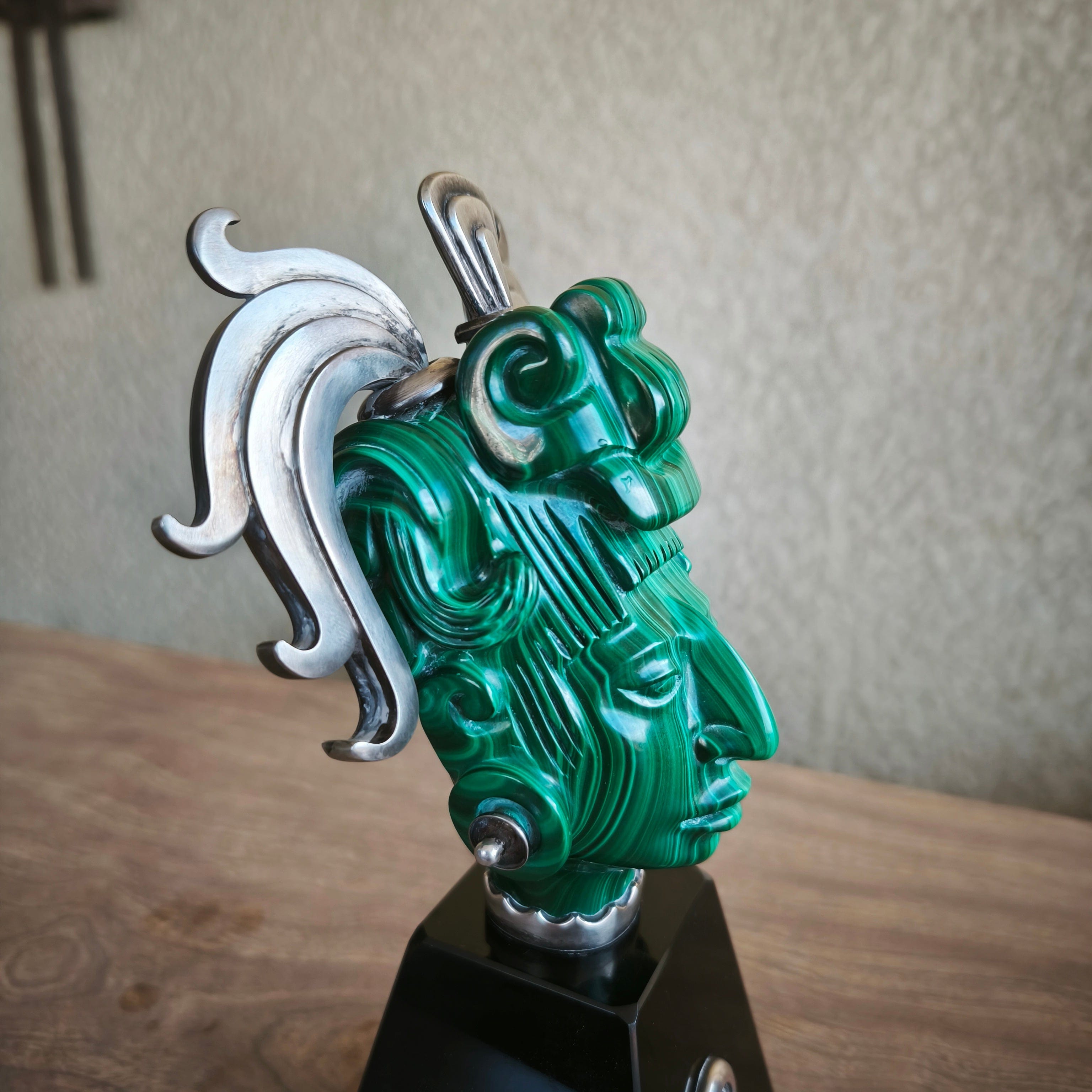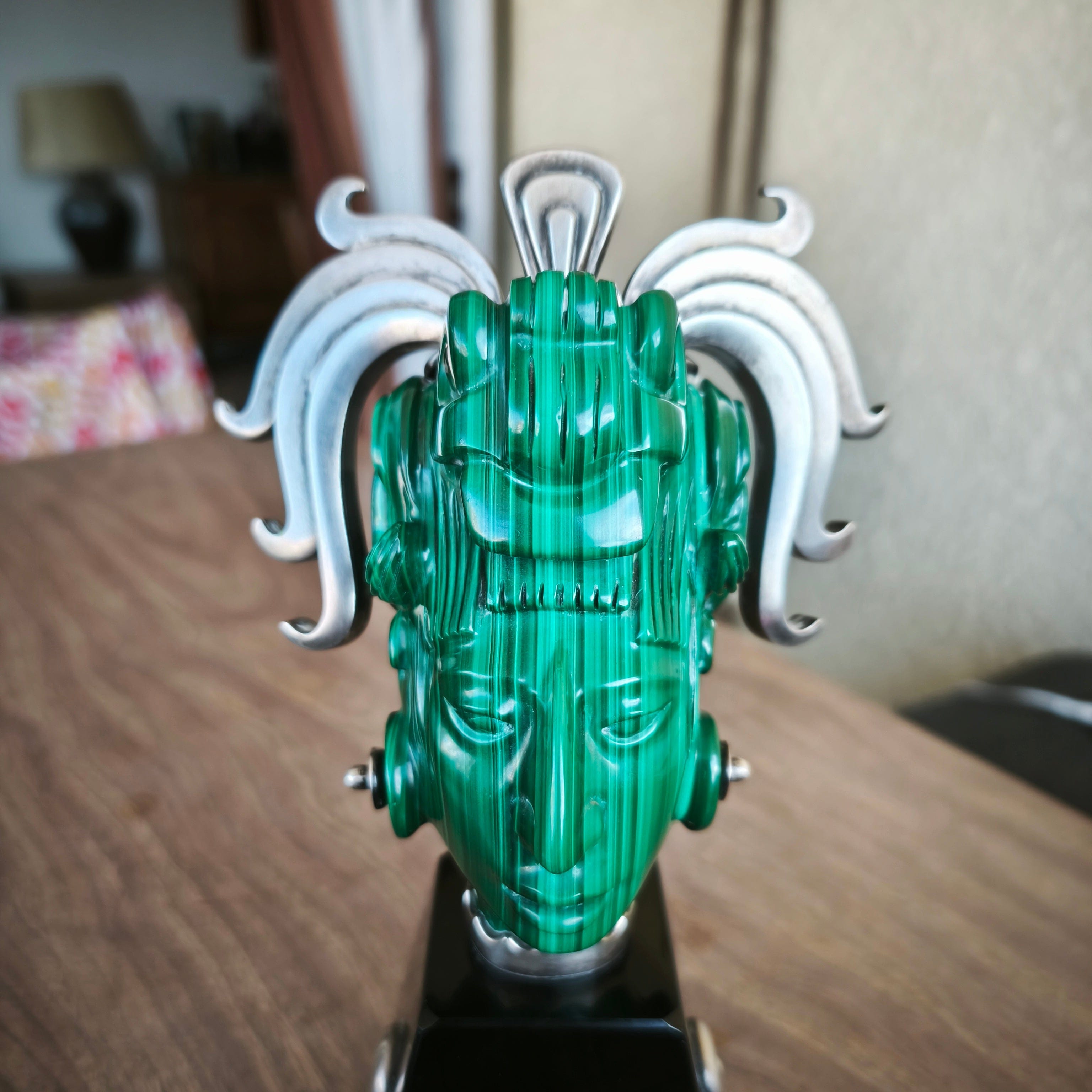 Tête maya en malachite avec ornements en argent 0,970 et base en obsidienne, par l'artiste Ezequiel Tapia, designer en chef de la société EXELTAPIA dans la ville de Taxco.