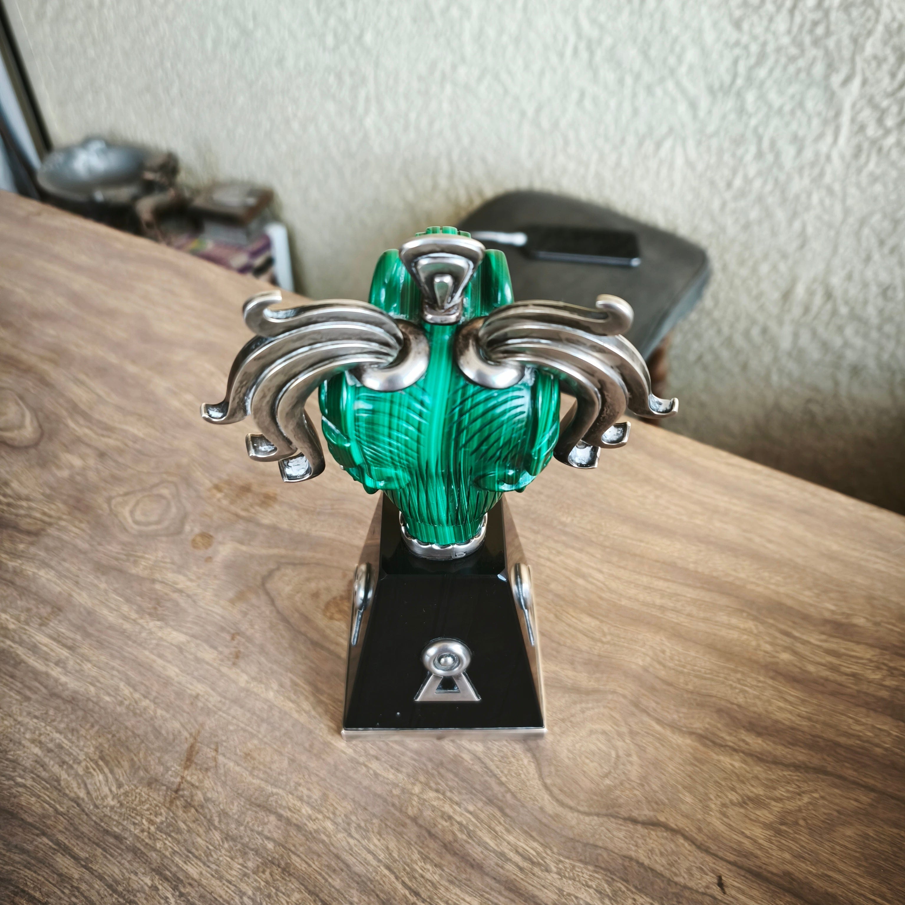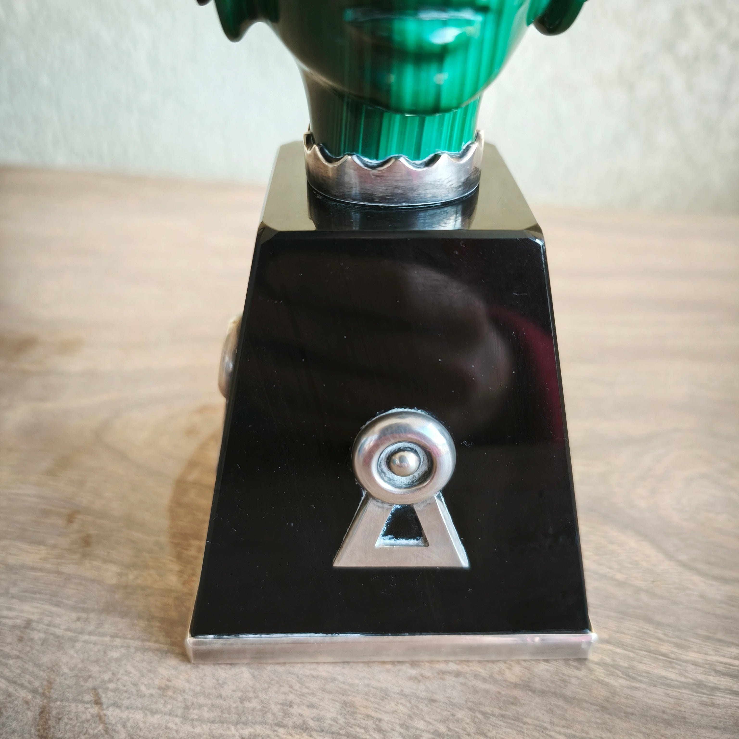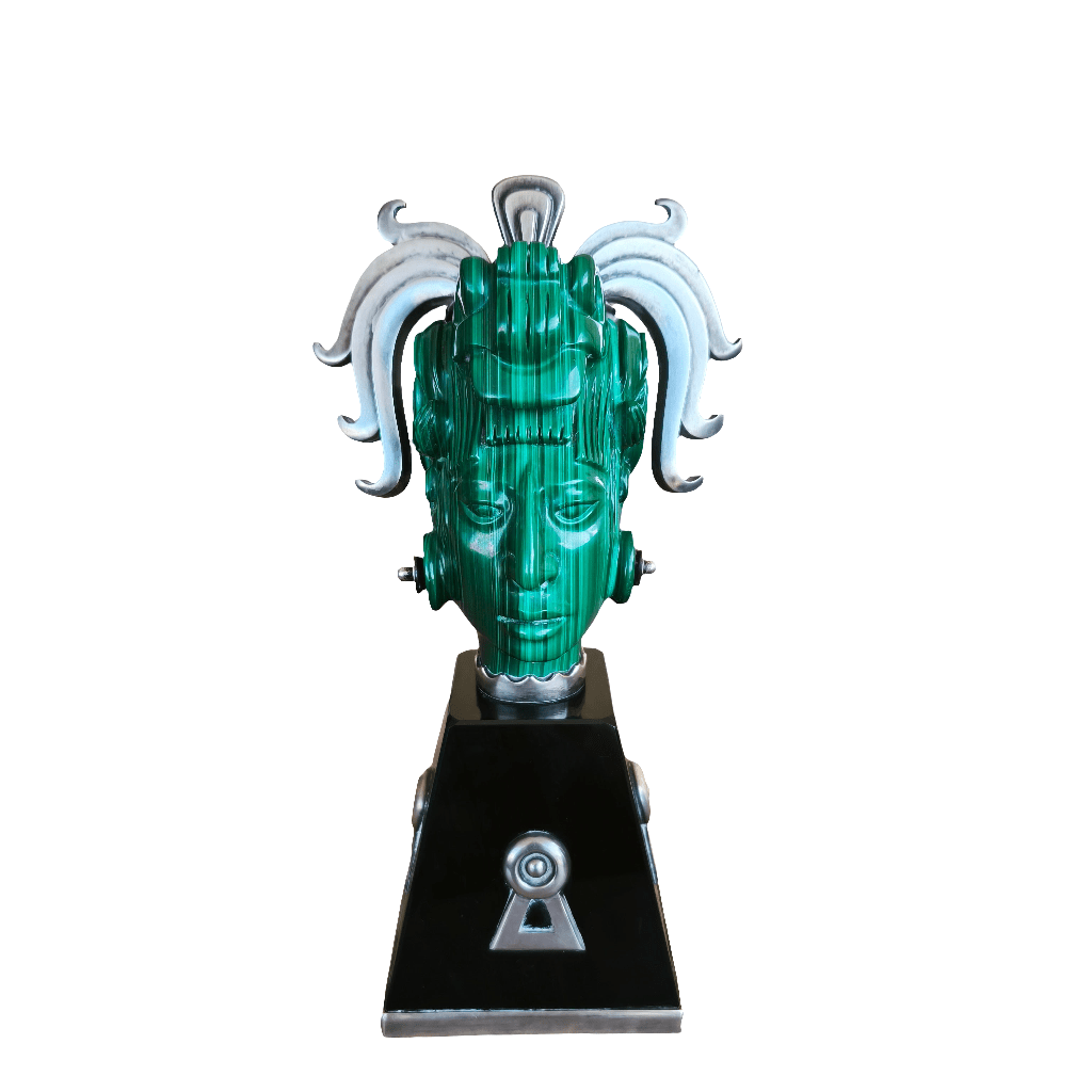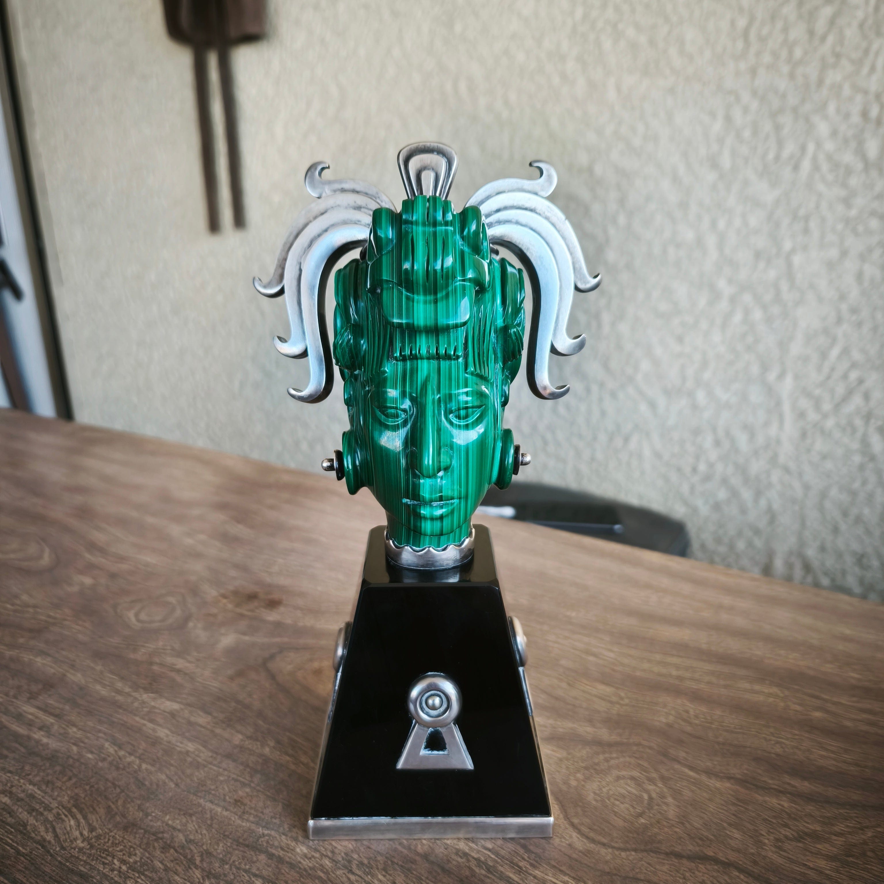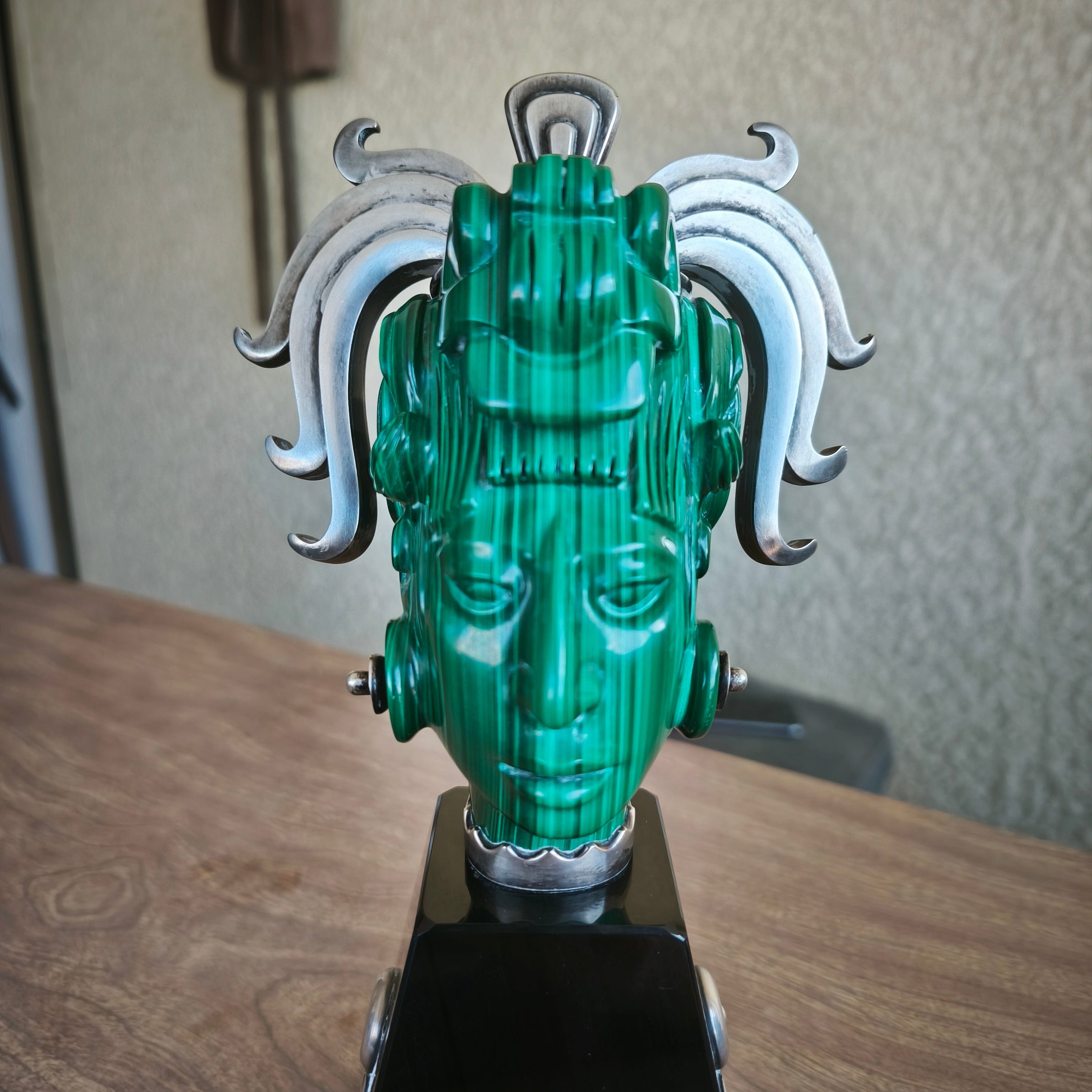 Tête maya en malachite avec ornements en argent 0,970 et base en obsidienne, par l'artiste Ezequiel Tapia, designer en chef de la société EXELTAPIA dans la ville de Taxco.