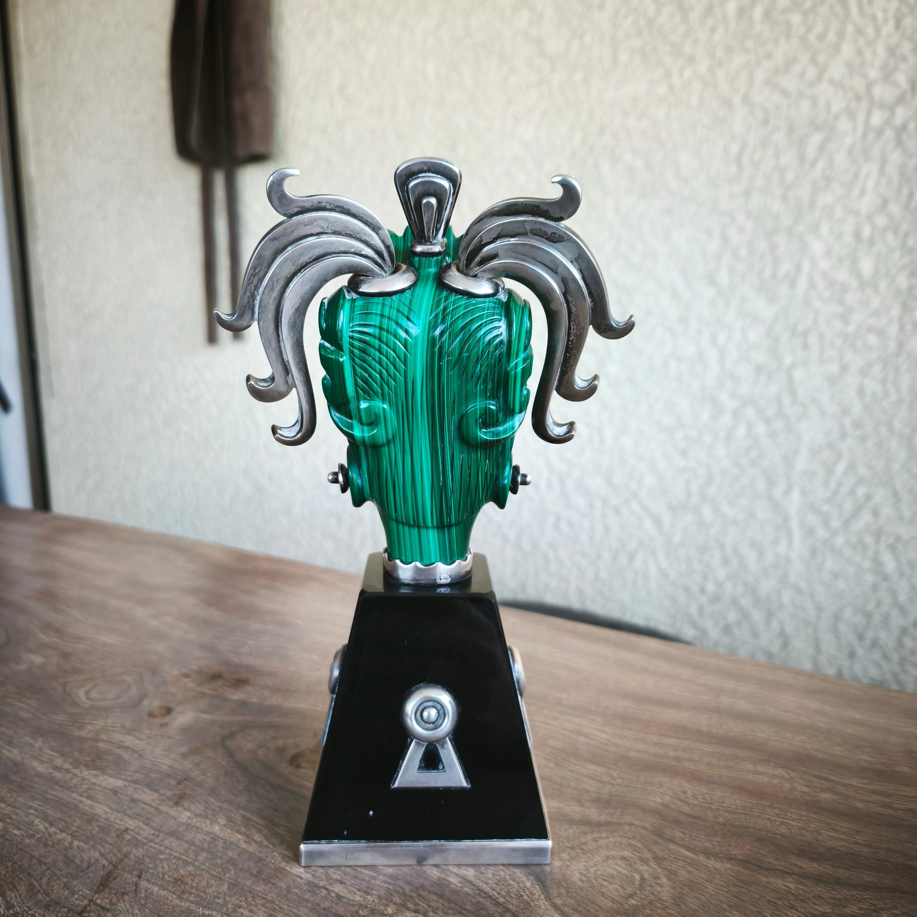 Tête maya mexicaine, pierre de malachite, base en obsidienne argentée, Ezequiel Tapia