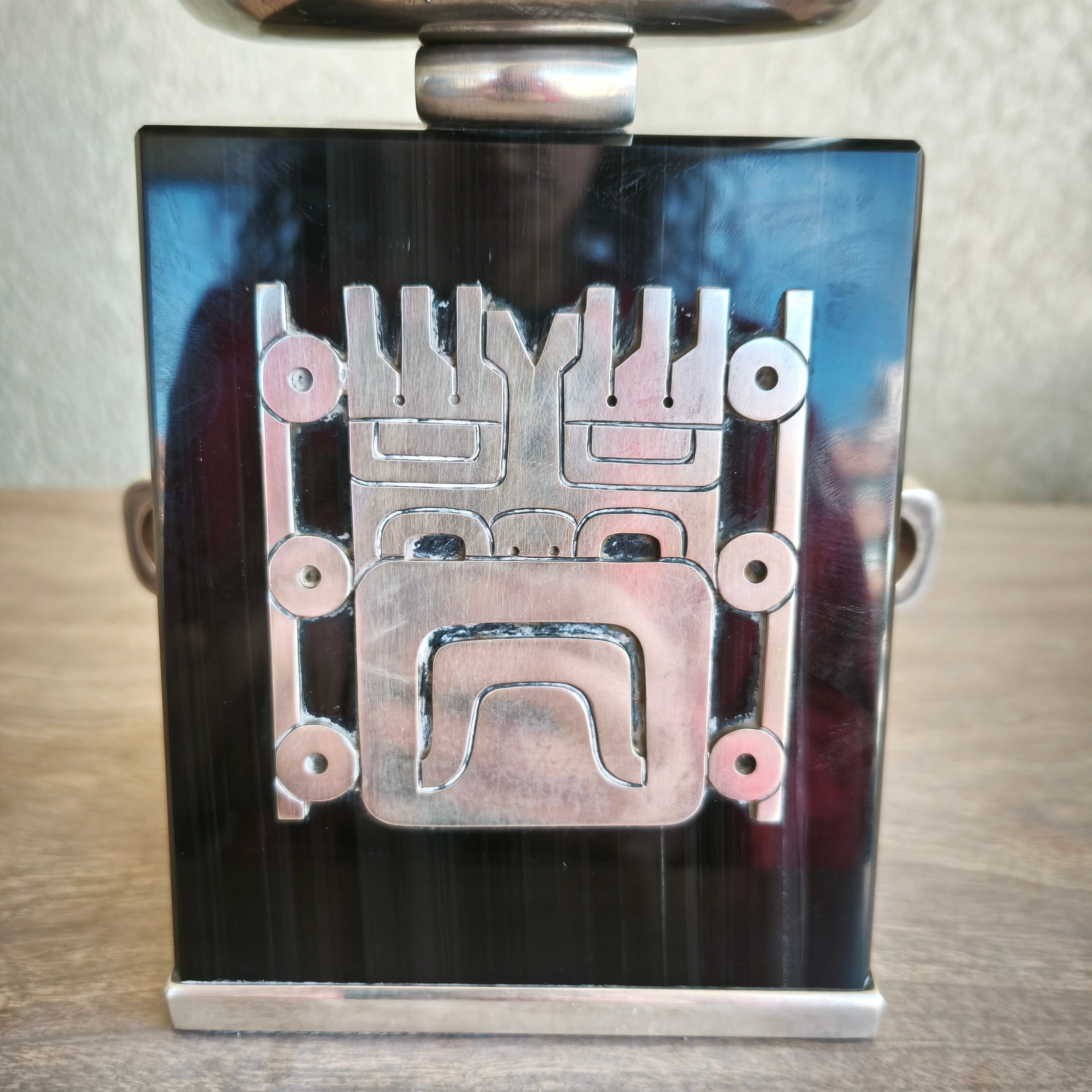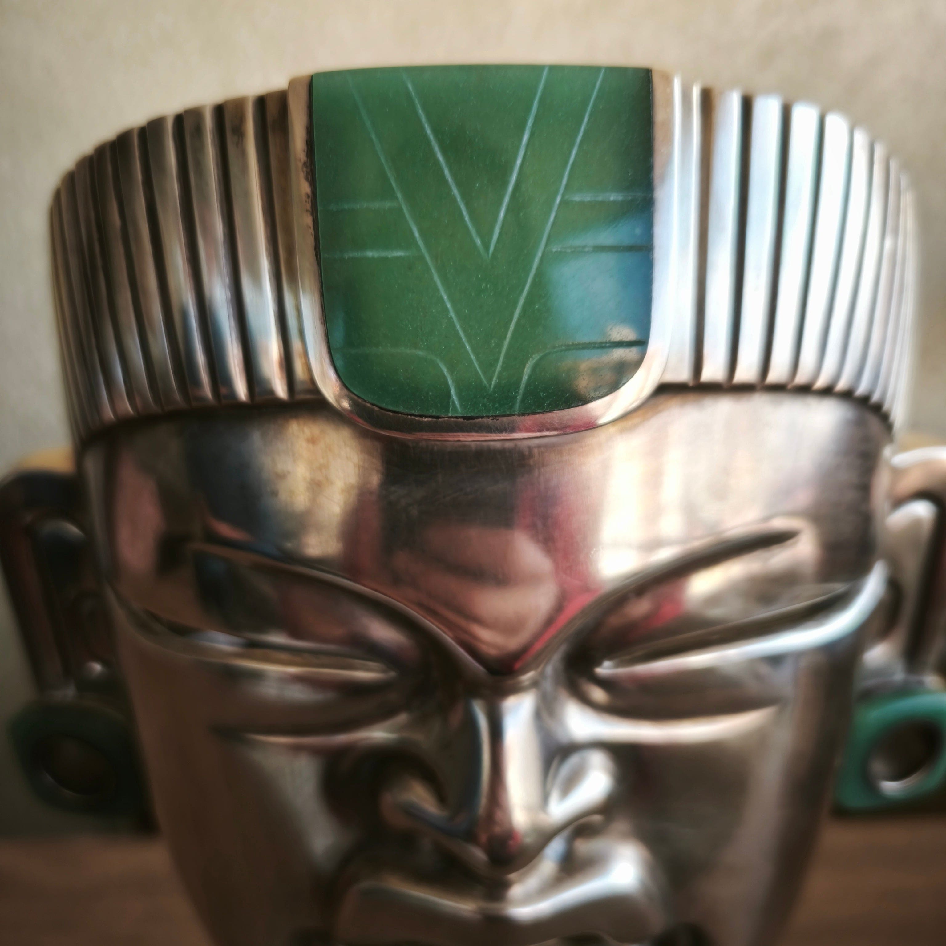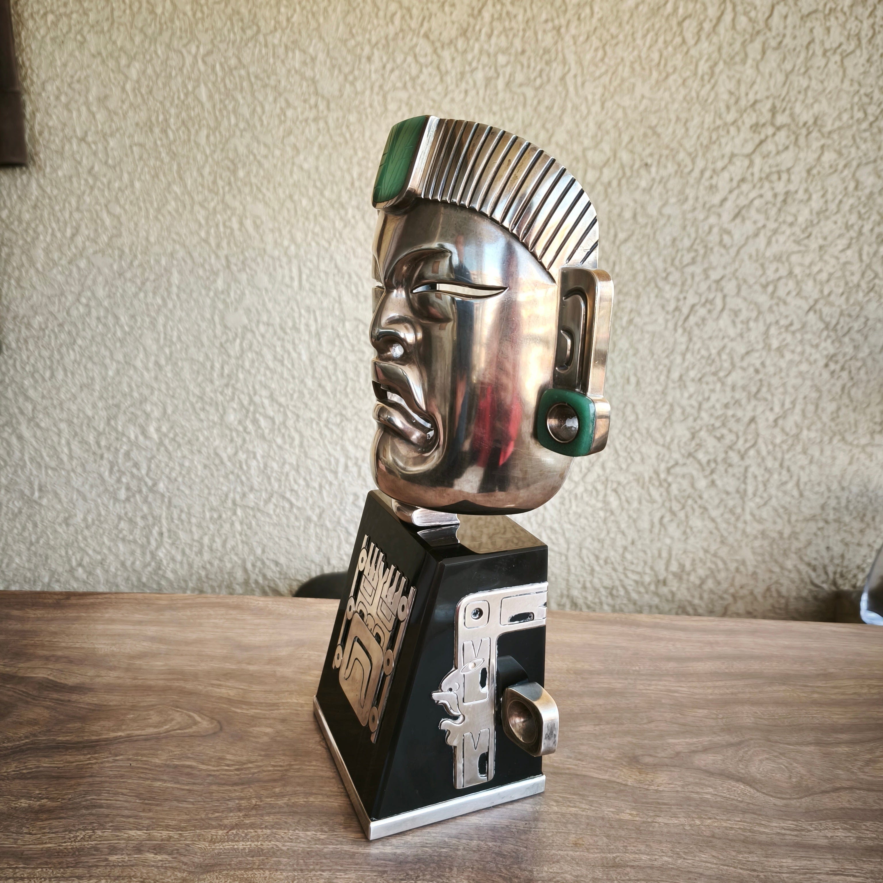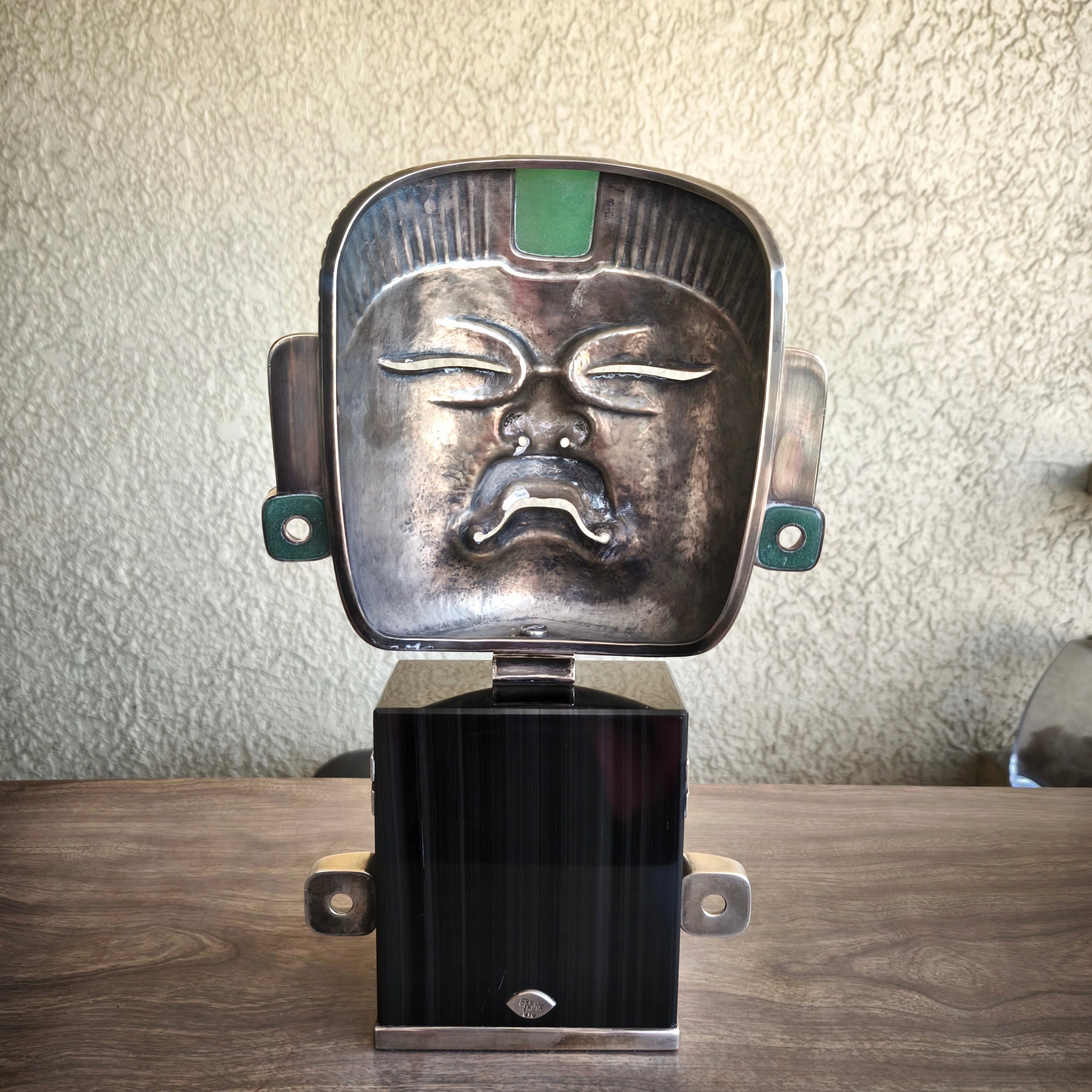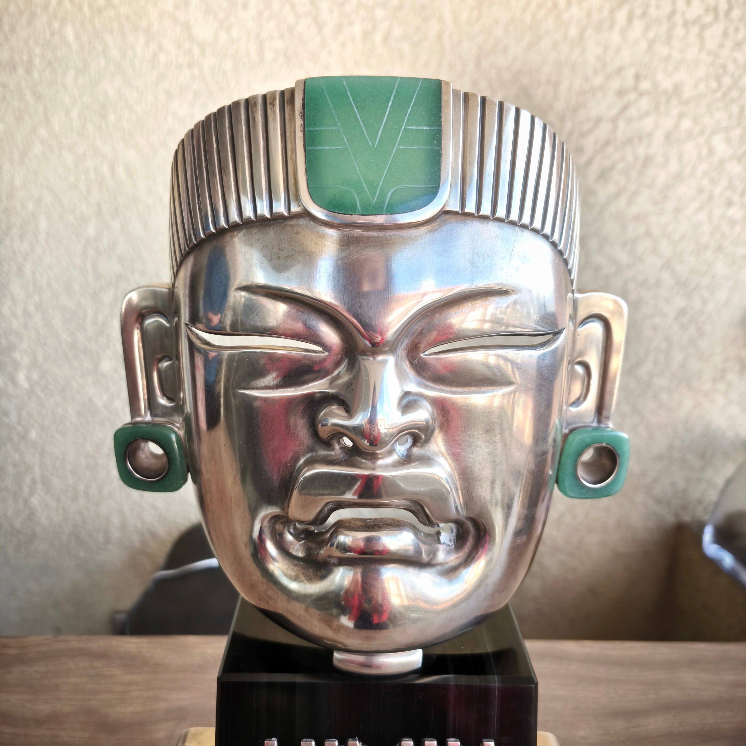 Masque olmèque en argent 970, base en obsidienne. Par l'artiste Ezequiel Tapia, designer en chef de la société EXELTAPIA à Taxco.