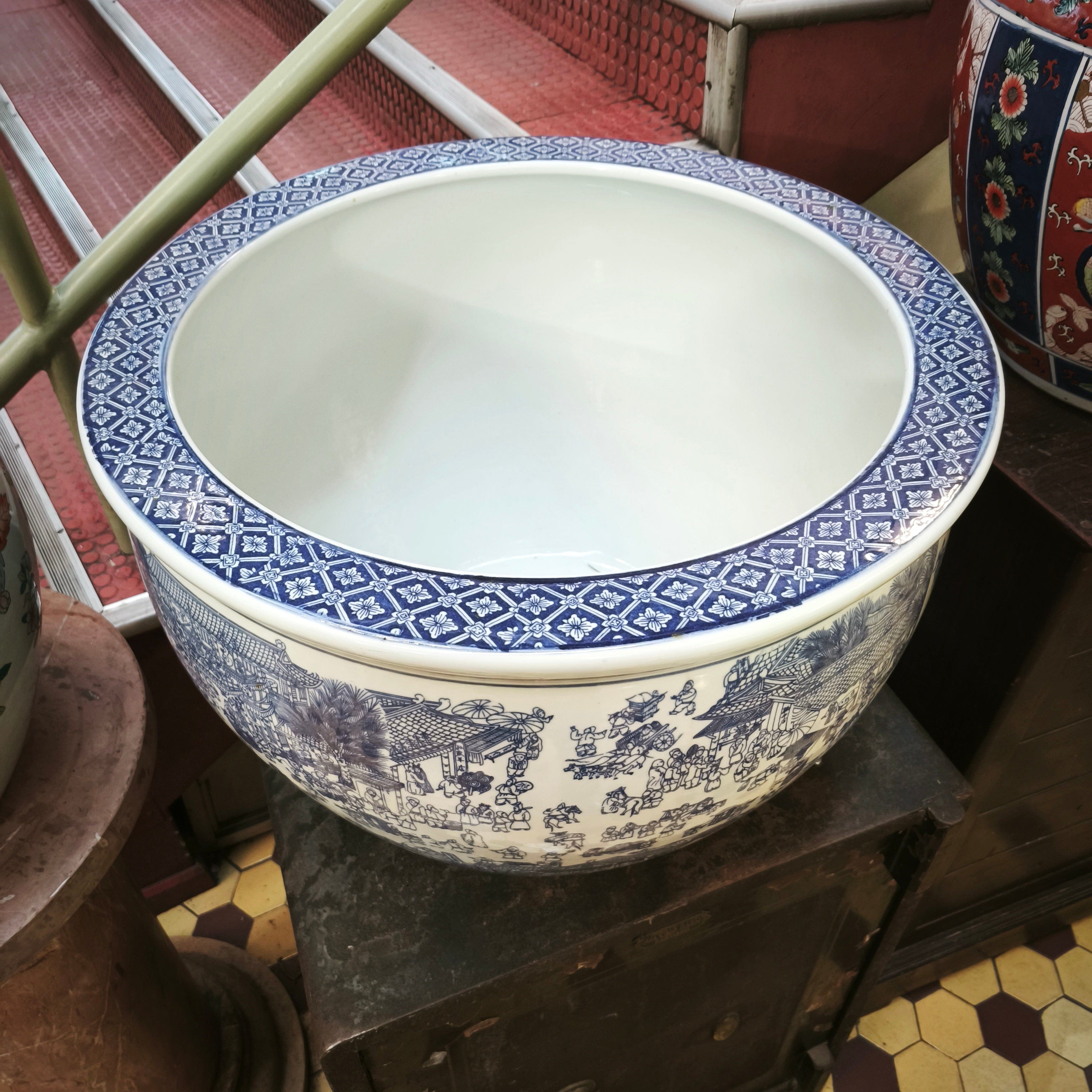Grand aquarium en porcelaine chinoise blanche et bleue peinte à la main