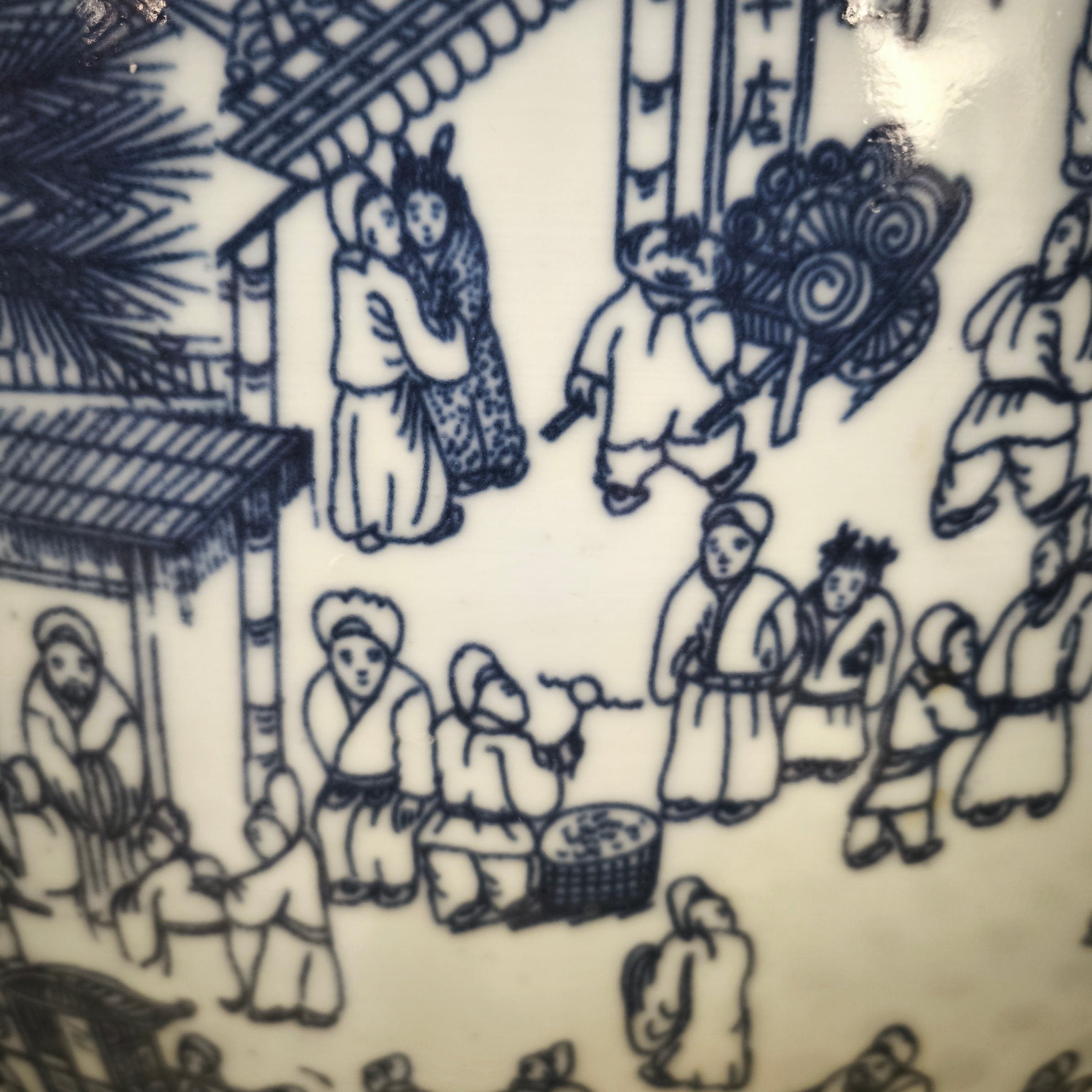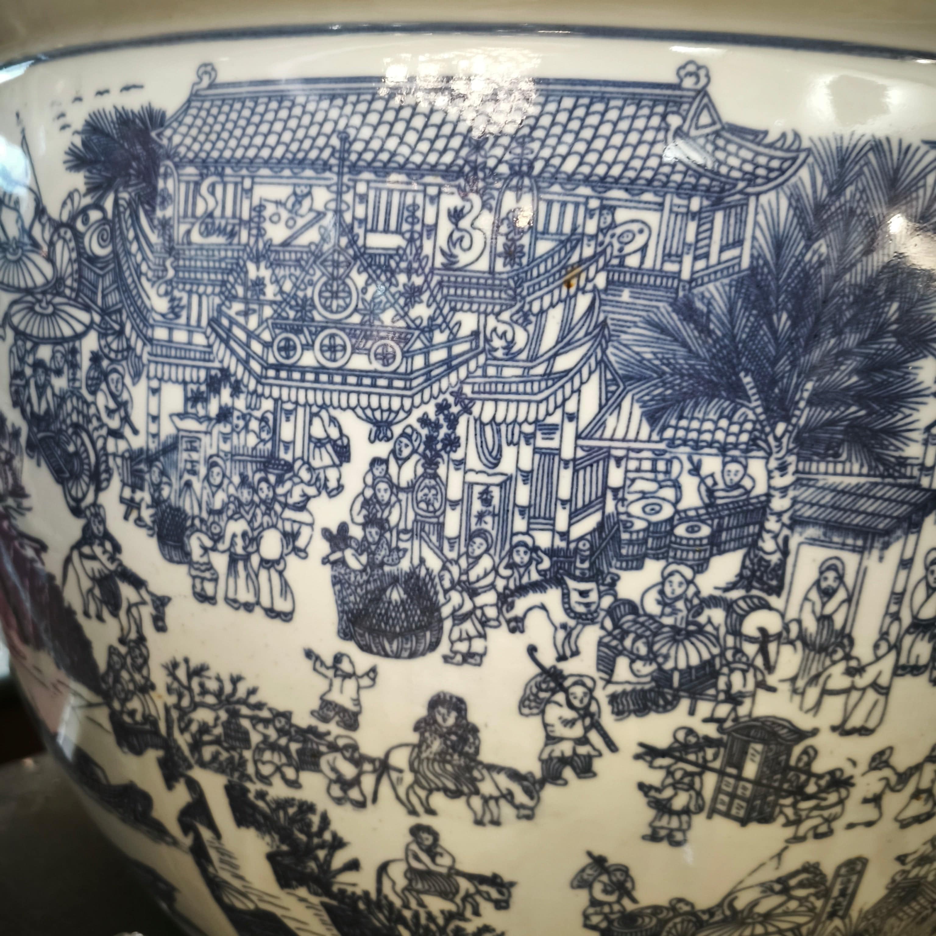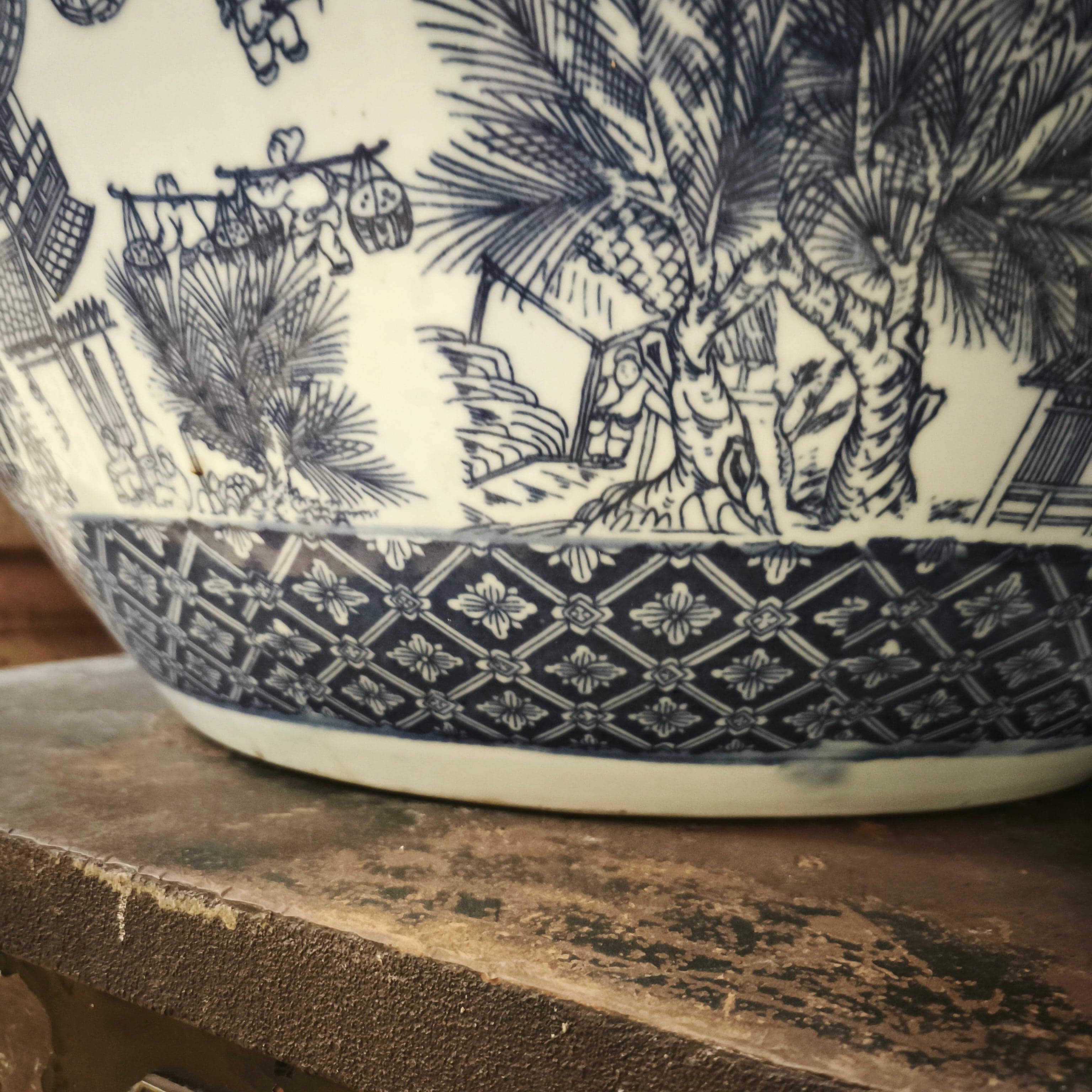Un grand bocal à poisson en porcelaine chinoise, finement peint à la main dans la couleur bleue traditionnelle de la porcelaine chinoise, représente un centre de village avec des personnages et des bâtiments typiques de l'époque impériale sur toute sa surface. La pièce présente également une délicate bande peinte à la main sur le bord inférieur et le col, ornée d'un motif géométrique.