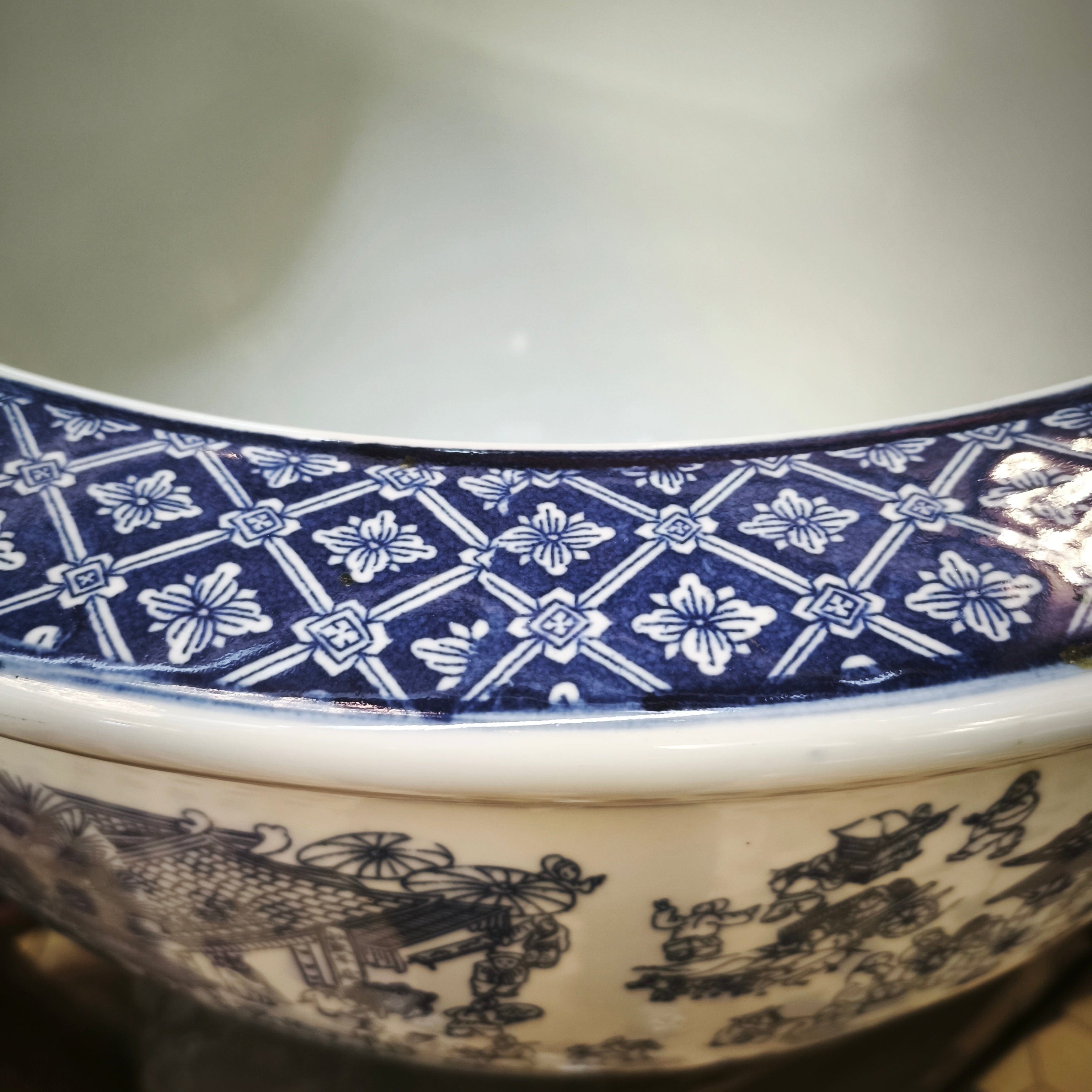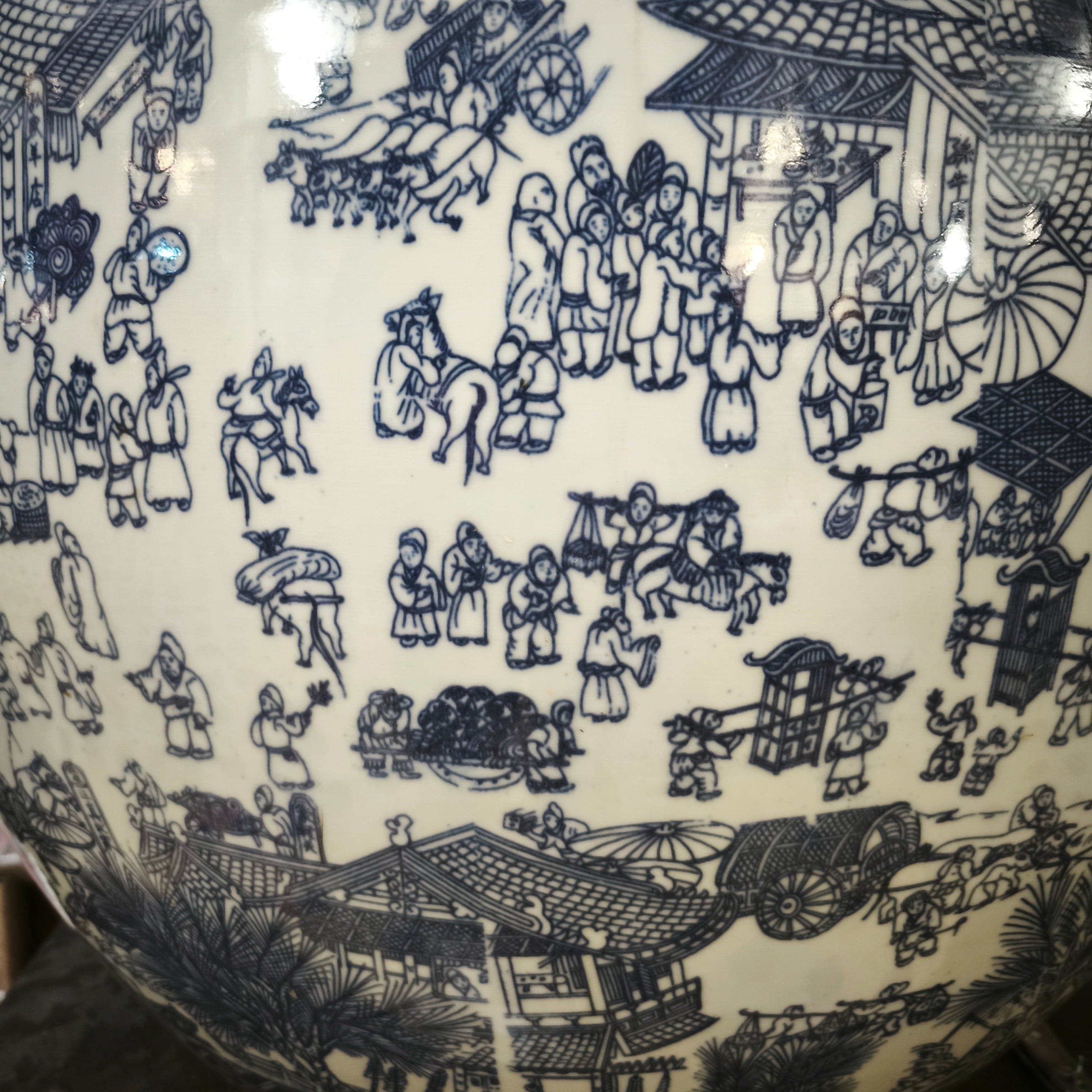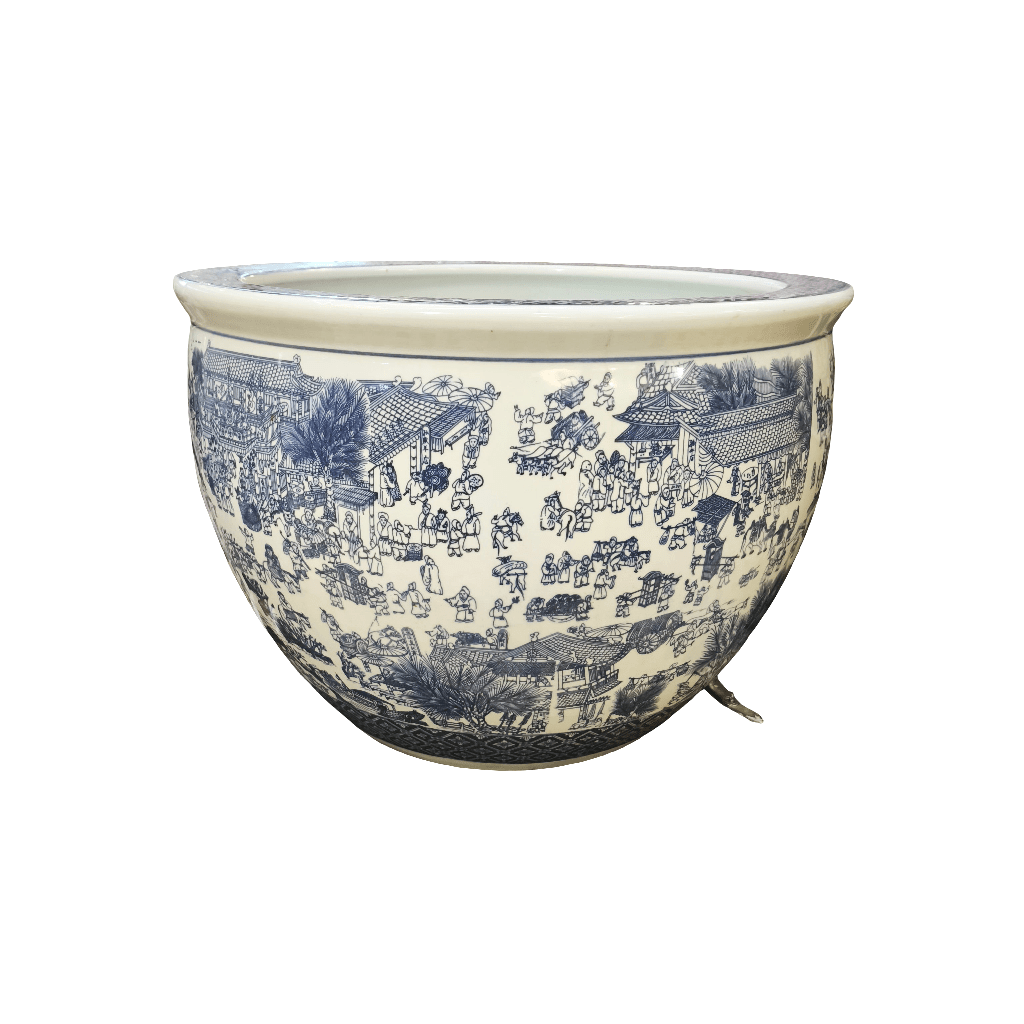 Un grand bocal à poisson en porcelaine chinoise, finement peint à la main dans la couleur bleue traditionnelle de la porcelaine chinoise, représente un centre de village avec des personnages et des bâtiments typiques de l'époque impériale sur toute sa surface. La pièce présente également une délicate bande peinte à la main sur le bord inférieur et le col, ornée d'un motif géométrique.
