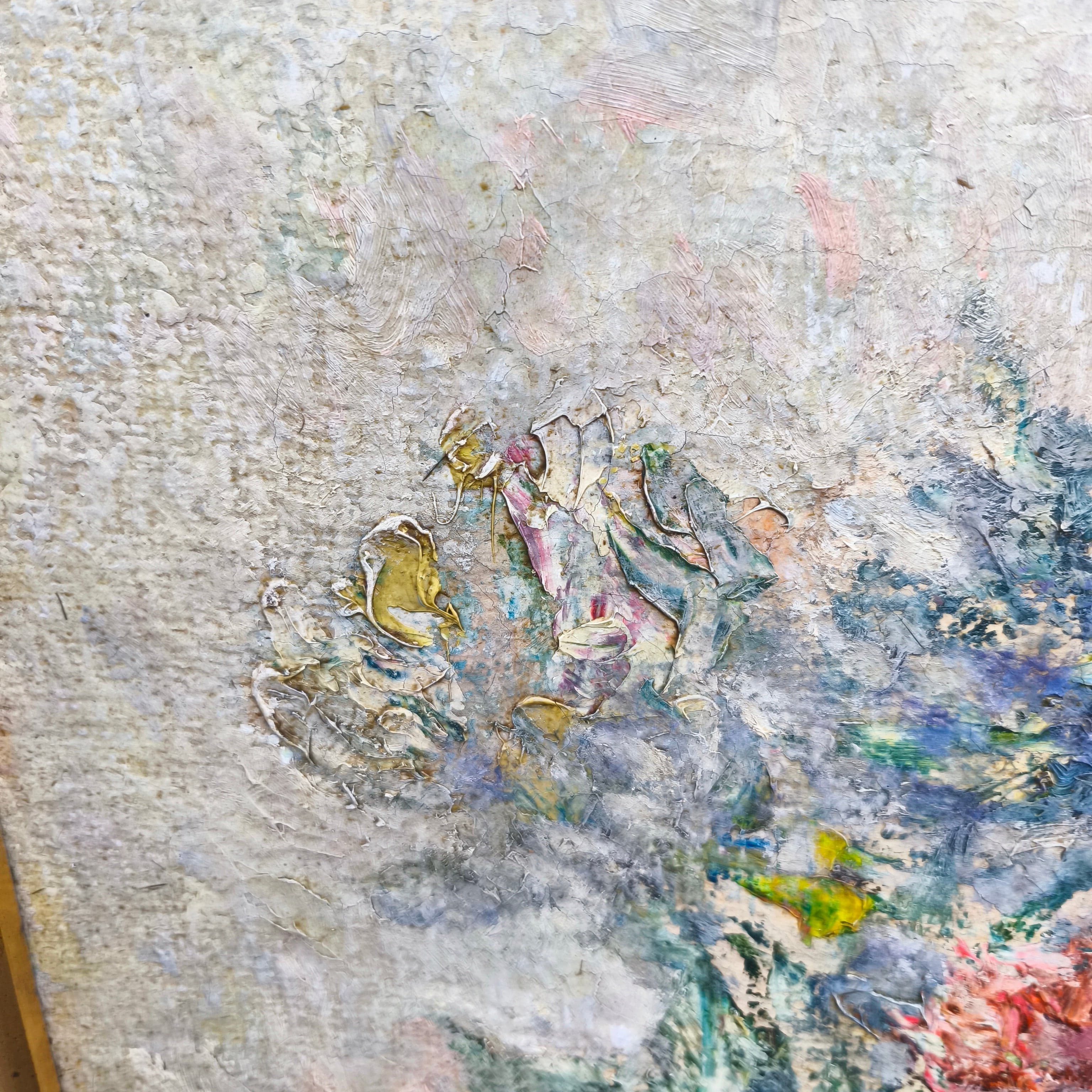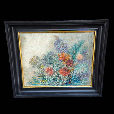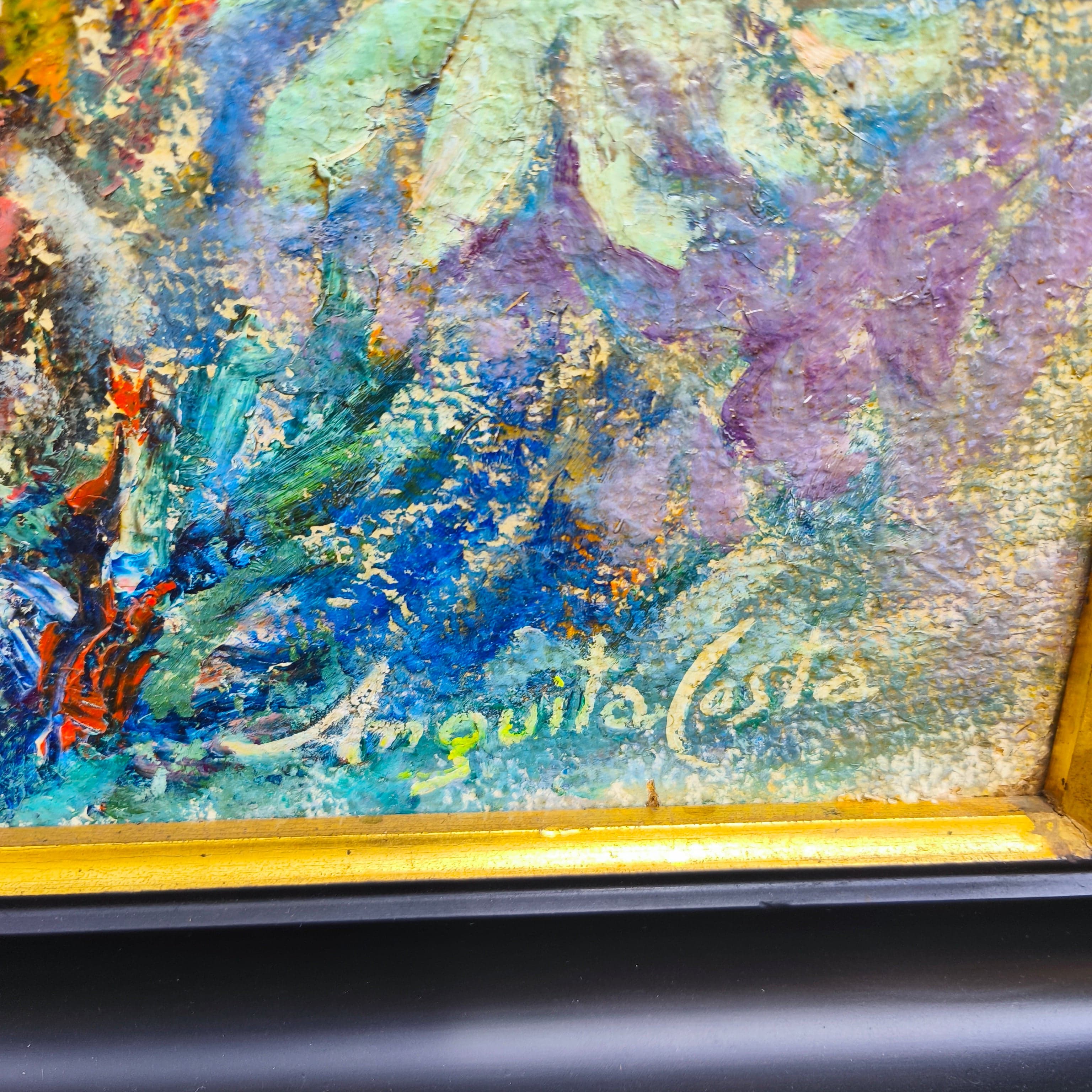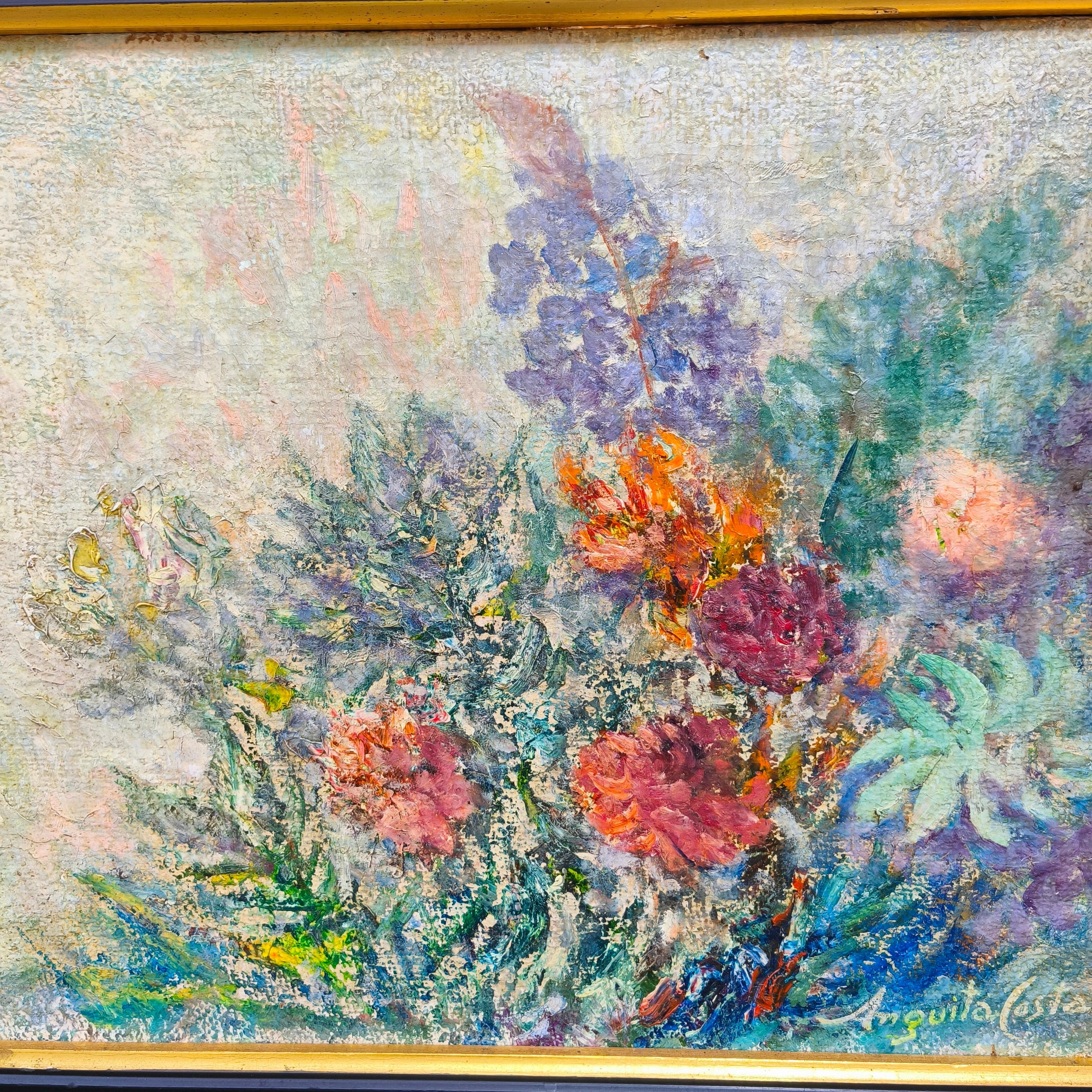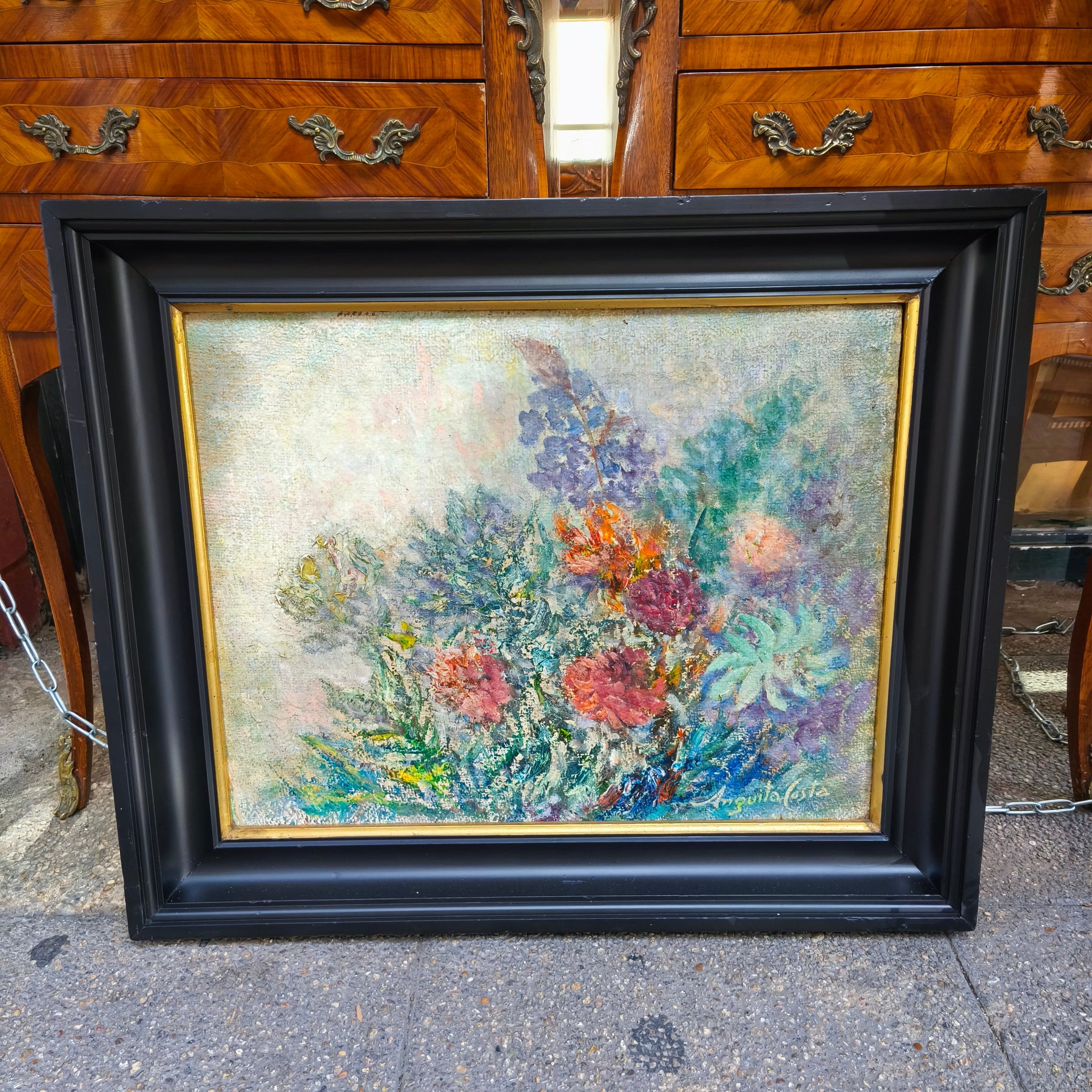 Cette huile sur toile d'Anguita Costa représente diverses fleurs aux tons délicats et texturés. L'œuvre est encadrée dans un bois peint en noir avec une élégante bordure dorée.