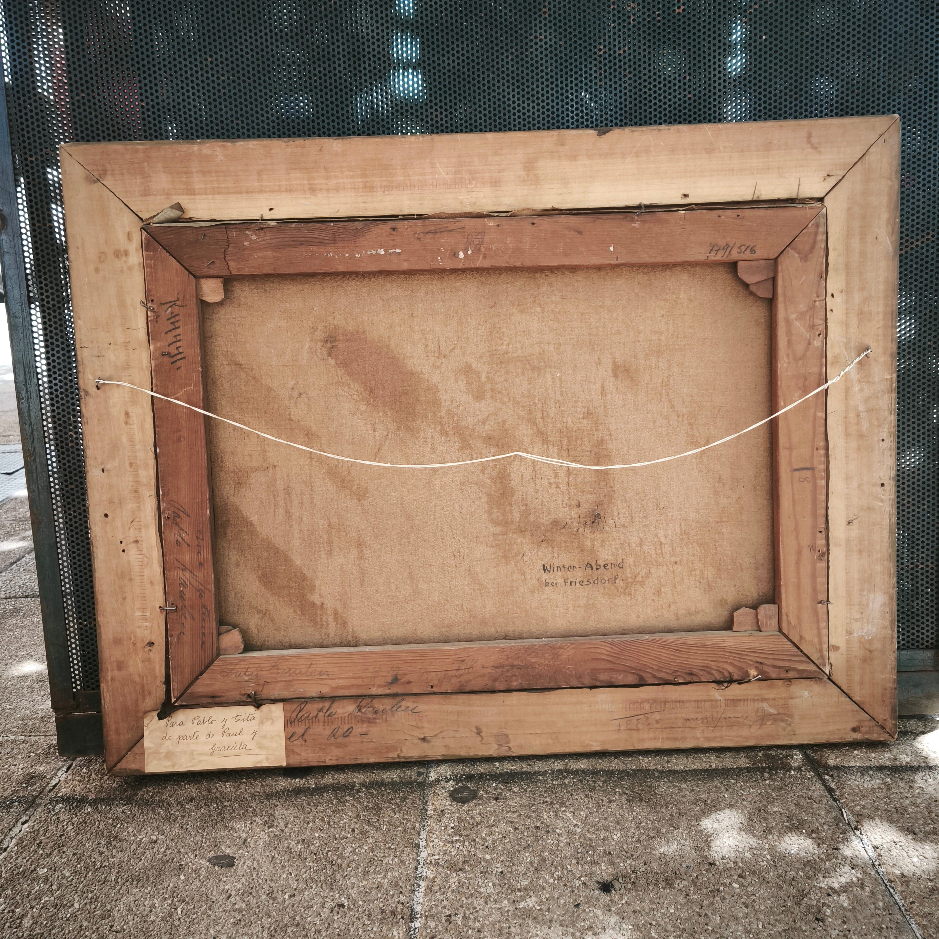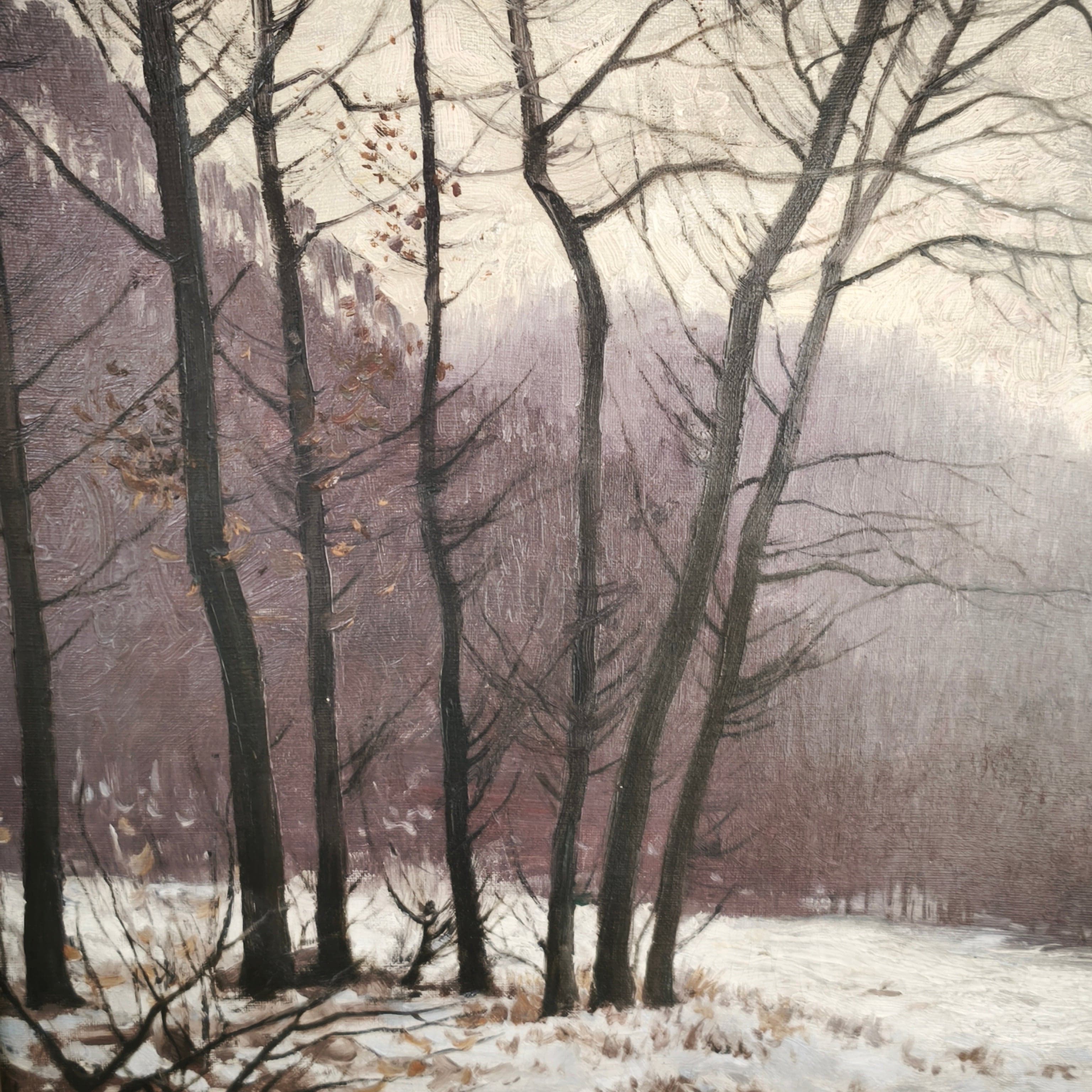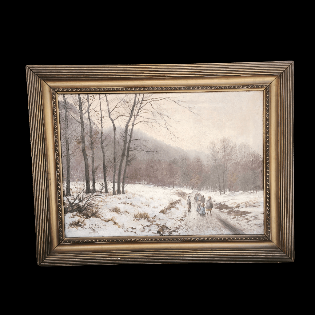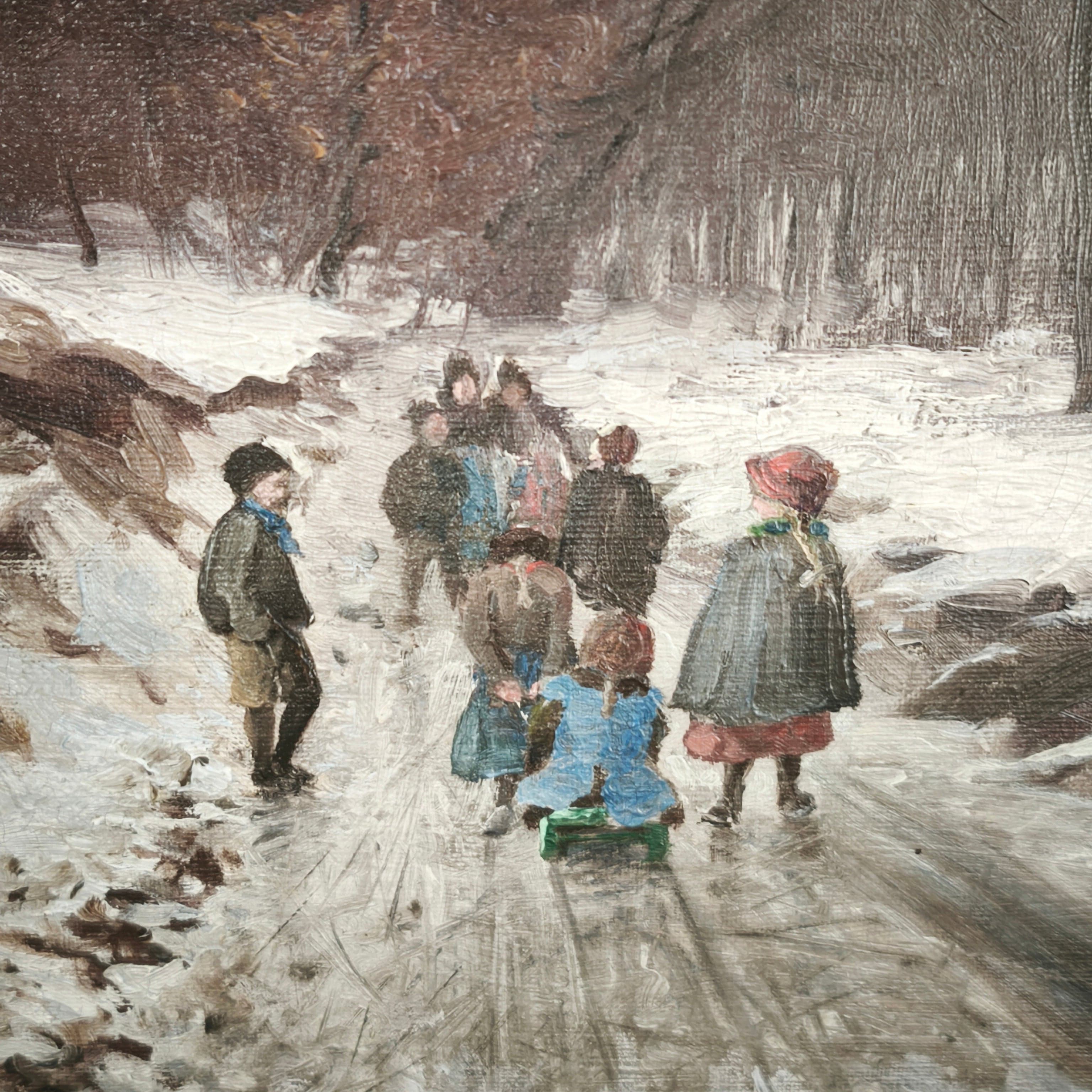 Belle peinture à l'huile du peintre allemand Carl Nonn (1876-1949) dans laquelle nous voyons un paysage d'hiver avec des arbres, de la neige et un groupe d'enfants jouant avec un traîneau.